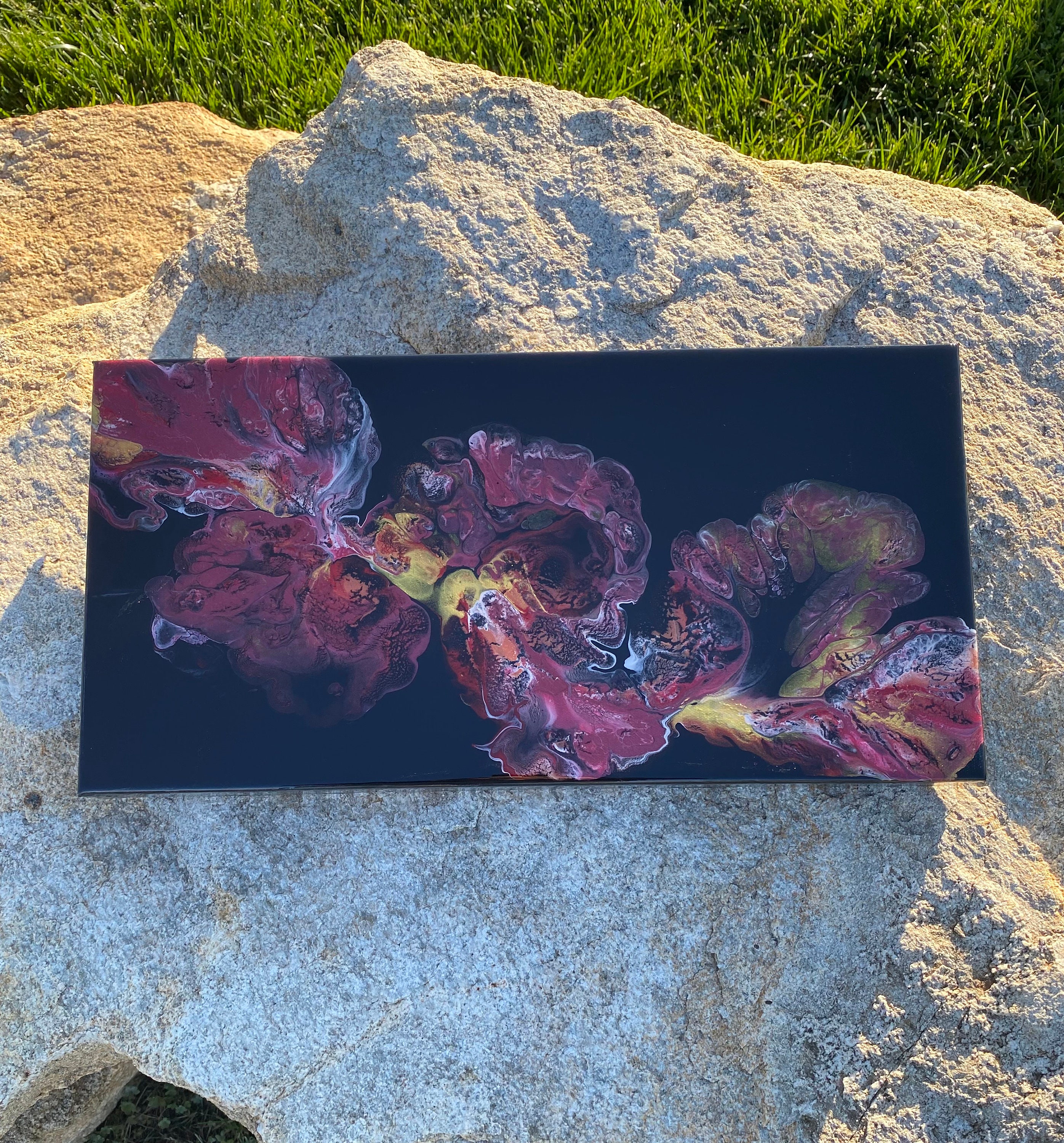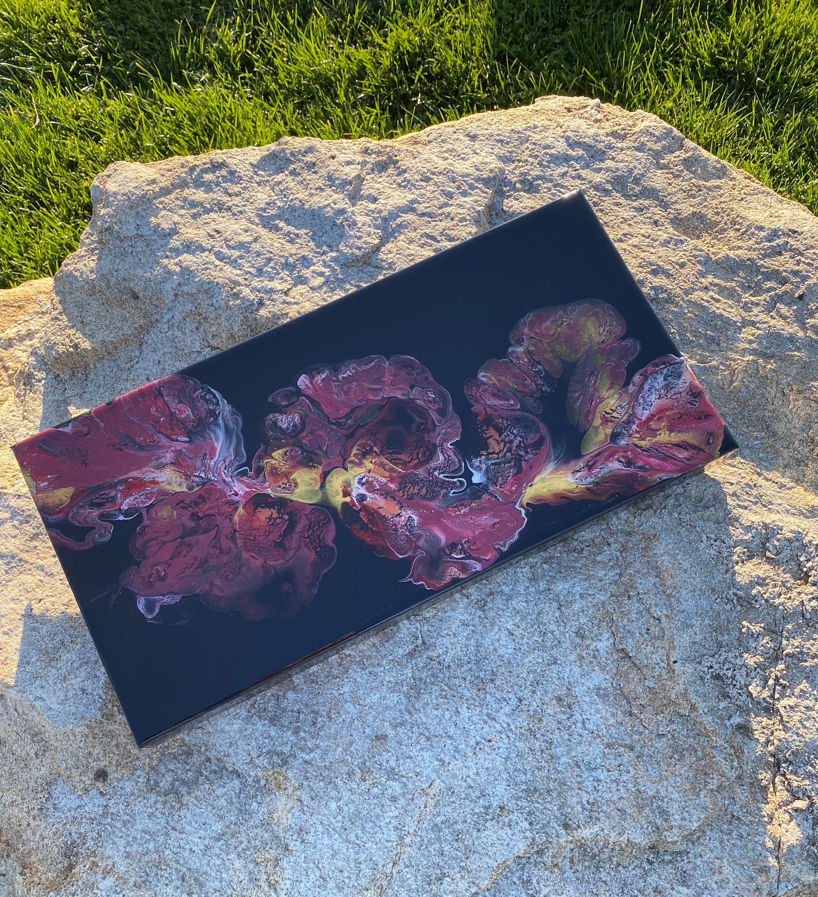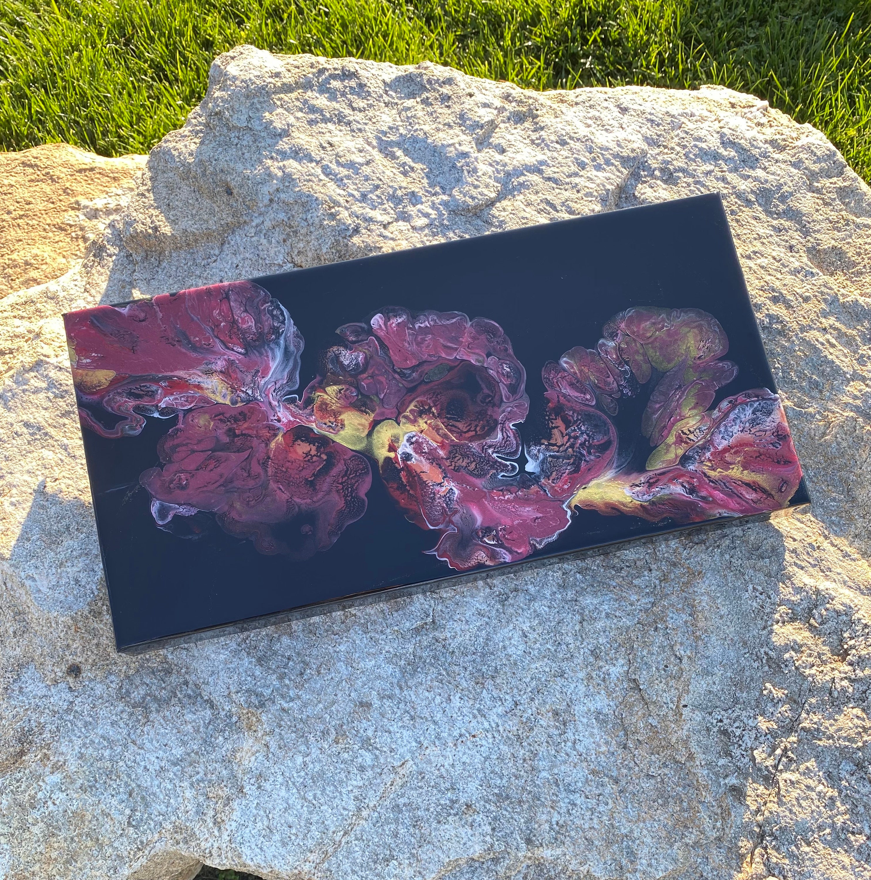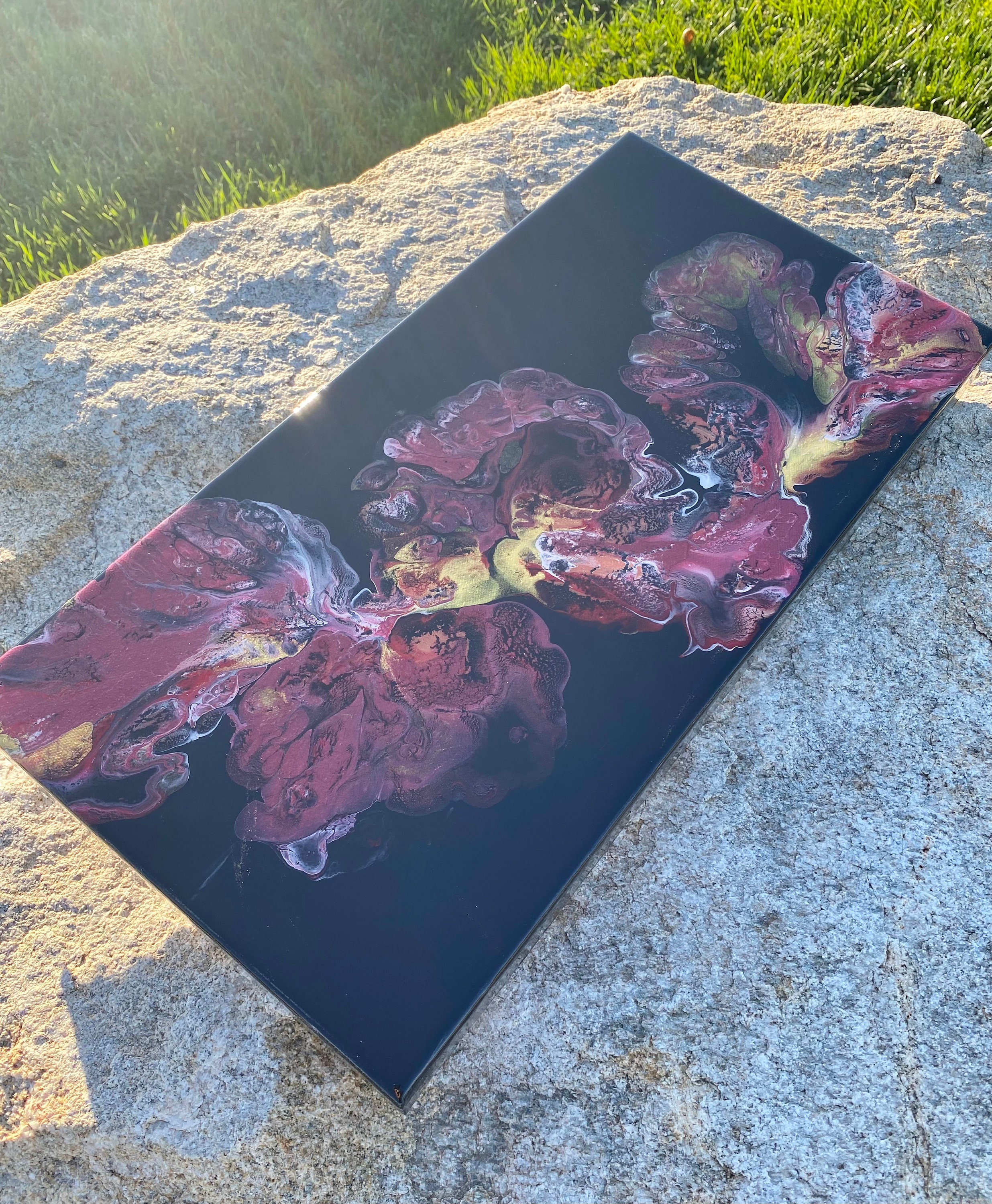 This pour is done as a dutch pour with the base color being black. Colors running throughout are: metallic red, pink, metallic white, and gold. This piece is mysterious and gorgeous. It will compliment any room of your house.