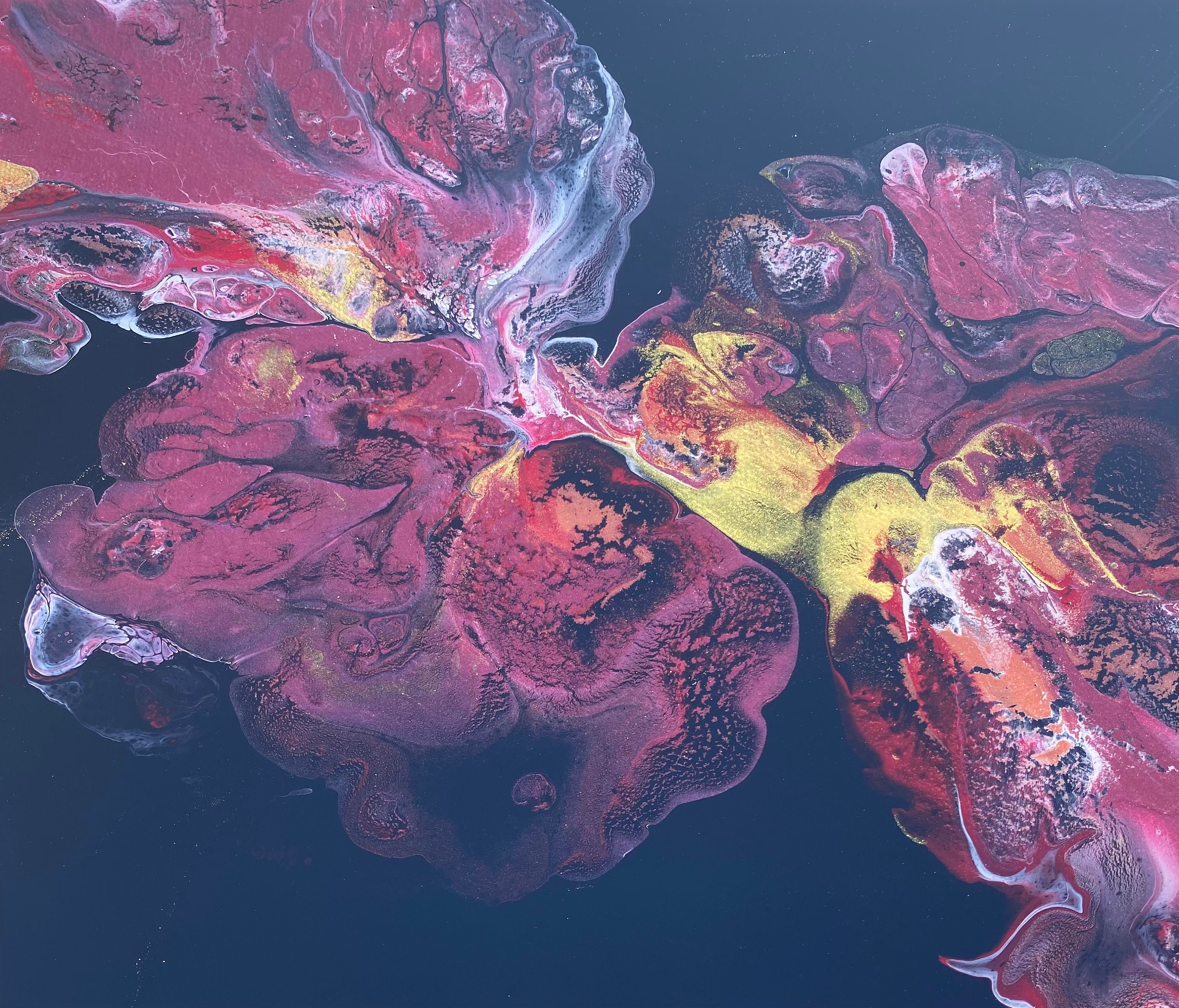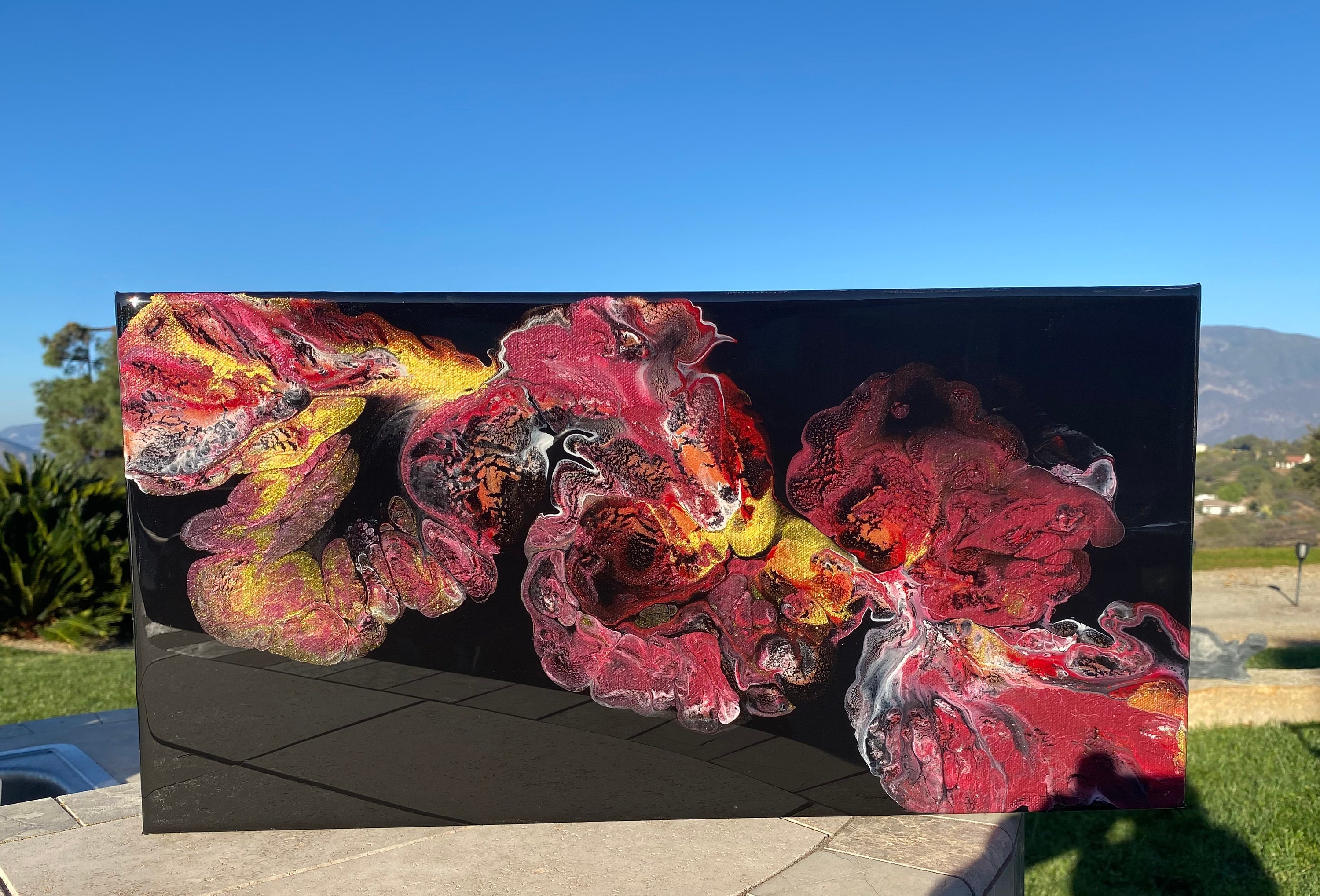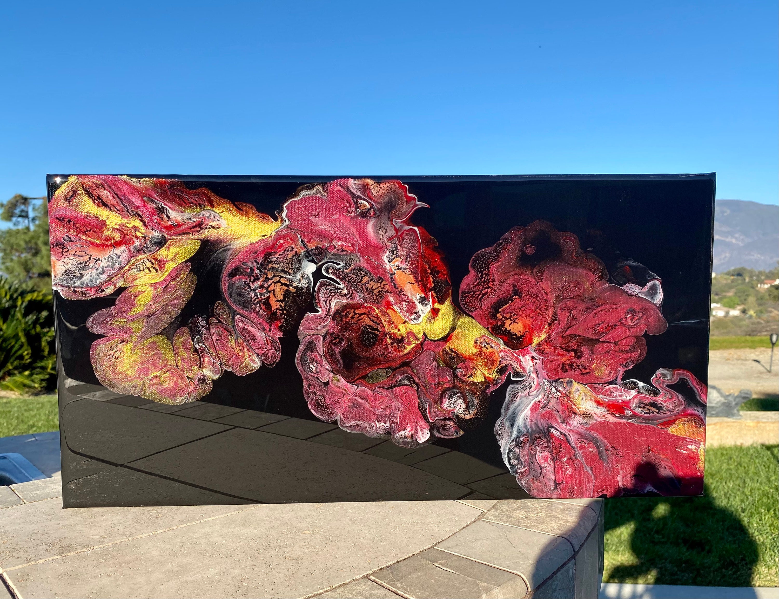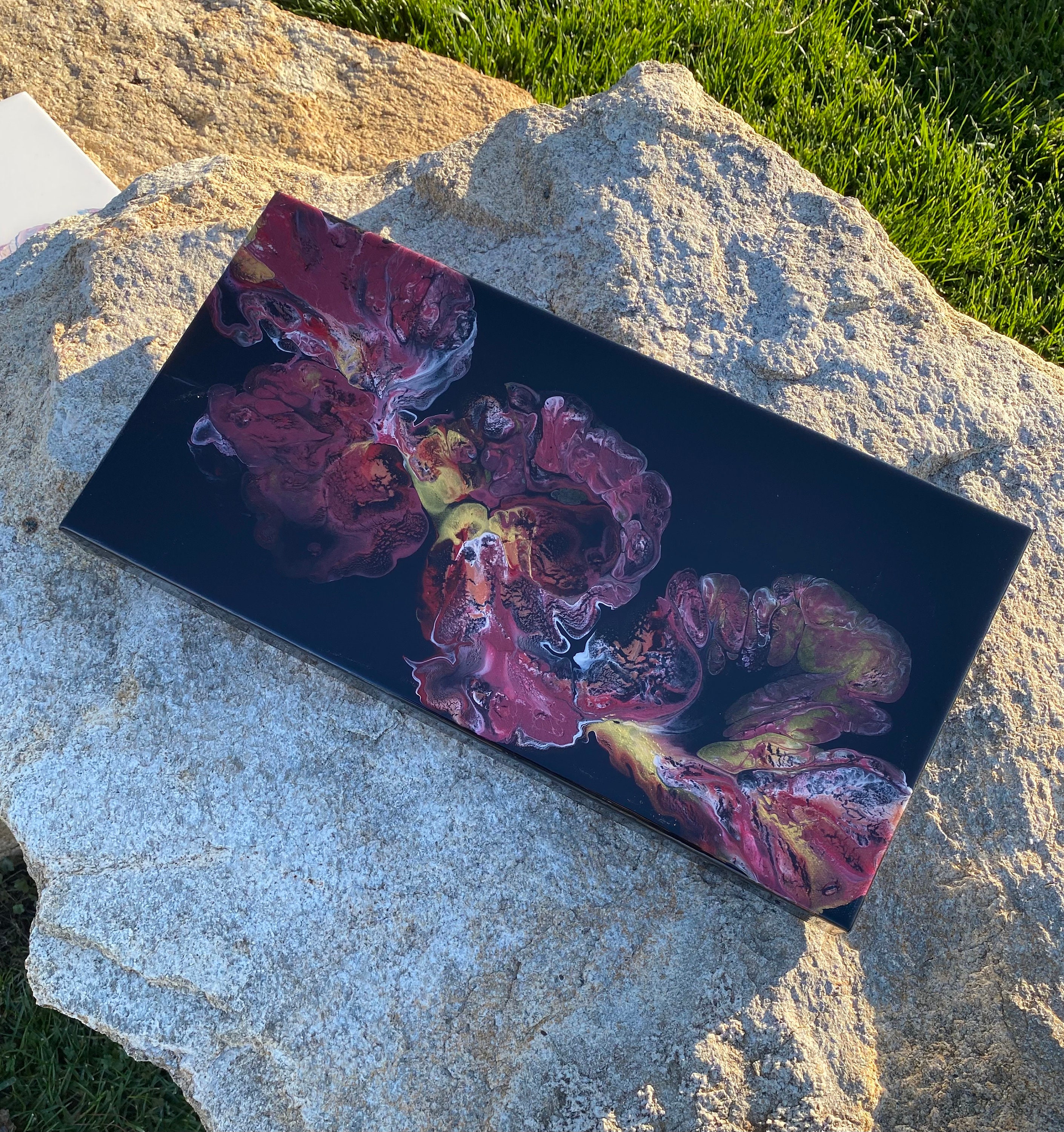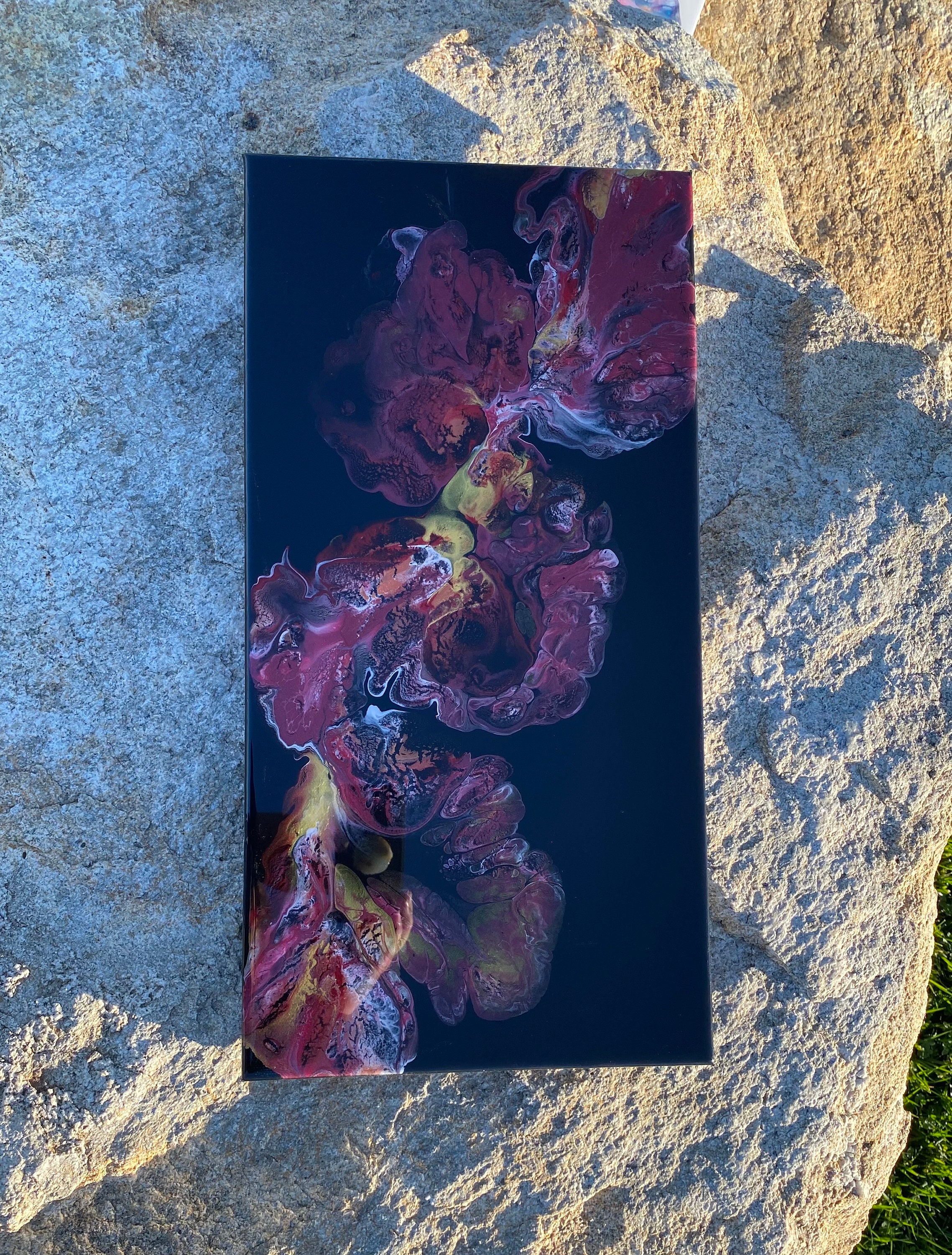 This pour is done as a dutch pour with the base color being black. Colors running throughout are: metallic red, pink, metallic white, and gold. This piece is mysterious and gorgeous. It will compliment any room of your house.
