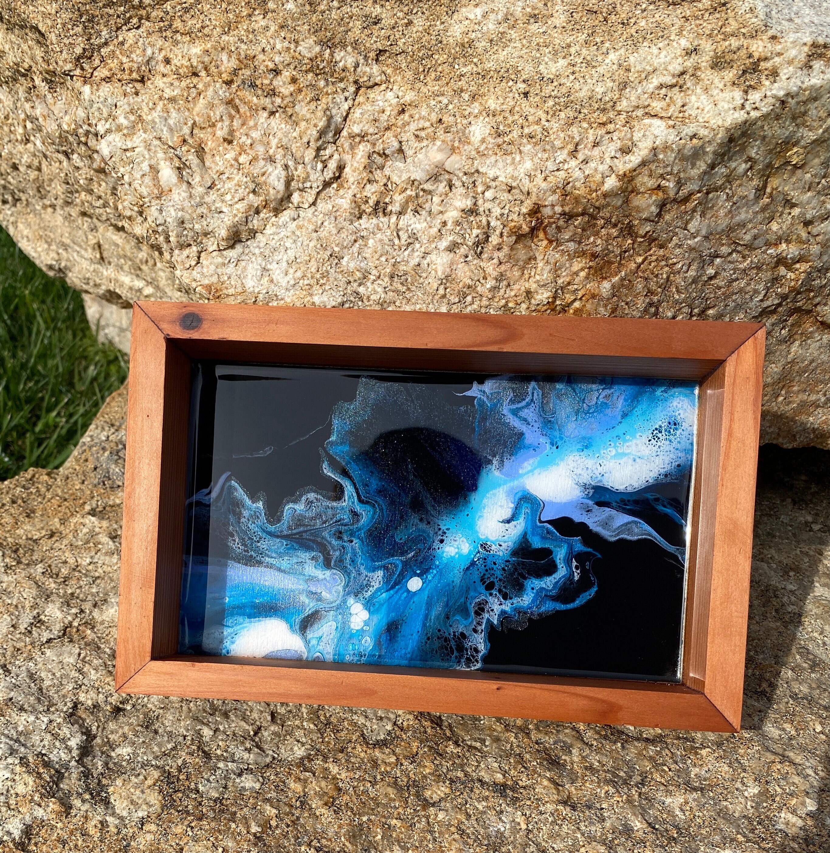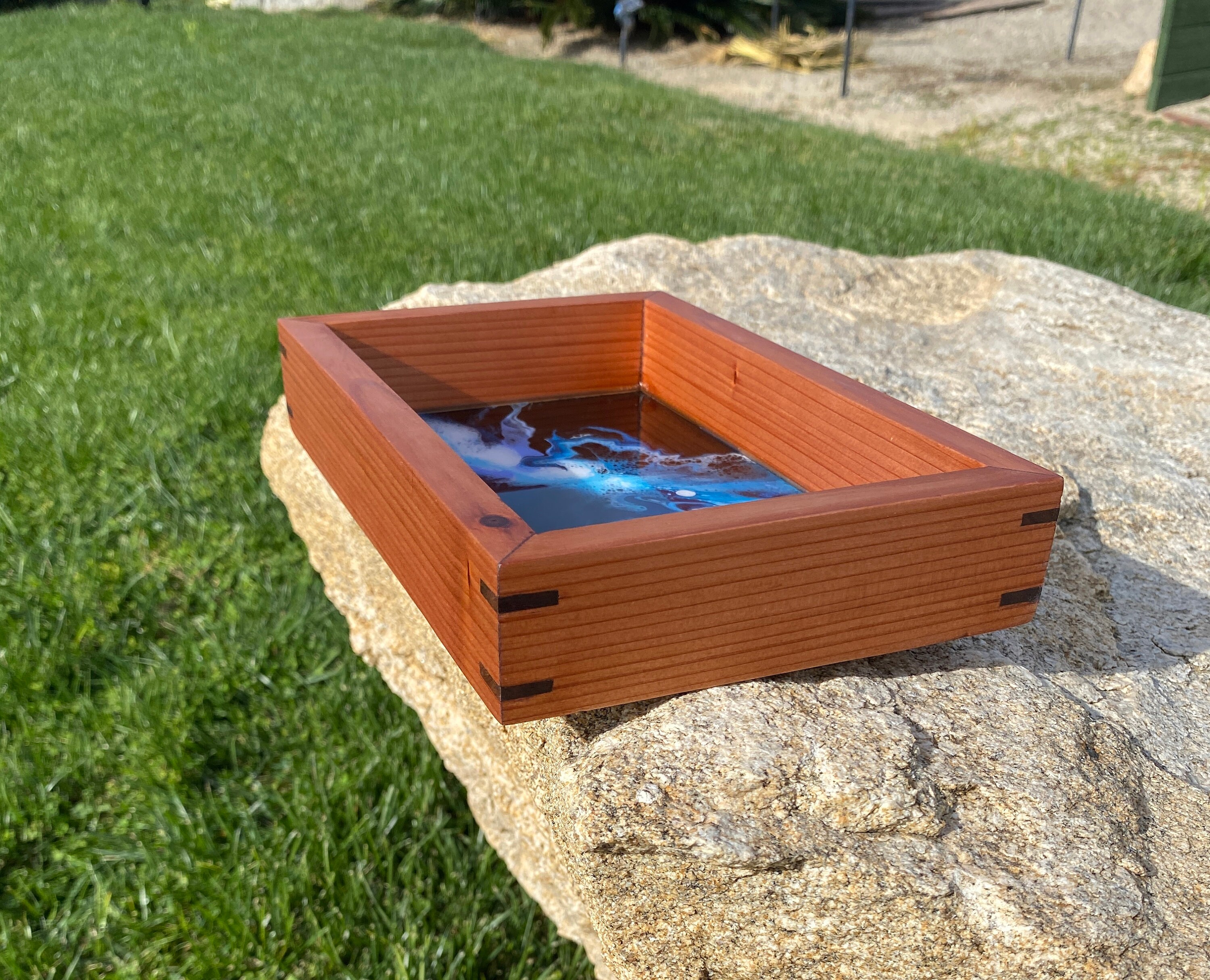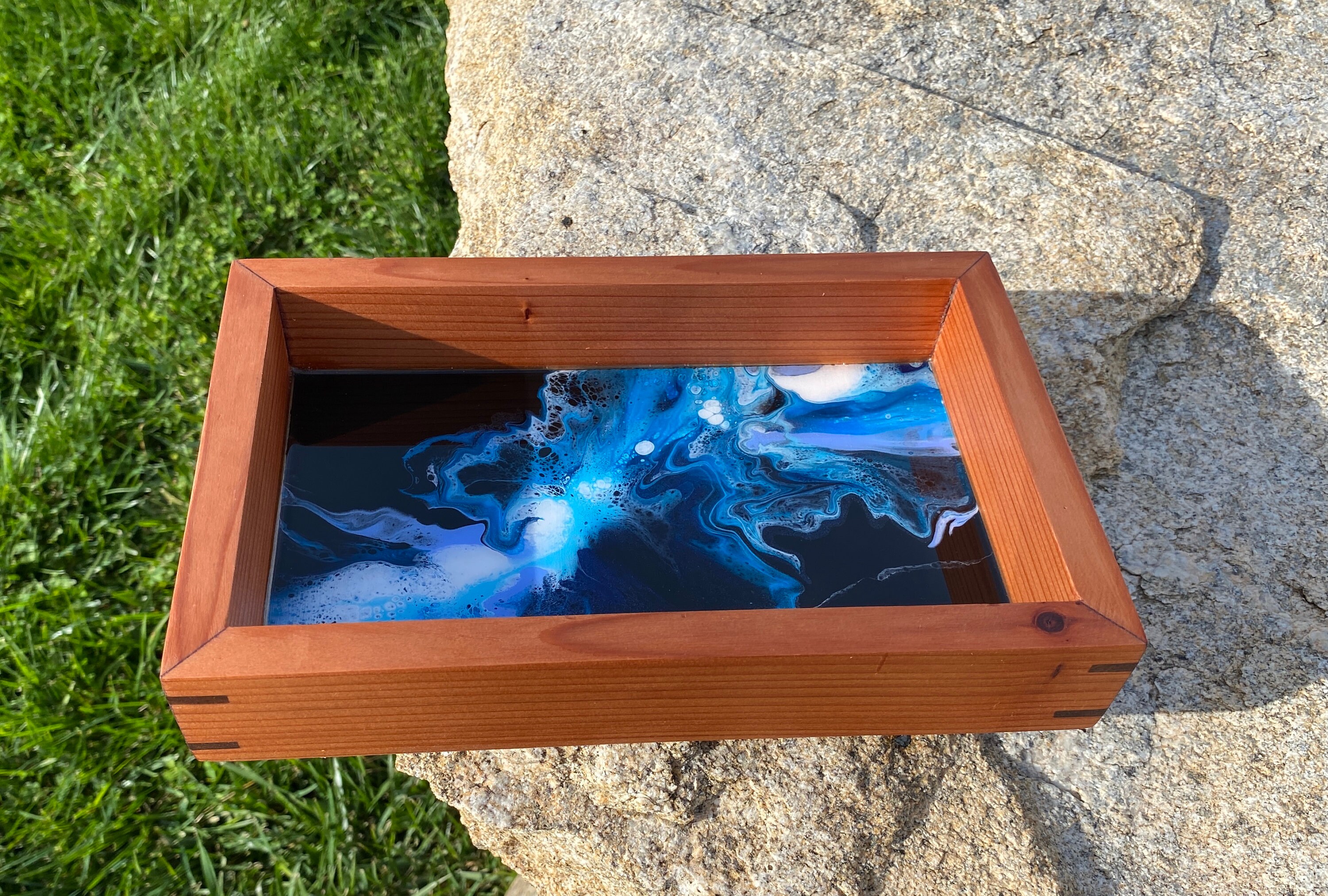 The tray was created using pieces of red oak wood with walnut wood splines. The tray is beautifully created. The art piece was created on wood and then resined to give it that shine and create a stronger piece.