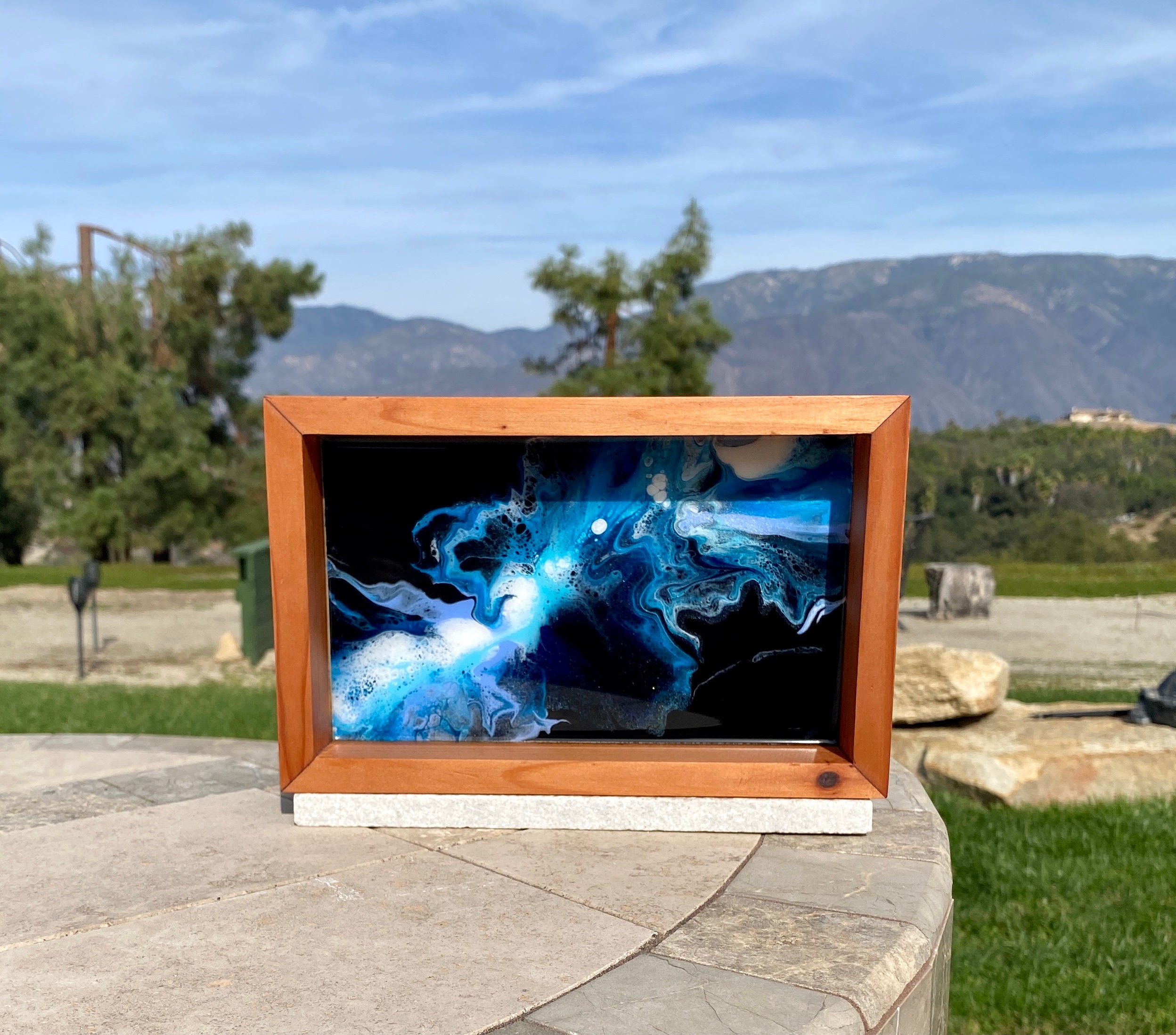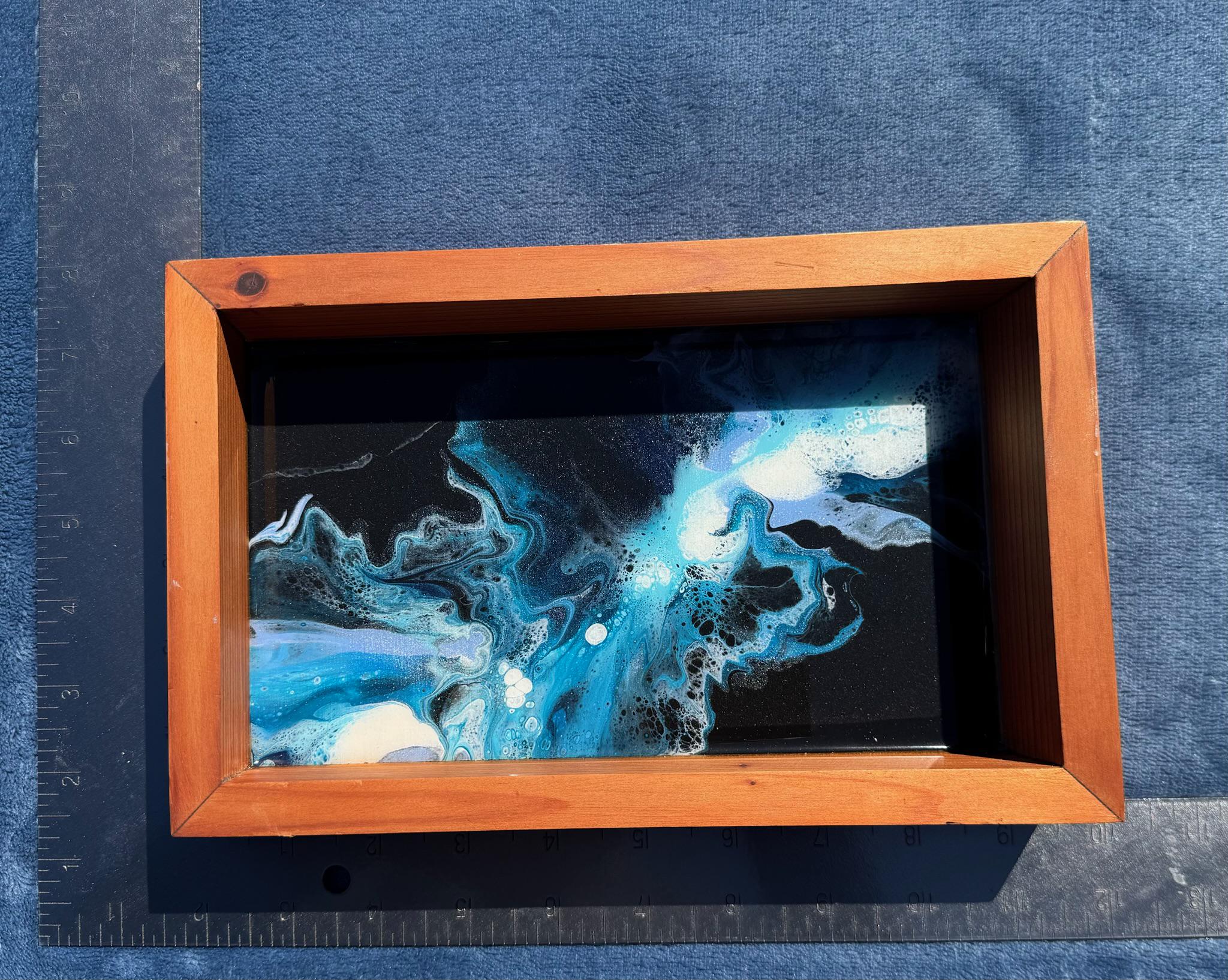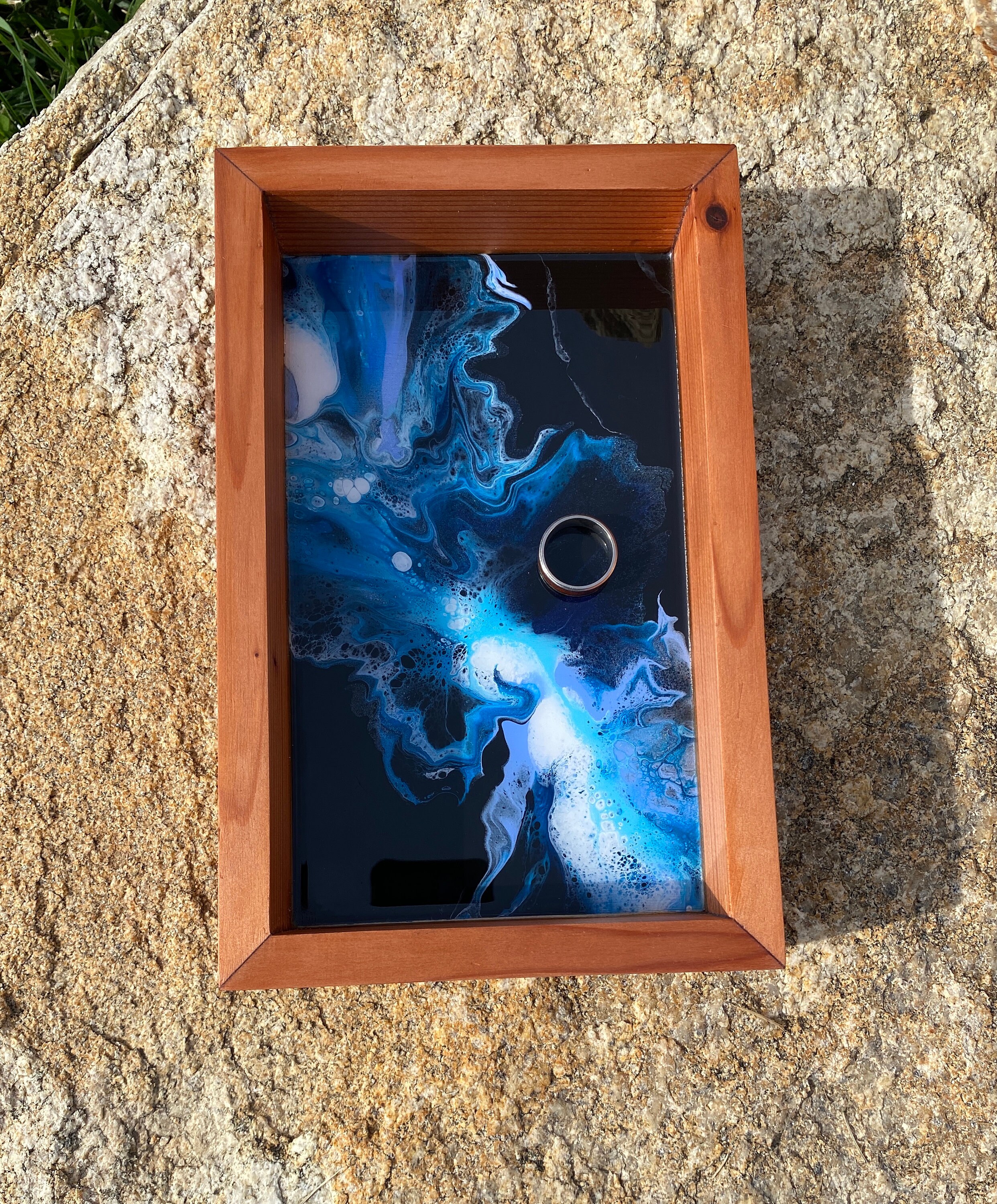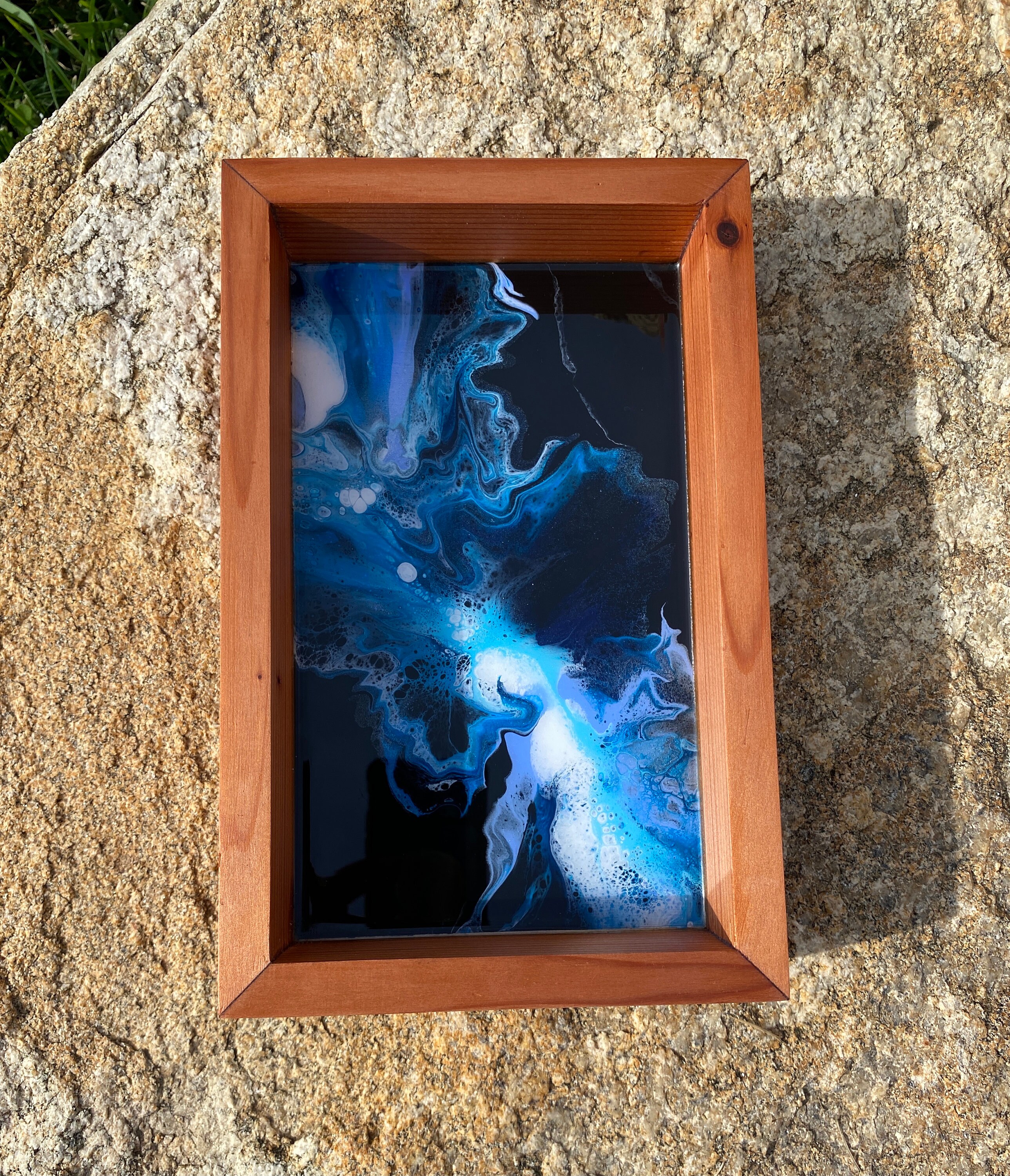 The tray was created using pieces of red oak wood with walnut wood splines. The tray is beautifully created. The art piece was created on wood and then resined to give it that shine and create a stronger piece.