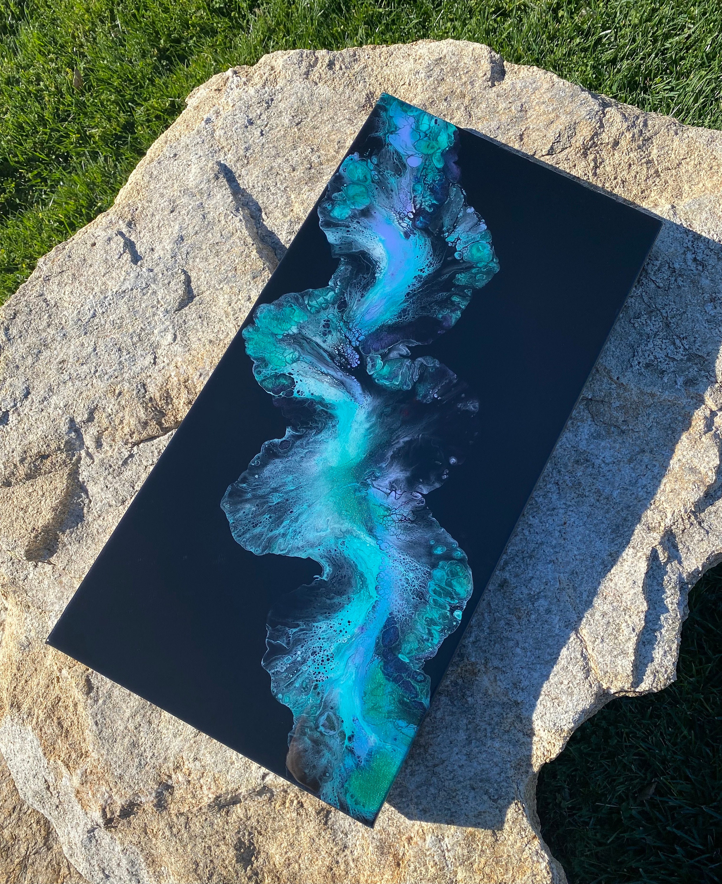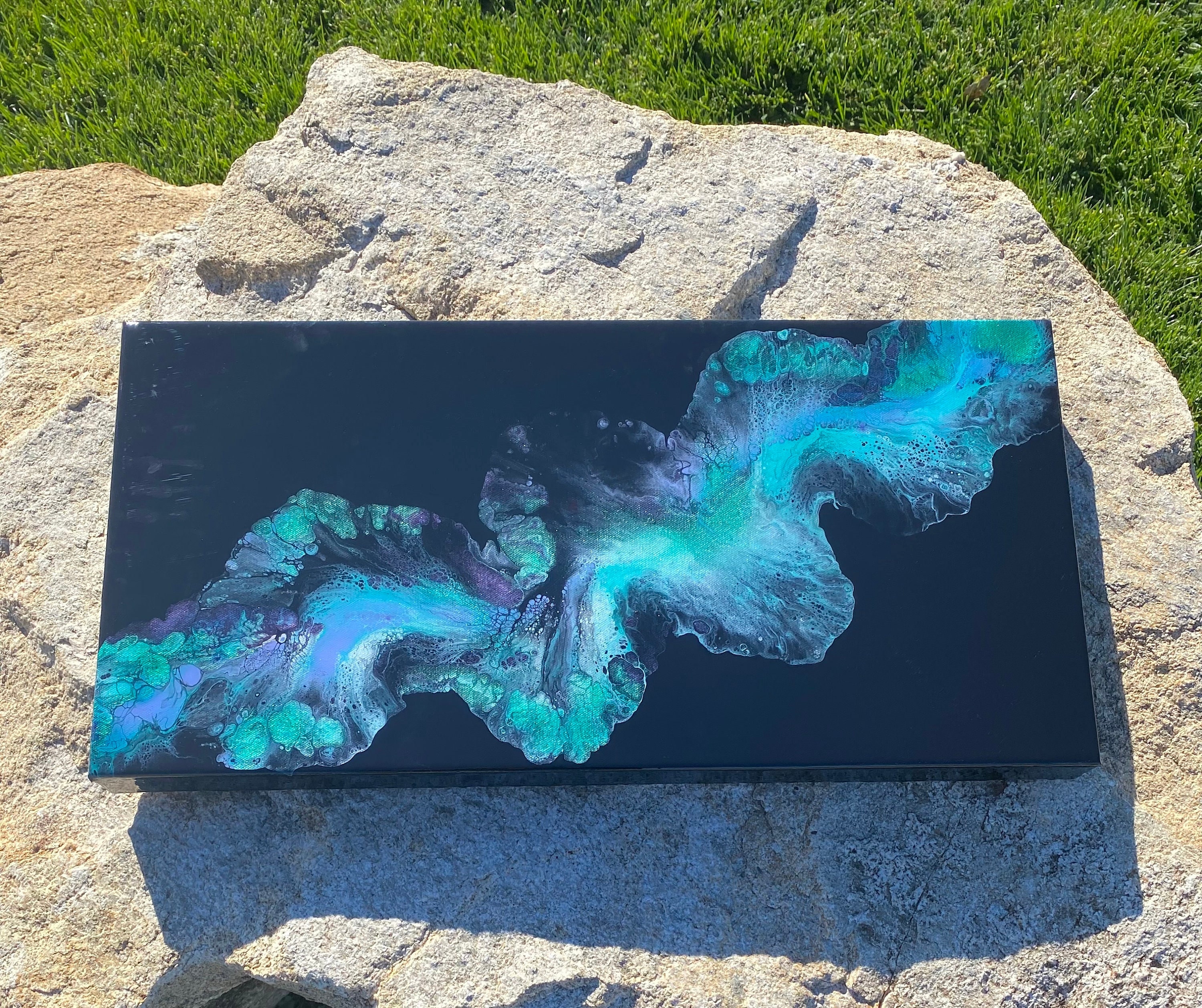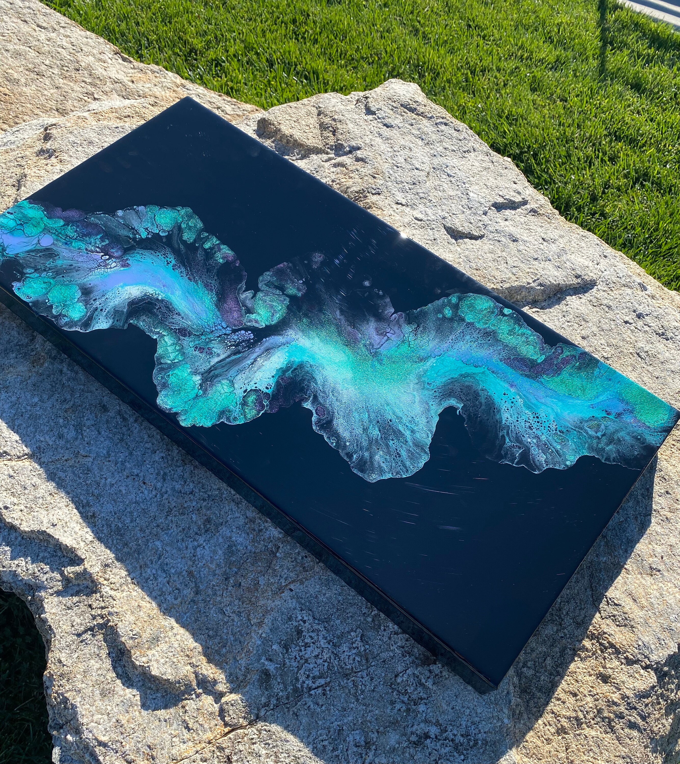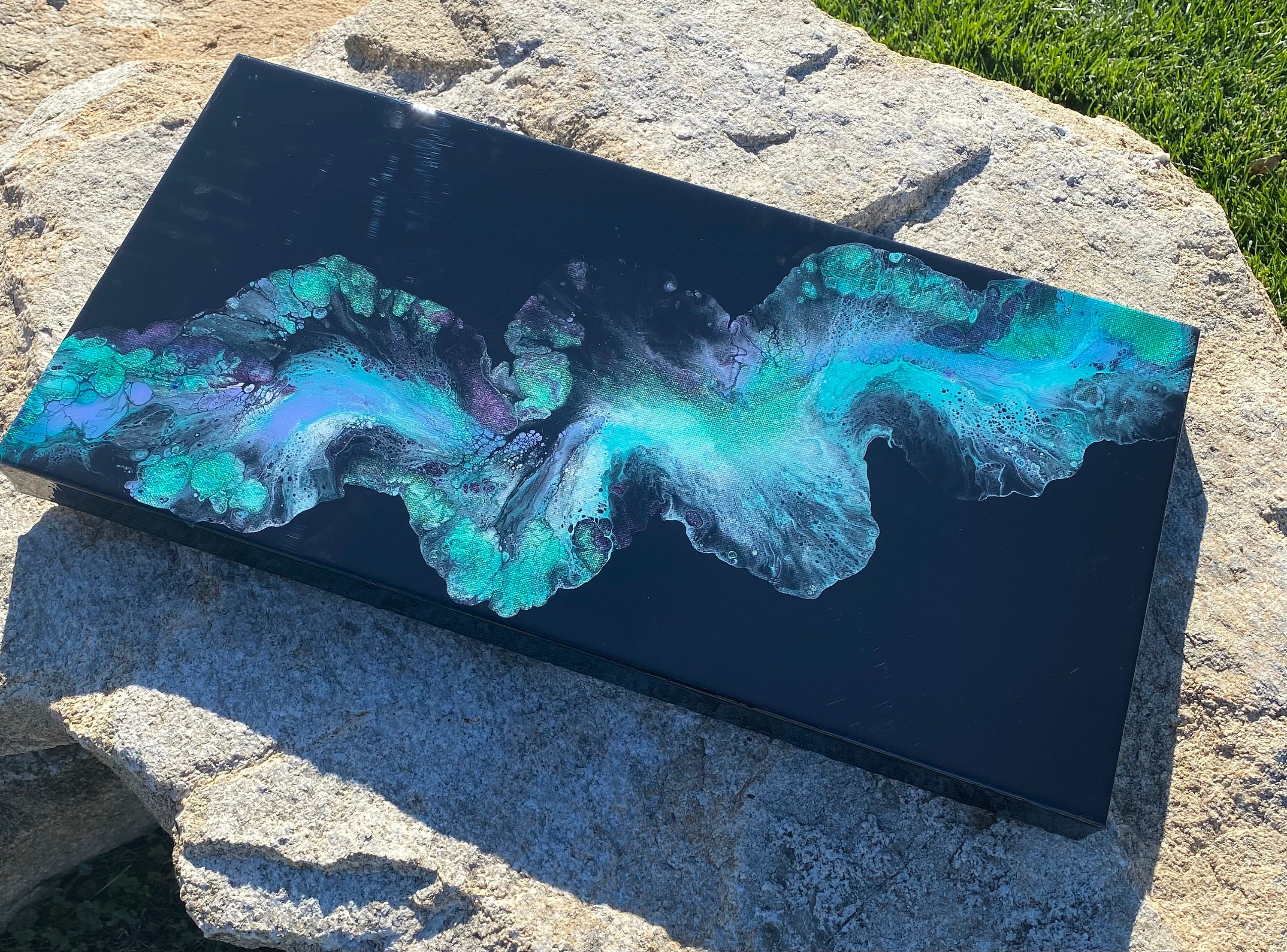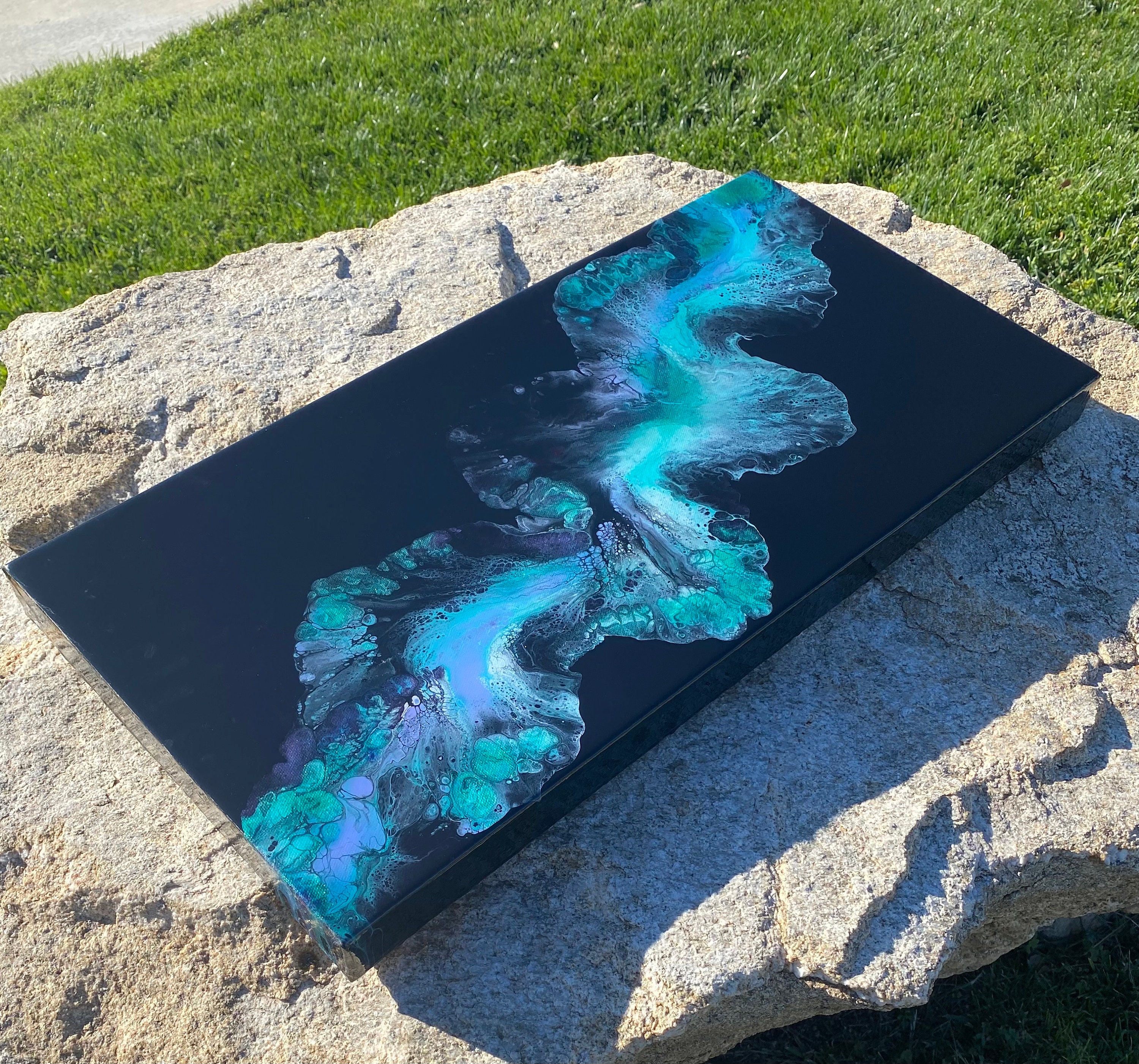 This pour is done as a dutch pour with the base color being black. Colors running throughout are: various shades of purples, greens, and and metallic white. This piece is gorgeous and very vibrant. It will compliment any room of your house.