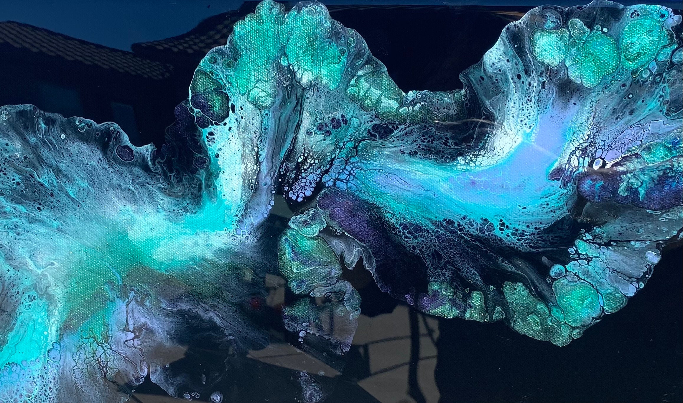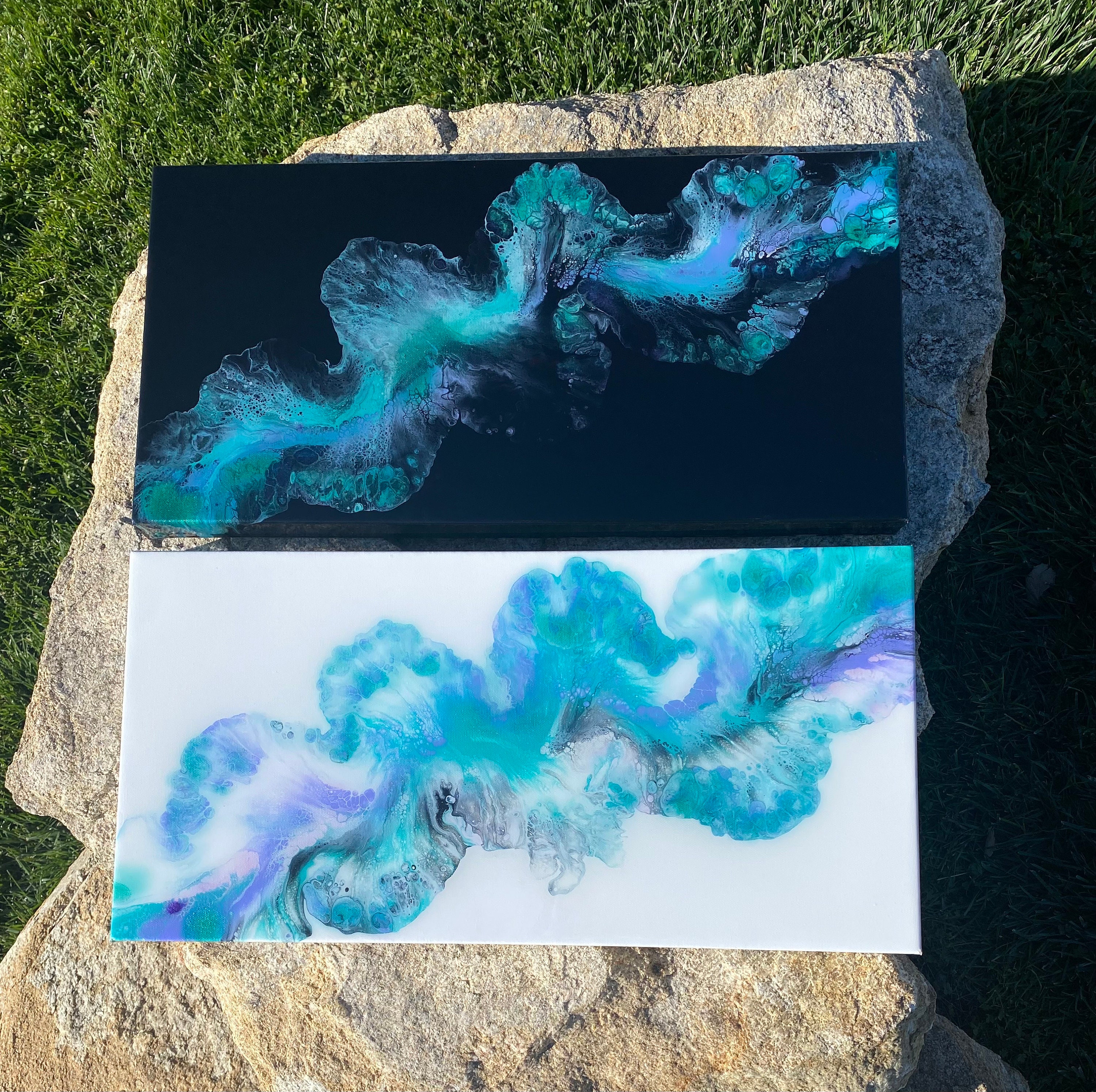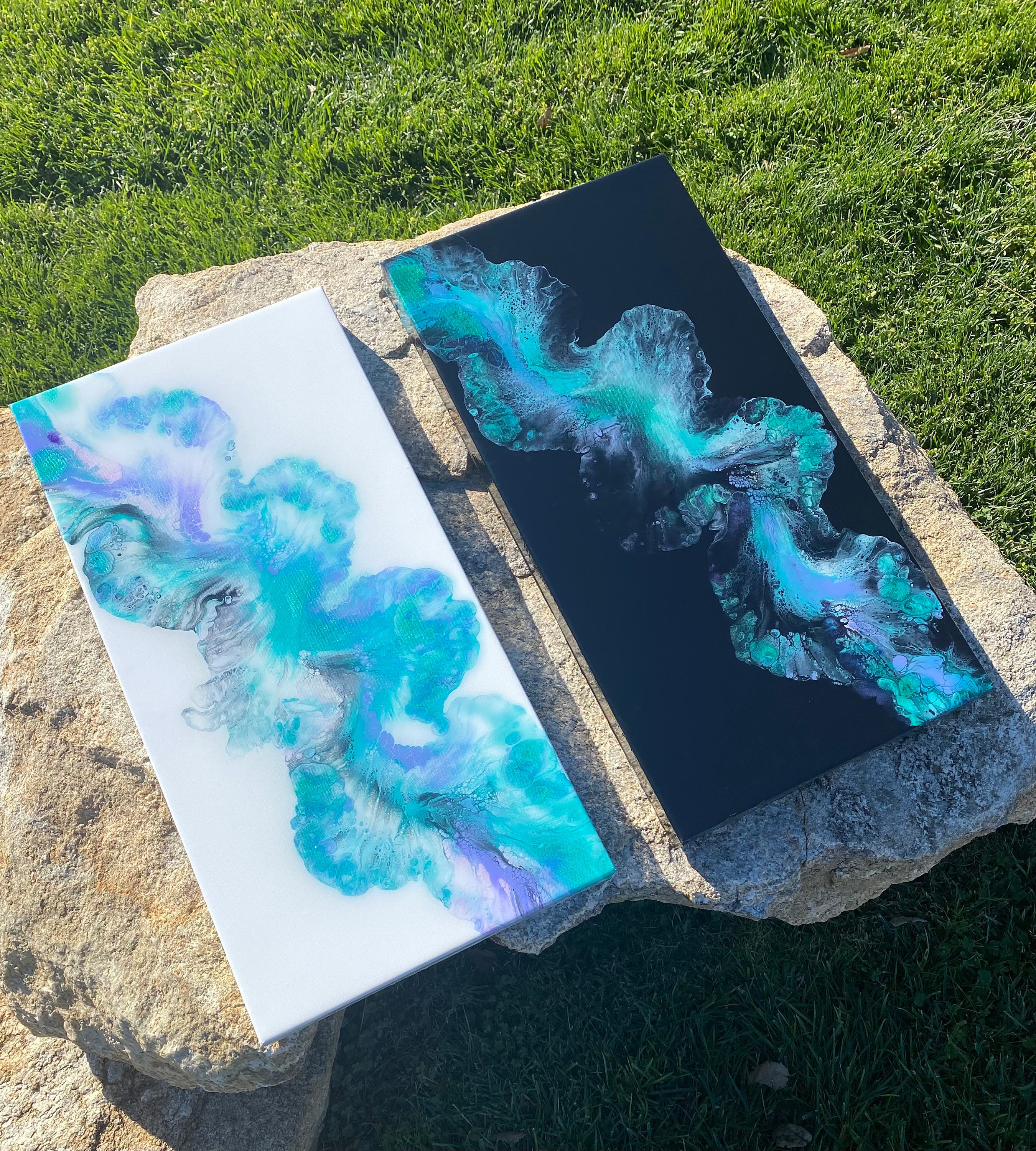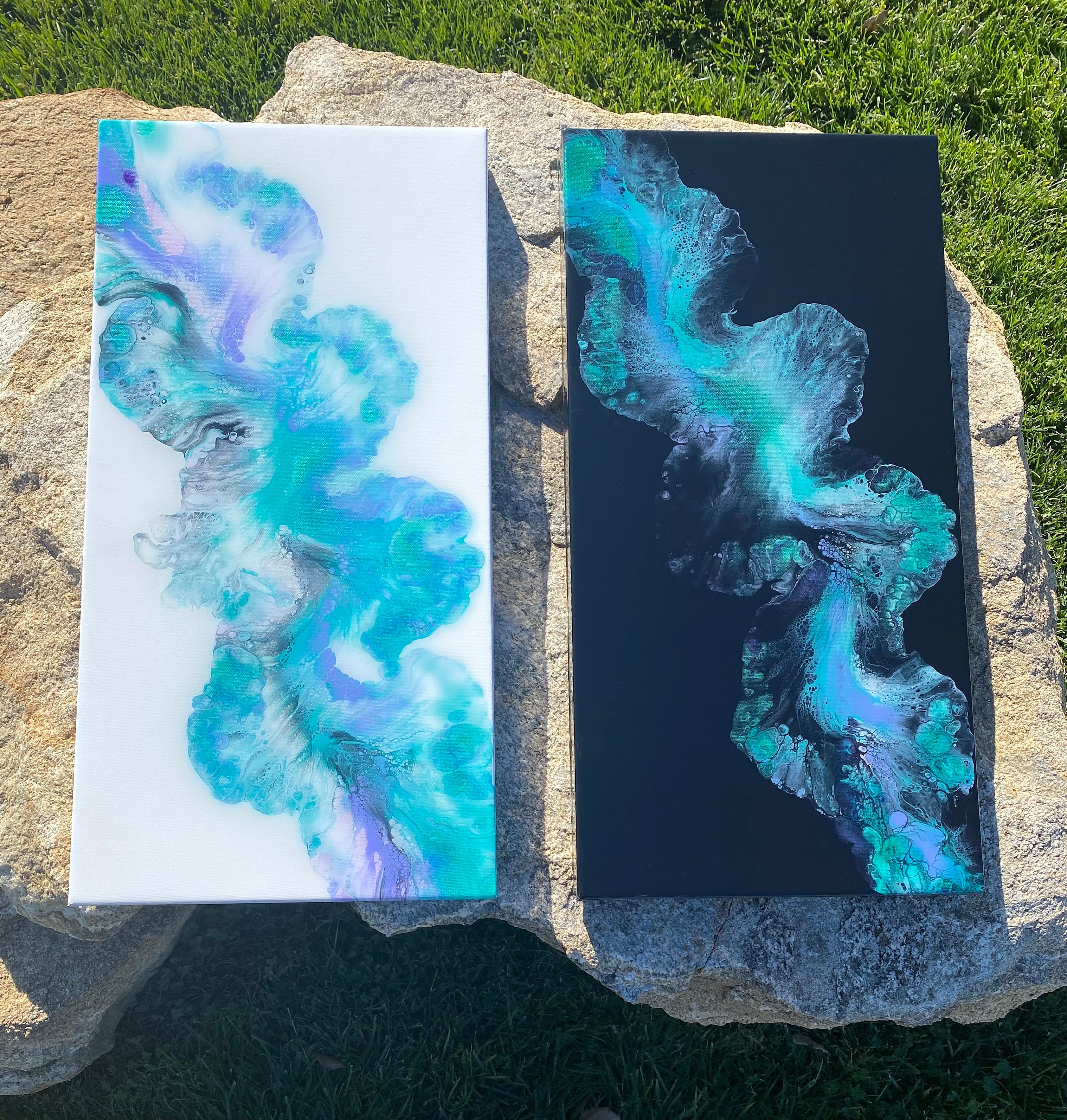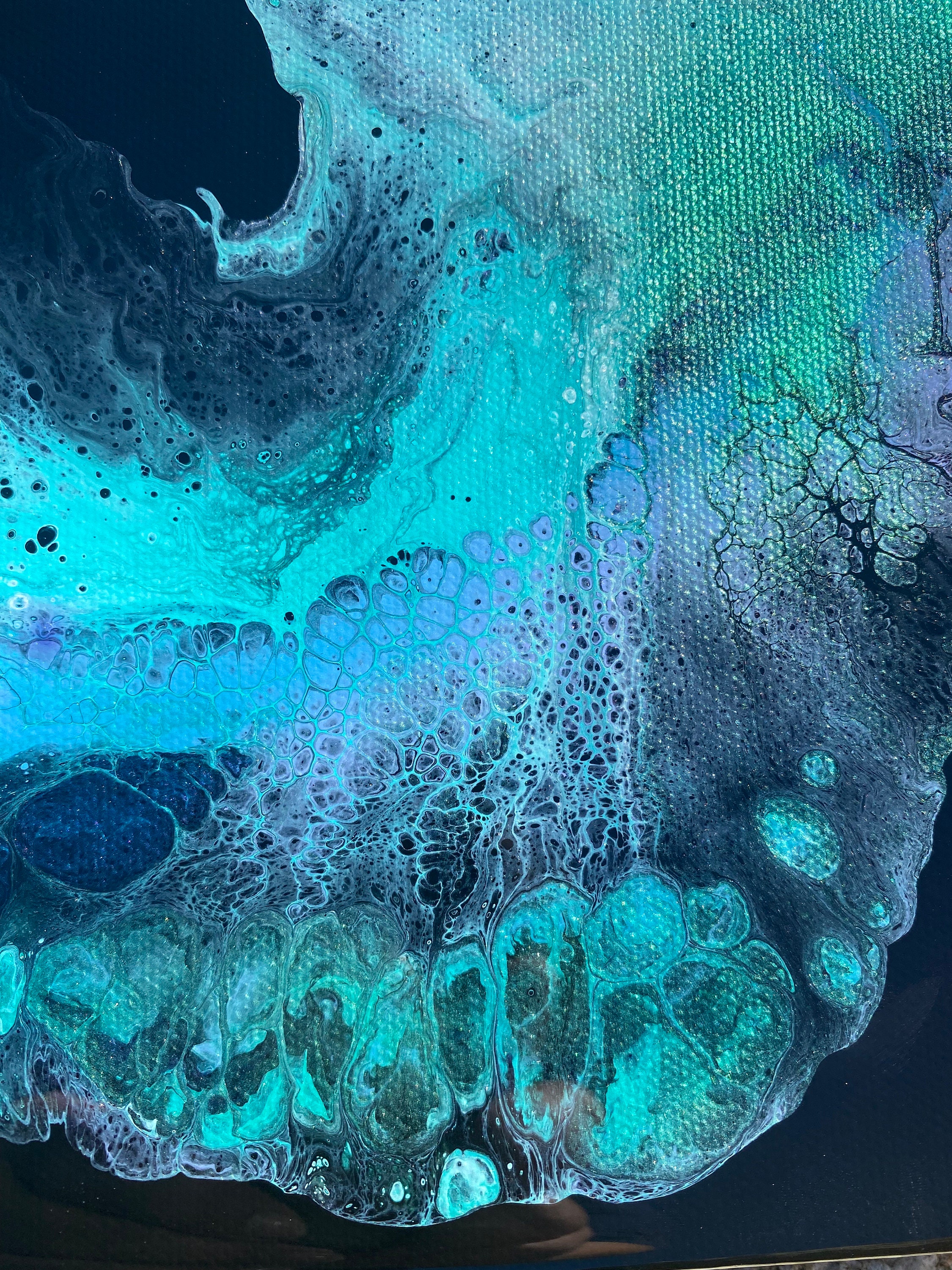 Original art work- stunning abstract painting on gallery wrapped level 3 canvas done in a dutch pour style utilizing acrylic paints and topped with a coat of resin to really shine.