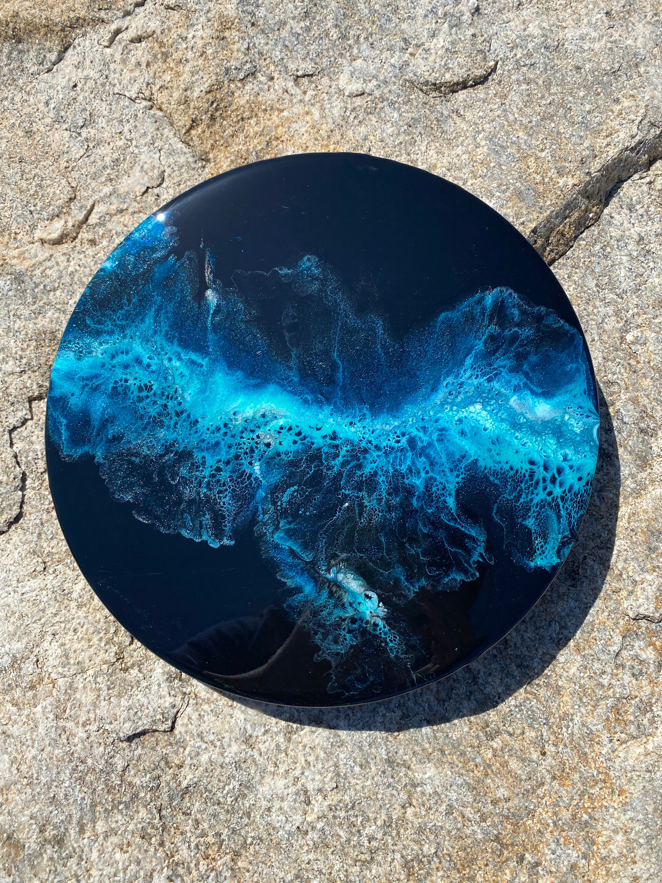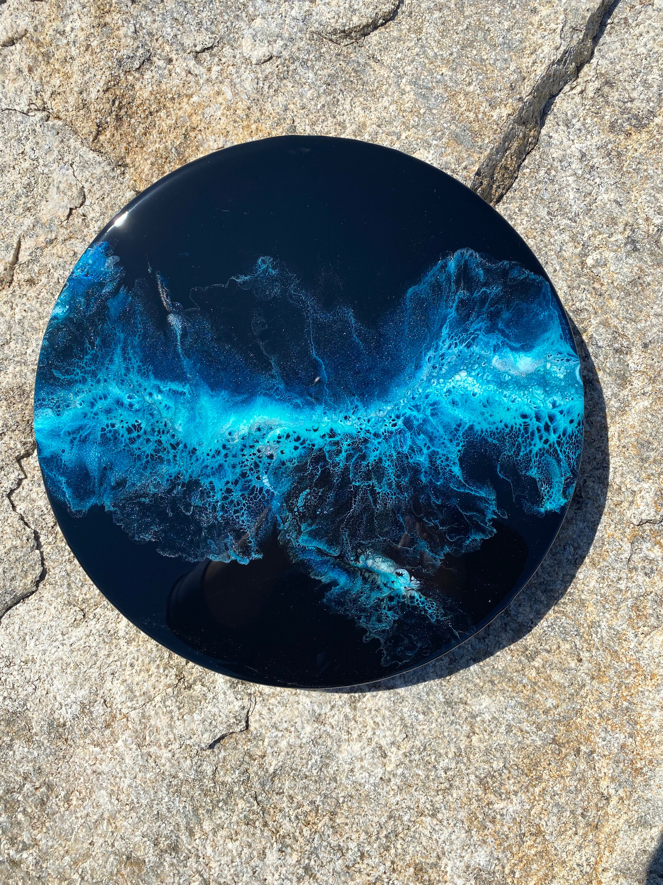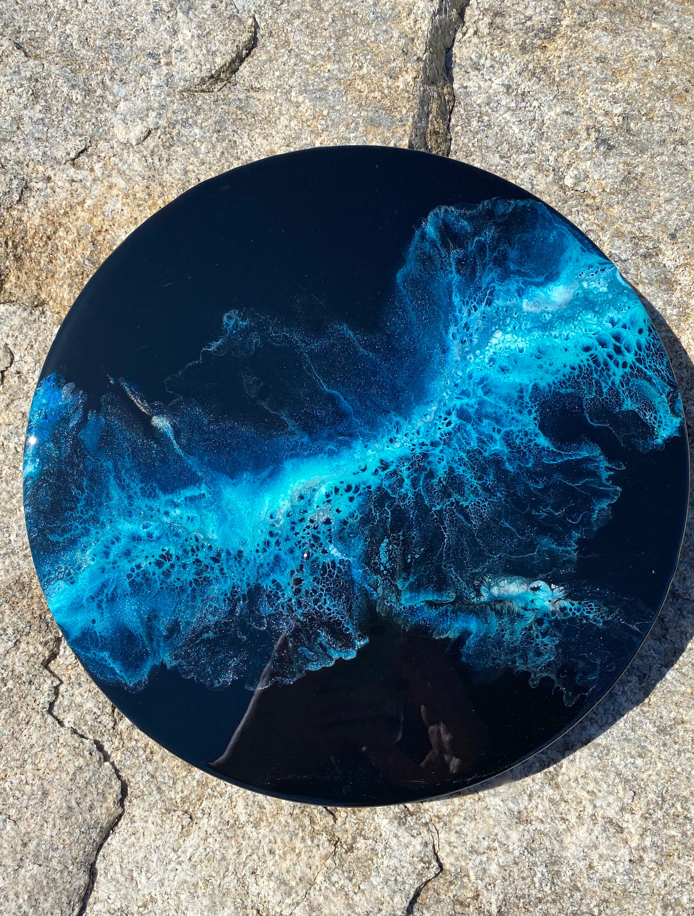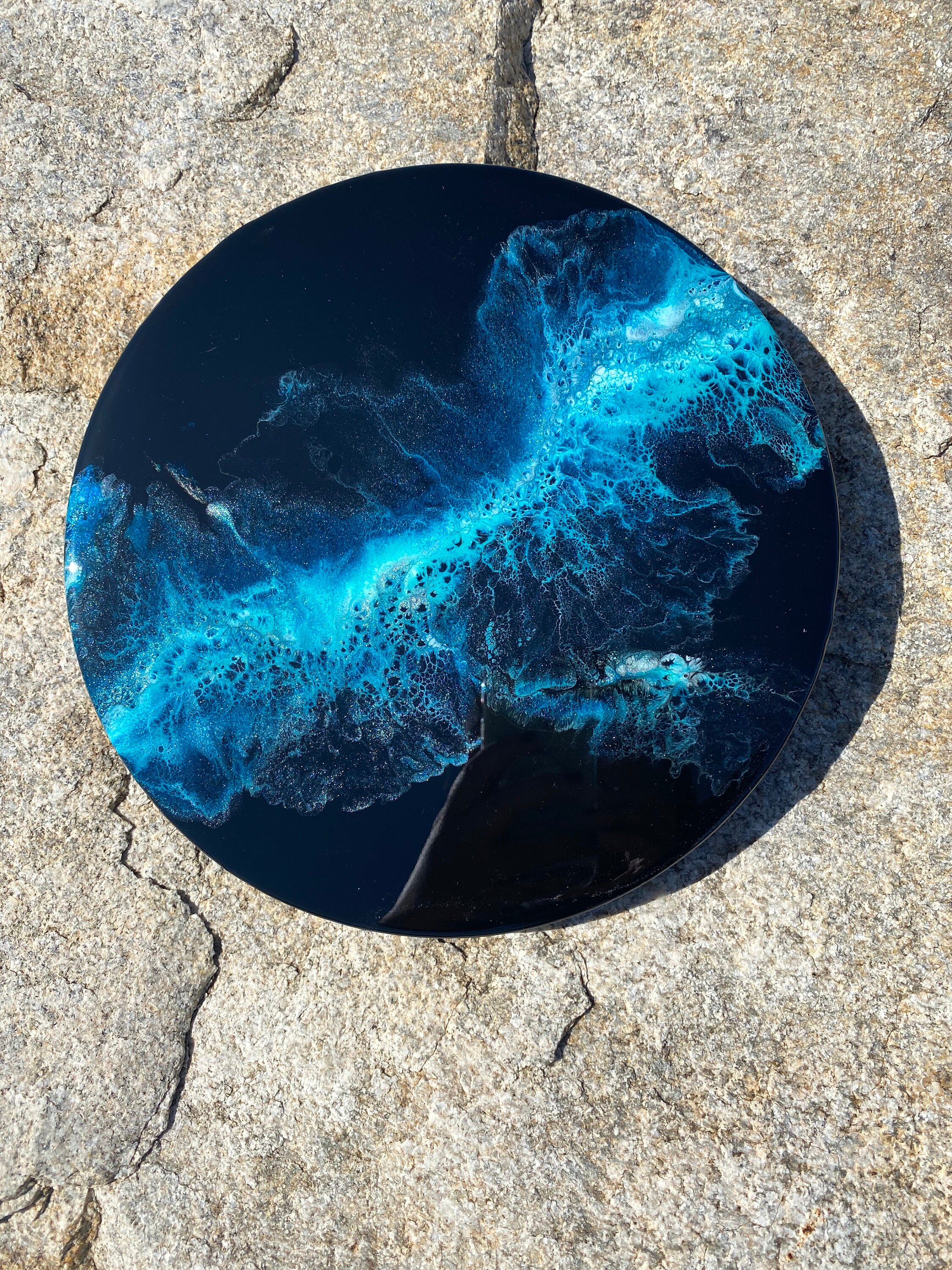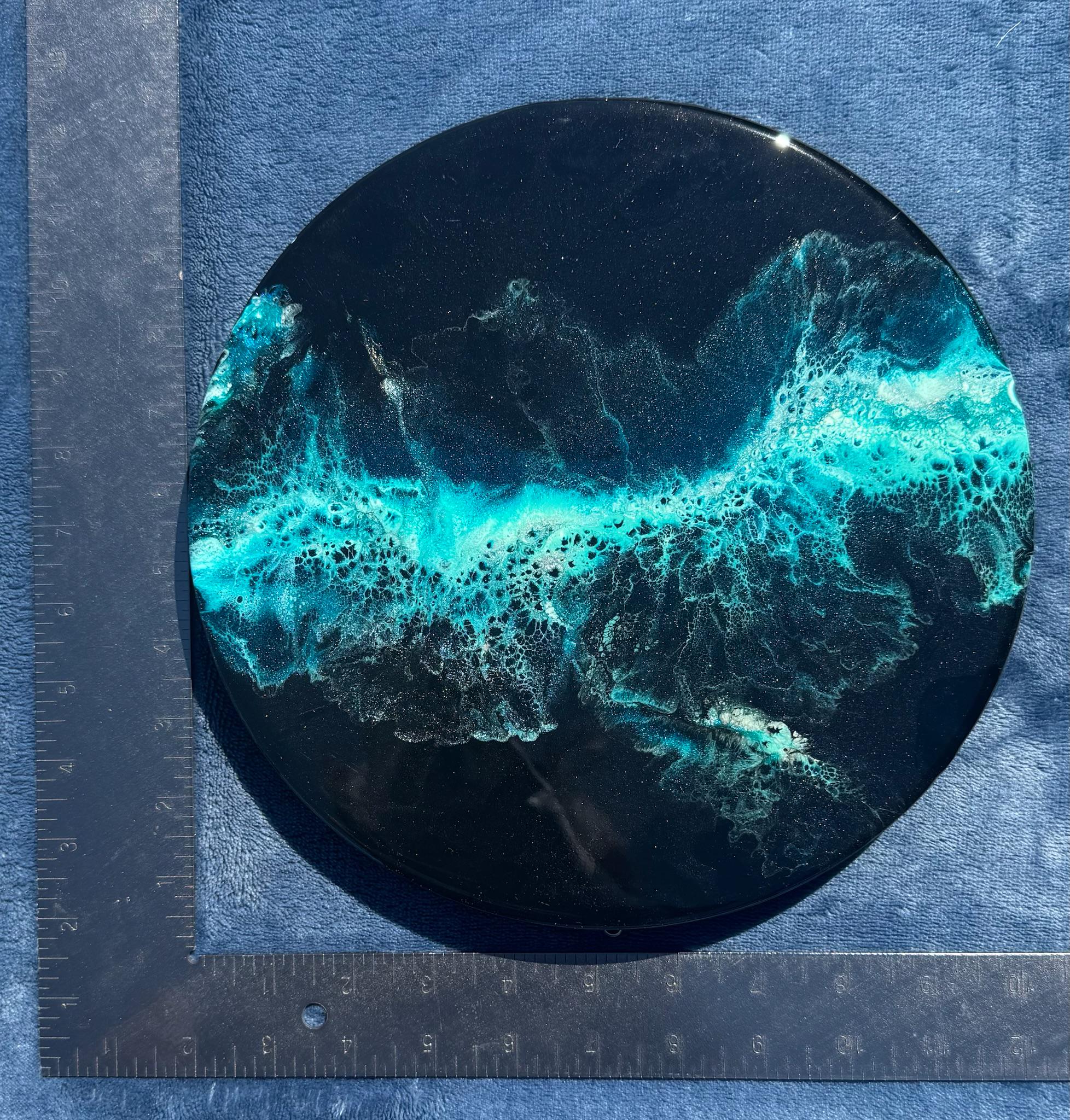 This pour is done as a dutch pour with the base color being black. Colors running throughout are: various shades of blues, teals, silver, and white. This piece is gorgeous and very vibrant. It will compliment any room of your house.