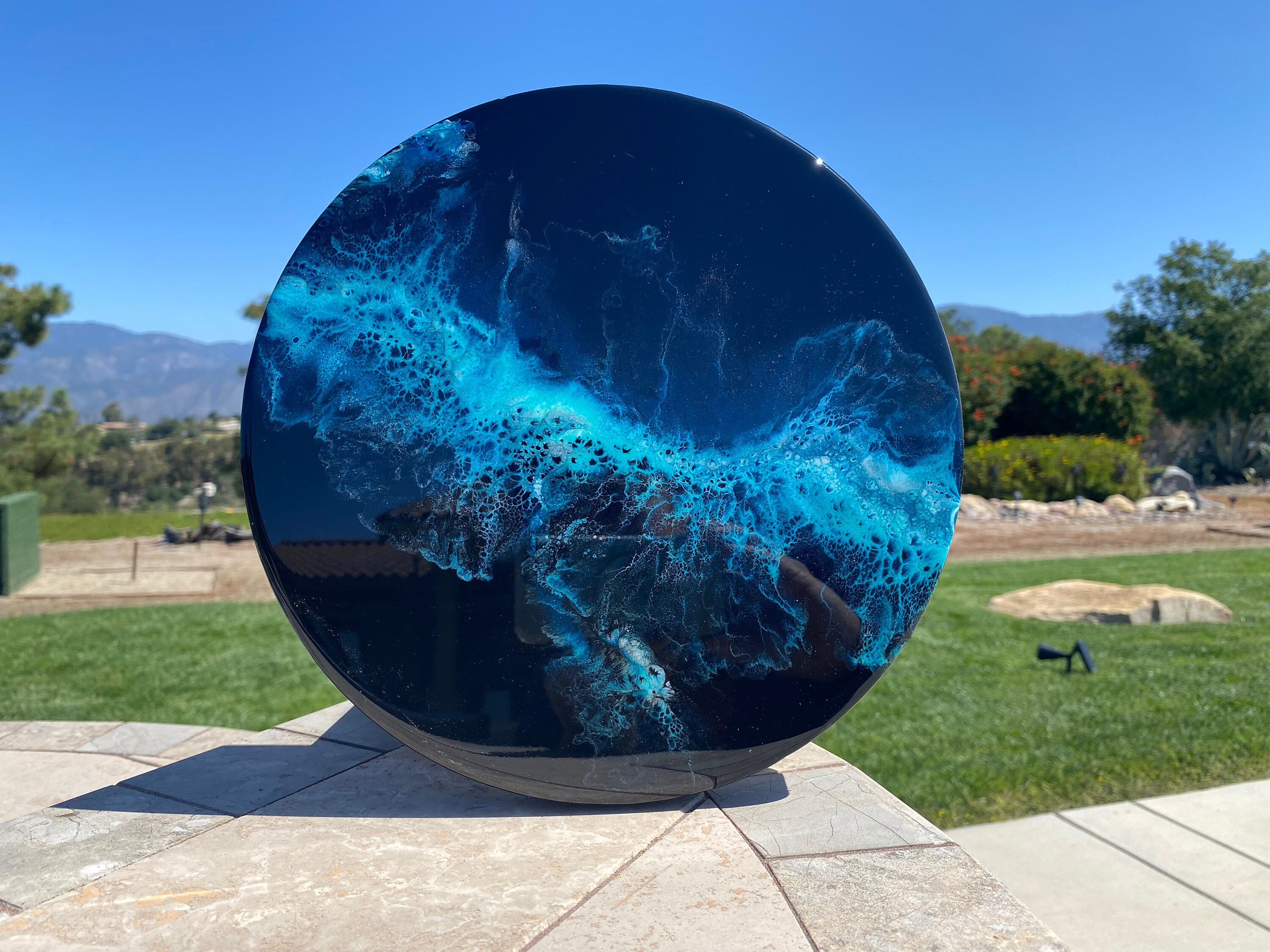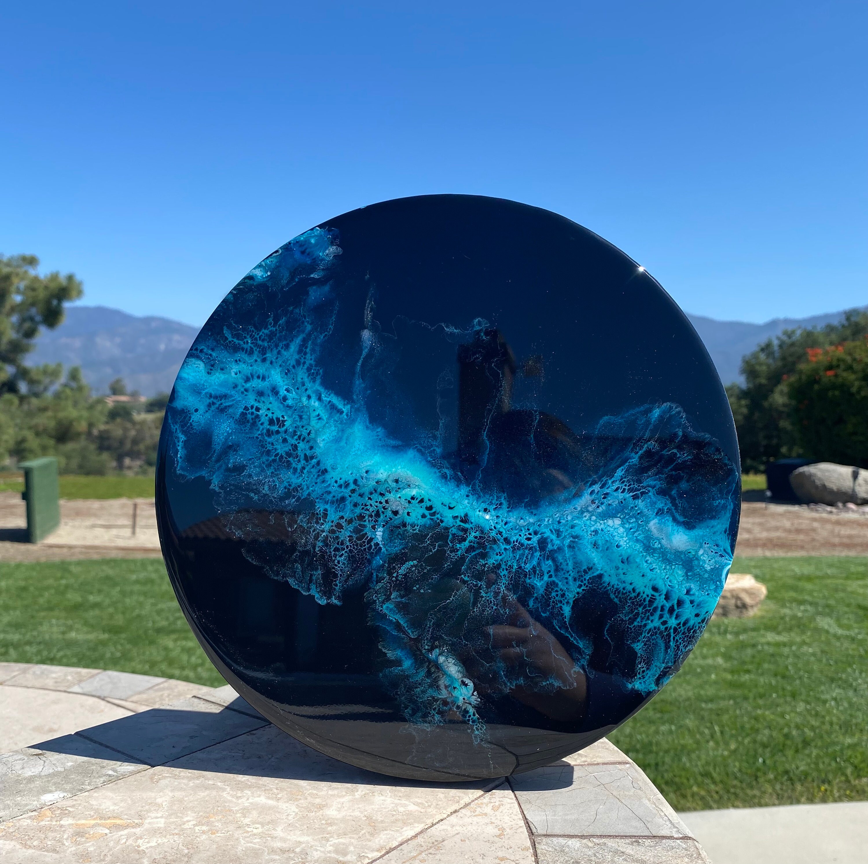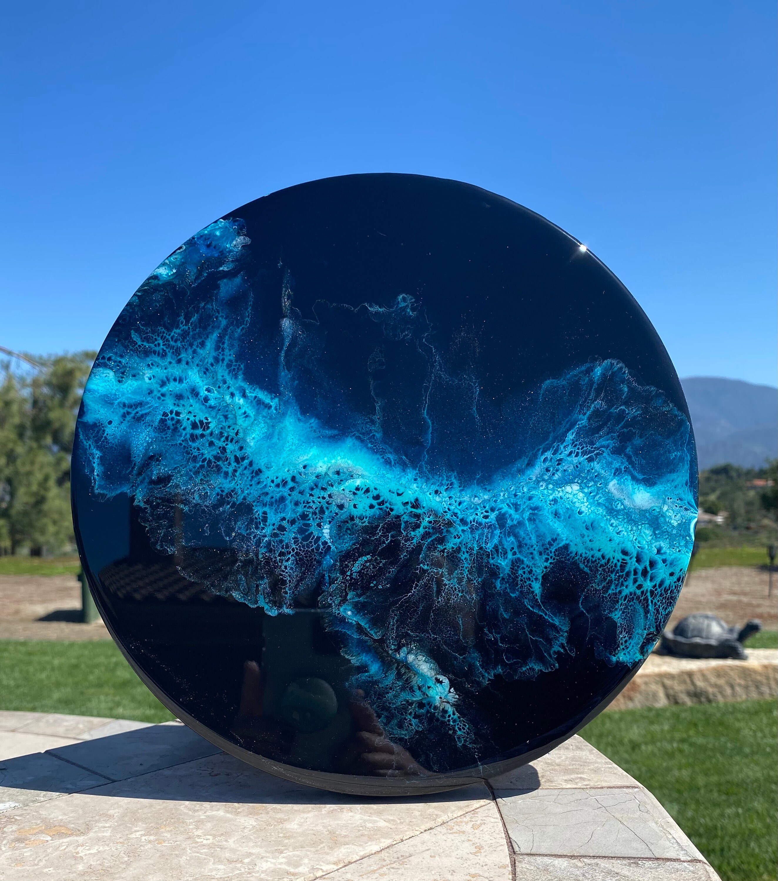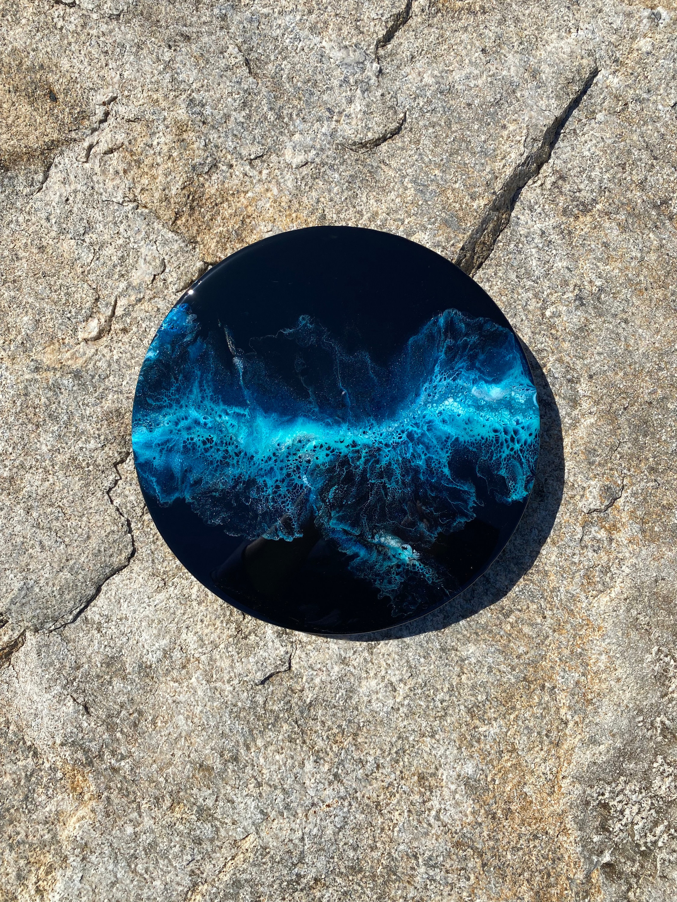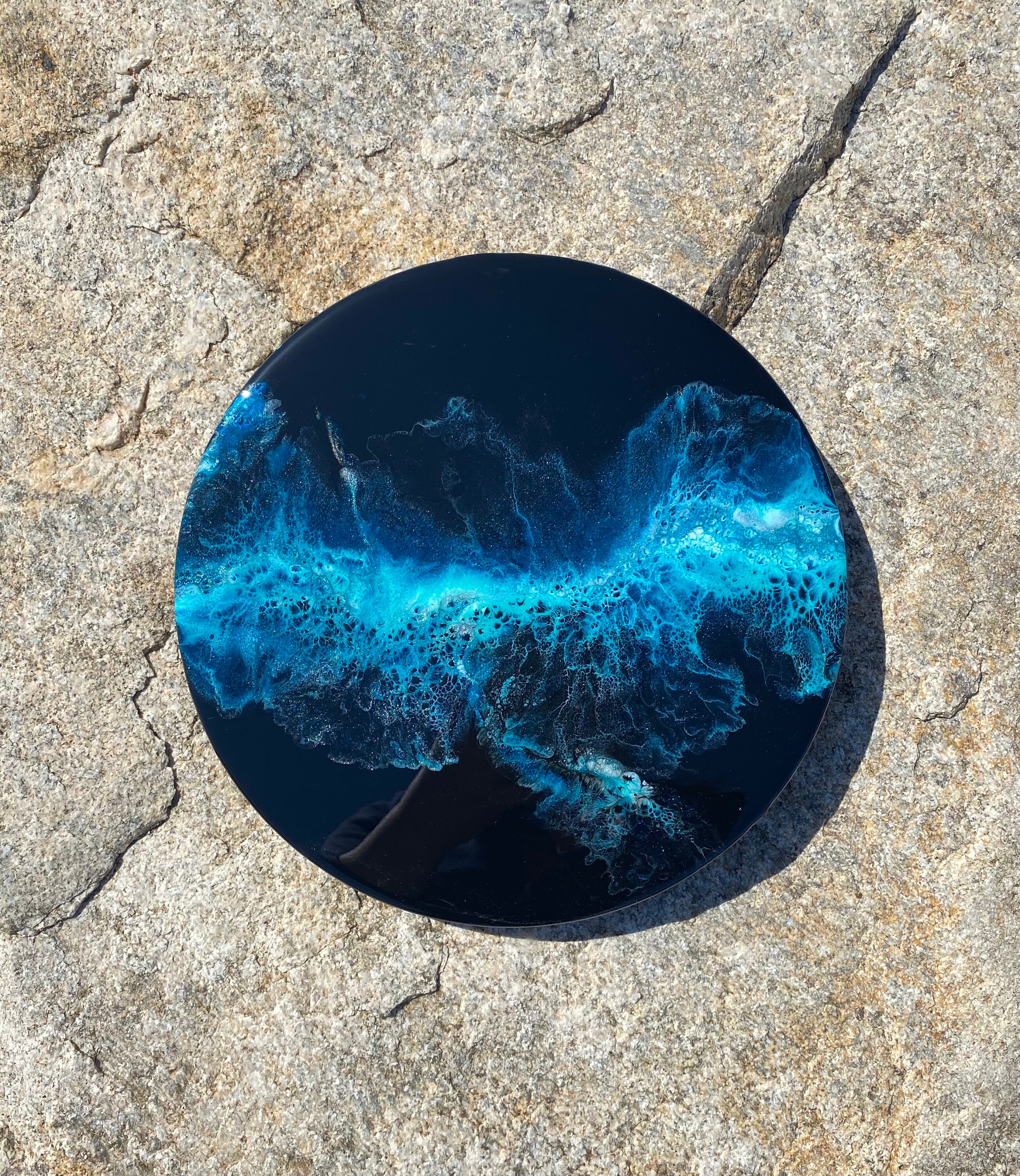 This pour is done as a dutch pour with the base color being black. Colors running throughout are: various shades of blues, teals, silver, and white. This piece is gorgeous and very vibrant. It will compliment any room of your house.