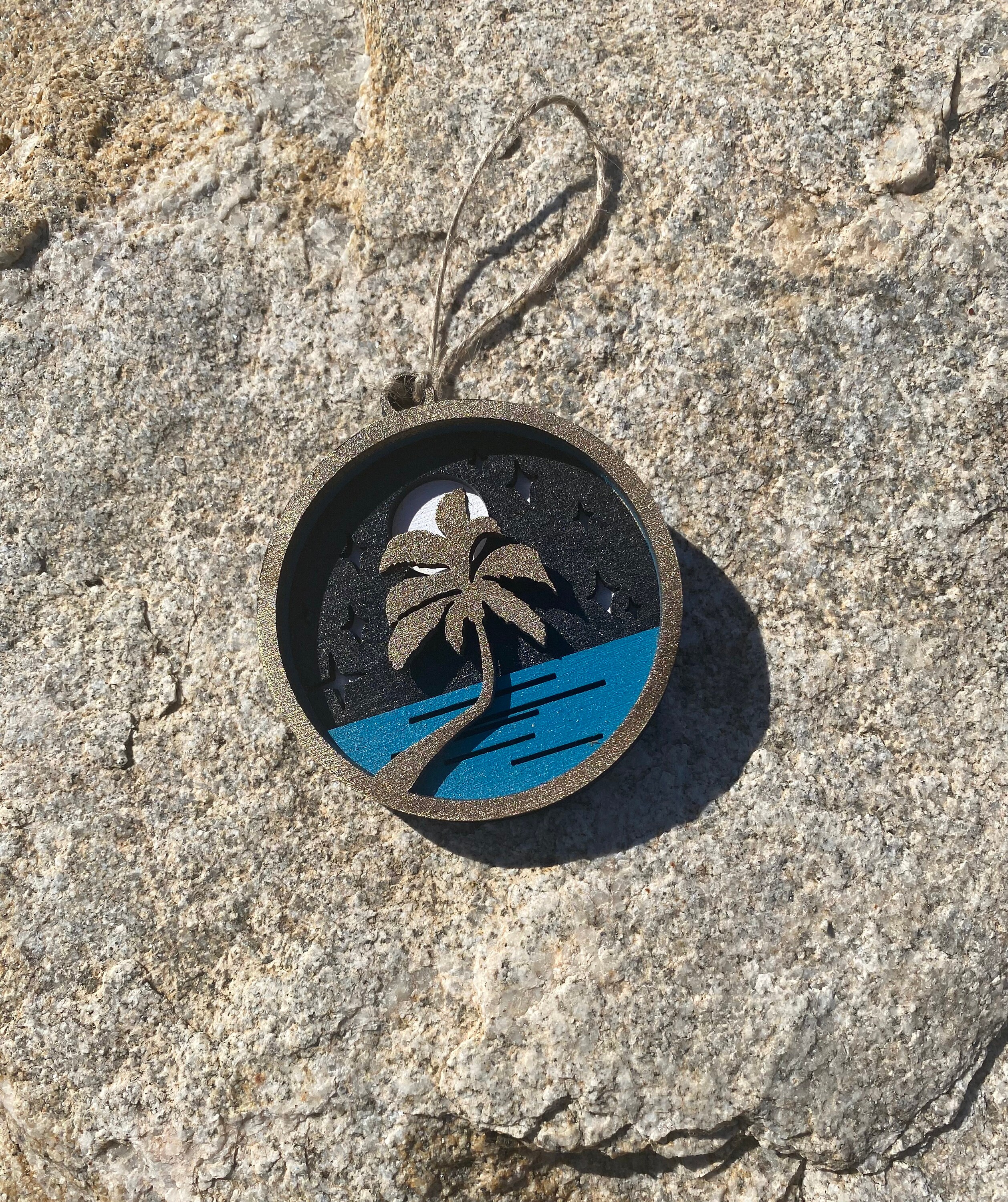 This is a 3d layered wood ornament. This shows a bright moon with dark skies over the ocean with a palm tree flowing in the wind. This ornament is made entirely of wood and tied with jute string so it is ready to hang on your tree.