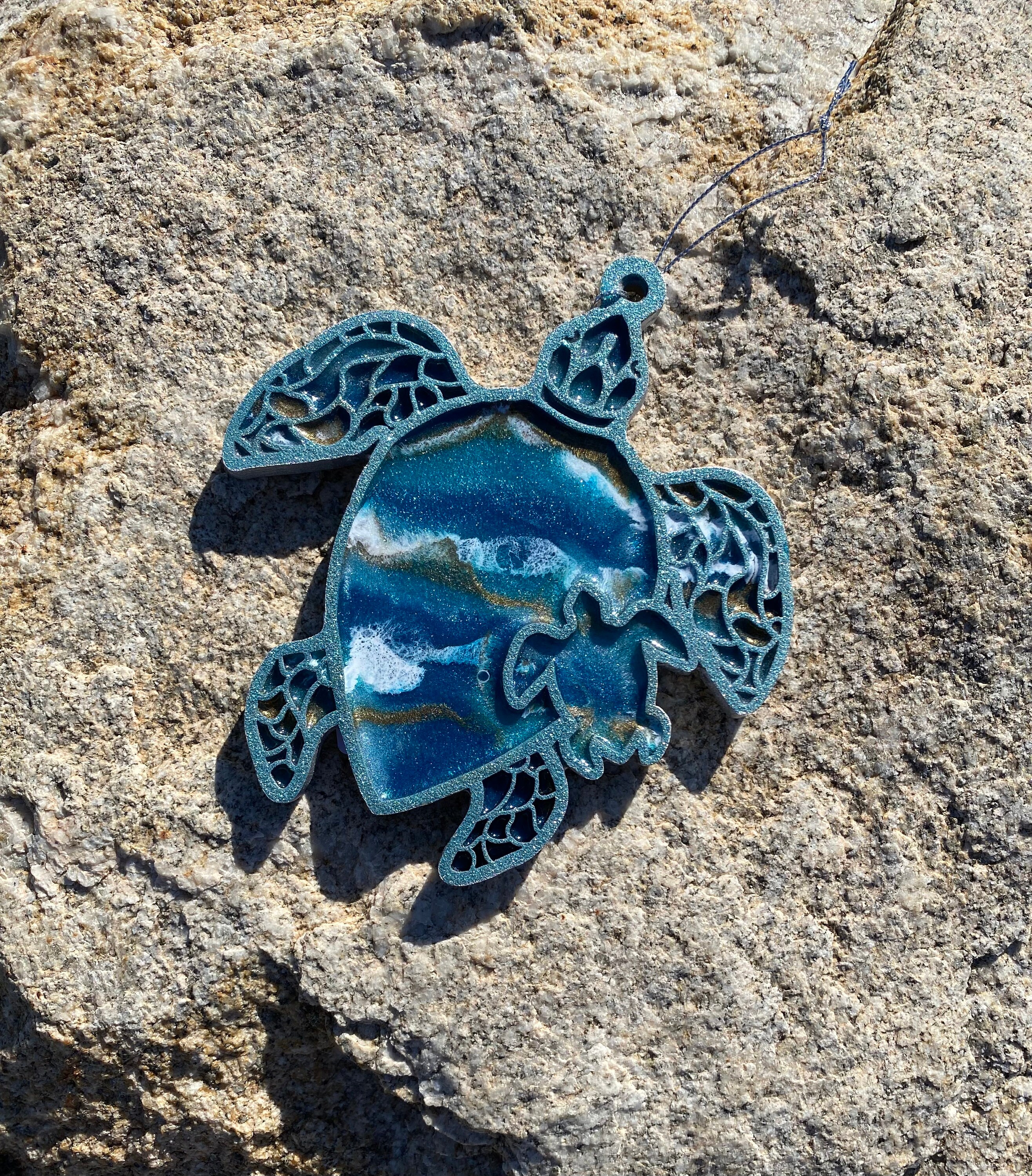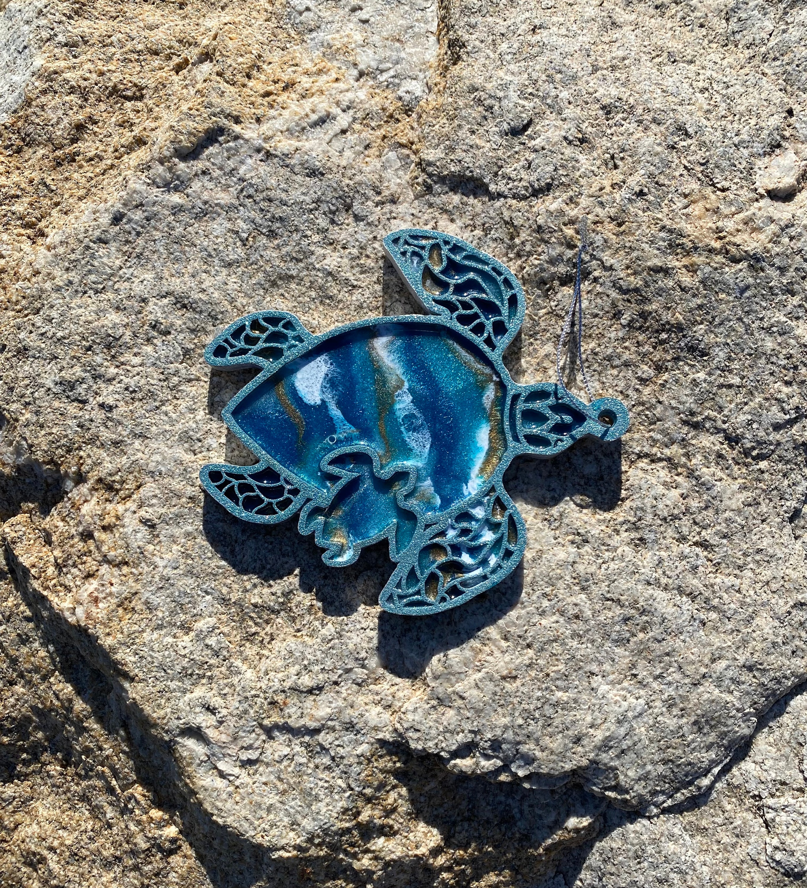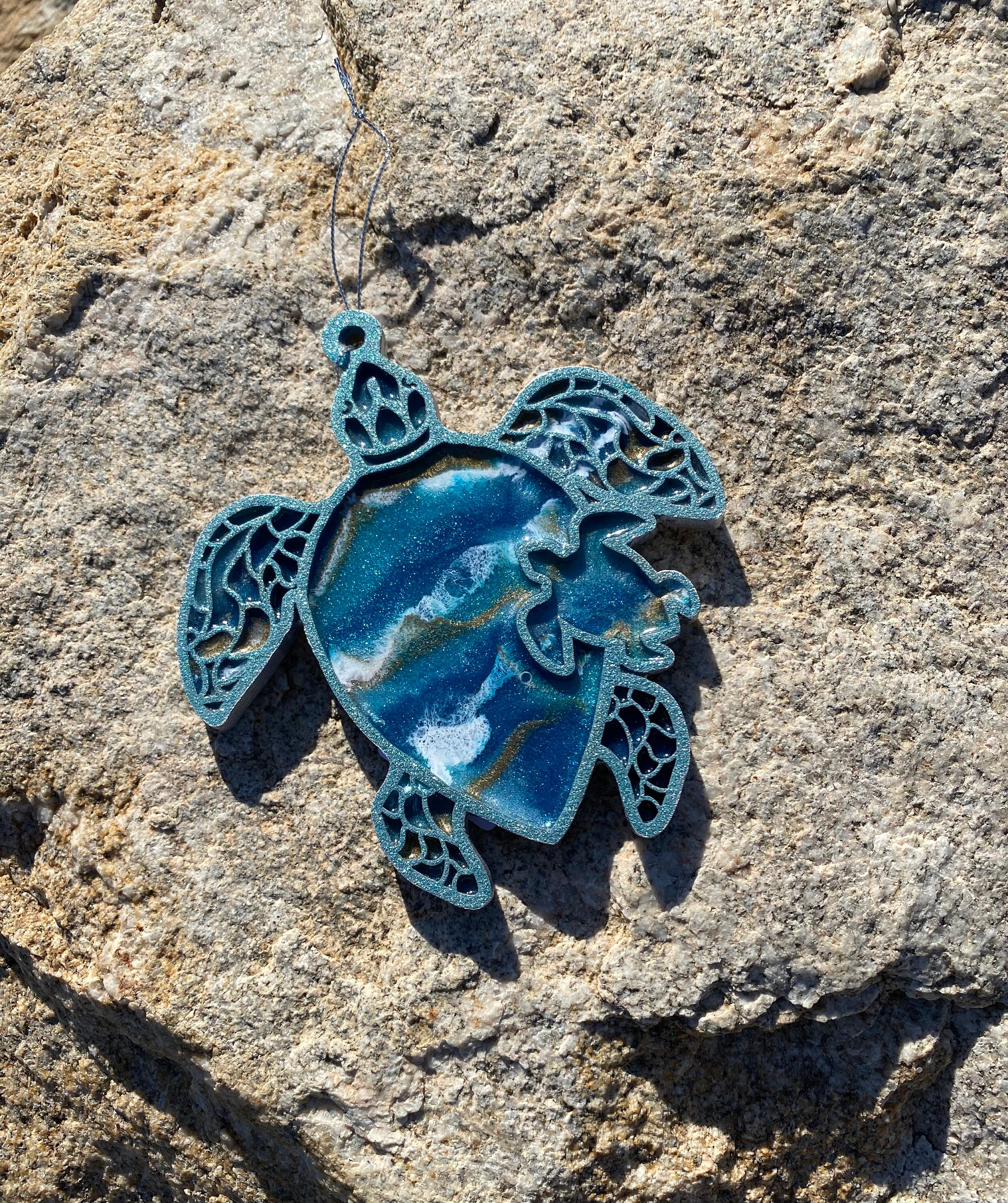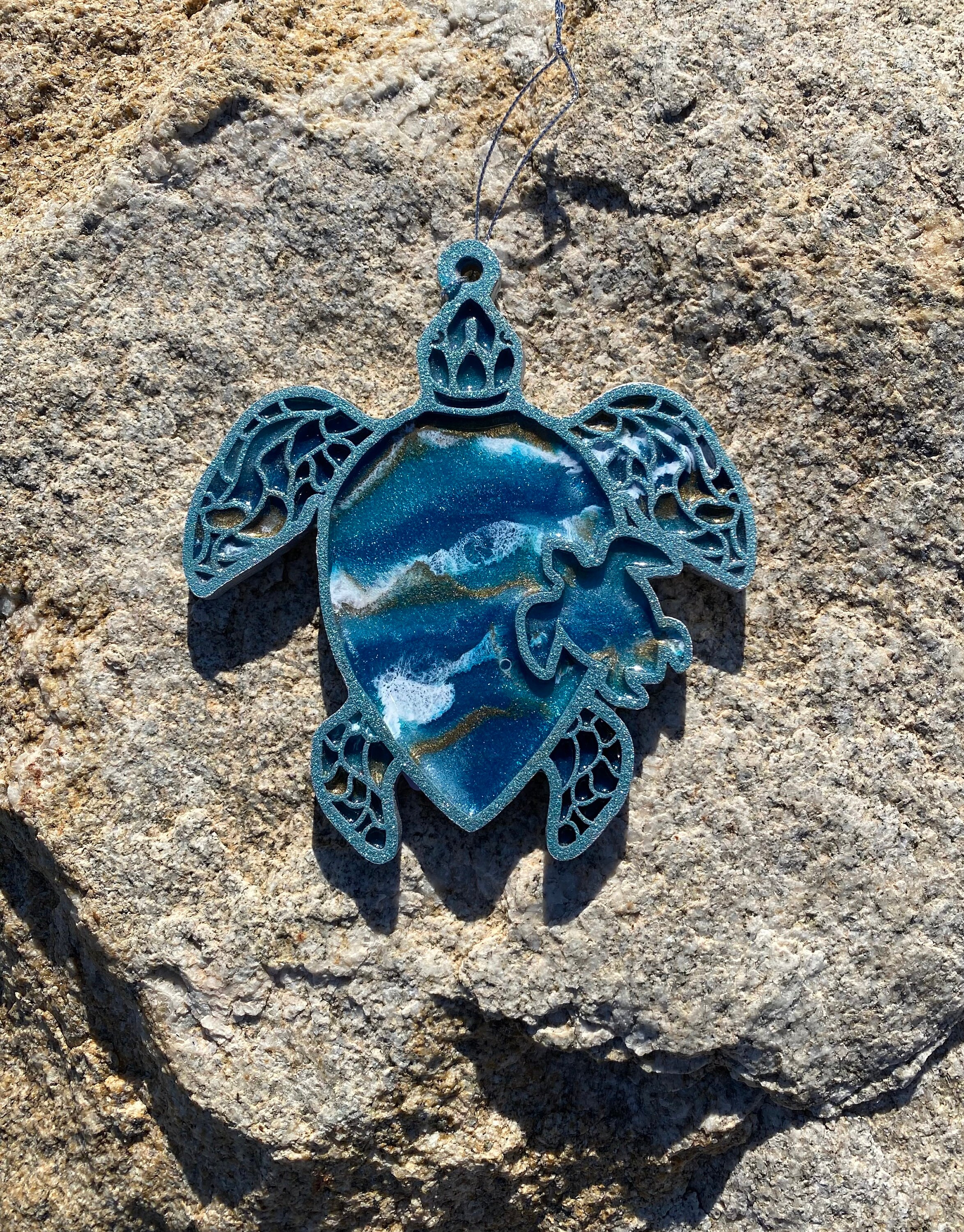 This comes hung on a silver ribbon, so it is ready to hang immediately. This is truly a one-of-a-kind piece as no one resin can be poured exactly like the other.