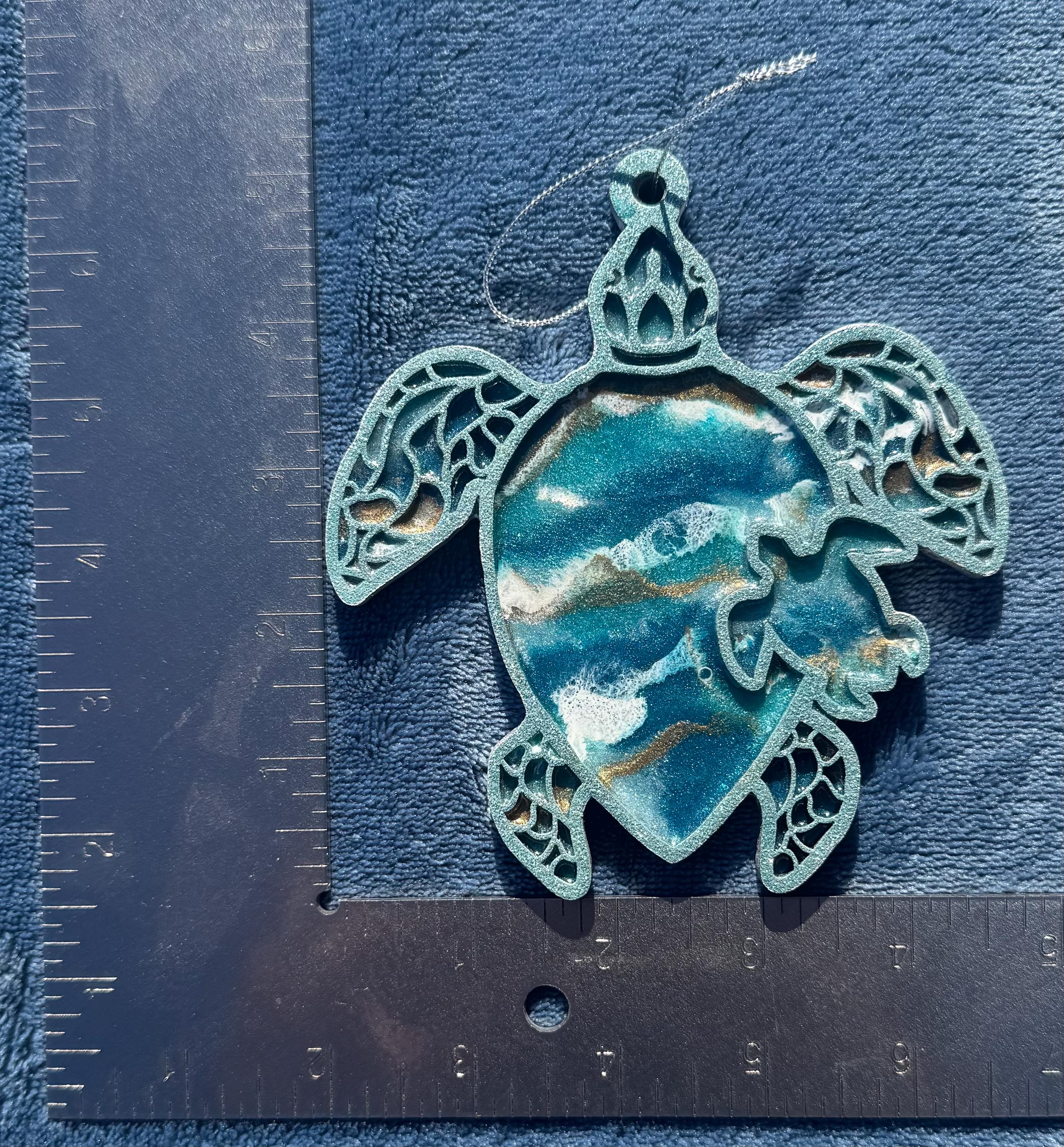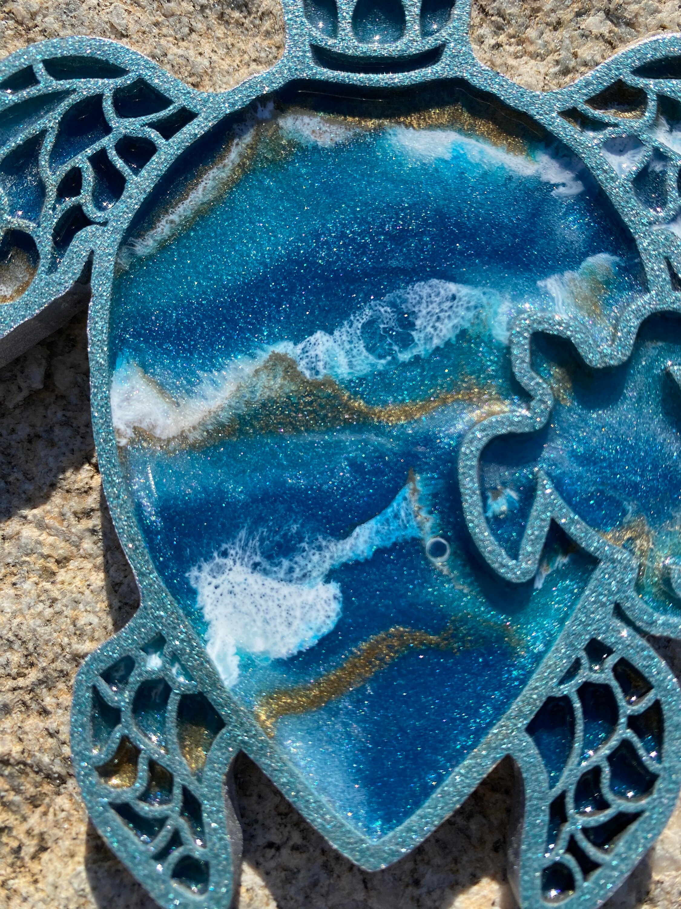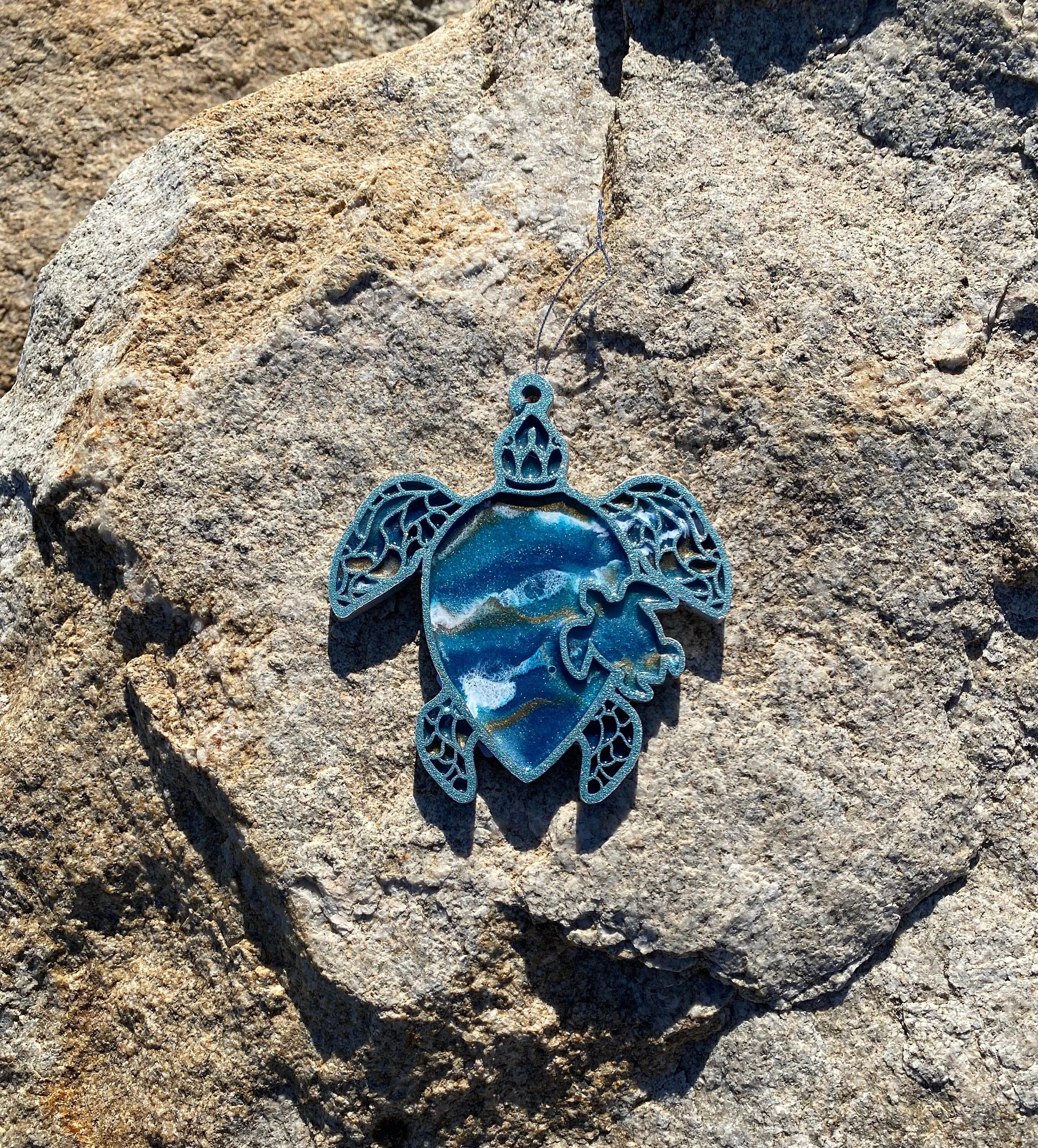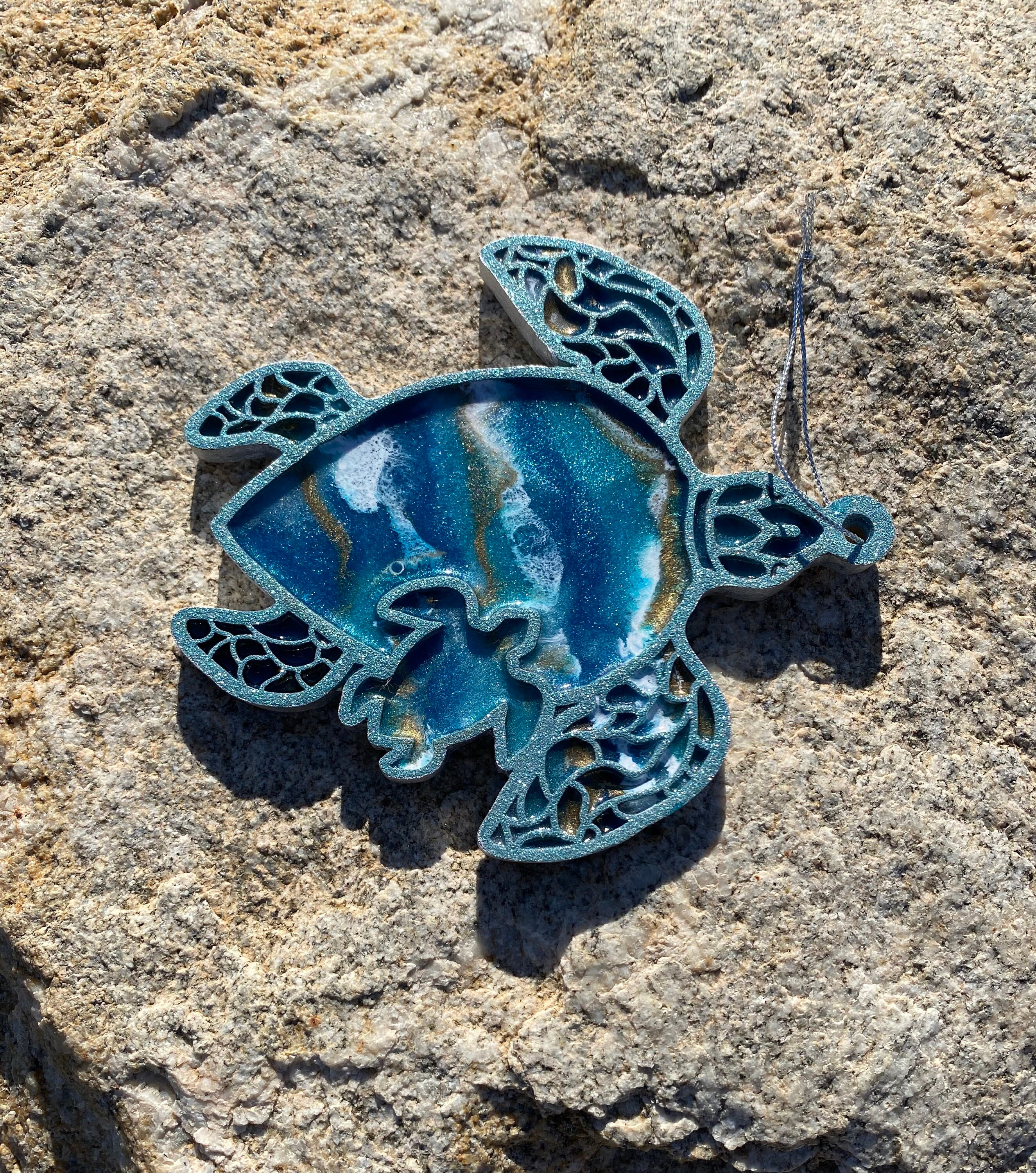 This comes hung on a silver ribbon, so it is ready to hang immediately. This is truly a one-of-a-kind piece as no one resin can be poured exactly like the other.