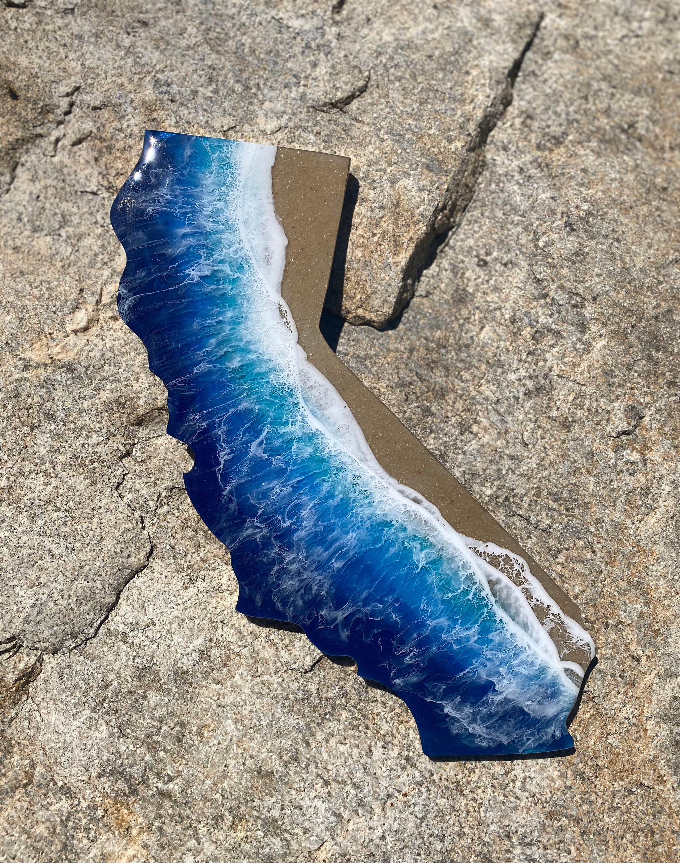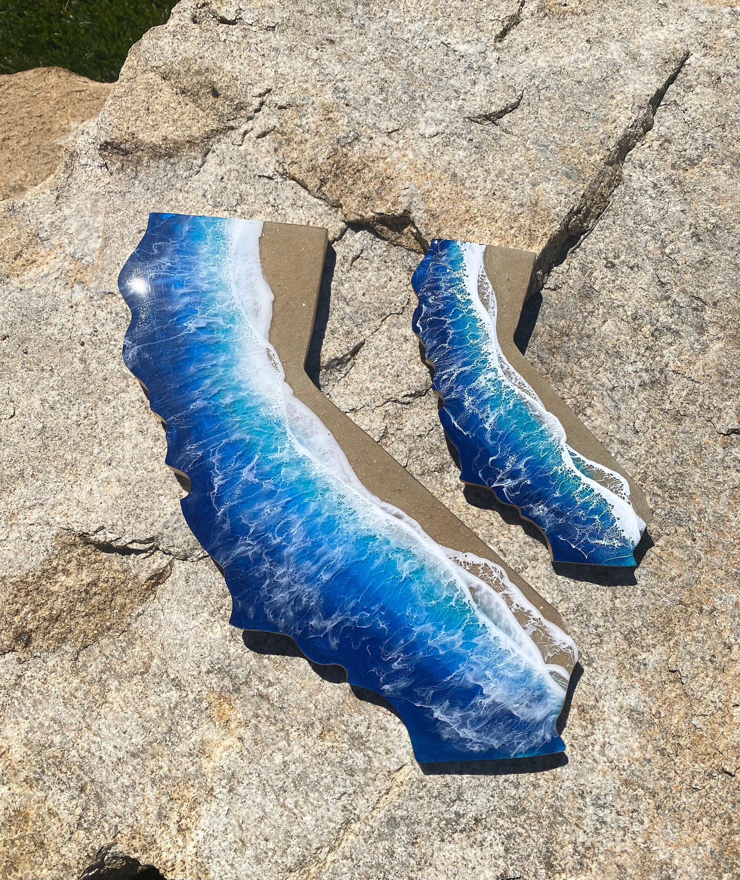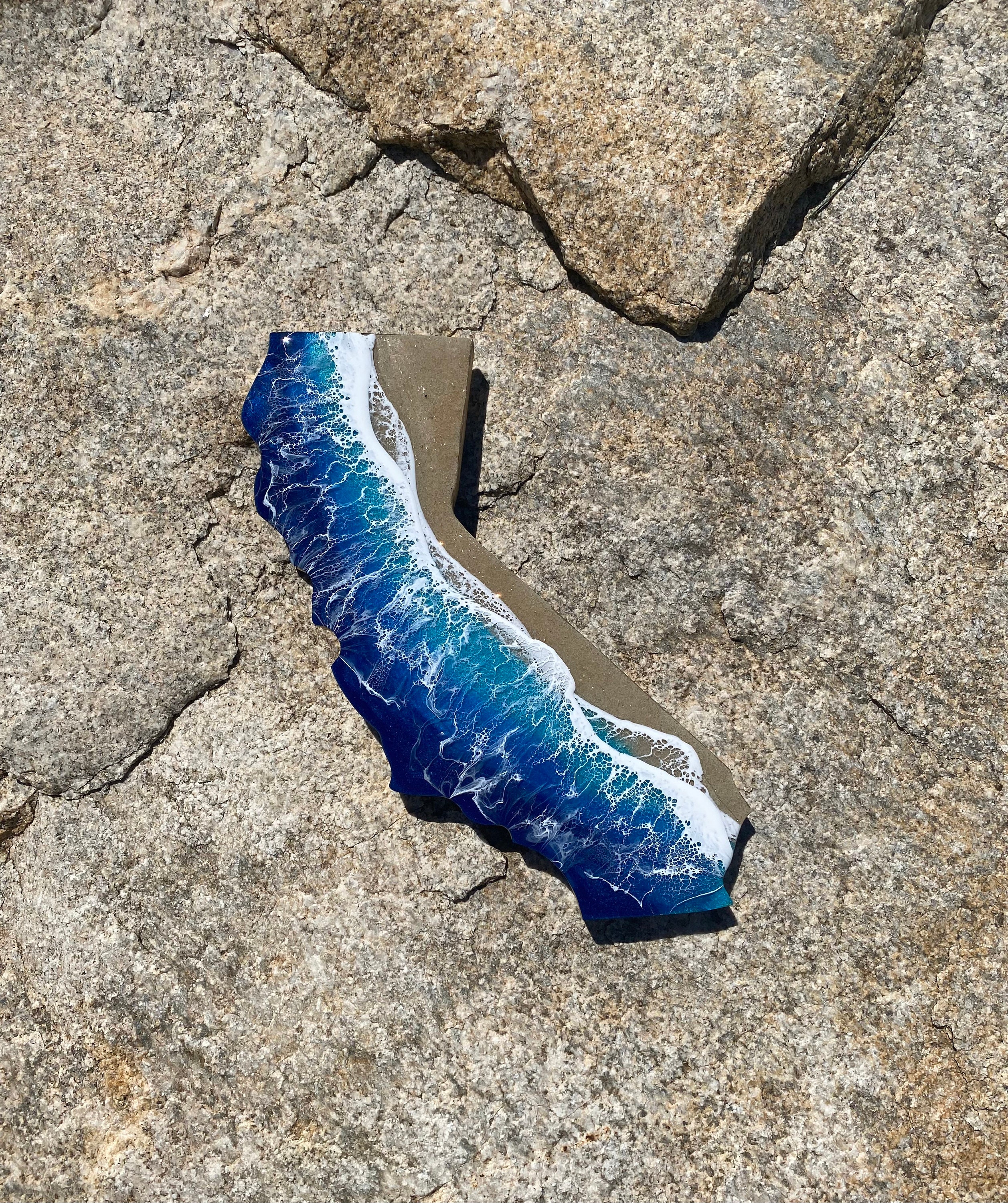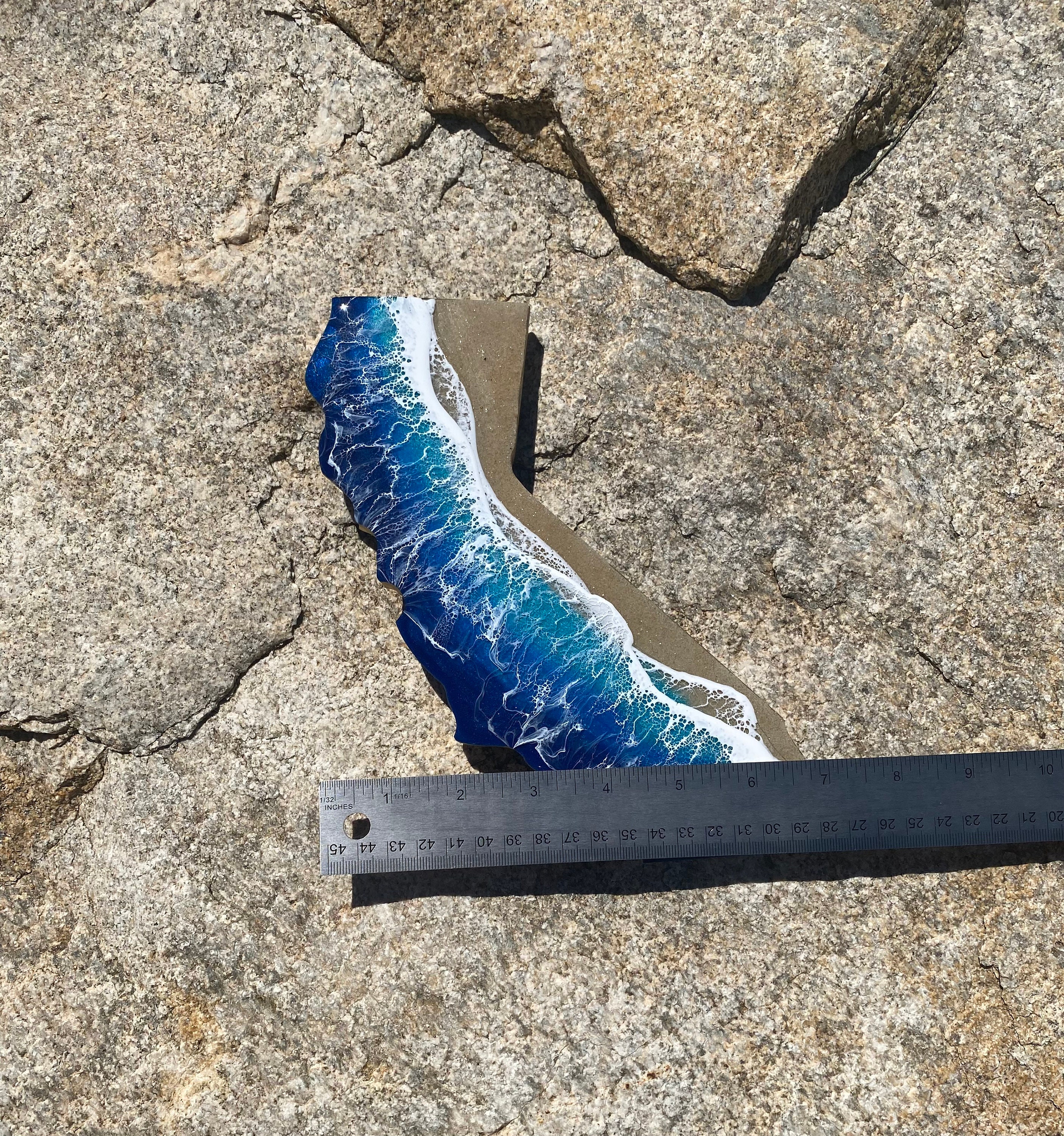 These are wood cut outs of the state of California with layers of resin poured to create an ocean scene.