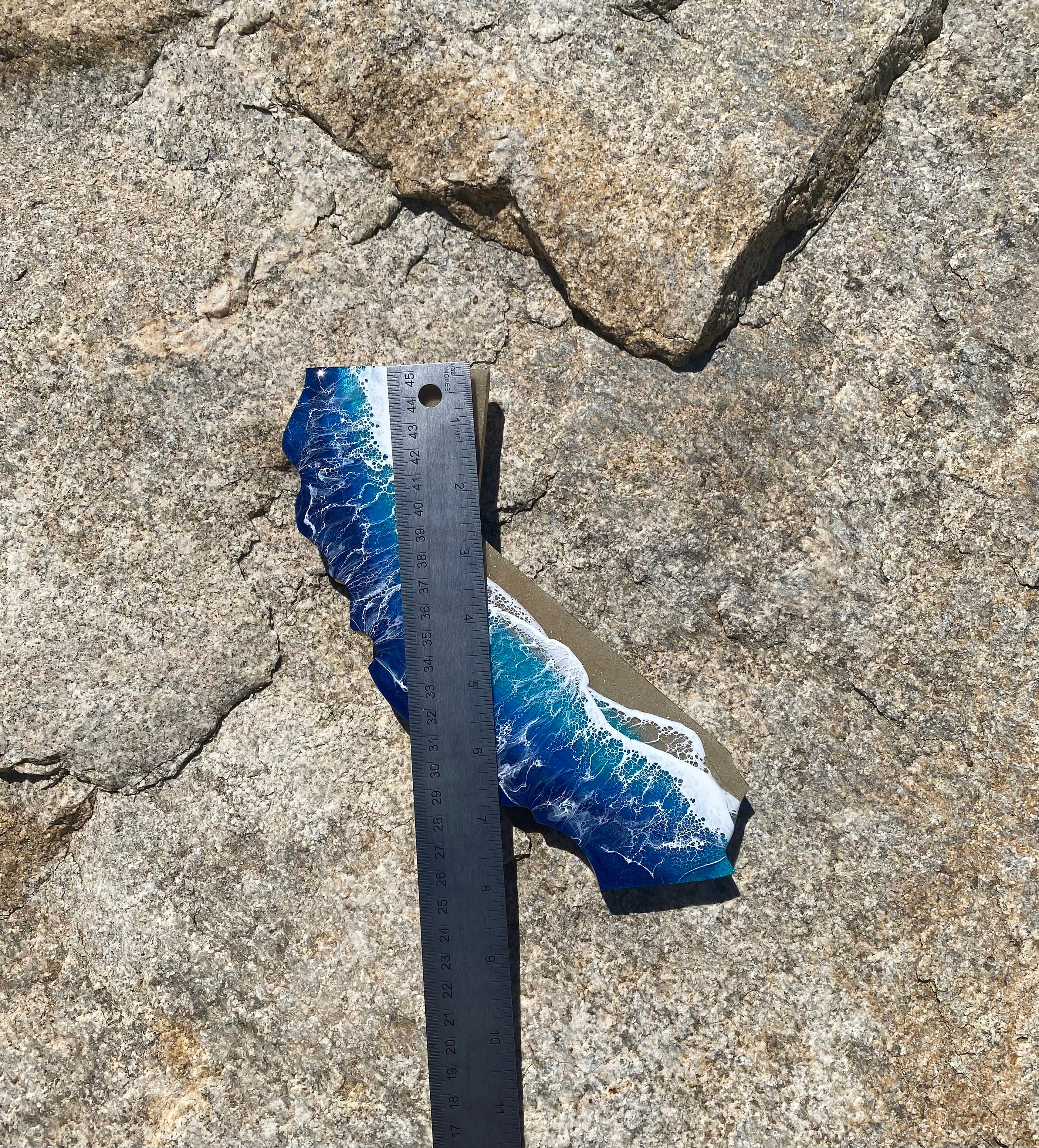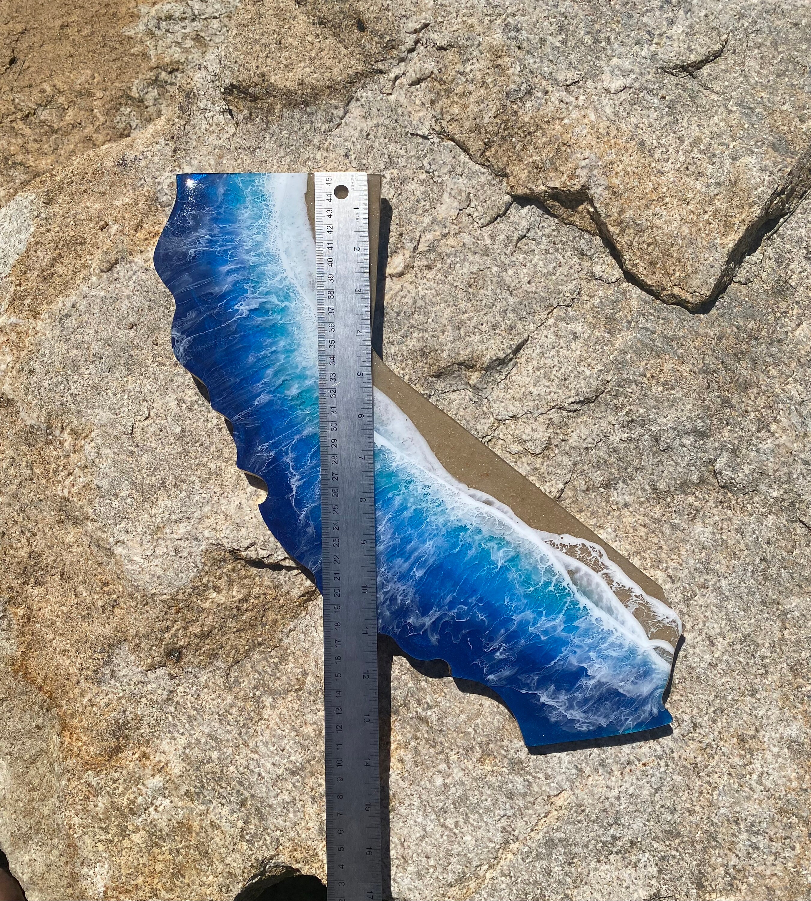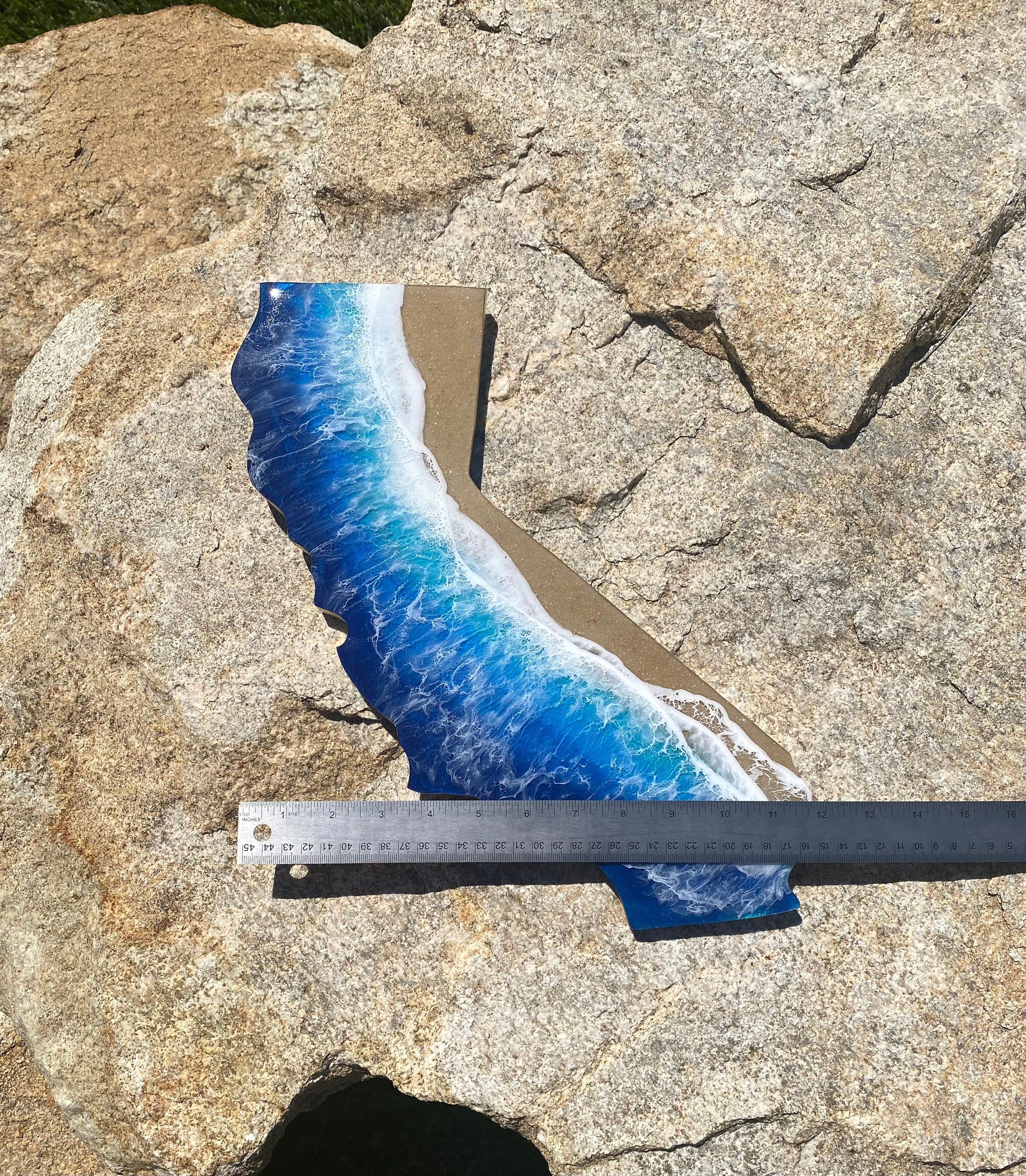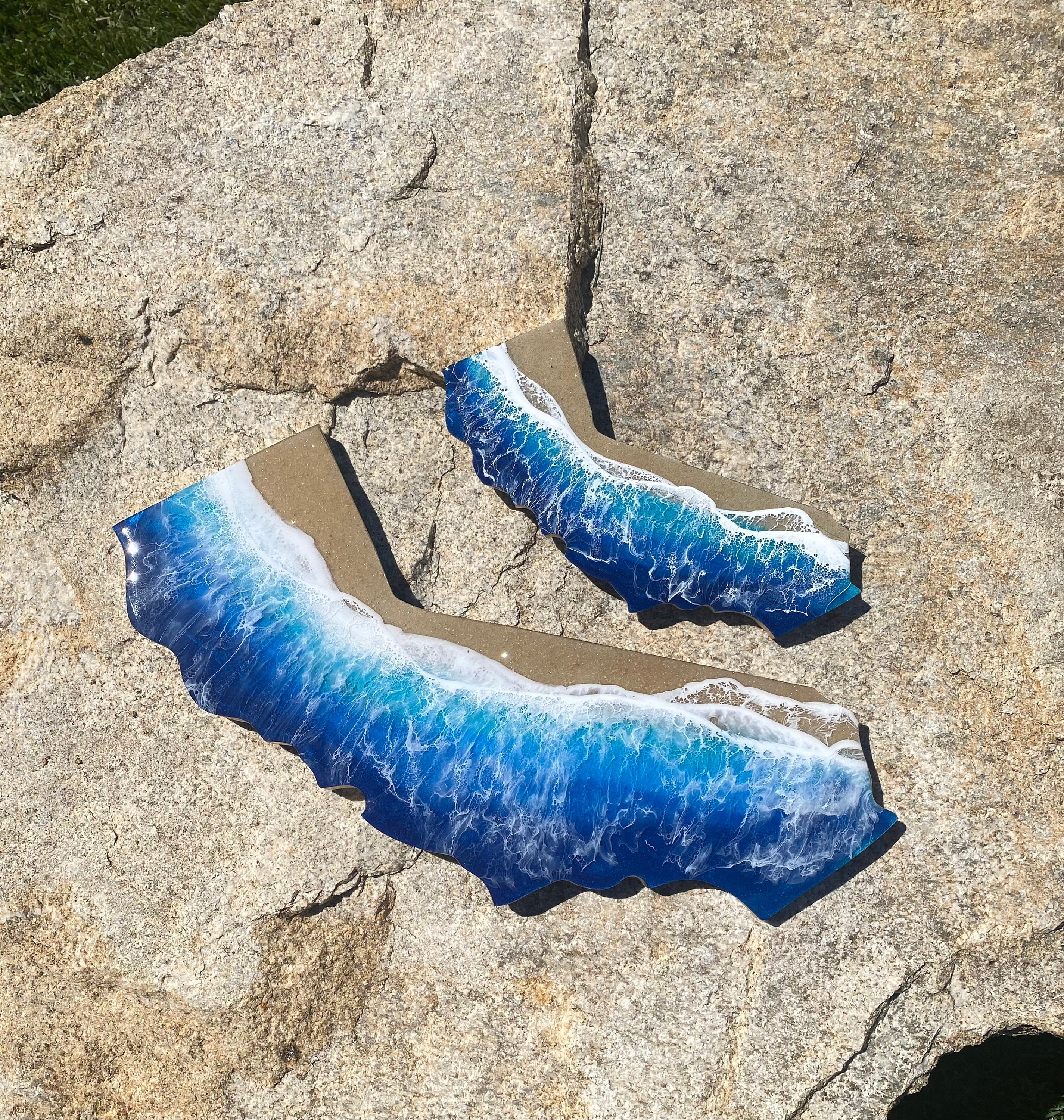 These are wood cut outs of the state of California with layers of resin poured to create an ocean scene.