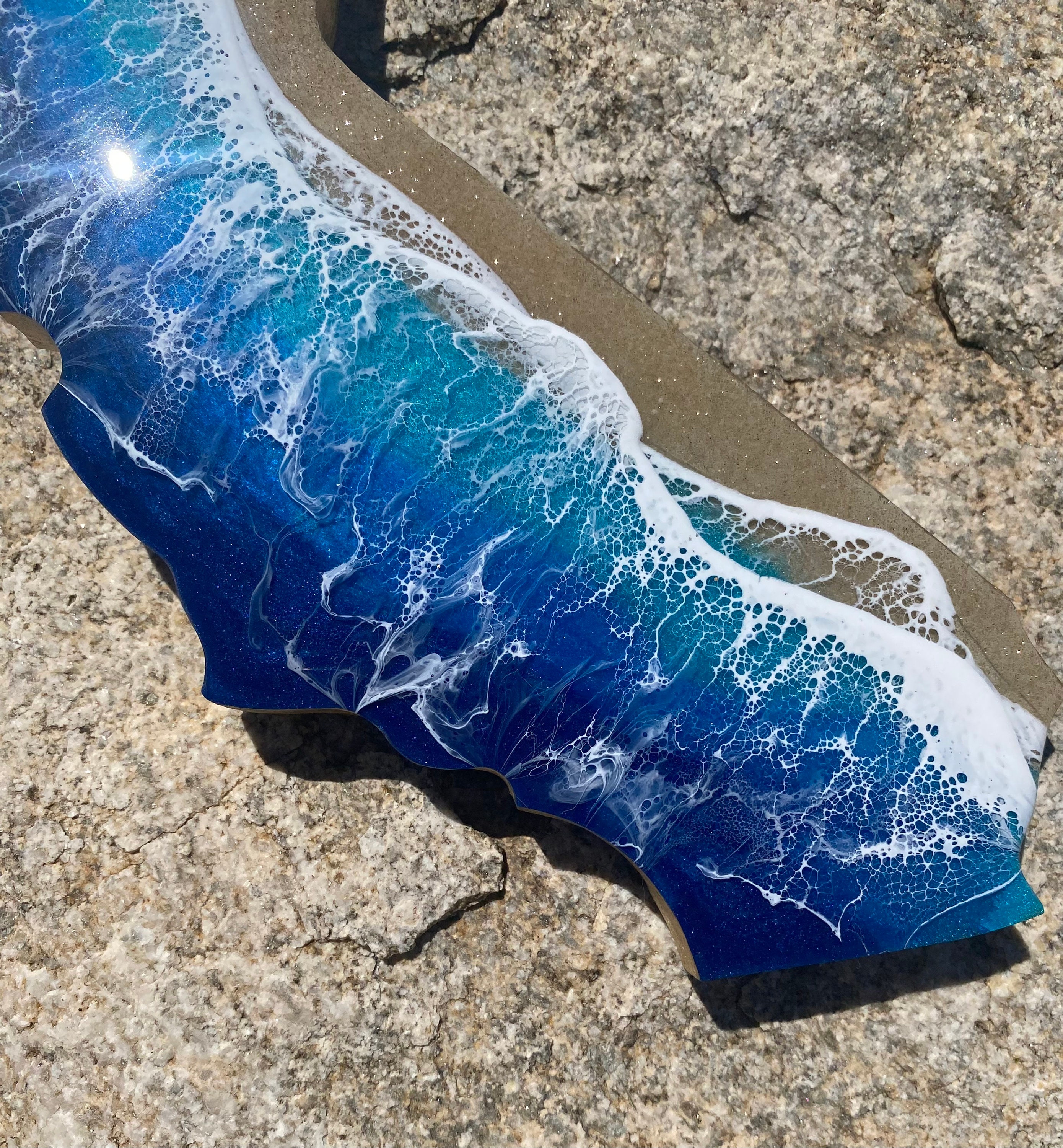 The sand area is made from real tan sand. The colors in this piece are a deep dark blue, metallic blue, and teal green with layers of crisp foamy waves and is absolutely beautiful.