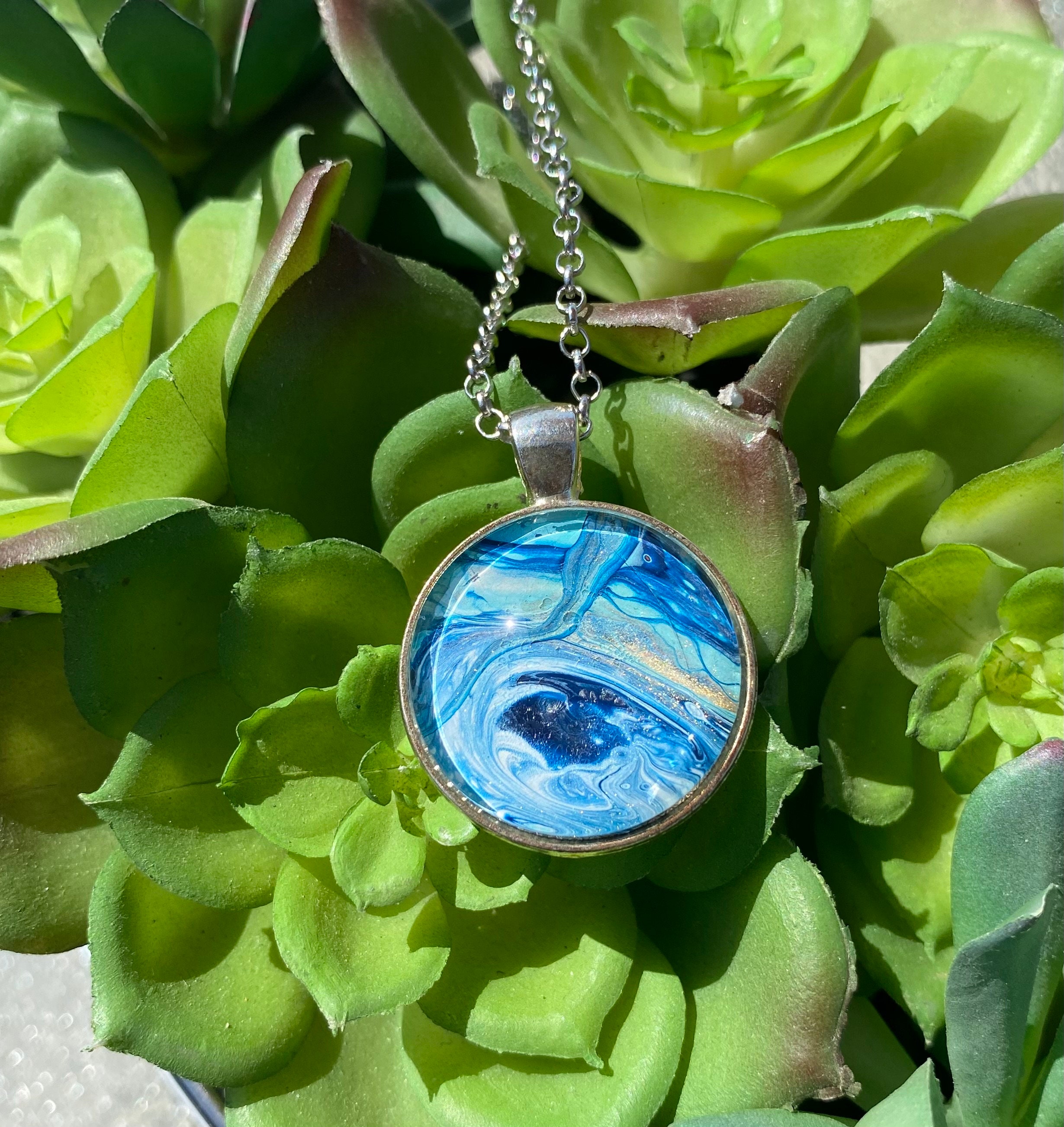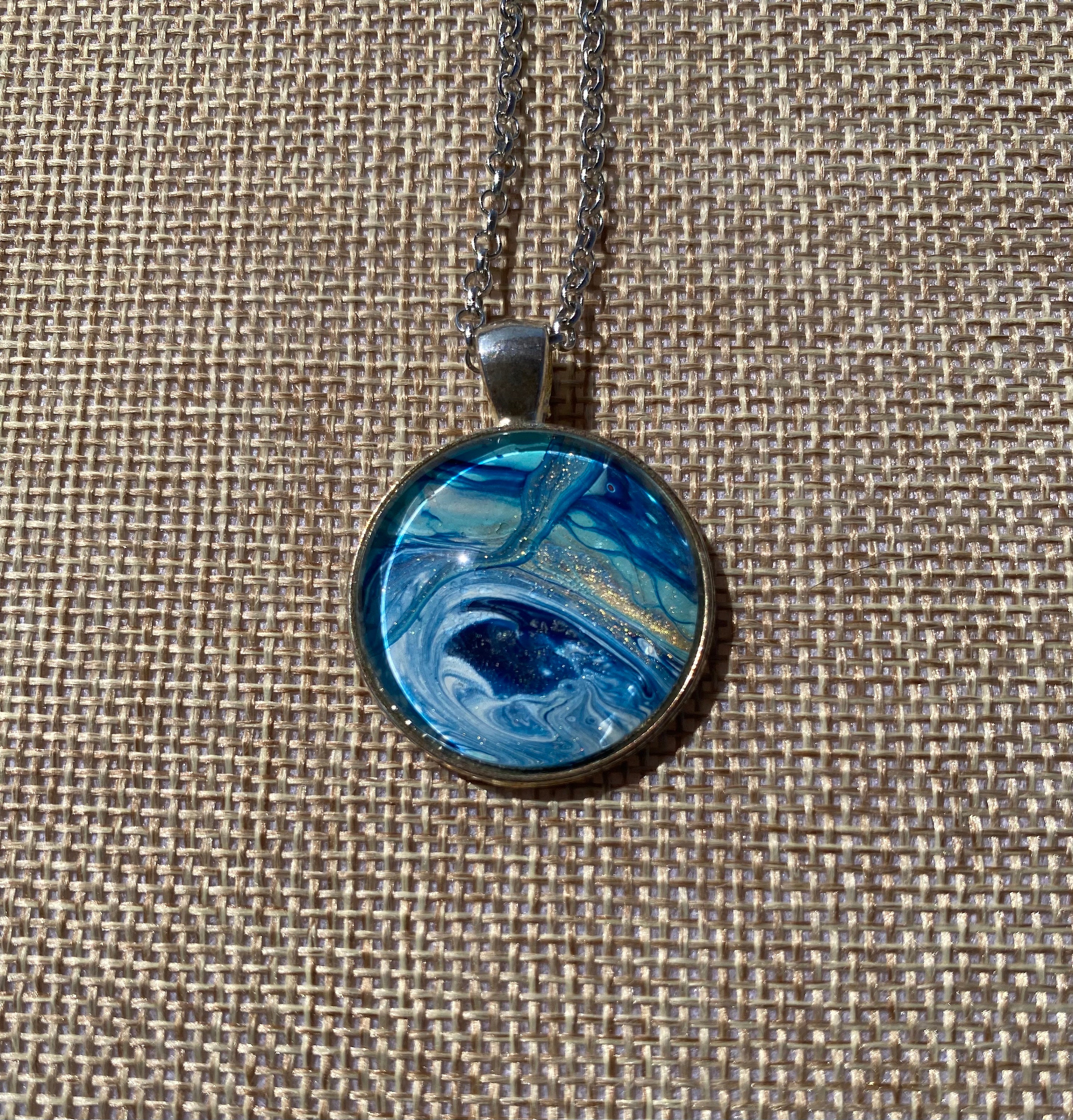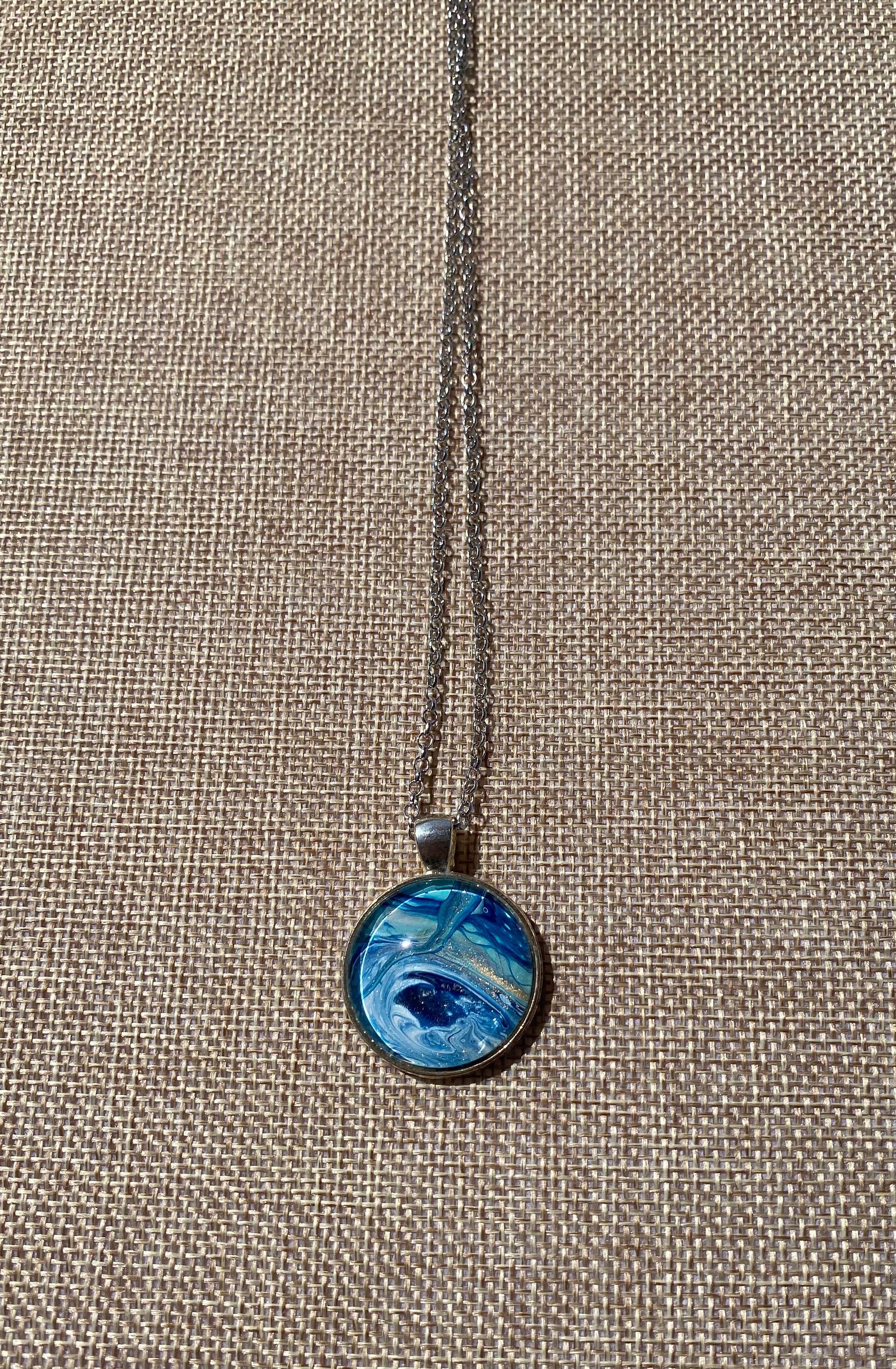 I truly enjoy mixed media art. One of the arts that I enjoy is acrylic pour painting. When you create these beautiful pieces of art you create custom mixes of paint during the canvas paintings. From that session you are left with pools of gorgeous one of a kind abstract art. From that art I remove my favorite pieces and create beautiful jewelry to be enjoyed day in and day out and coordinate beautifully with your wardrobe. The necklaces make wonderful one of a kind gifts.