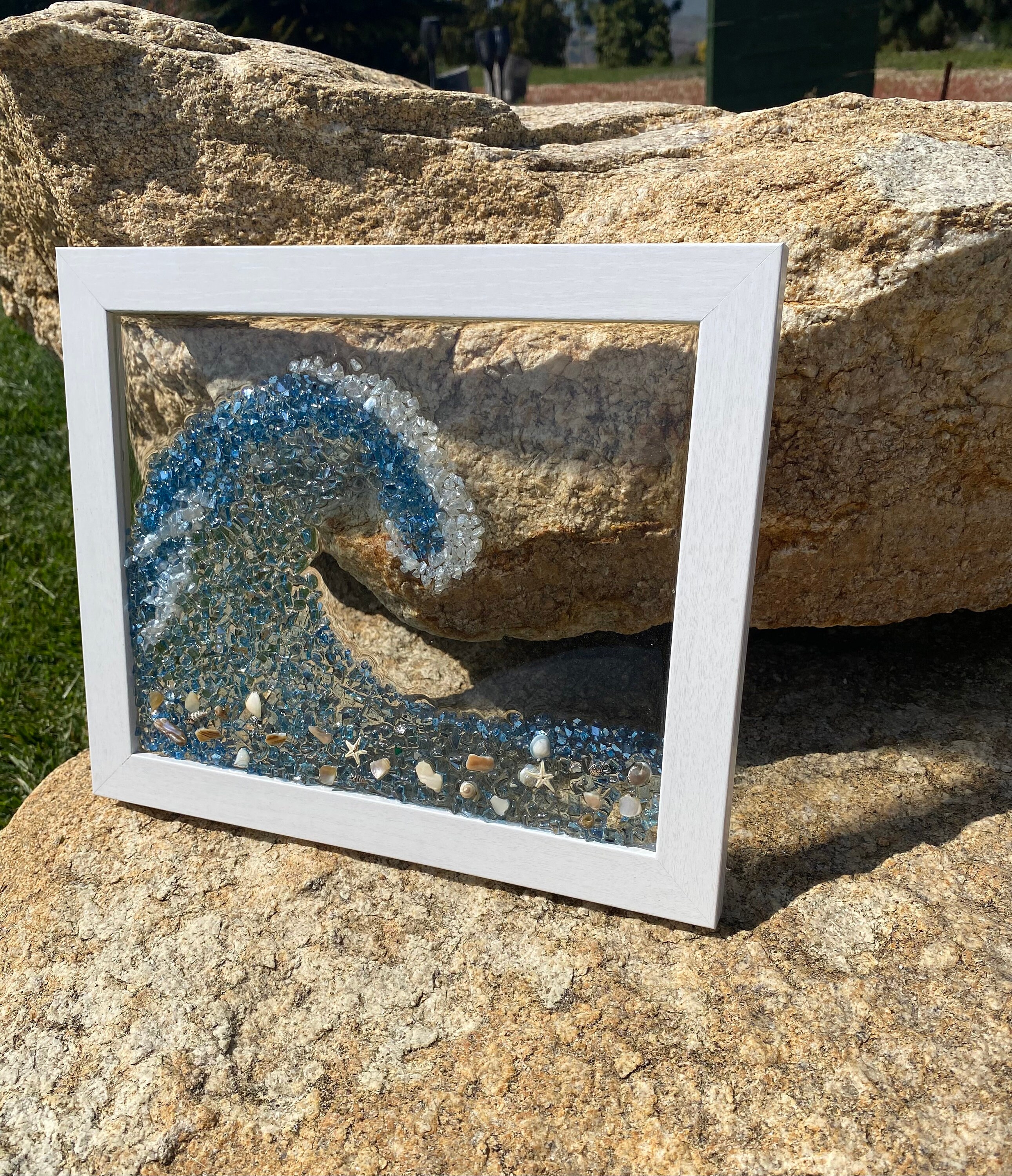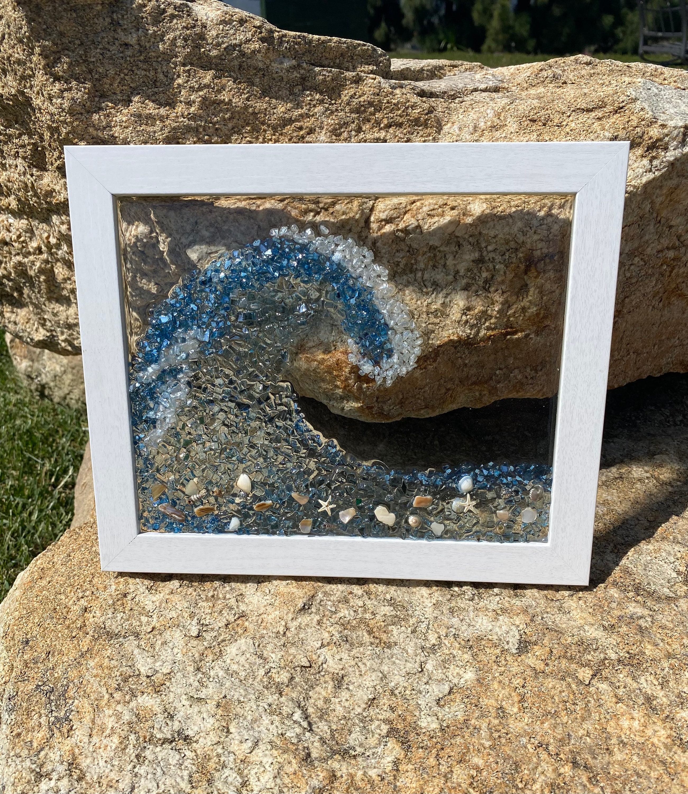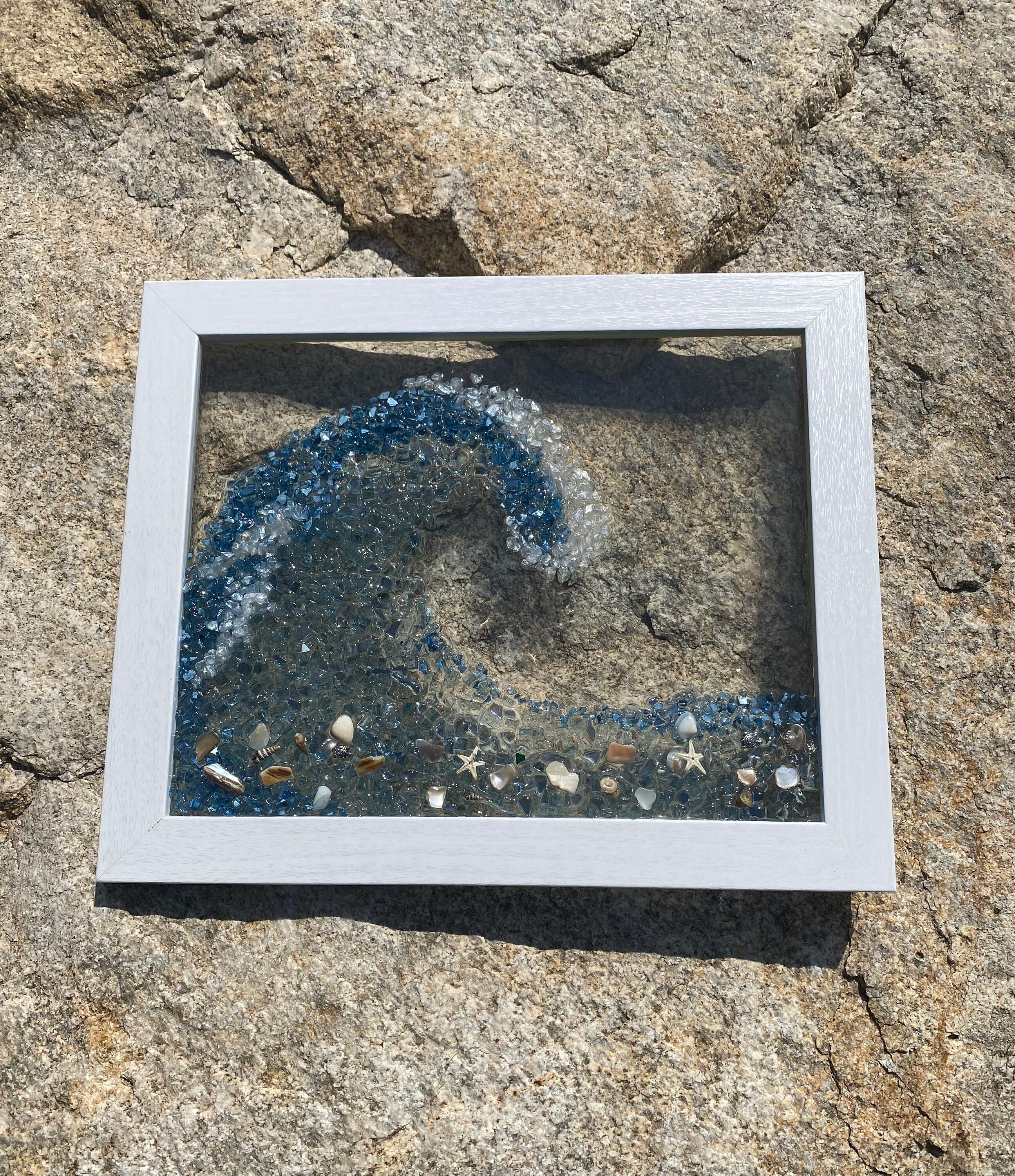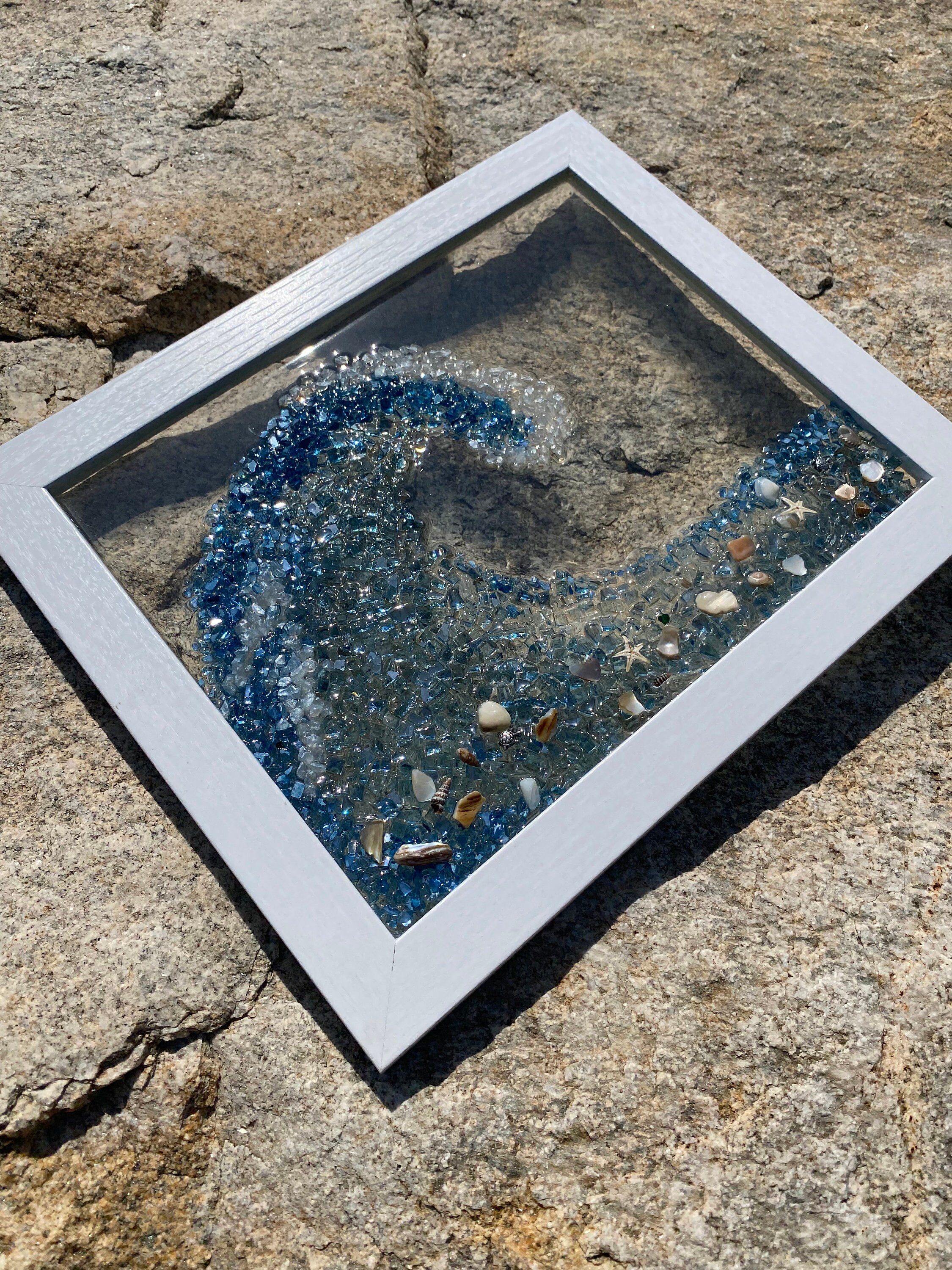 This gorgeous ocean wave resin art will make you feel like you are in the ocean and give you that sense of peace and tranquility. This piece has been designed into a wave shape using crushed glass and mirror pieces and decorated with shells of all kinds. This wave has colors of dark blue, light blue, white, and touches of silver throughout.