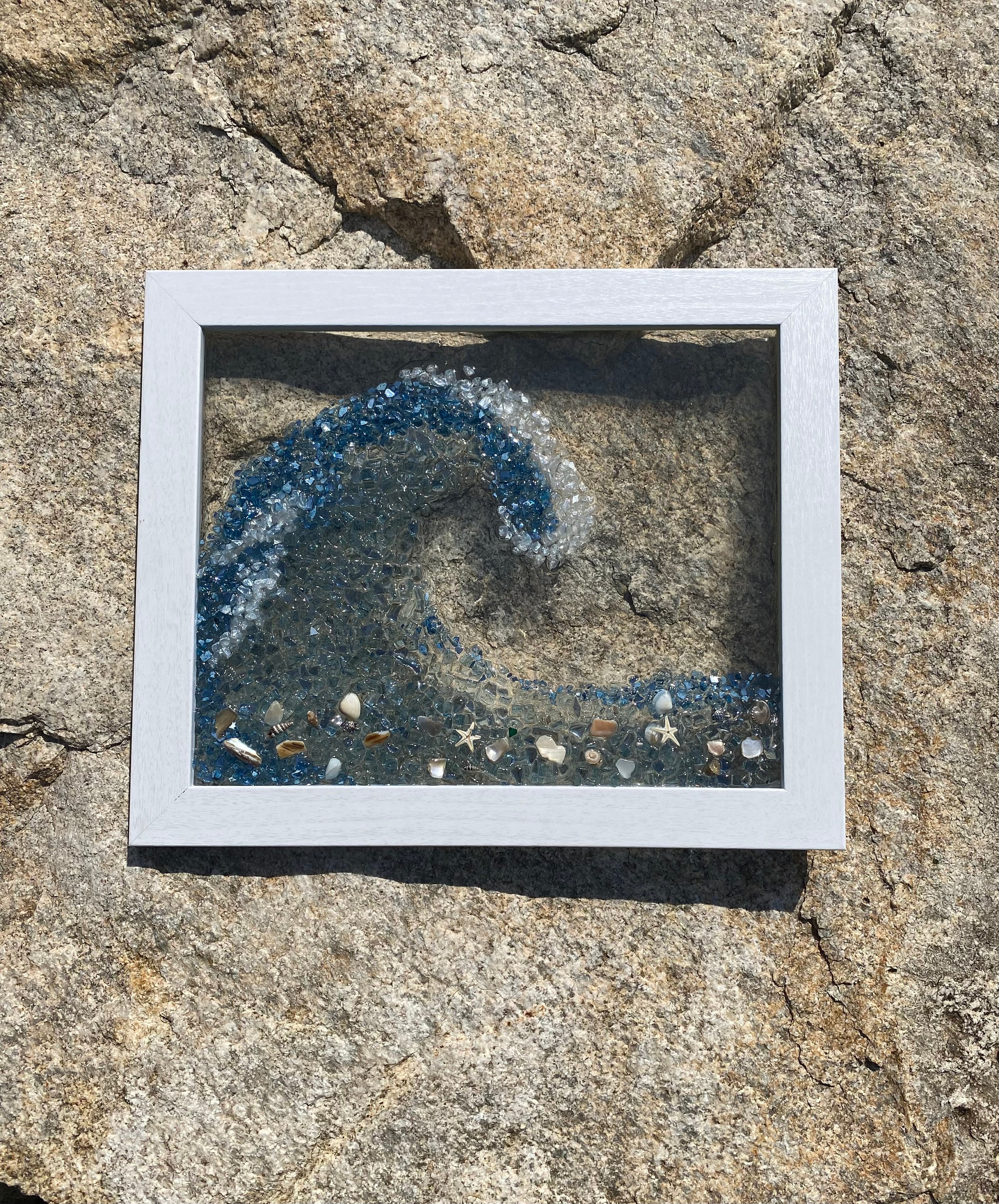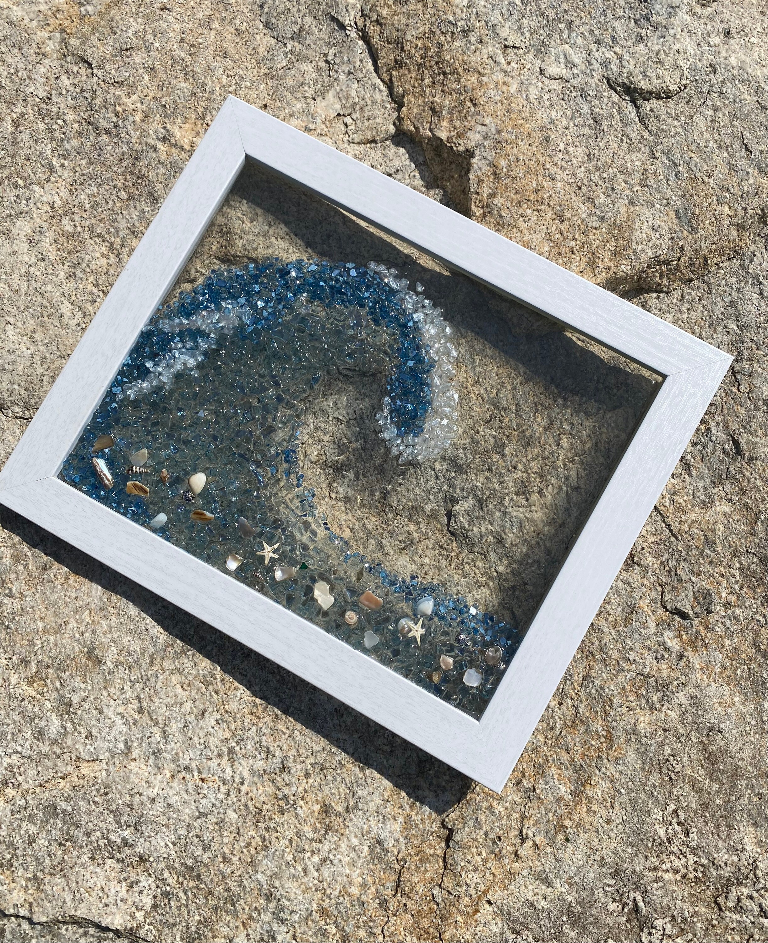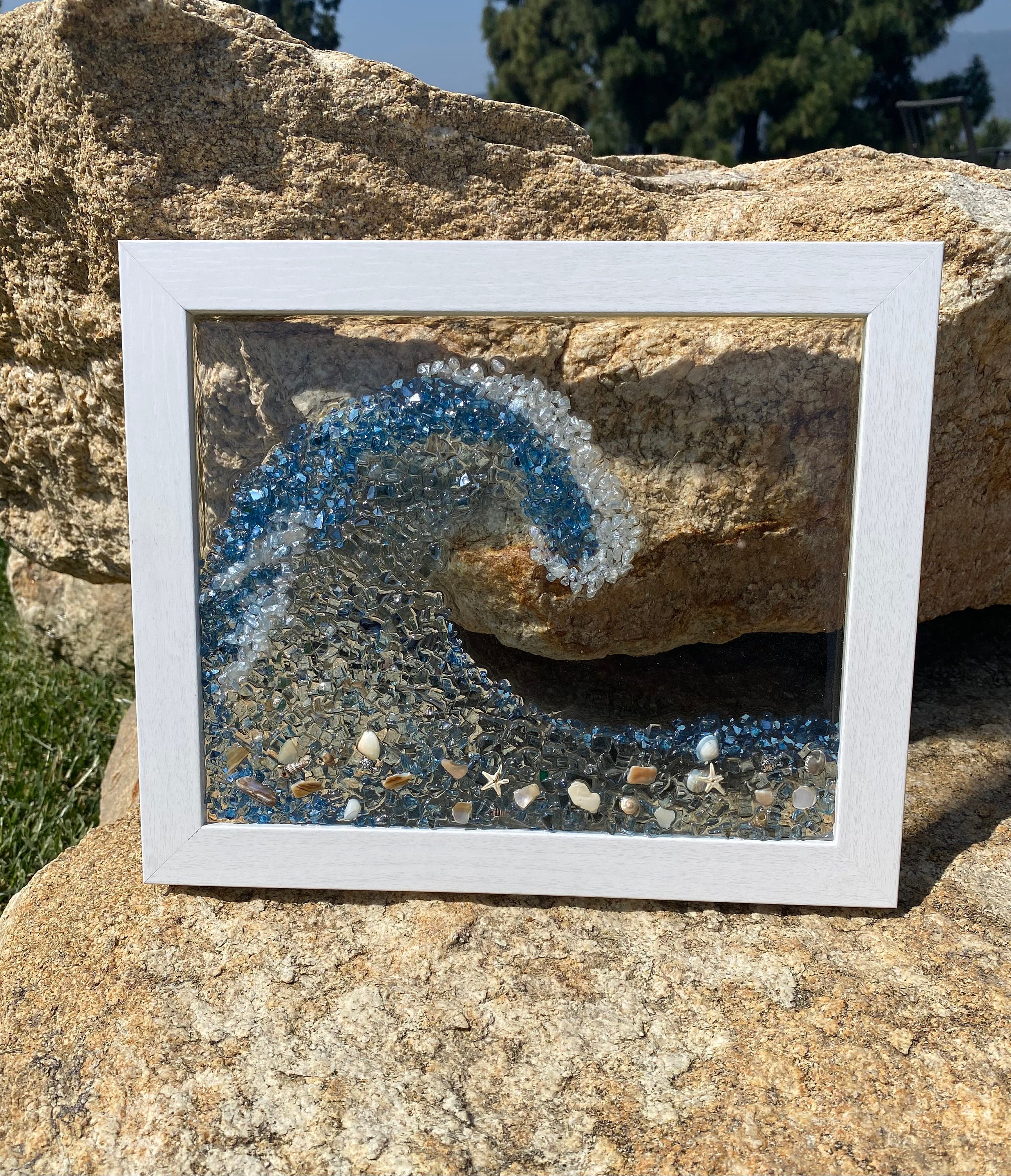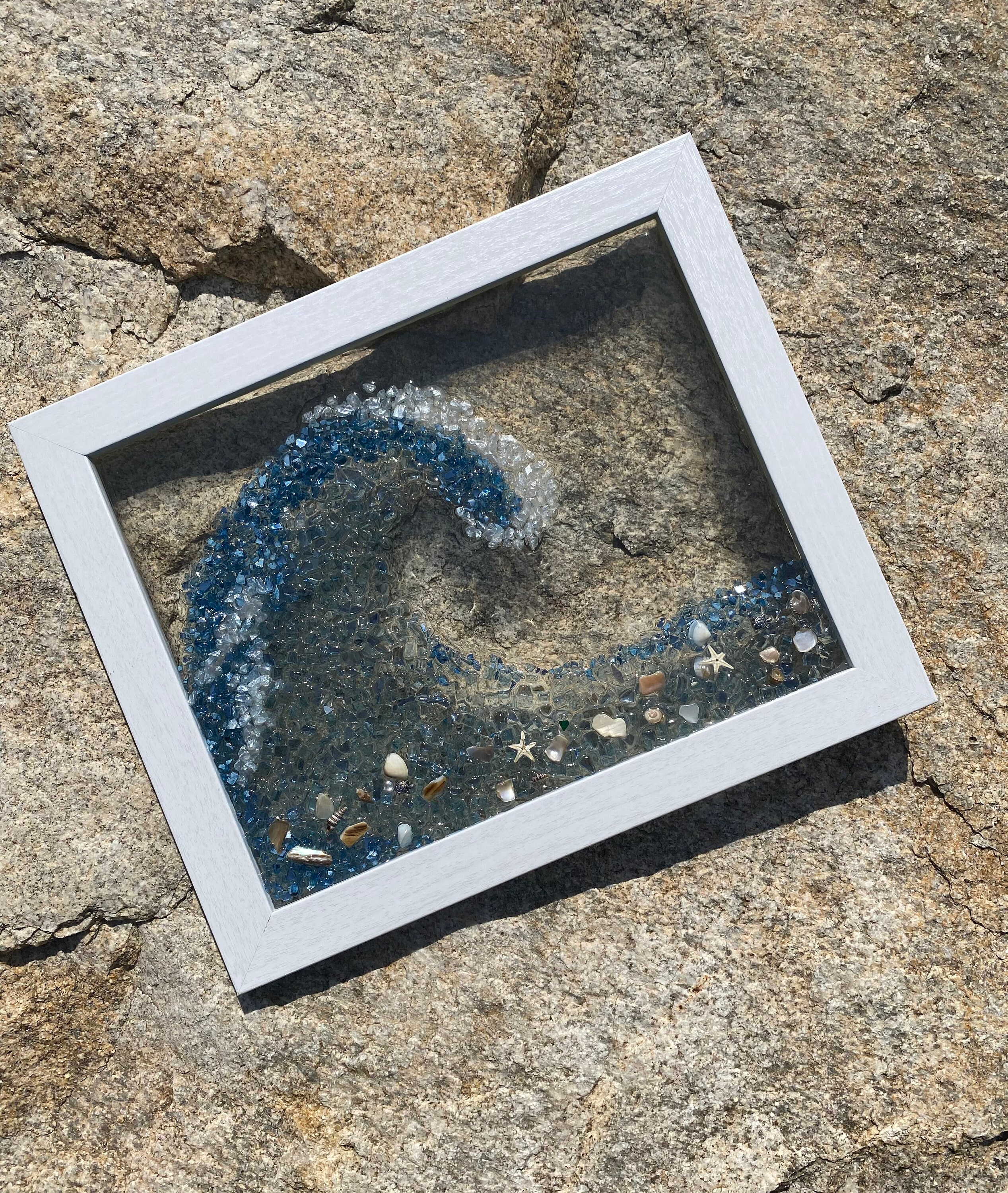 This gorgeous ocean wave resin art will make you feel like you are in the ocean and give you that sense of peace and tranquility. This piece has been designed into a wave shape using crushed glass and mirror pieces and decorated with shells of all kinds. This wave has colors of dark blue, light blue, white, and touches of silver throughout.