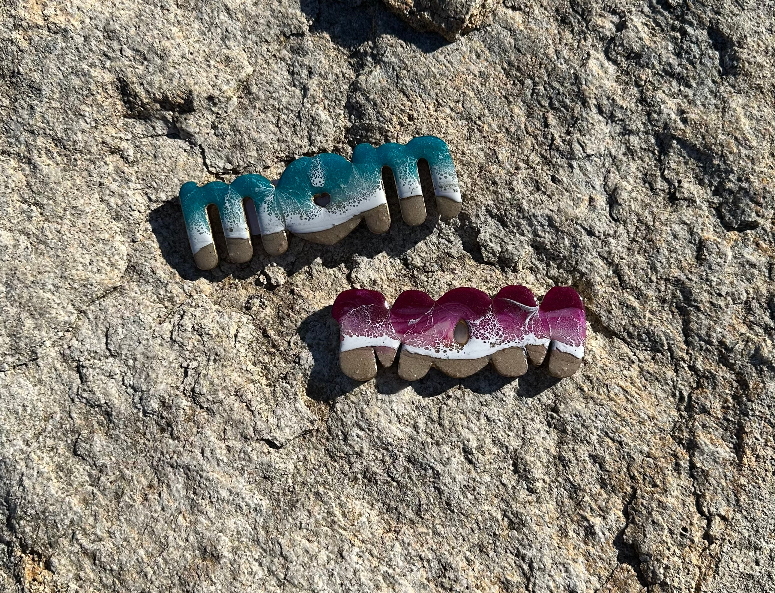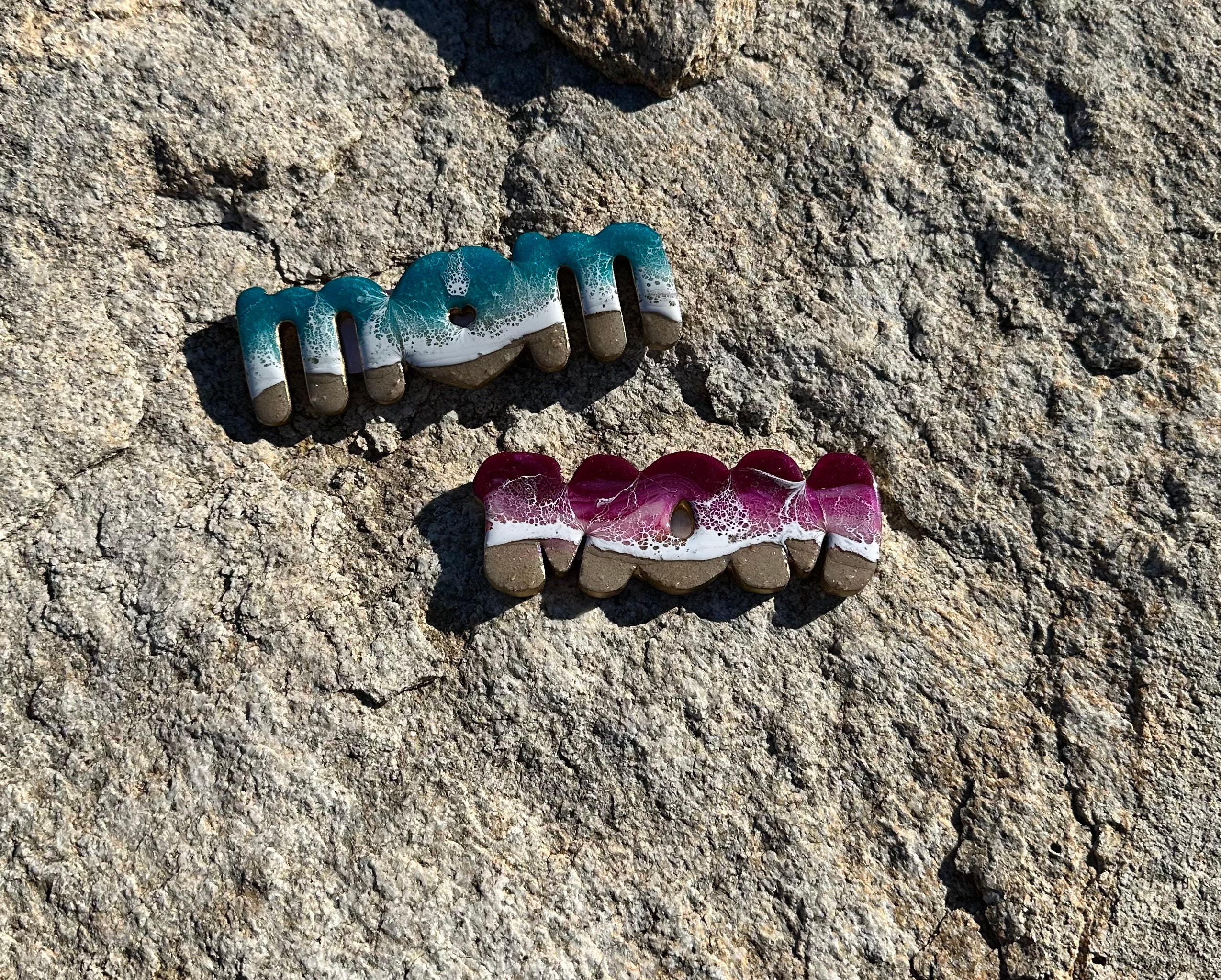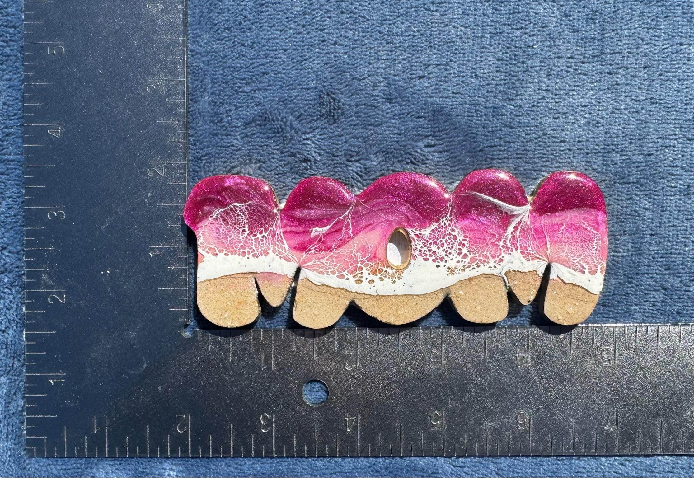 1) Maroon Mom- The water consists of various shades deep dark maroon, violet, and pink with crisp white waves crashing on the sandy beach area. The beach area is made from real tan sand mixed with a little glitter to add that sparkle and shine from the sand. Size is 4.75 by 1.75 inches