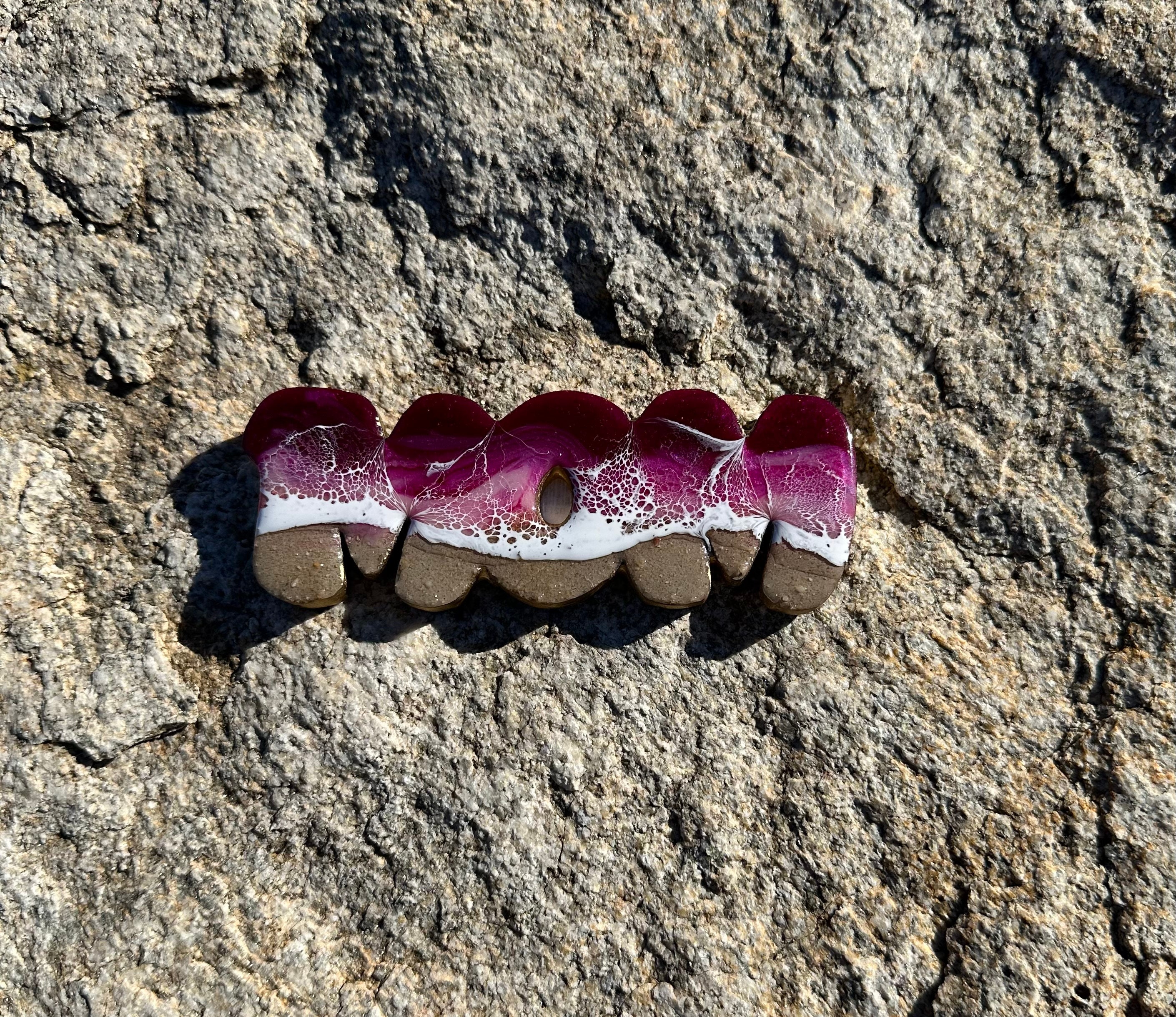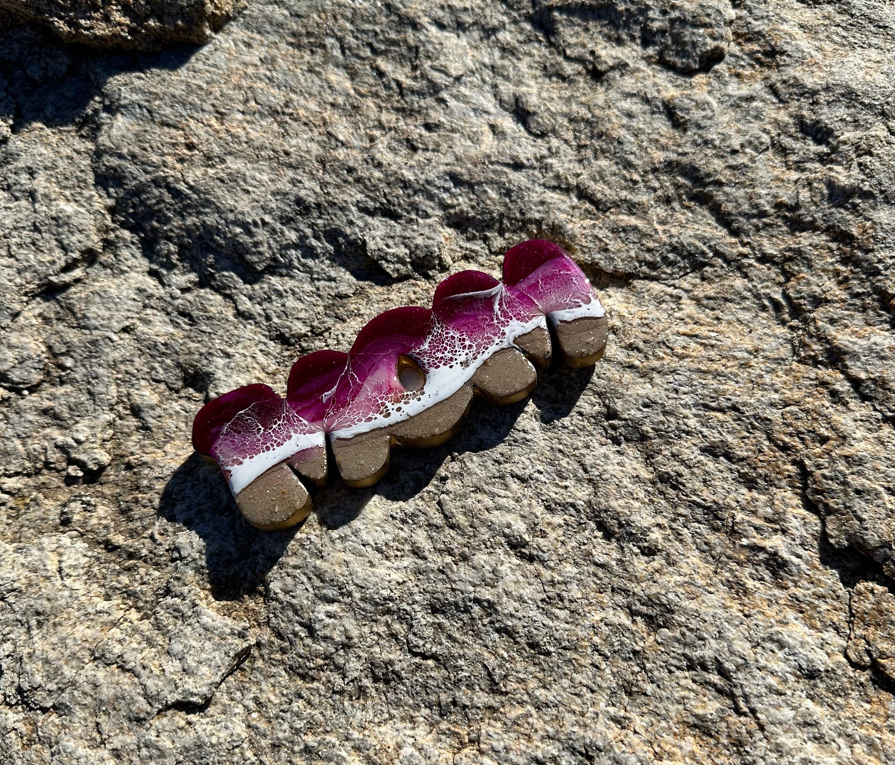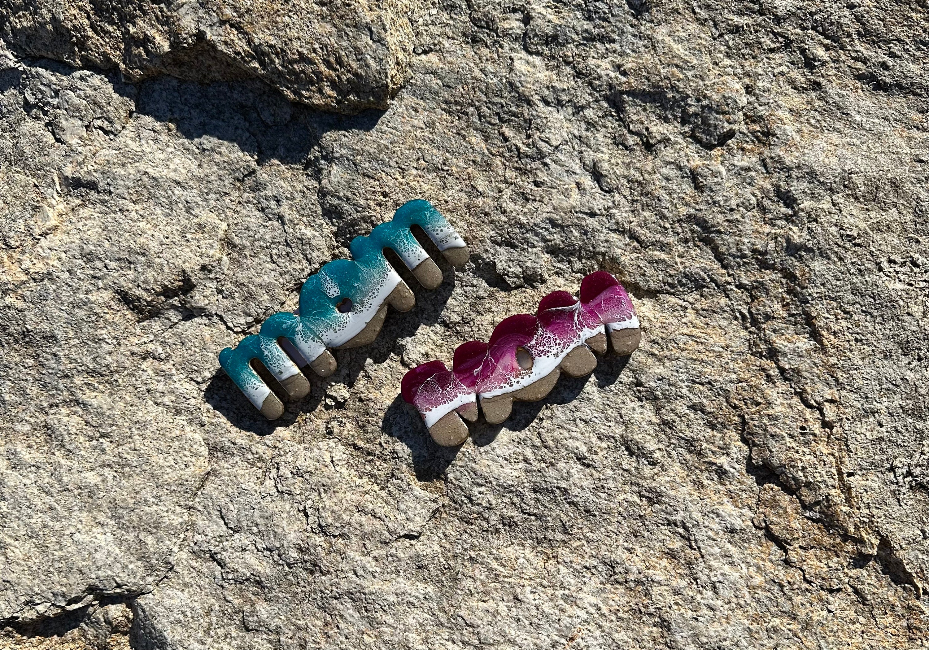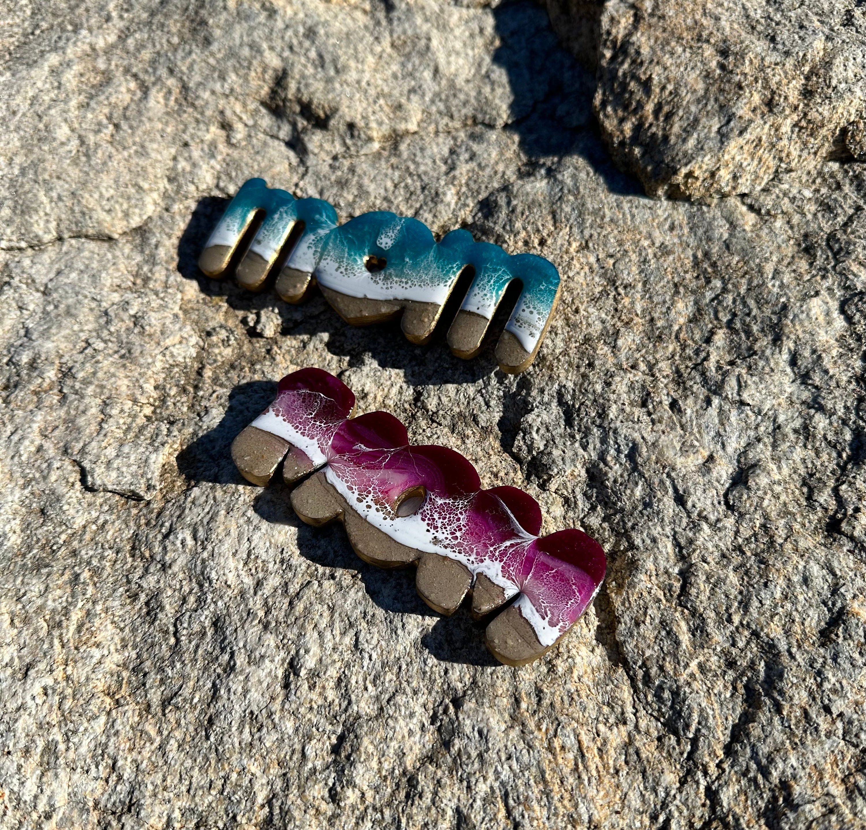 1) Maroon Mom- The water consists of various shades deep dark maroon, violet, and pink with crisp white waves crashing on the sandy beach area. The beach area is made from real tan sand mixed with a little glitter to add that sparkle and shine from the sand. Size is 4.75 by 1.75 inches
