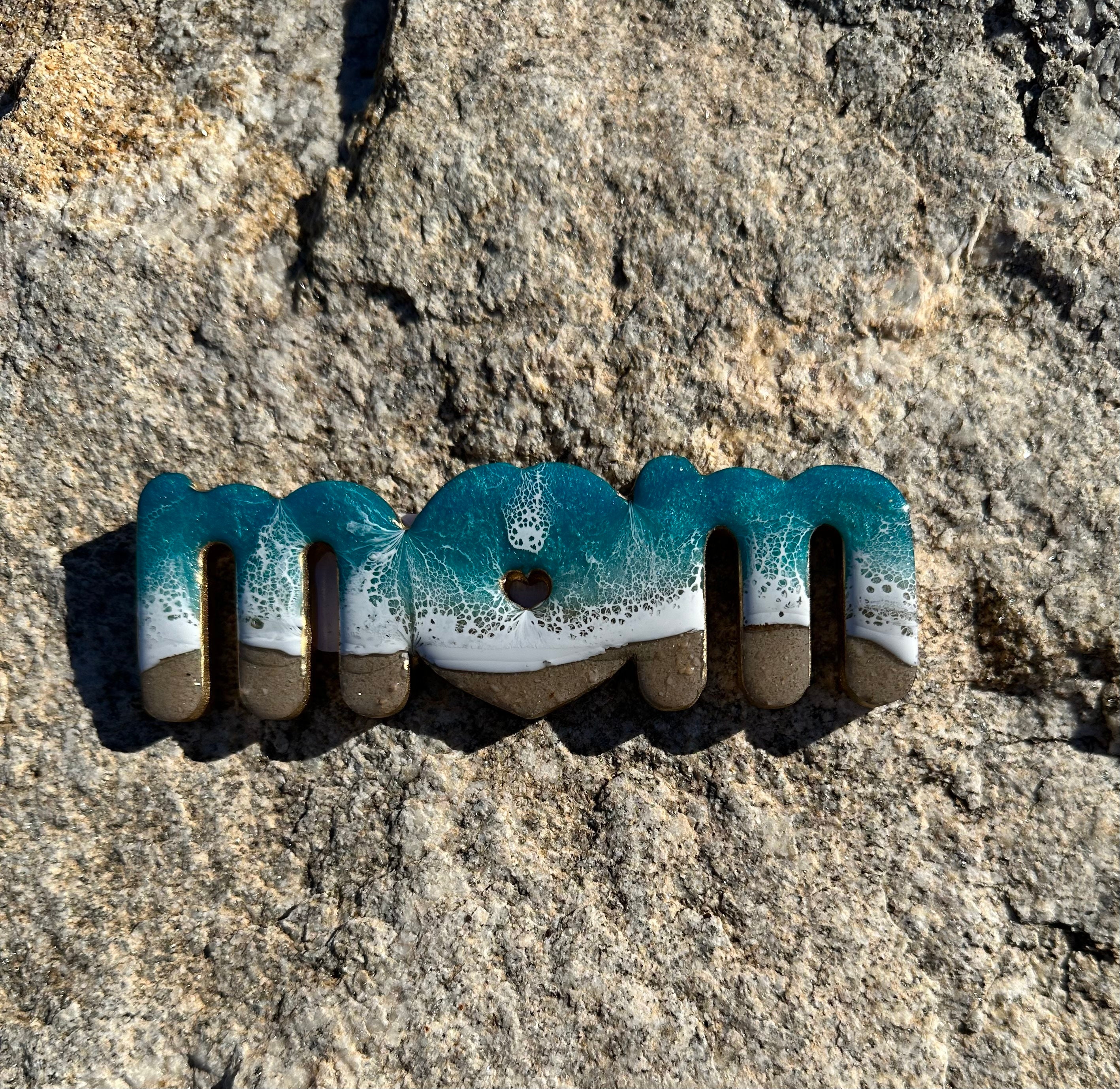 This is a wood cut out with the word mom on it with a resin ocean scene on top. The waves have multiple layers of waves hitting the shore. The layers of waves help to create the dimension of real water.