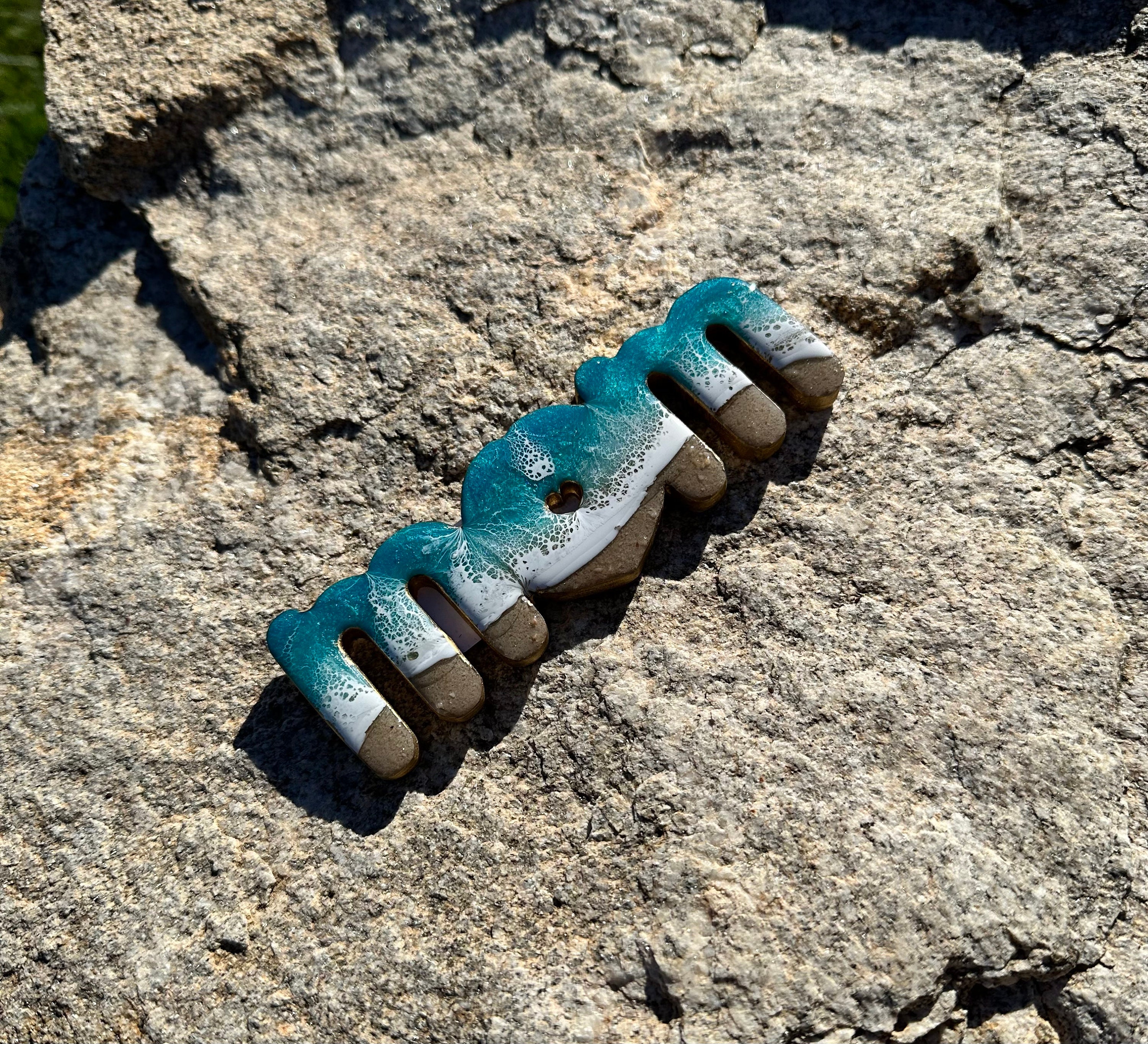 2) Teal Mom- The water consists of various shades teal blues and teal greens with crisp white waves crashing on the sandy beach area. The beach area is made from real tan sand mixed with a little glitter to add that sparkle and shine from the sand. 5.5 by 1.75 inches