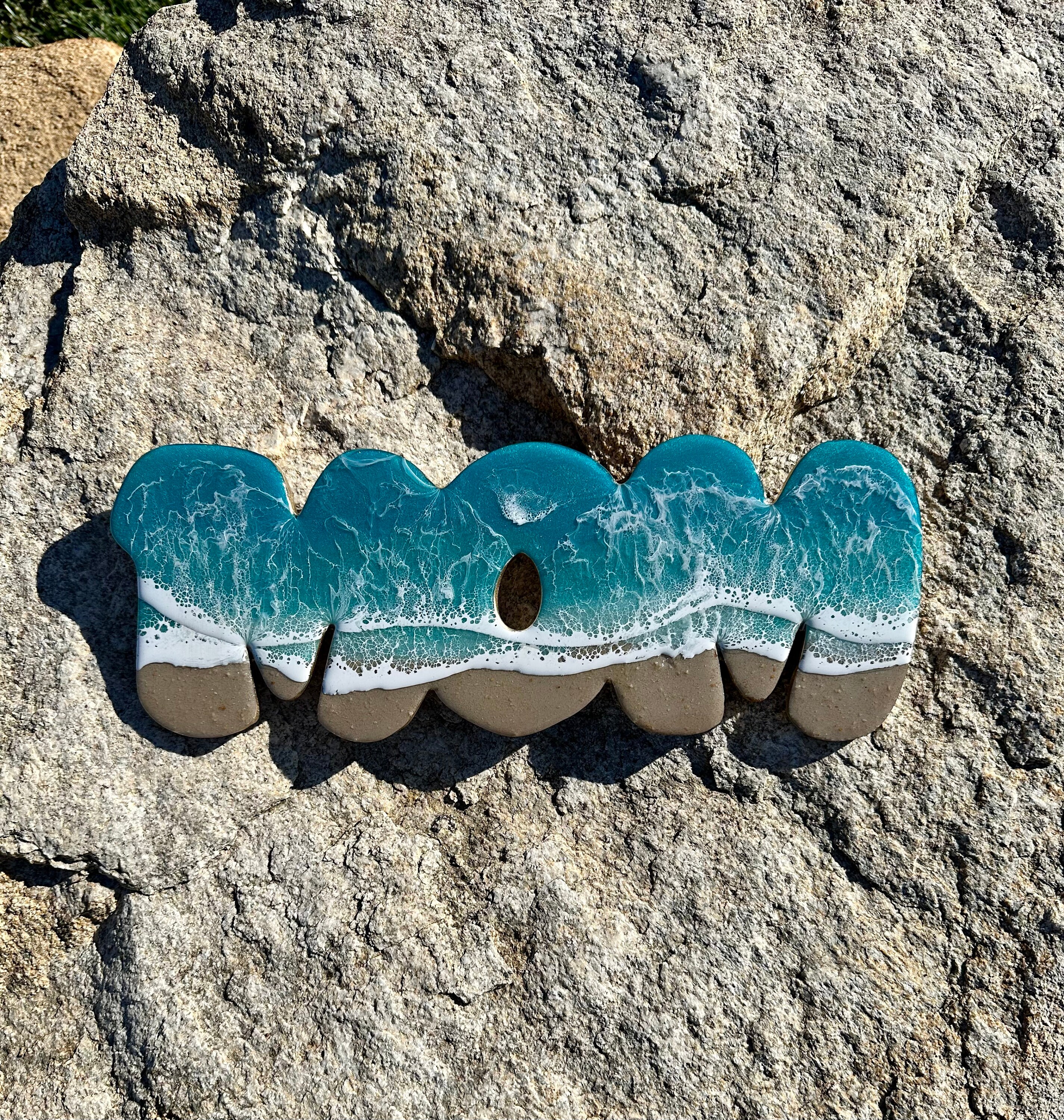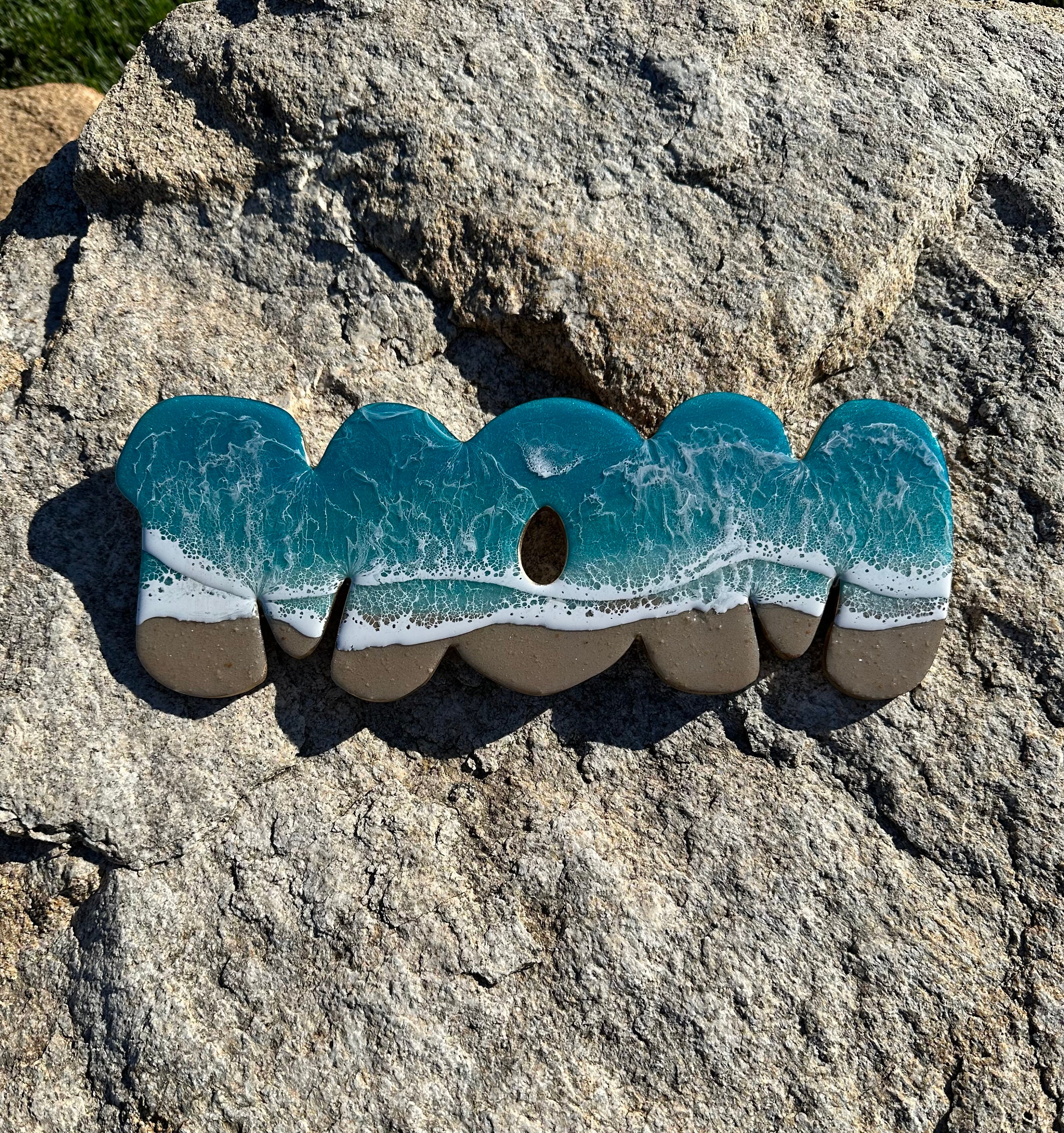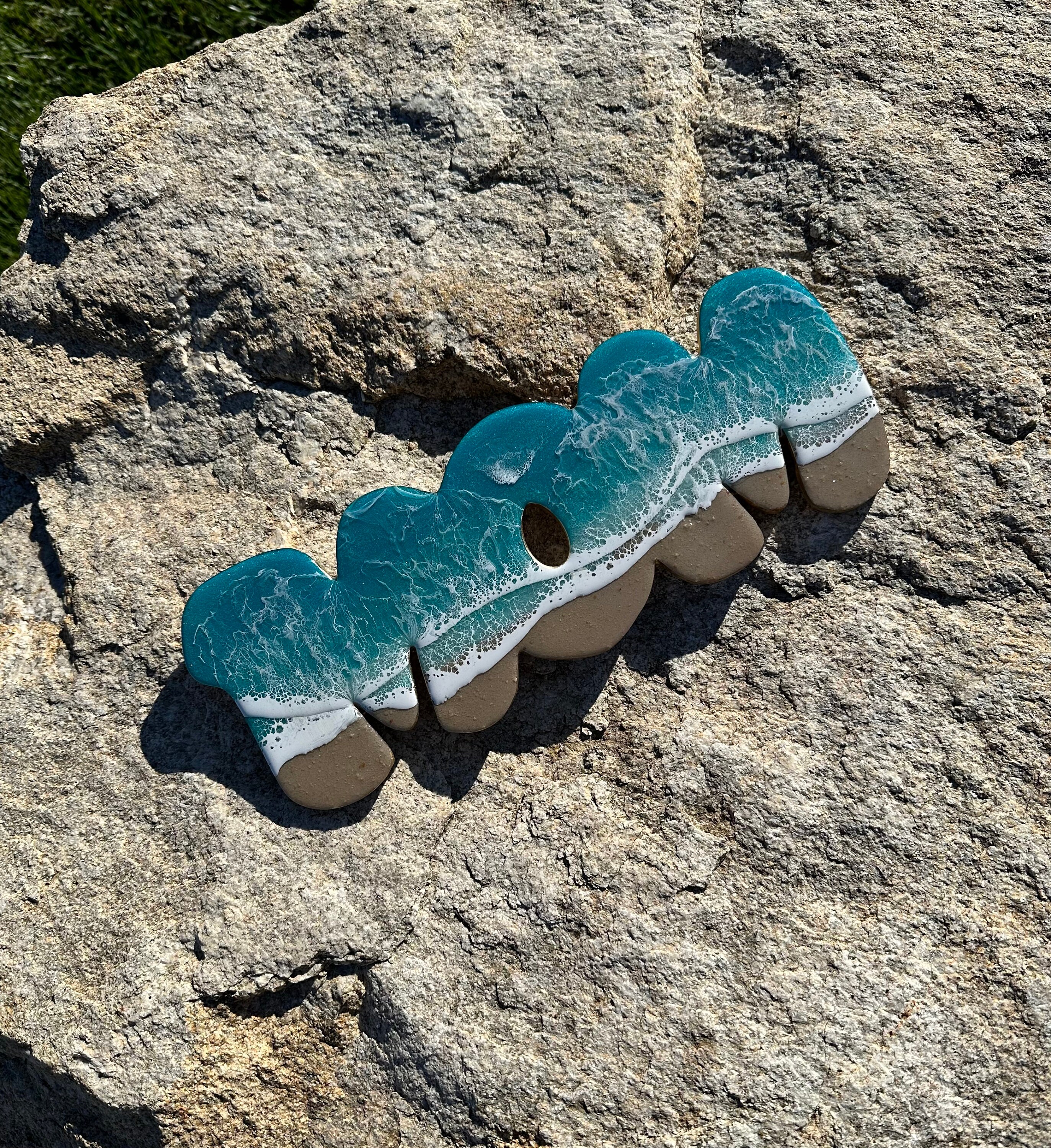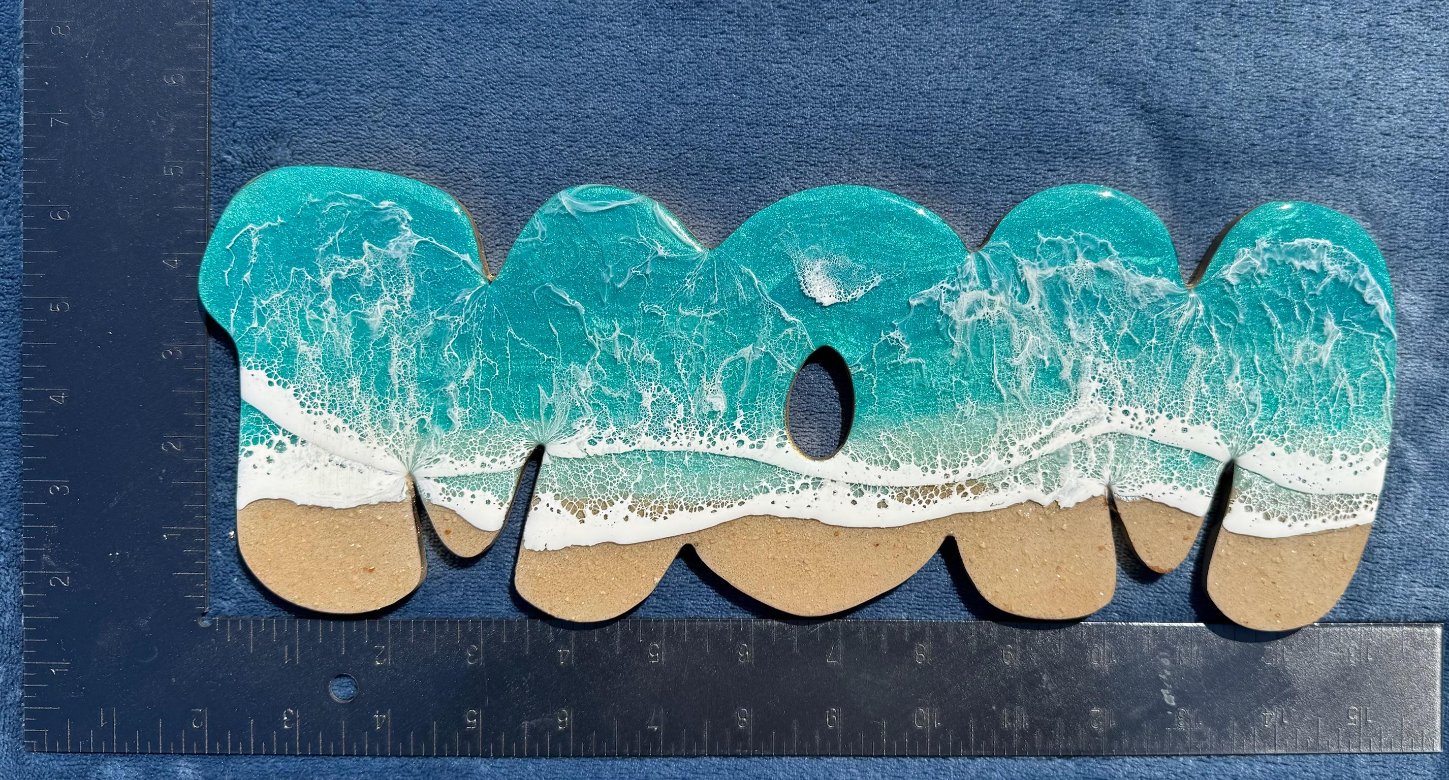 This is a wood cut out with the word mom on it with a resin ocean scene on top. The waves have multiple layers of waves hitting the shore. The layers of waves help to create the dimension of real water. The water consists of various shades Teal blue and teal green with crisp white waves crashing on the sandy beach area. The beach area is made from real tan sand mixed with a little glitter to add that sparkle and shine from the sand.