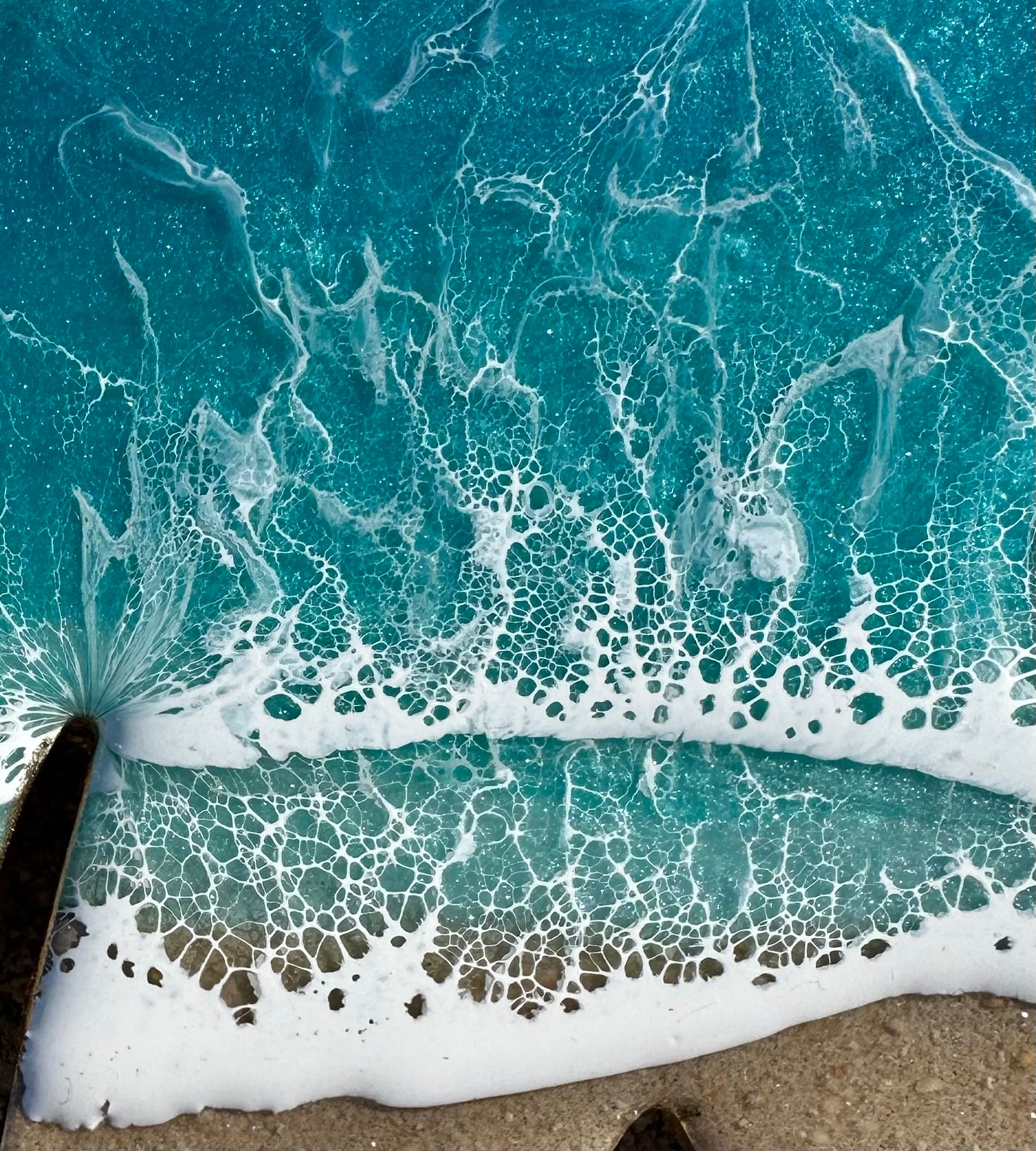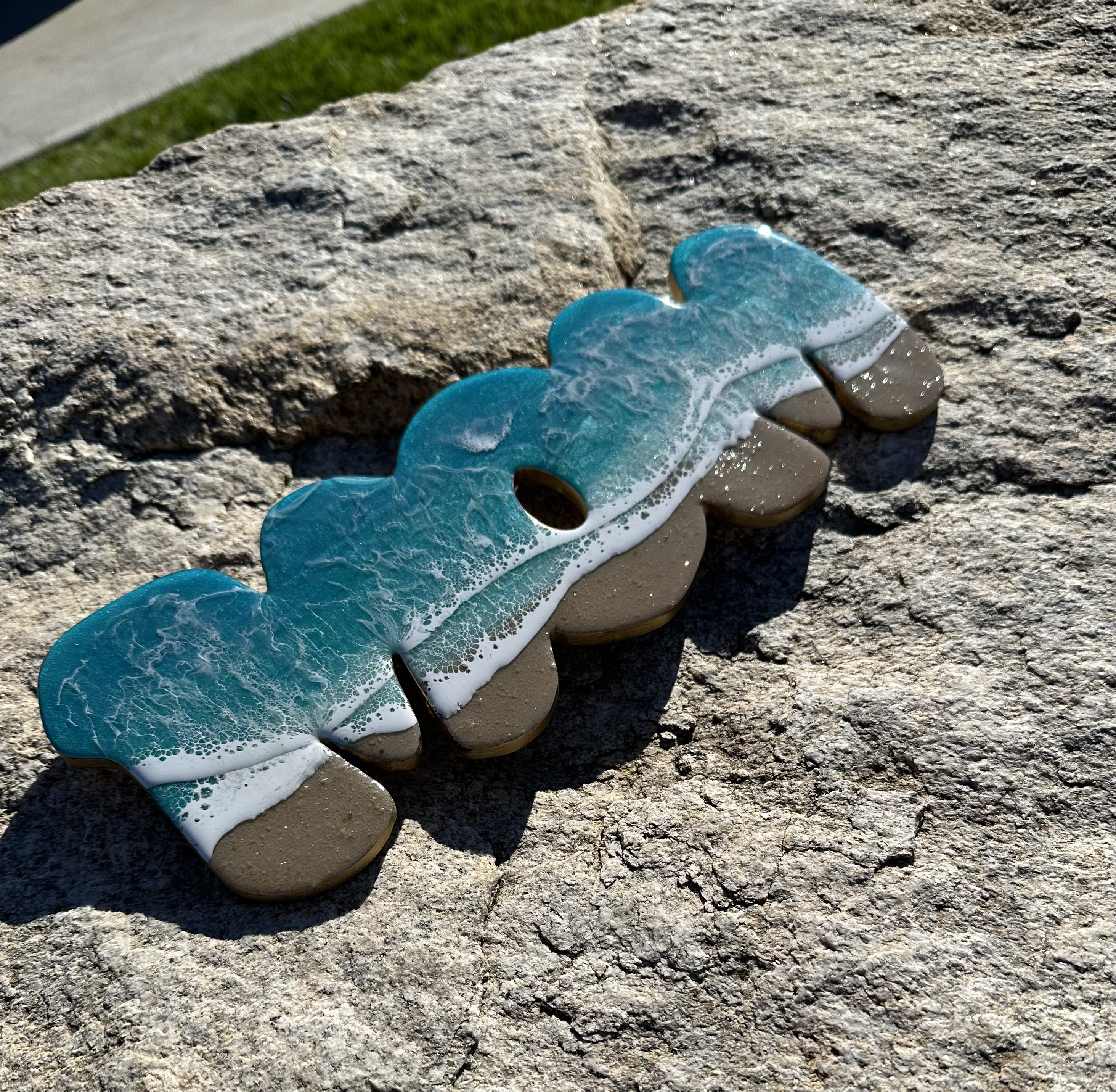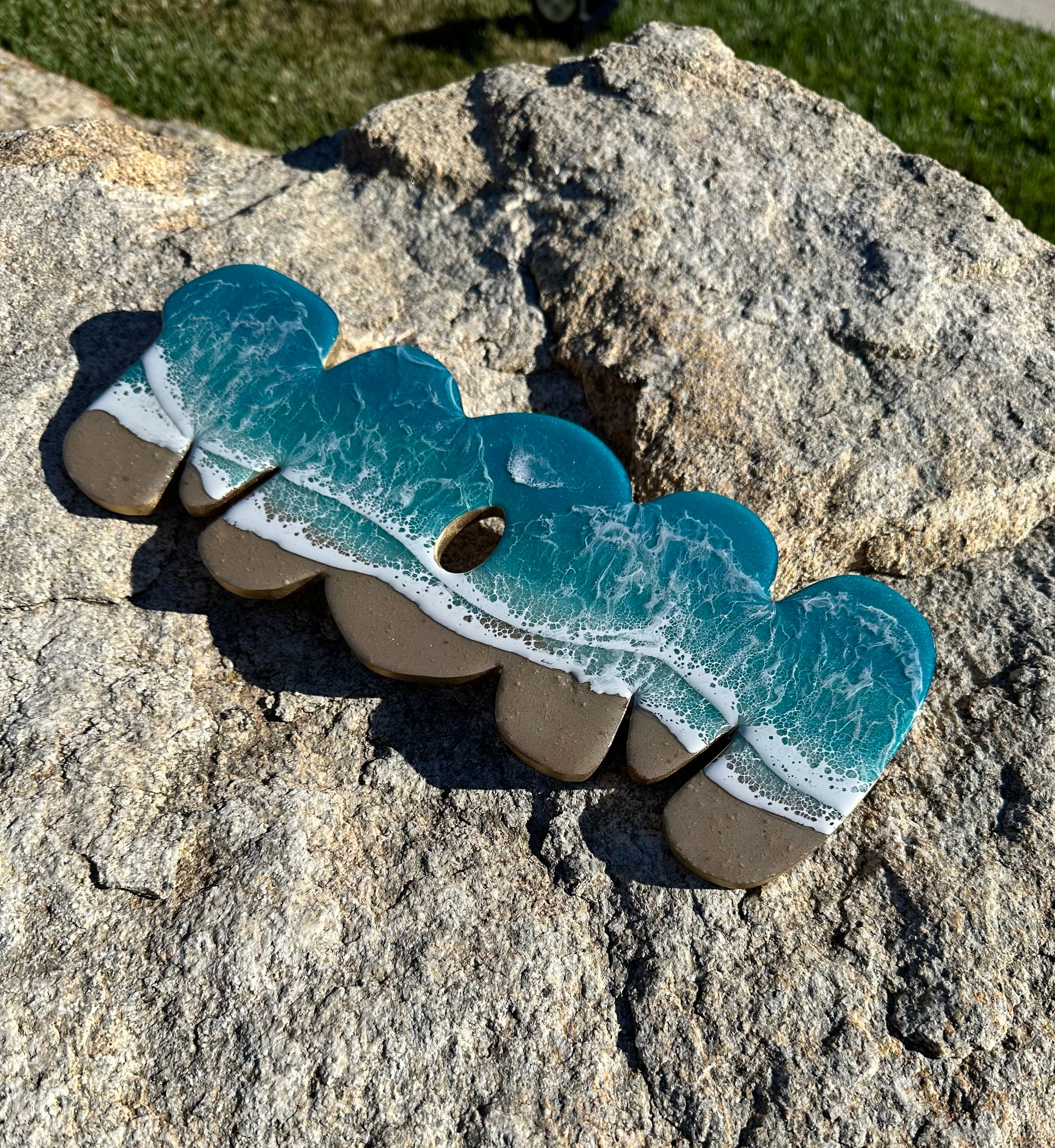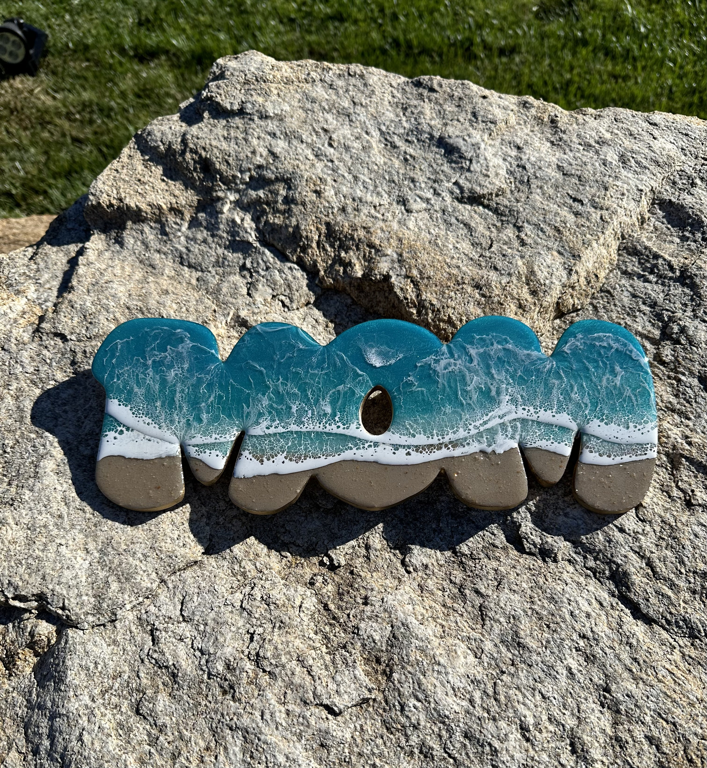 This is a wood cut out with the word mom on it with a resin ocean scene on top. The waves have multiple layers of waves hitting the shore. The layers of waves help to create the dimension of real water. The water consists of various shades Teal blue and teal green with crisp white waves crashing on the sandy beach area. The beach area is made from real tan sand mixed with a little glitter to add that sparkle and shine from the sand.