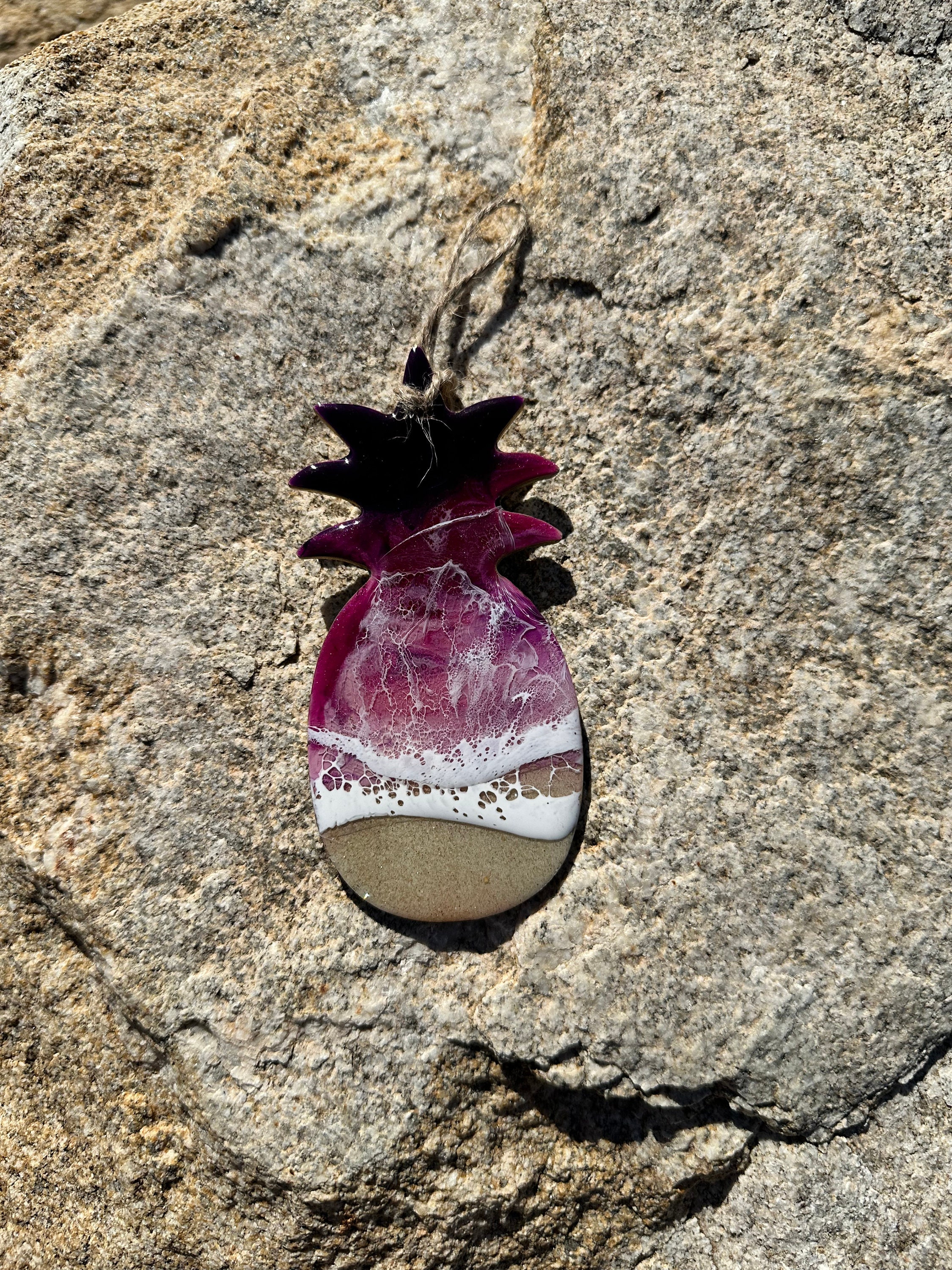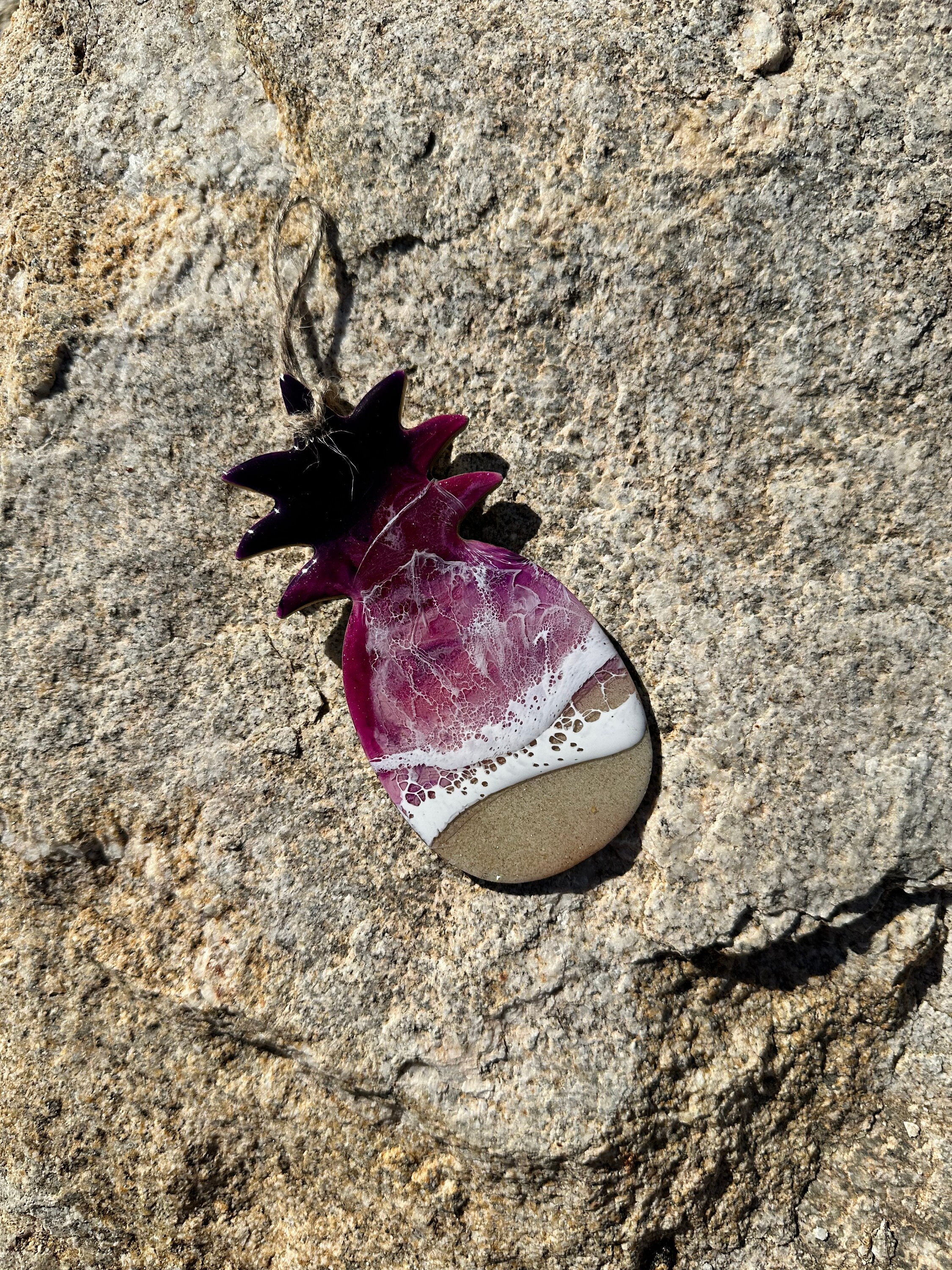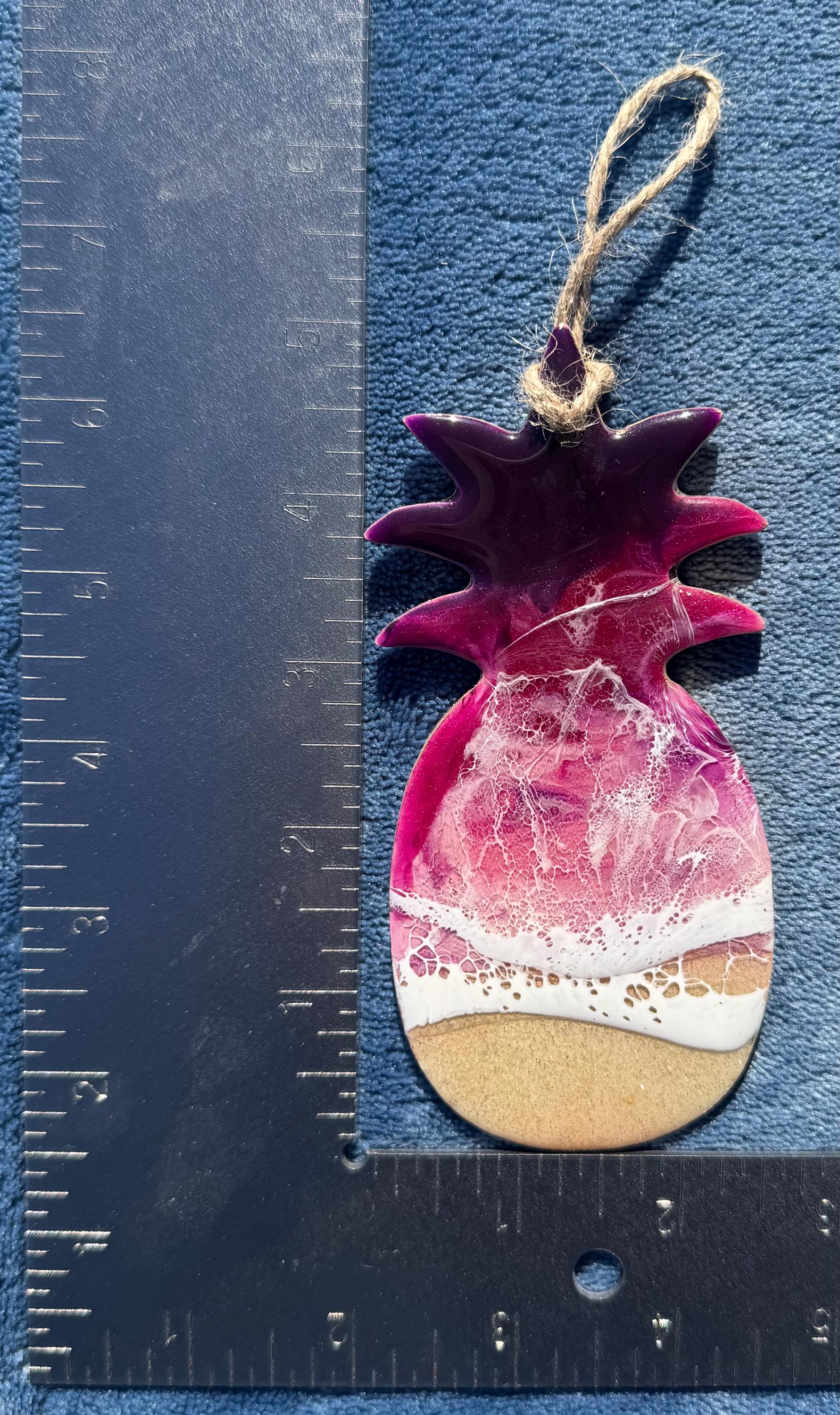 This is a wood cut out pineapple with layers of resin poured to create an ocean scene. This cut out is 5 by 2.5 in the shape of a pineapple. For the sand portion it is real sand. For the water it is different shades of purples, and pinks with white waves crashing on the sand.