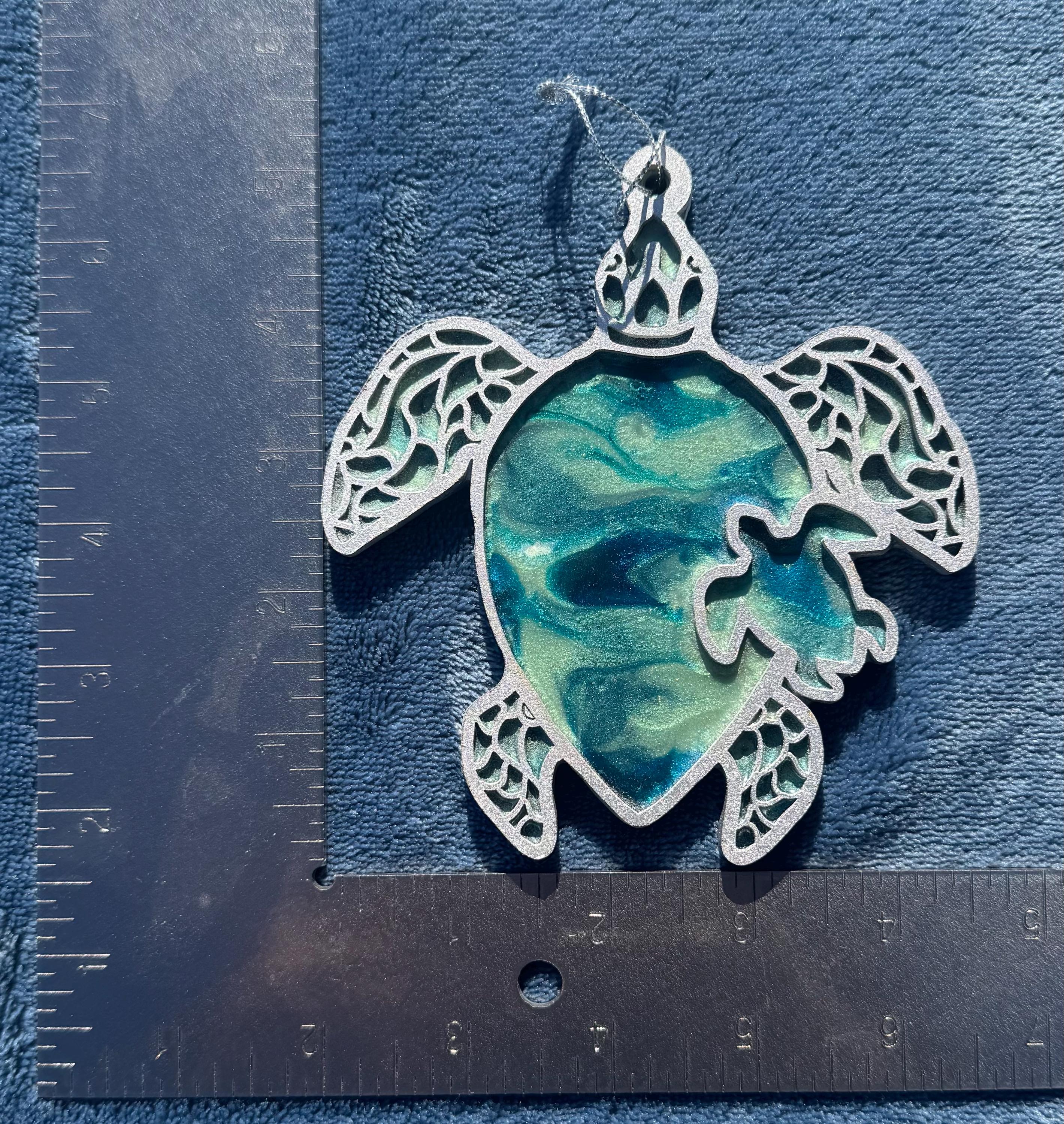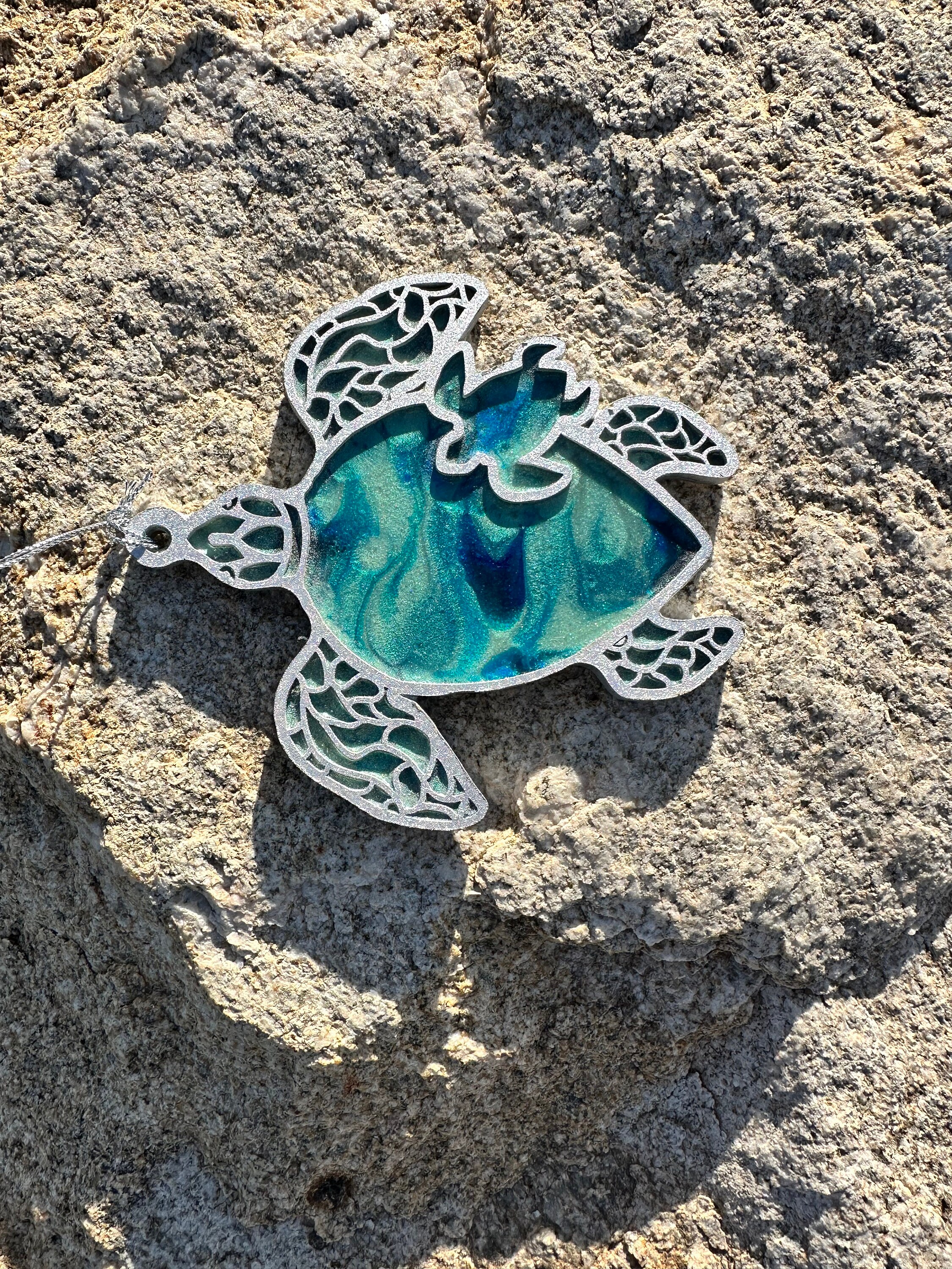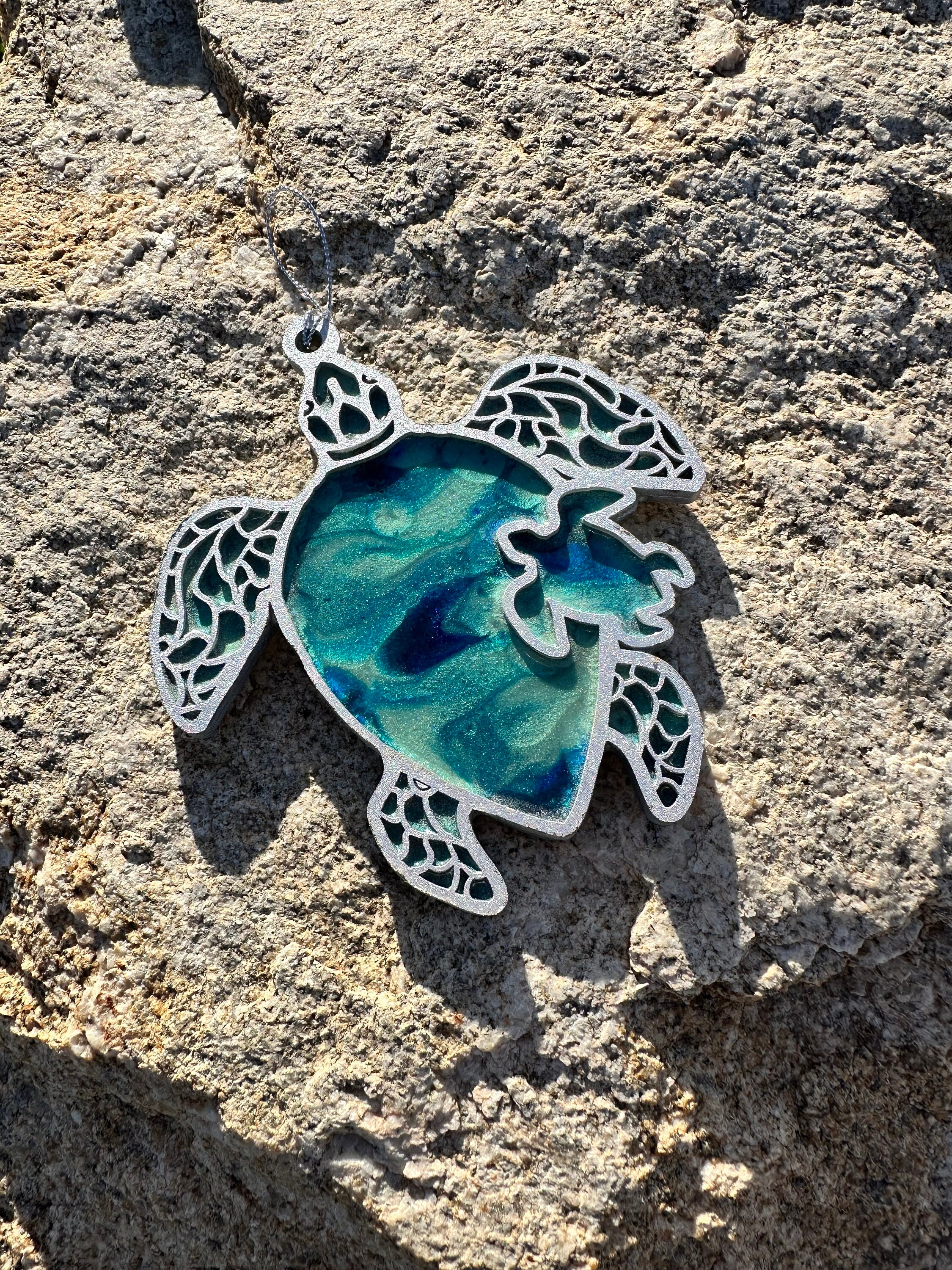The ornament is created by pouring resin in an abstract style on wood. The second layer is added which is a detailed cutout of wood adding so much dimension and beauty to this piece. Colors of the body are ocean colors of turquoise and teals with a silver-colored shell.