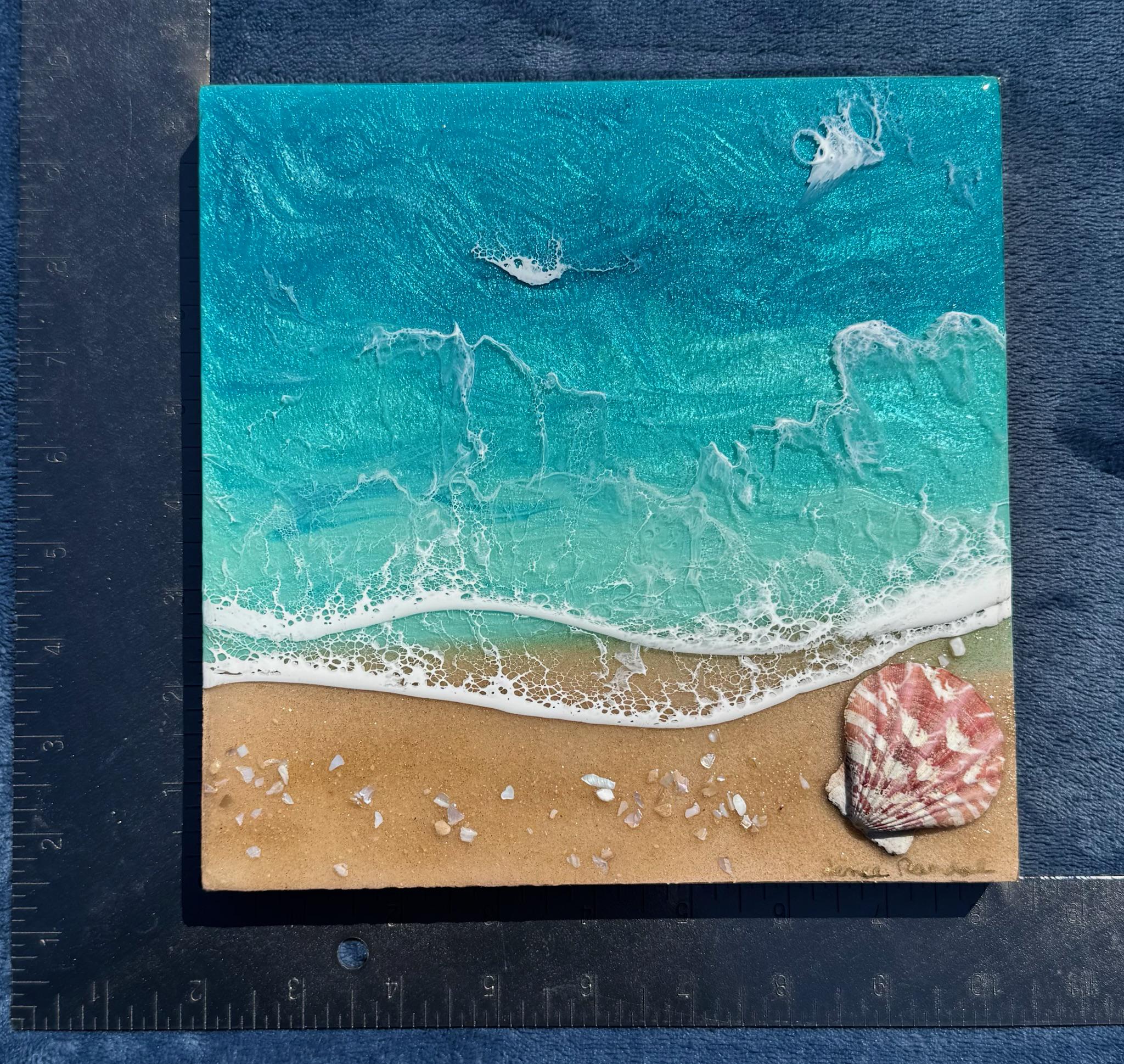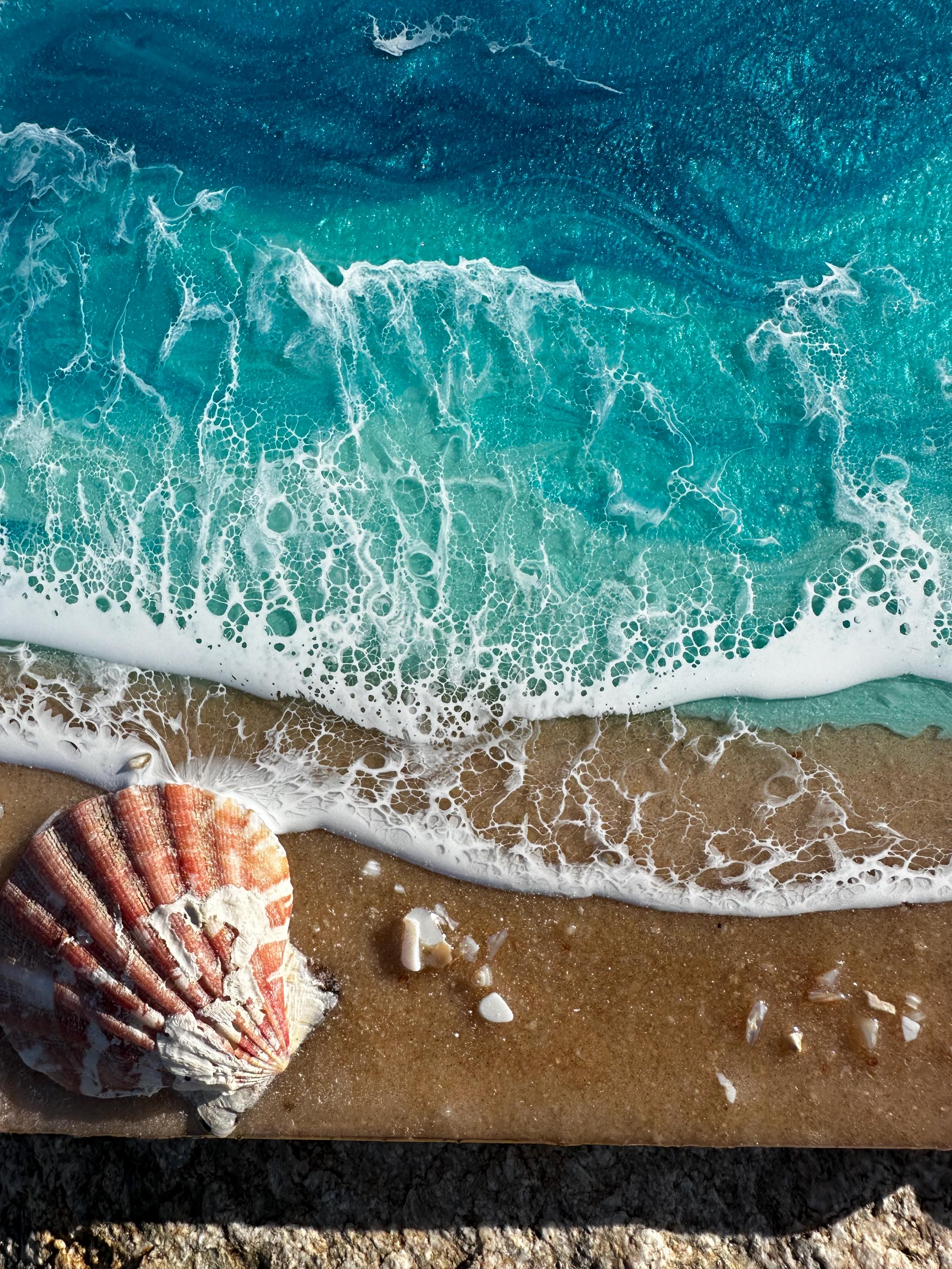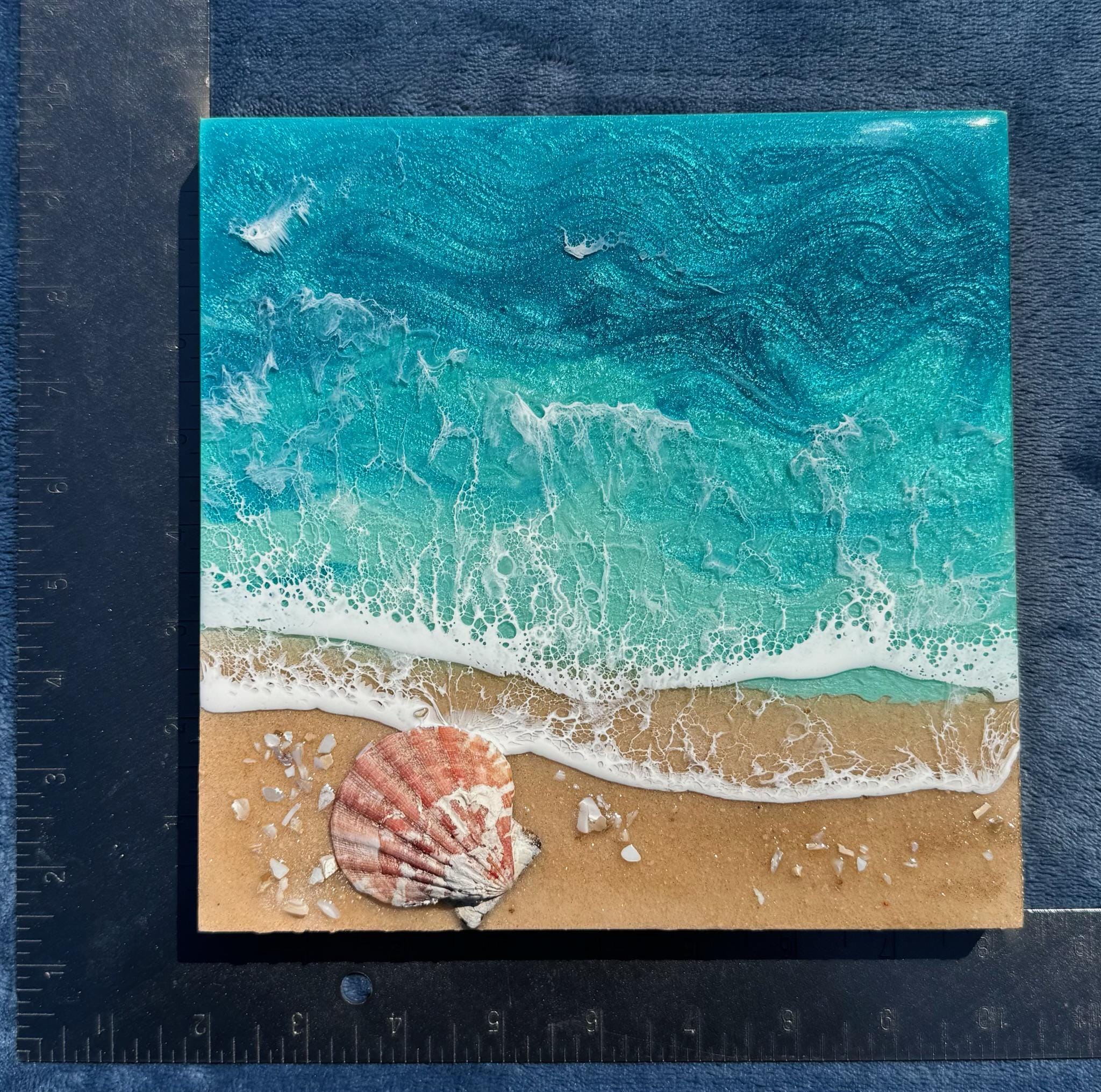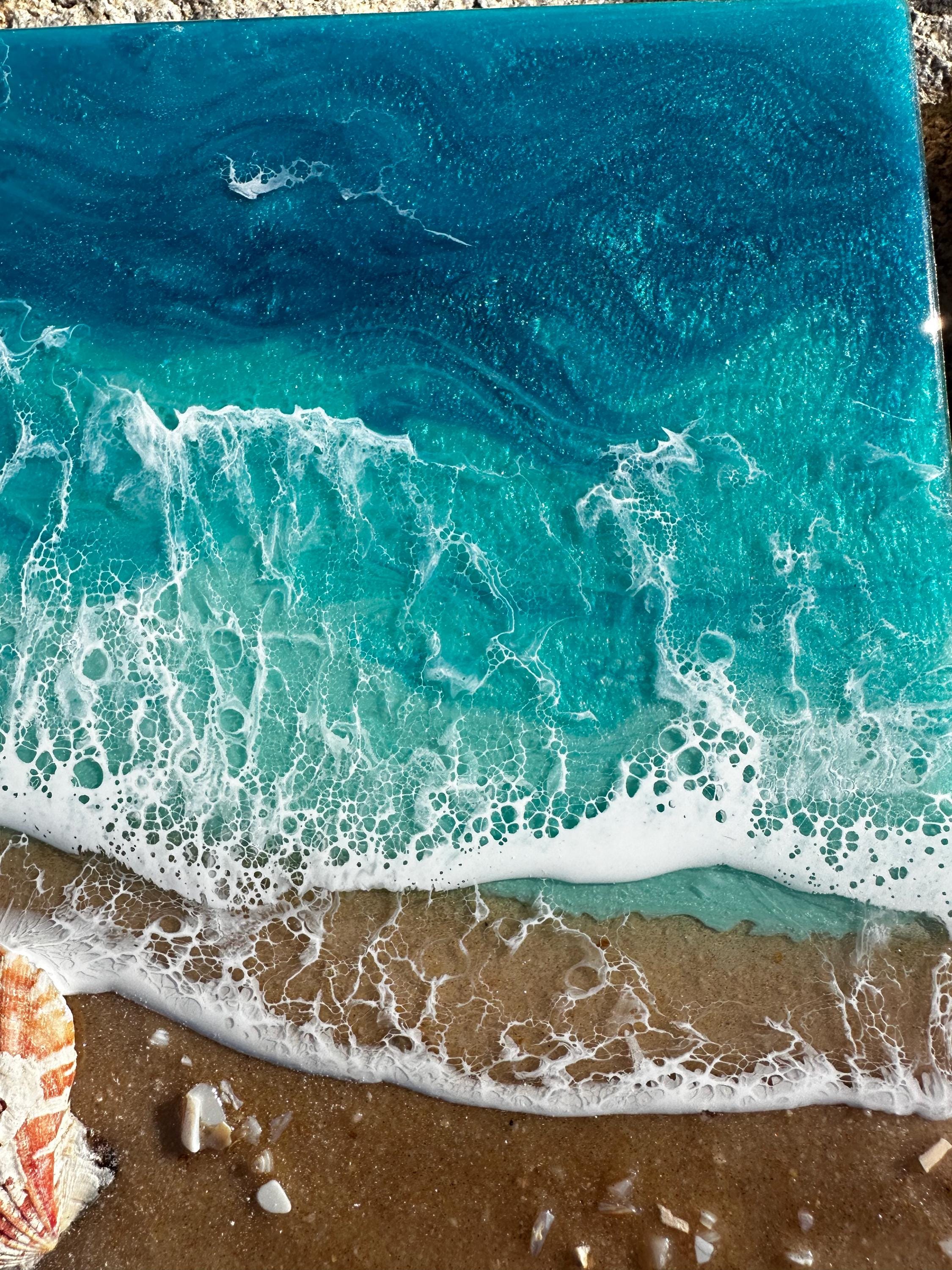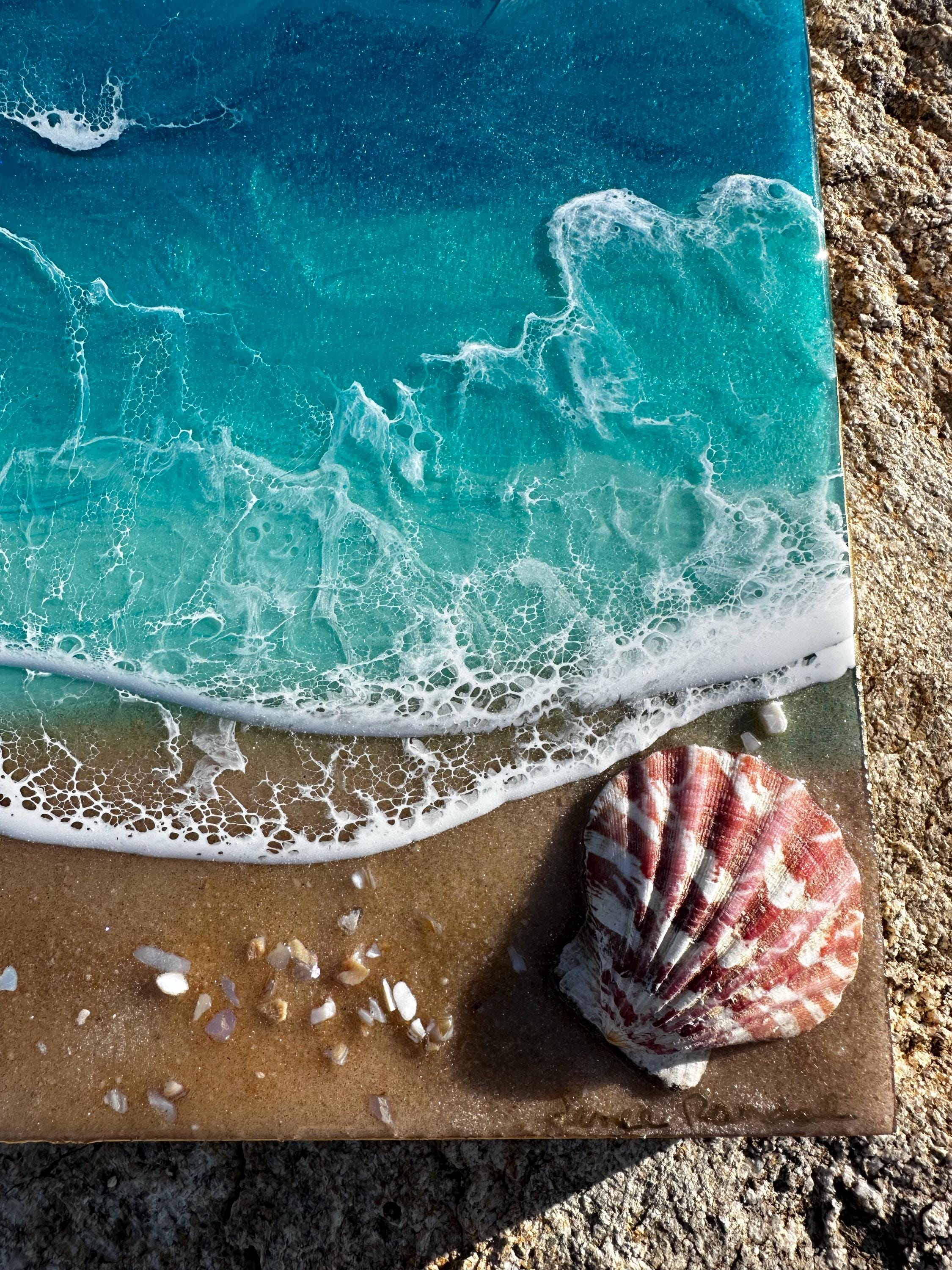 Resin art is a high gloss finished piece of art that looks almost like glass. The ocean consists of multiple layers of resin in different shades of teals. Each piece is created by hand and is completely unique and original. For this design, the ocean waves were created using a combination of pigments and Resin. The waves are rolling up on a real sand beach with shells throughout. It is the cutest piece with lots of realistic waves and celling.