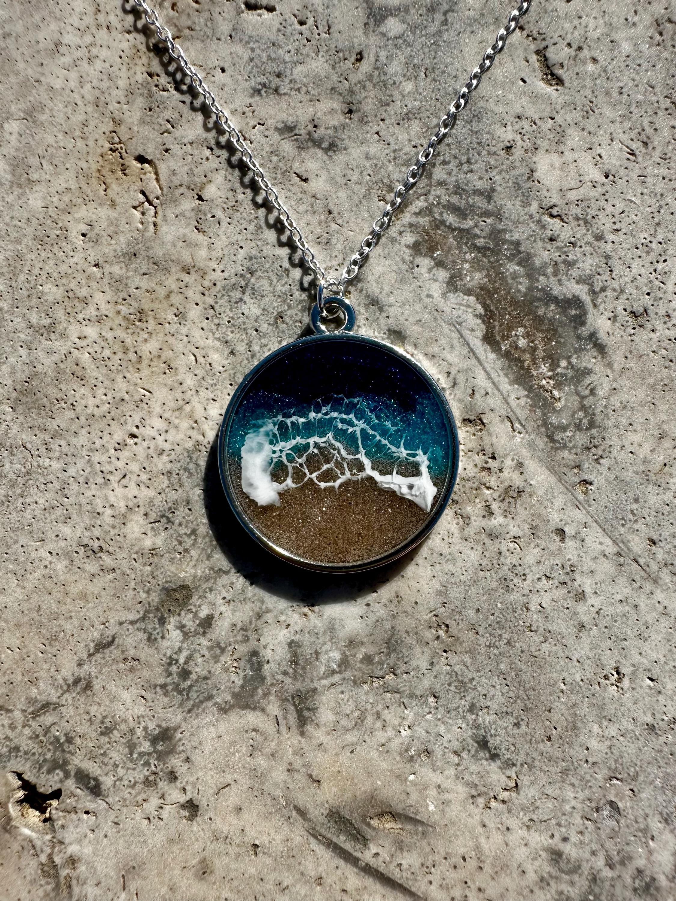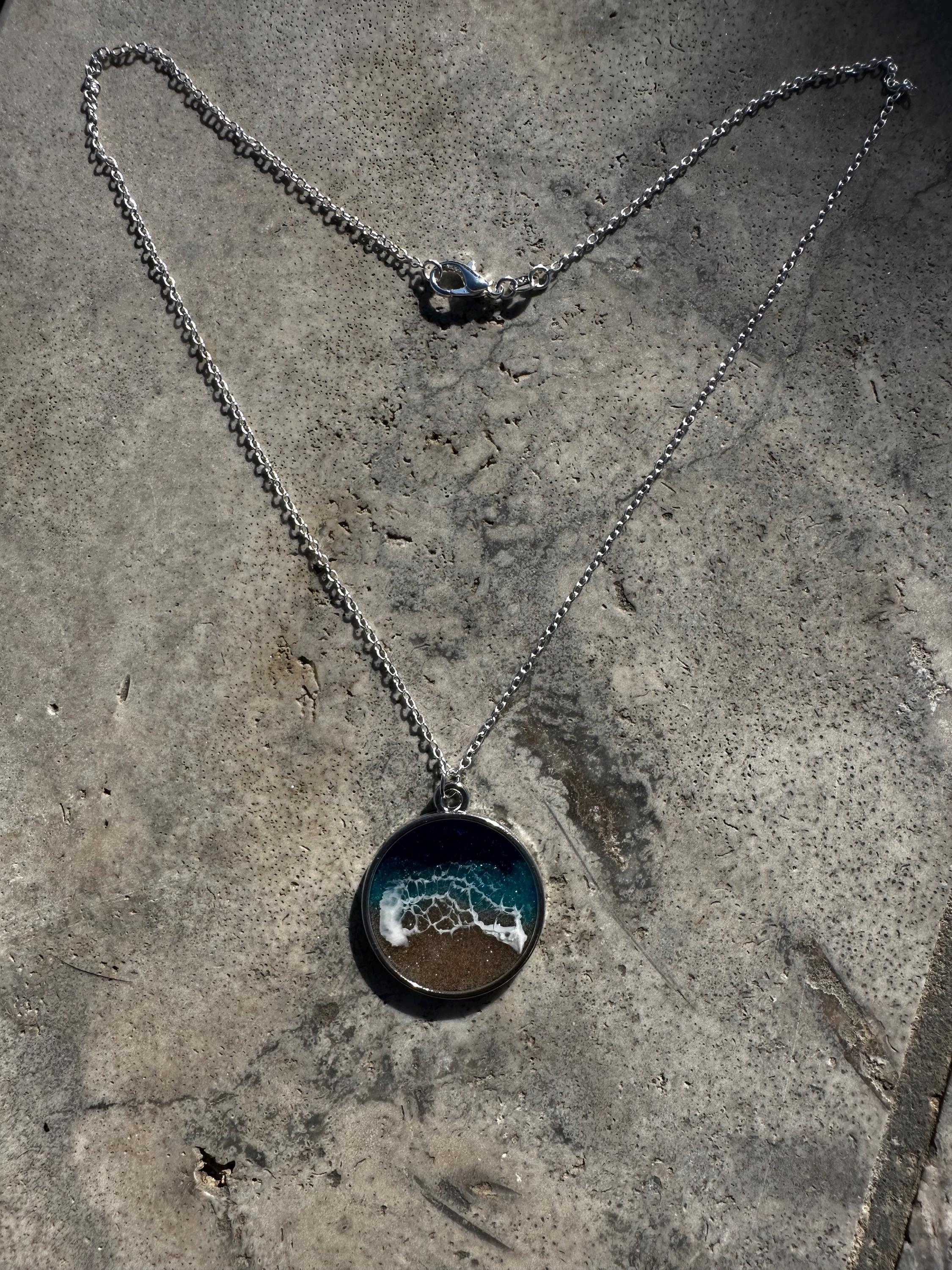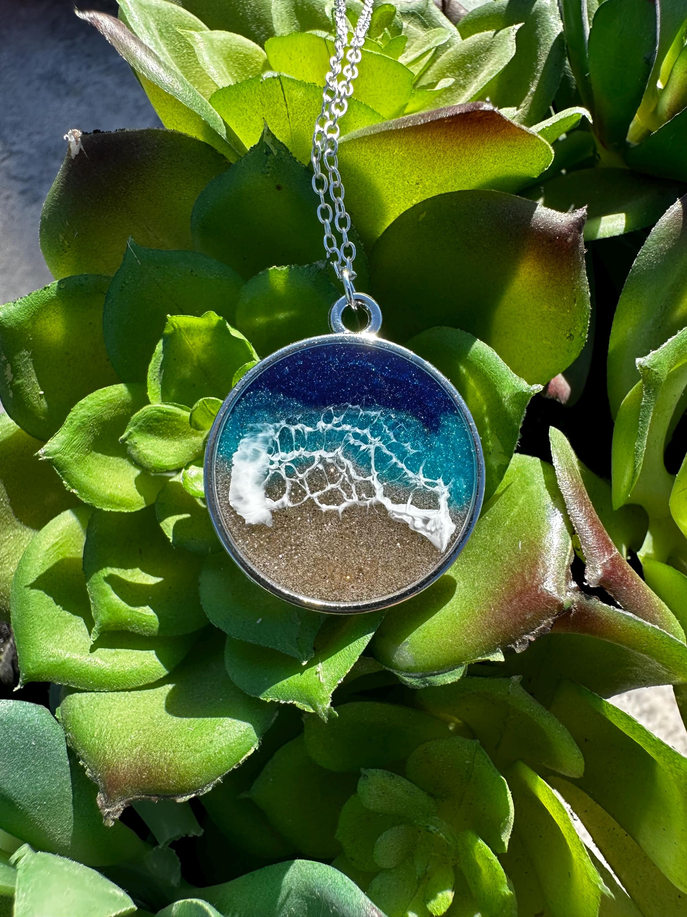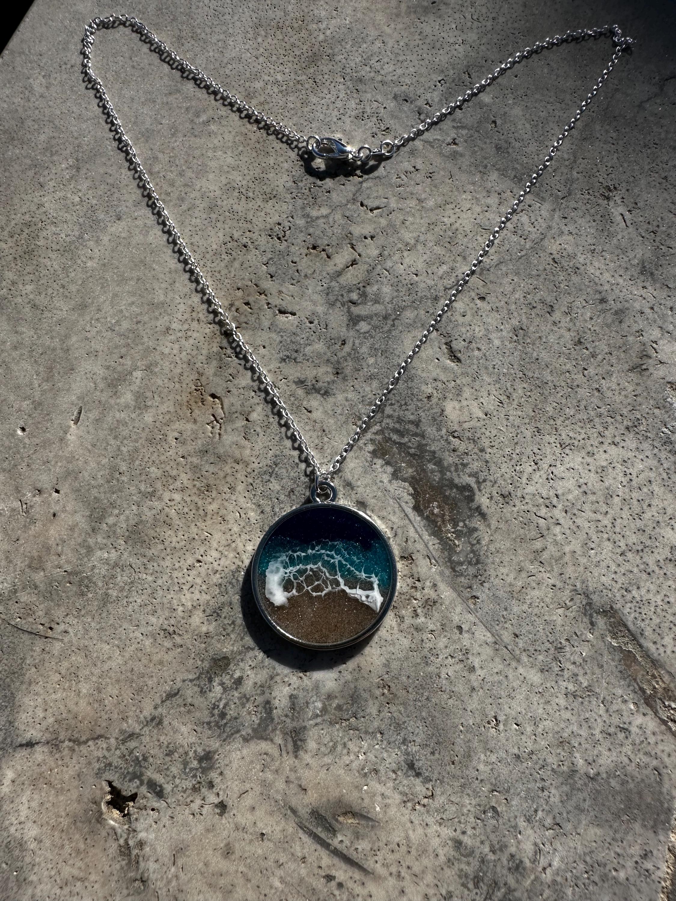 This is a little ocean scene with real sand and shells with dark blue and teal waters with an ocean wave crashing on the shore. This stunning piece is made from resin on a silver bezel. The chain length is 18 inches.