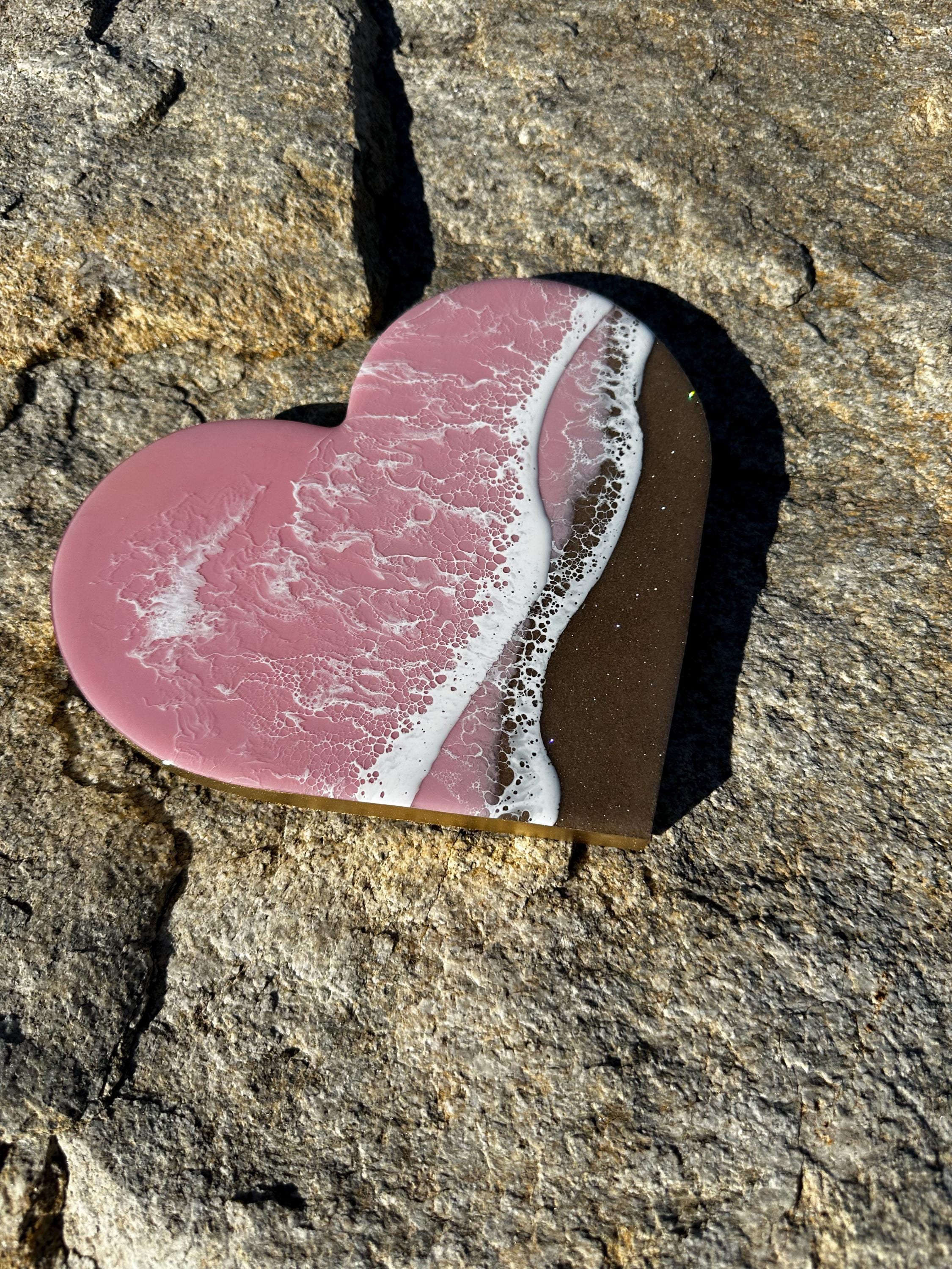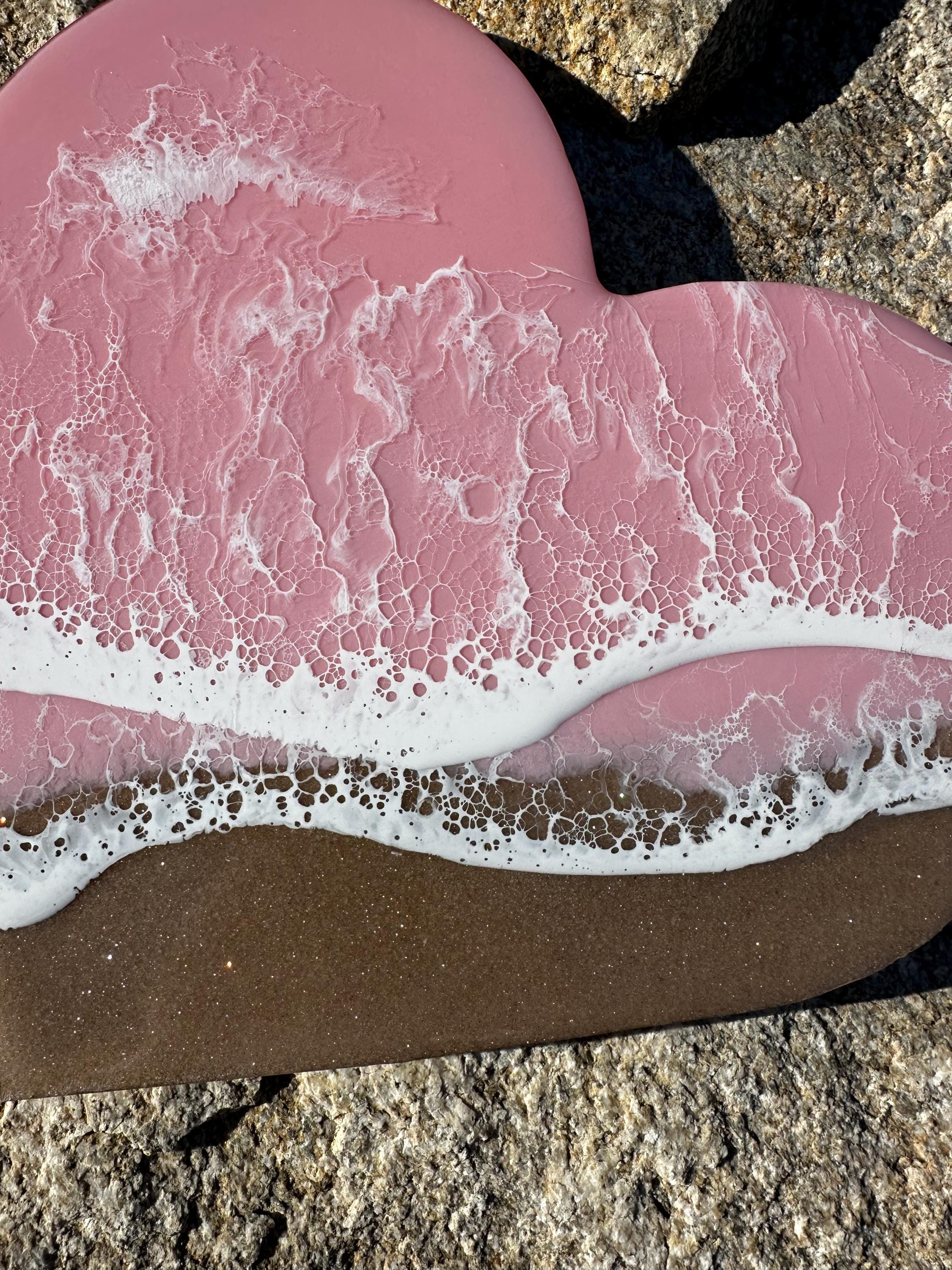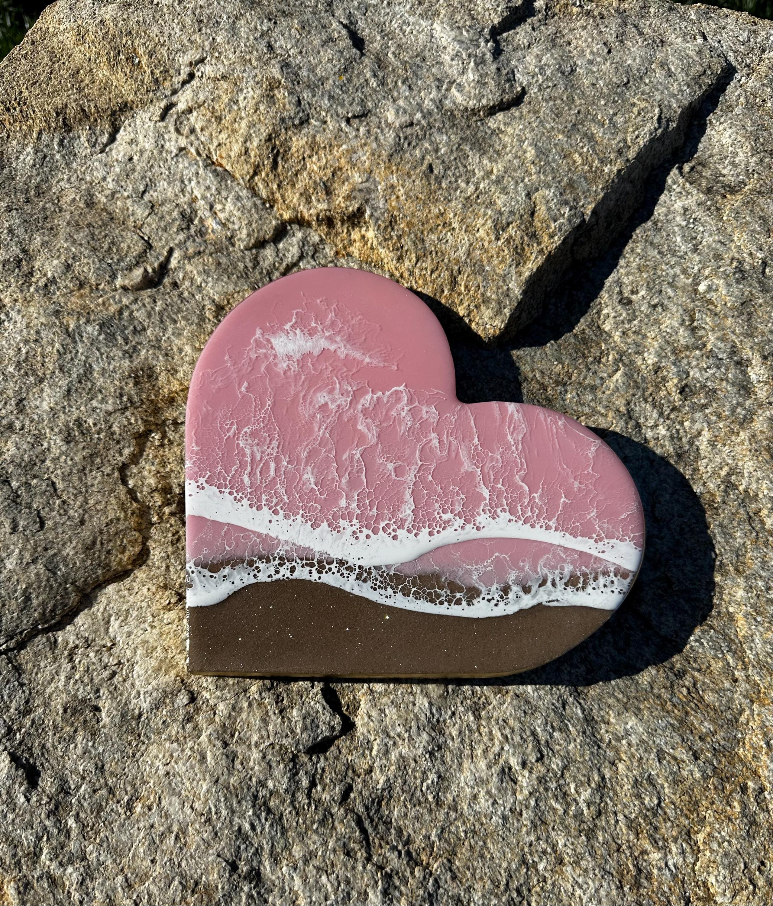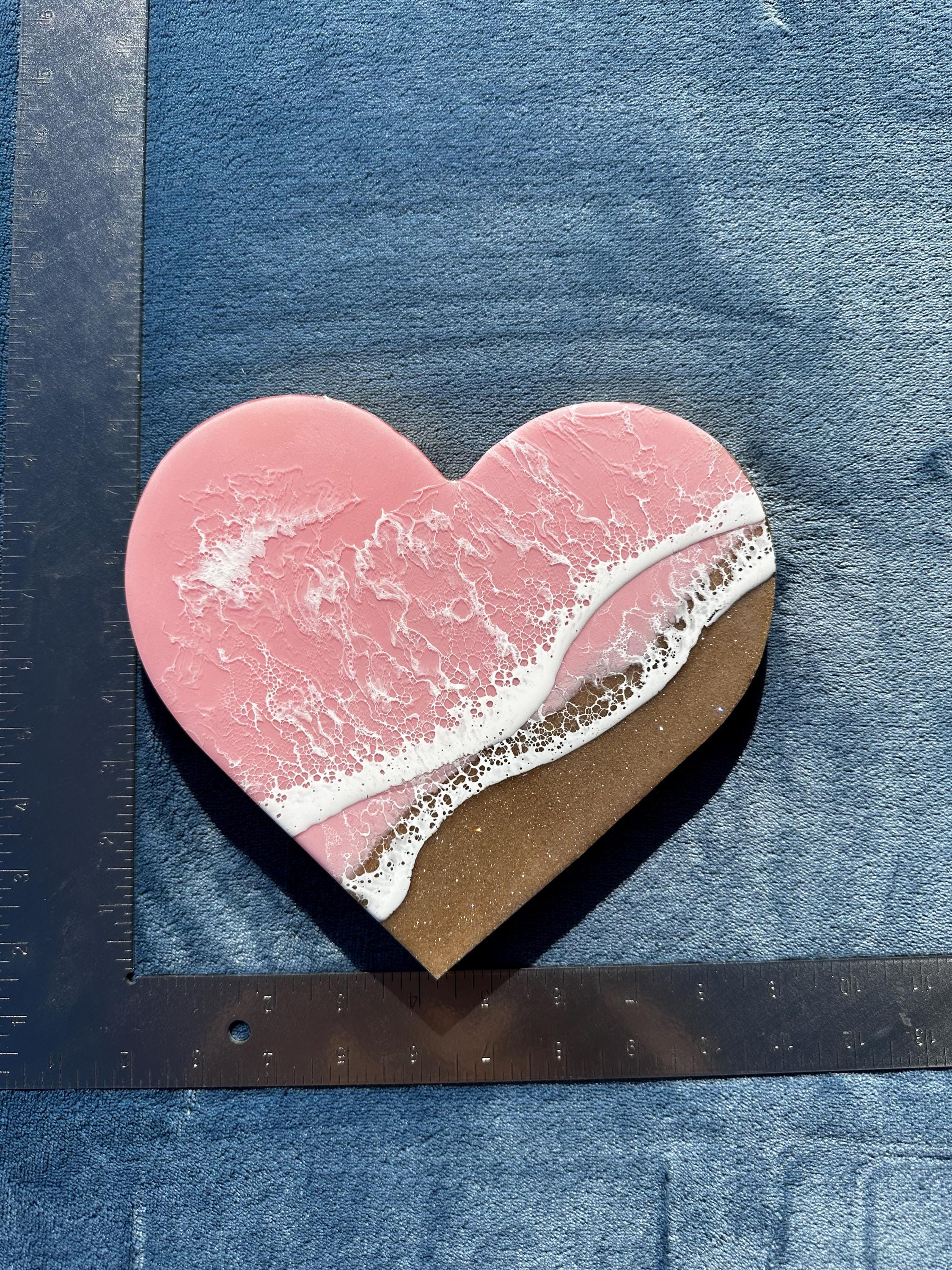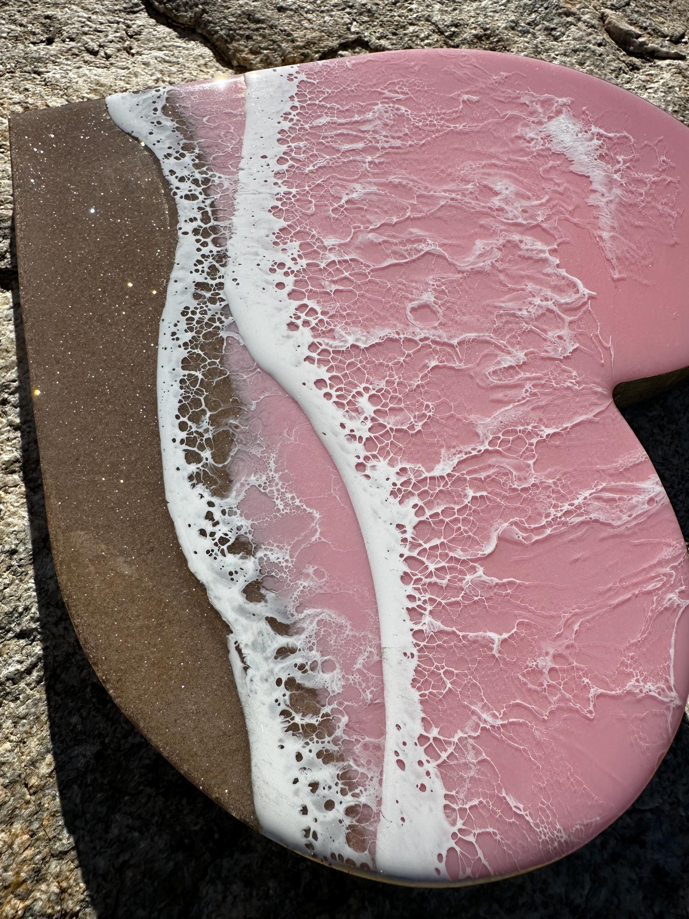 This is a wood heart cut out with a resin ocean scene on top. The waves are on a diagonal and have multiple layers of waves hitting the shore. The layers of waves help to create the dimension of real water. The watercolor is a metallic baby pink with white waves crashing on the real sand beach. The sand is created with real sand mixed with a little glitter to create that sparkle and shine of the sand in the sun.