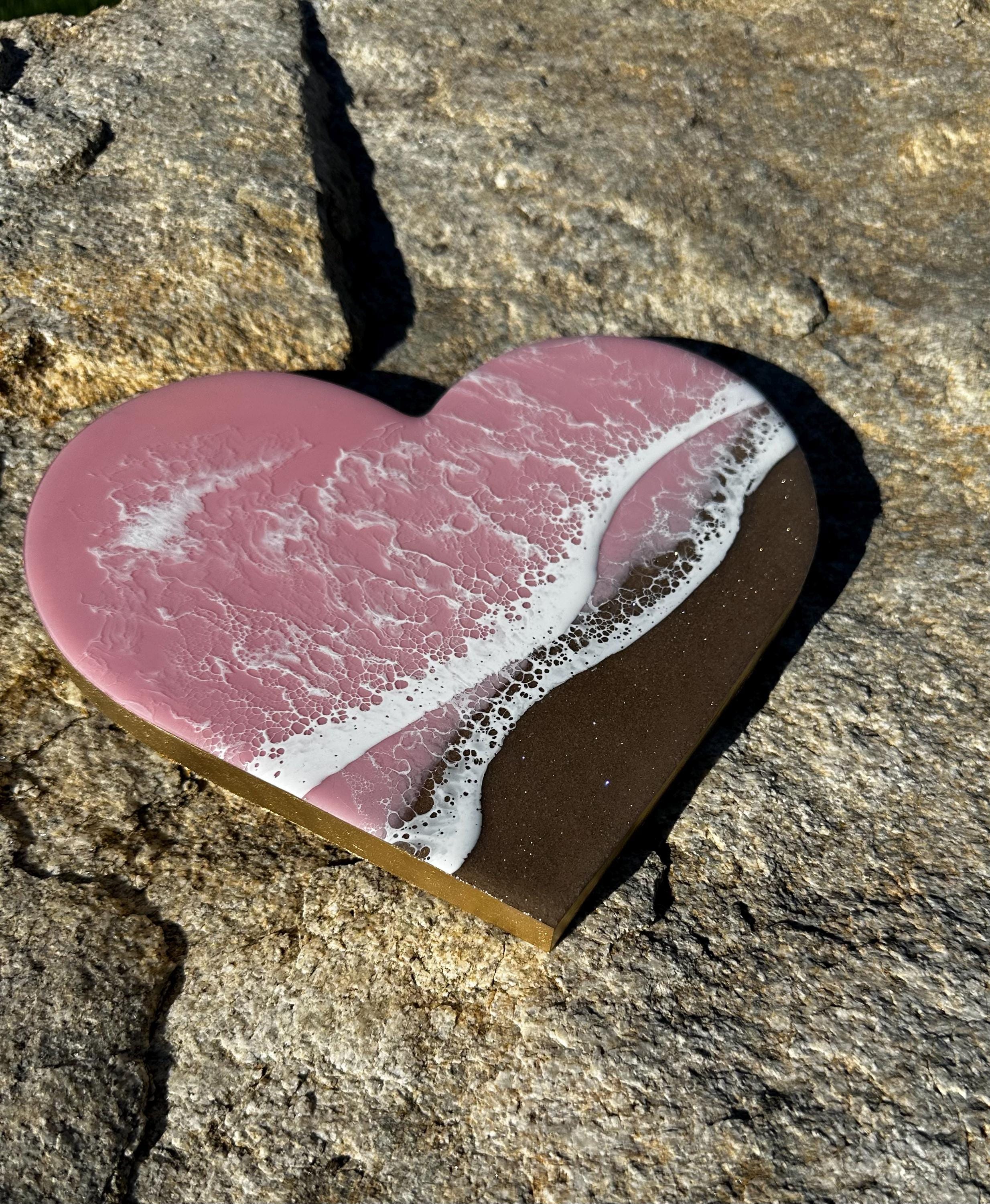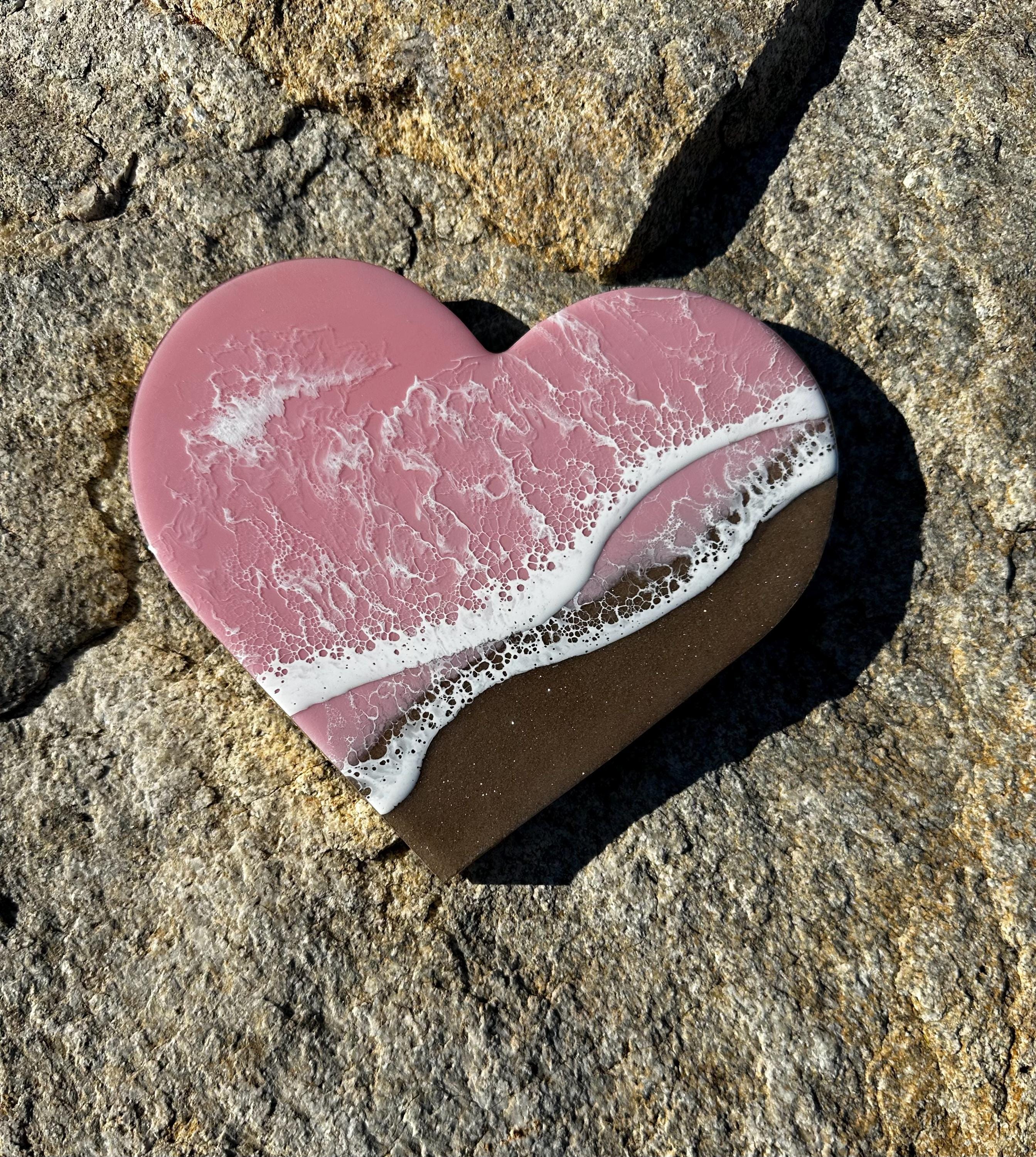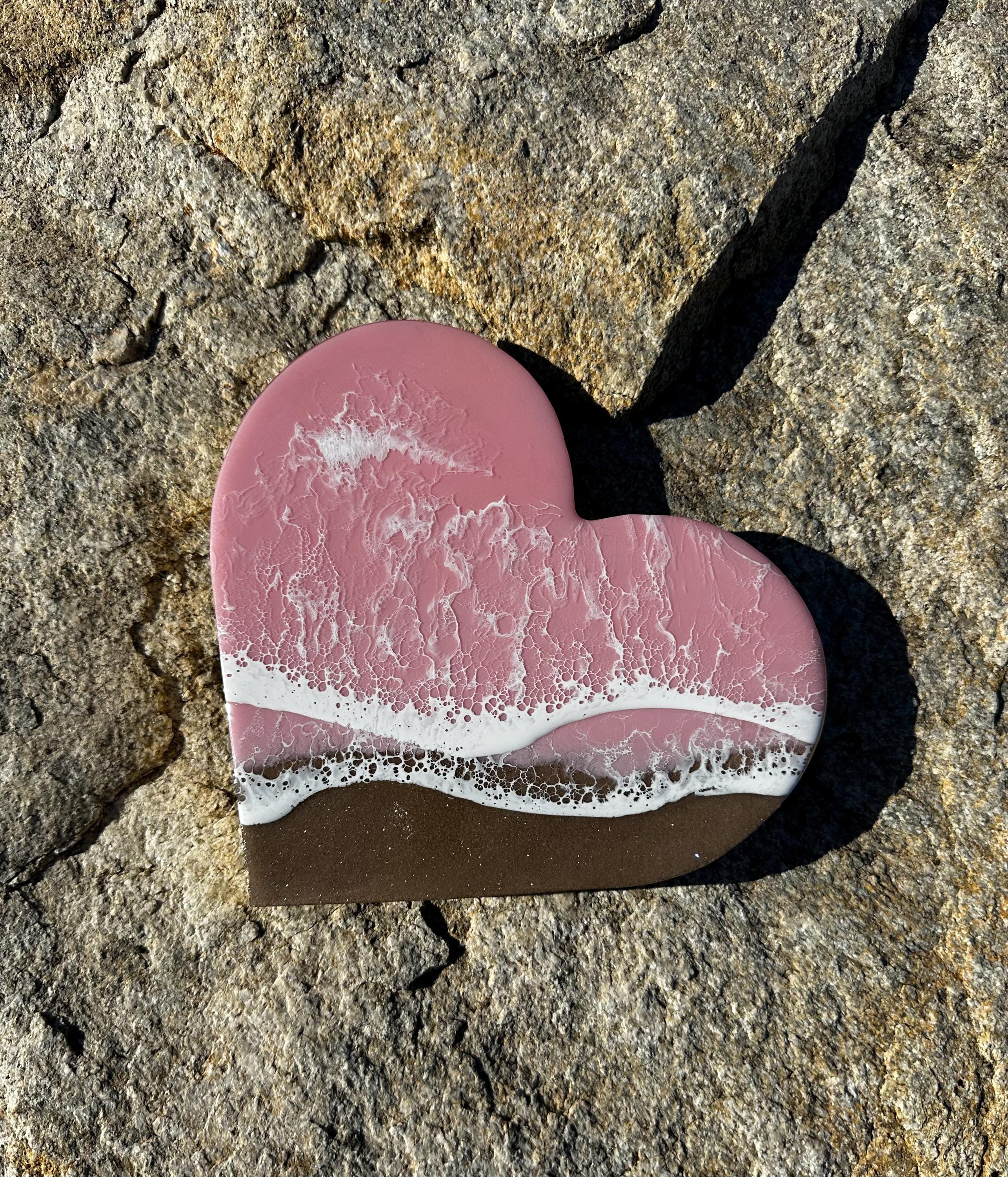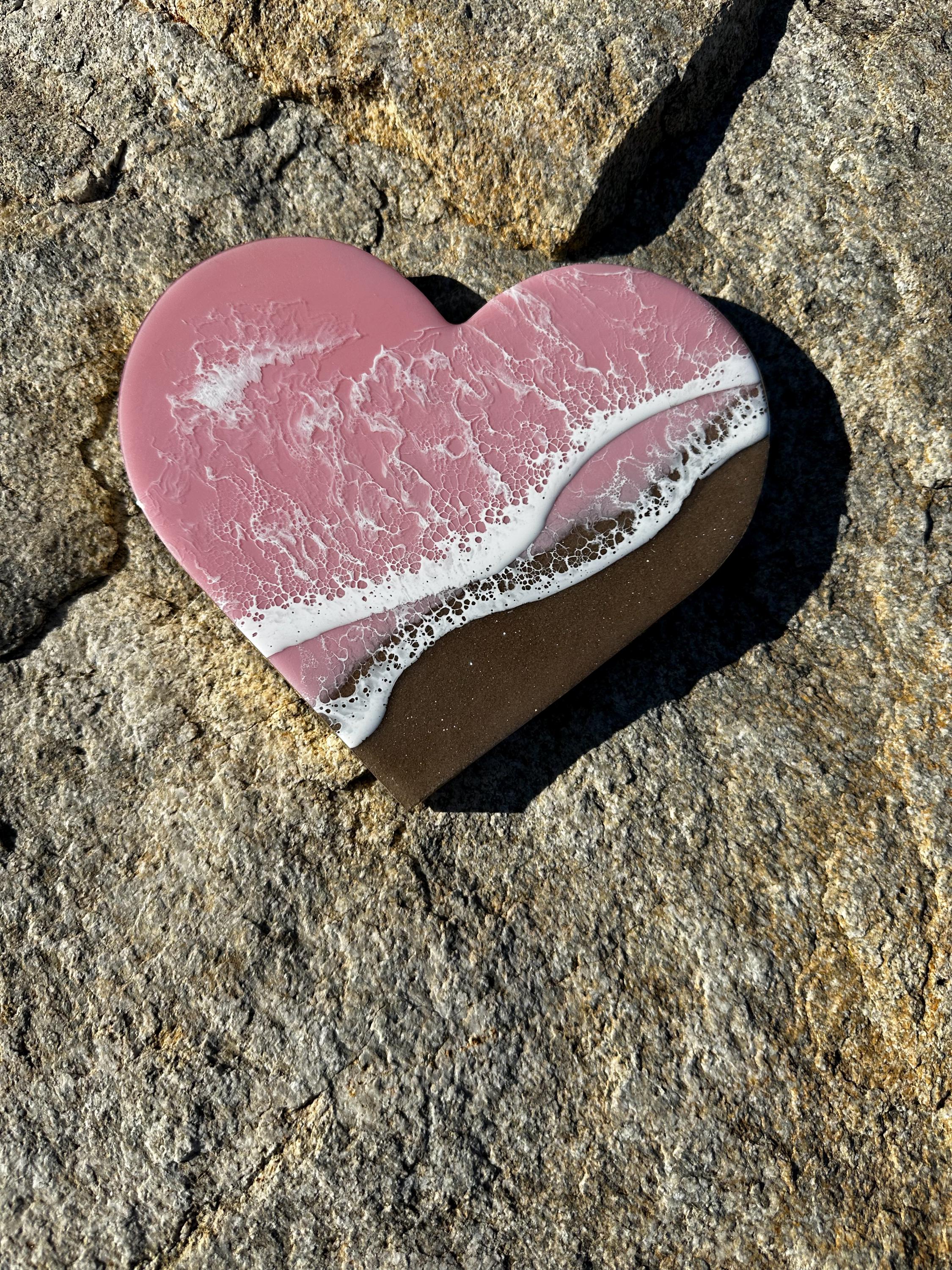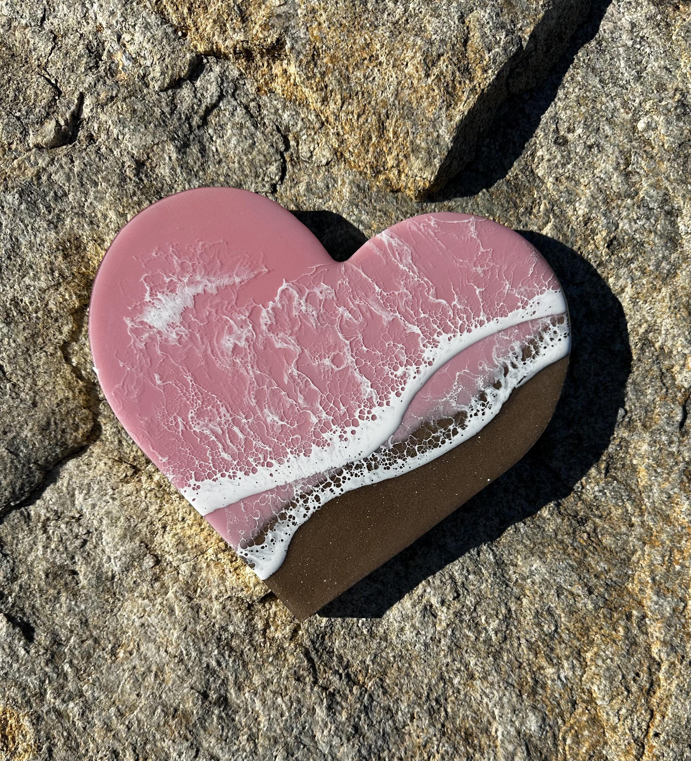 This is a wood heart cut out with a resin ocean scene on top. The waves are on a diagonal and have multiple layers of waves hitting the shore. The layers of waves help to create the dimension of real water. The watercolor is a metallic baby pink with white waves crashing on the real sand beach. The sand is created with real sand mixed with a little glitter to create that sparkle and shine of the sand in the sun.