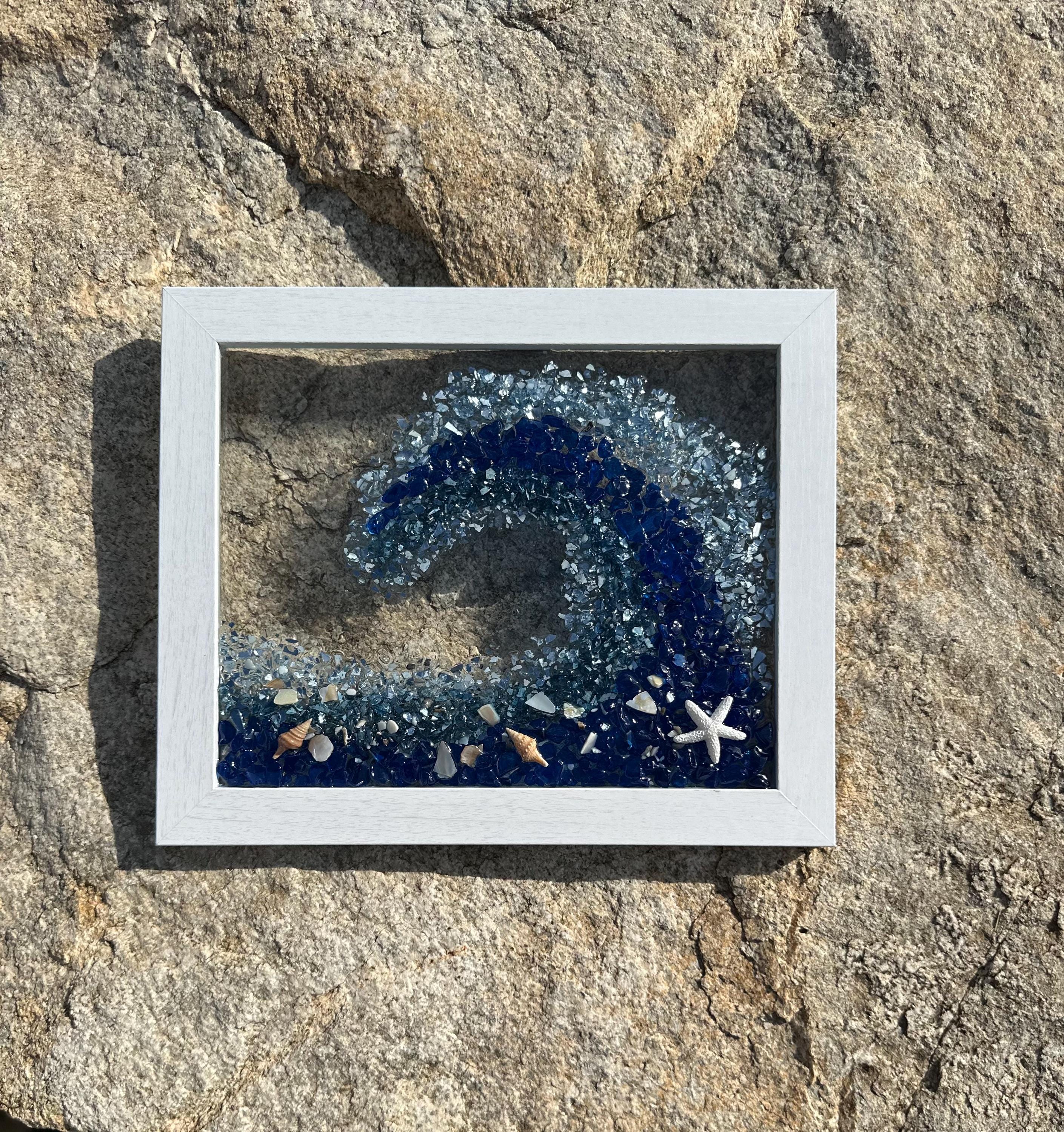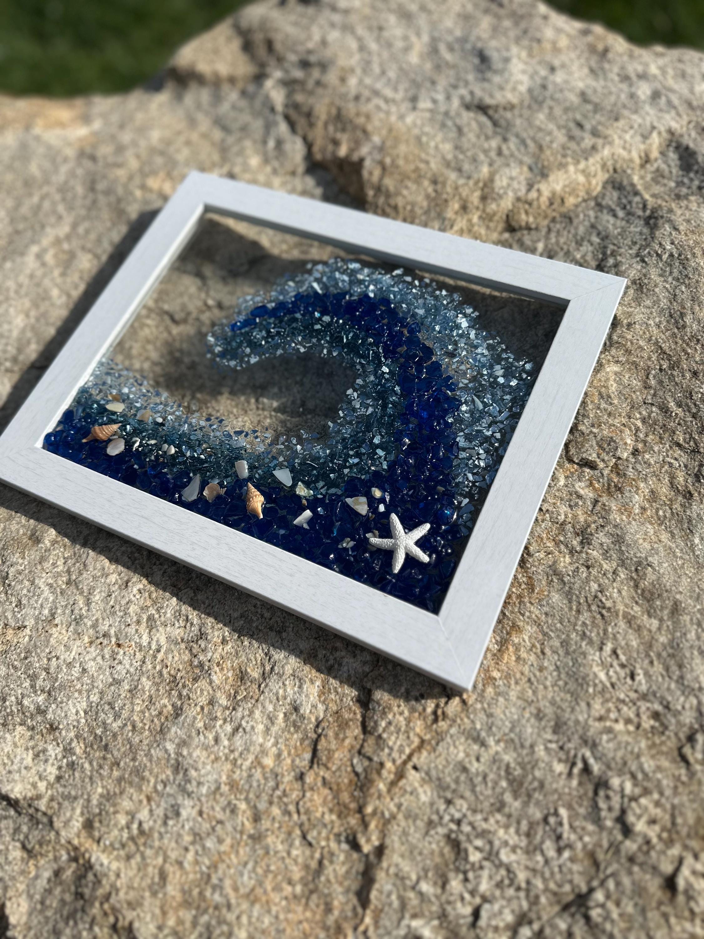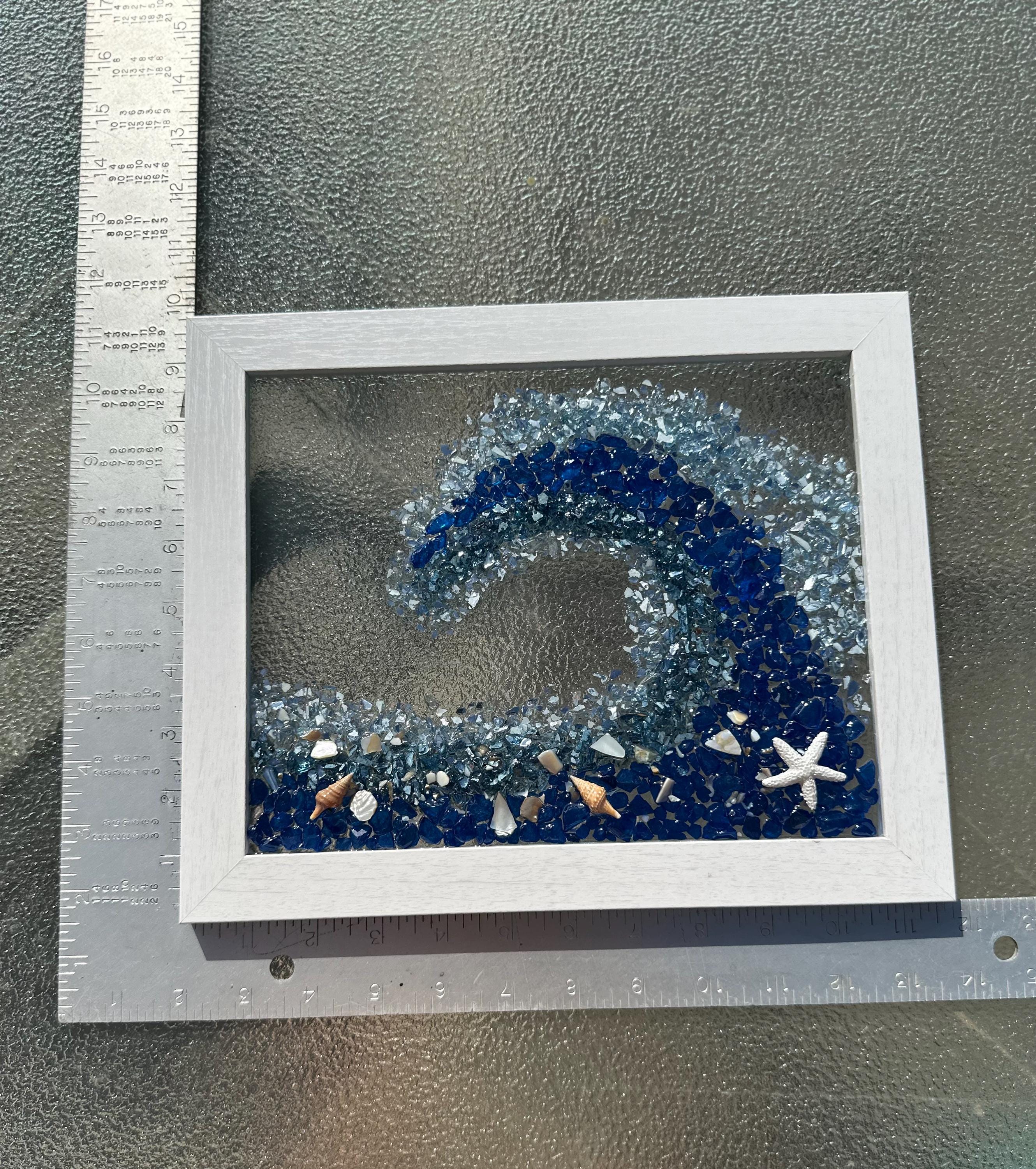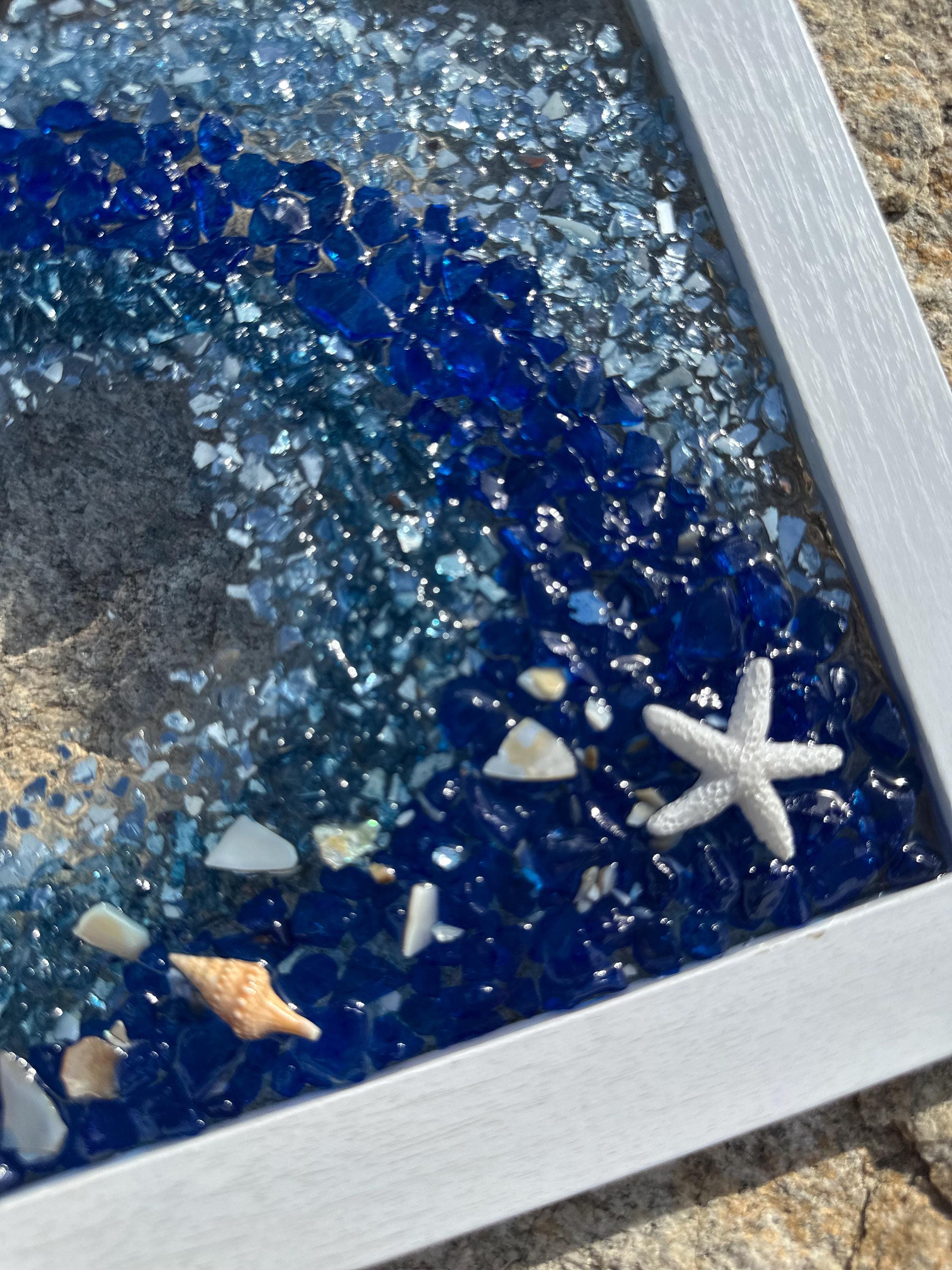 This gorgeous ocean wave resin art will make you feel like you are in the ocean and give you that sense of peace and tranquility. This piece has been designed into a wave shape using crushed glass and mirror pieces and decorated with shells of all kinds. This wave has colors of dark blue, turquoise, light blue, and touches of silver throughout.