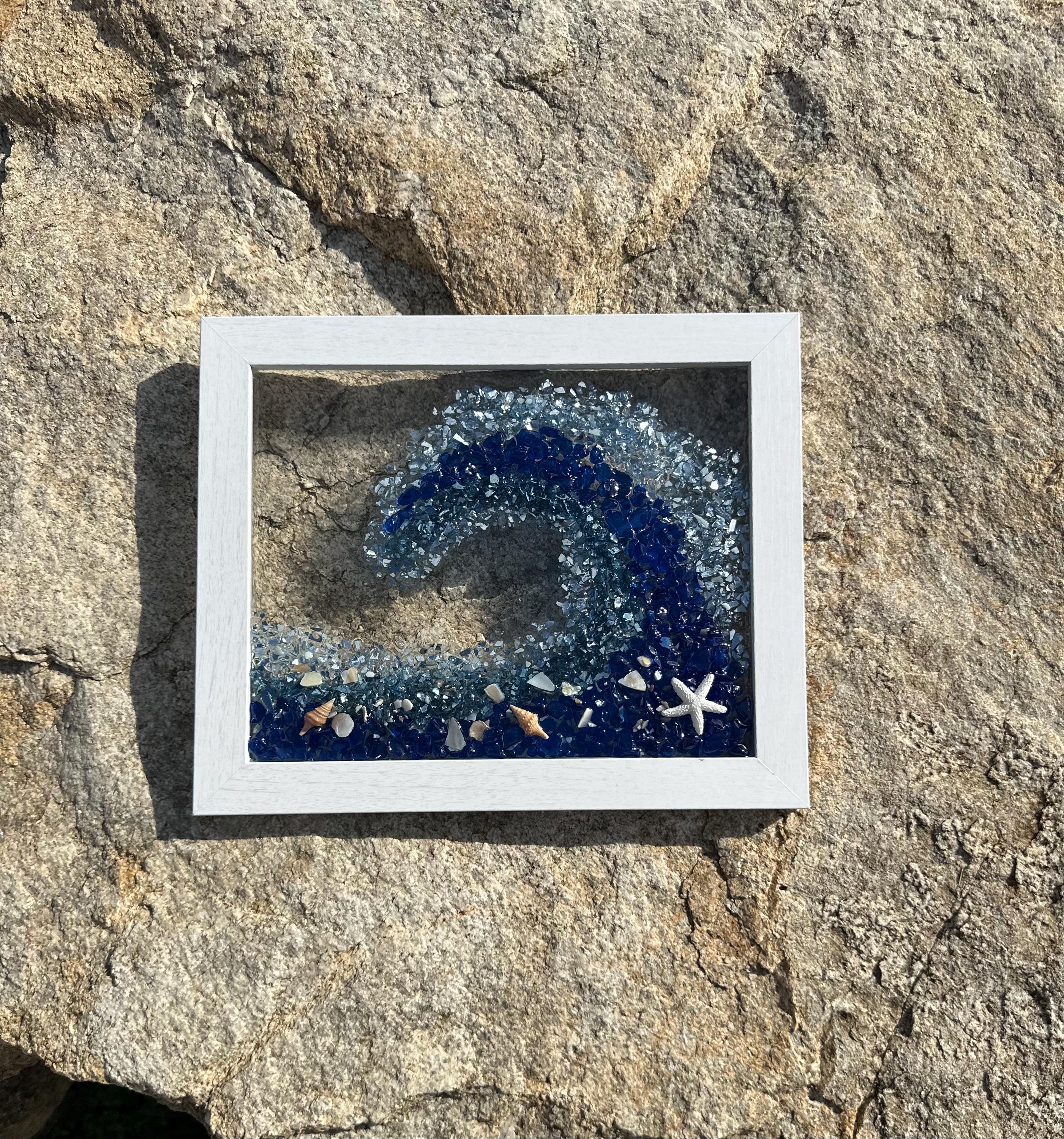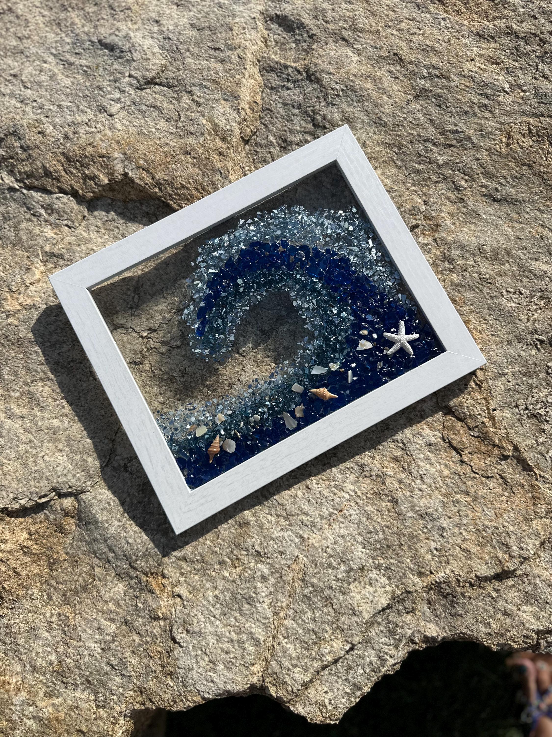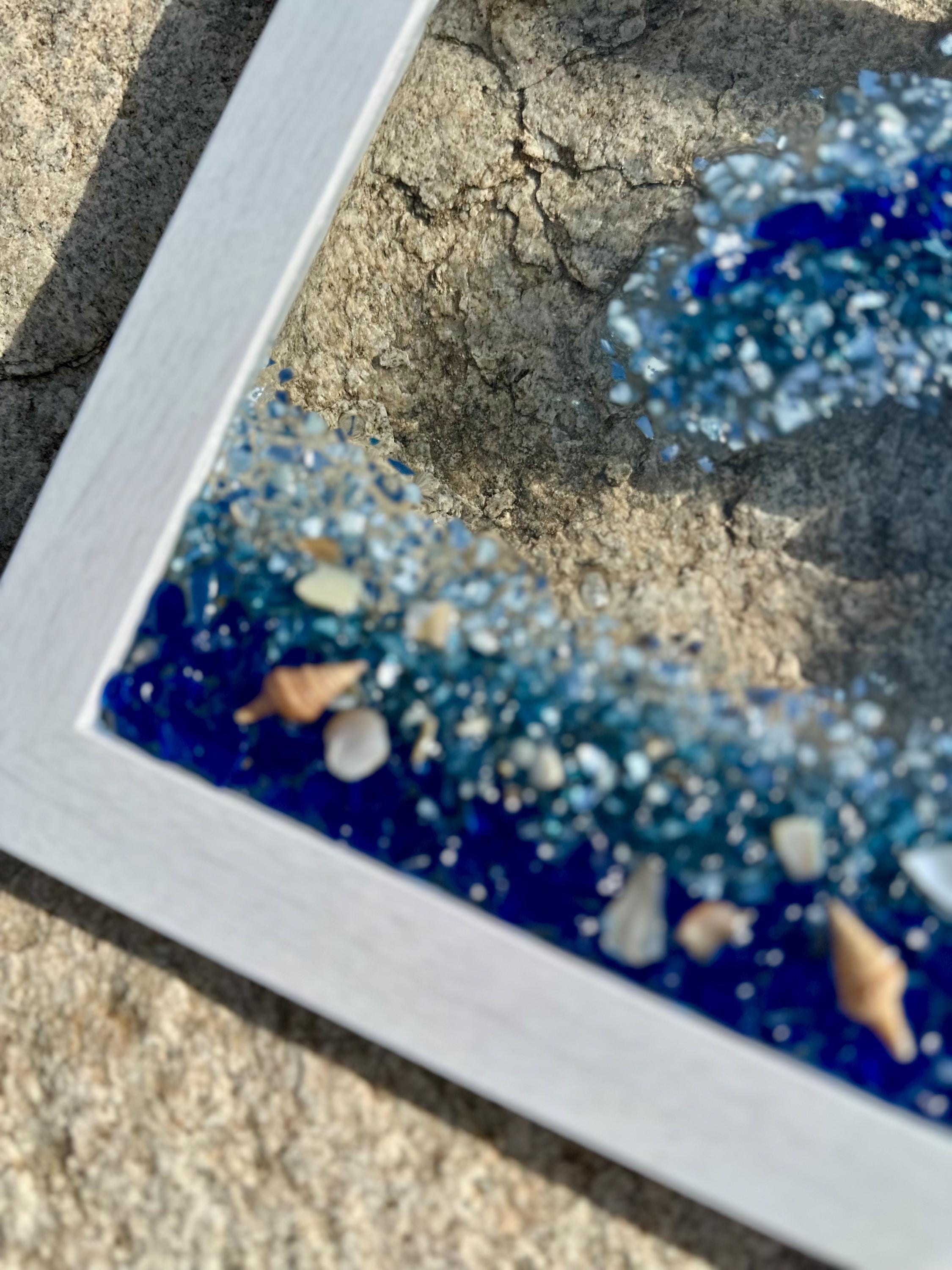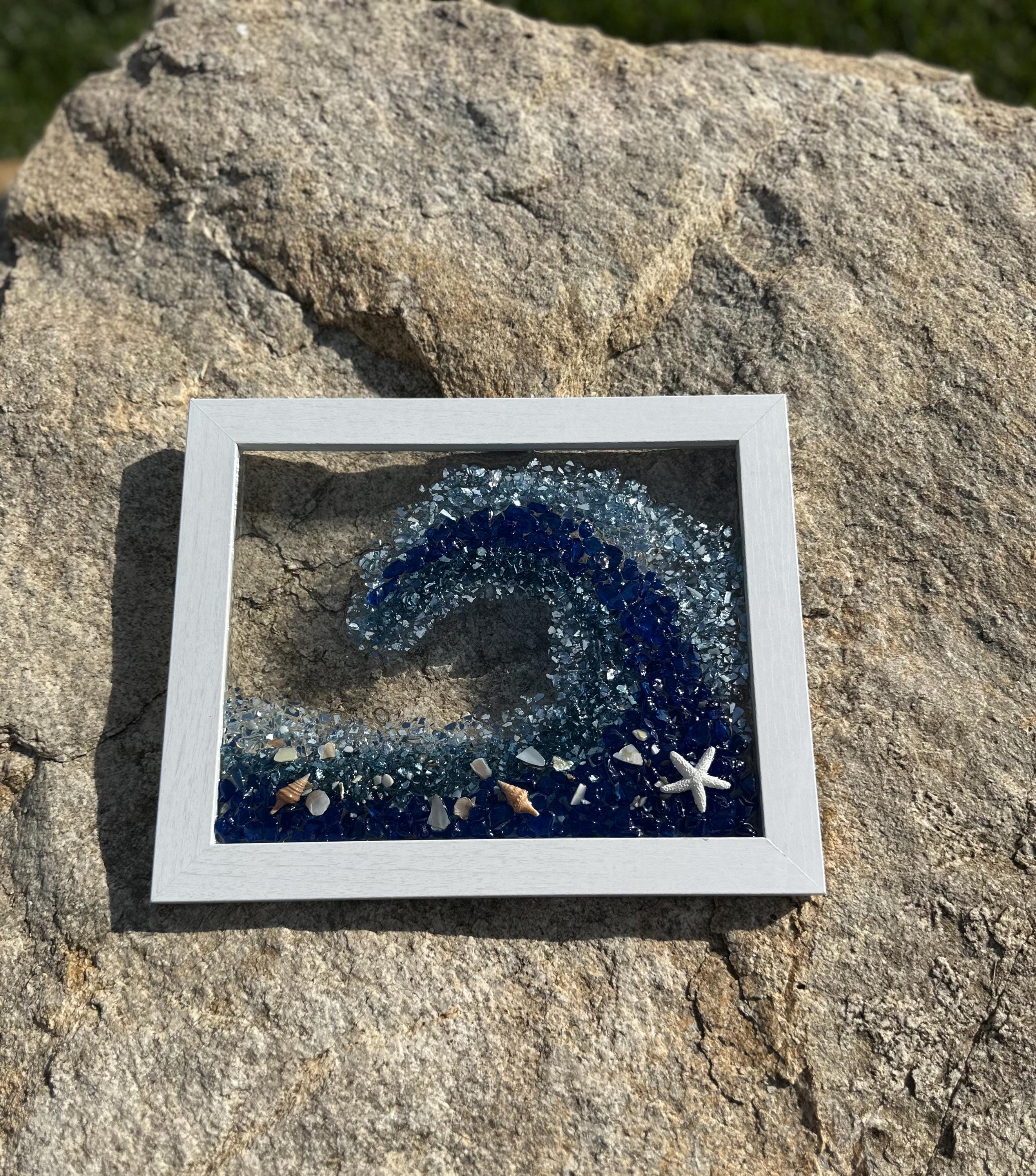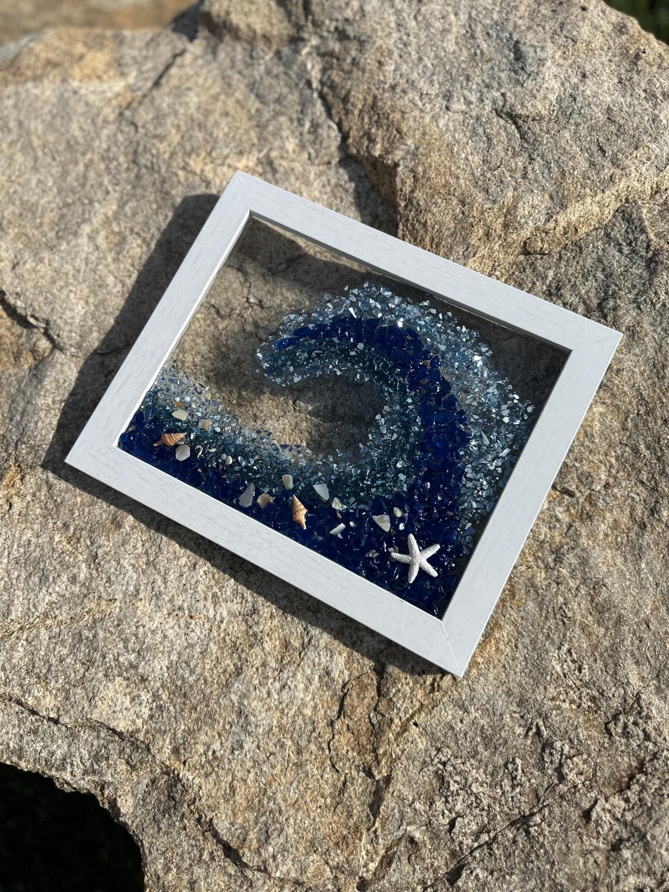 This gorgeous ocean wave resin art will make you feel like you are in the ocean and give you that sense of peace and tranquility. This piece has been designed into a wave shape using crushed glass and mirror pieces and decorated with shells of all kinds. This wave has colors of dark blue, turquoise, light blue, and touches of silver throughout.