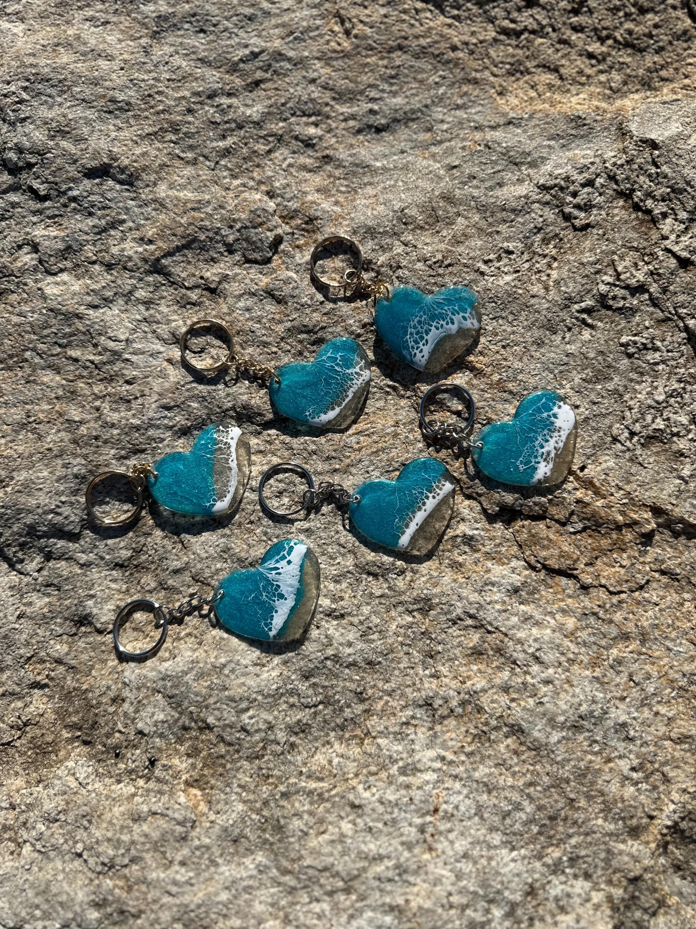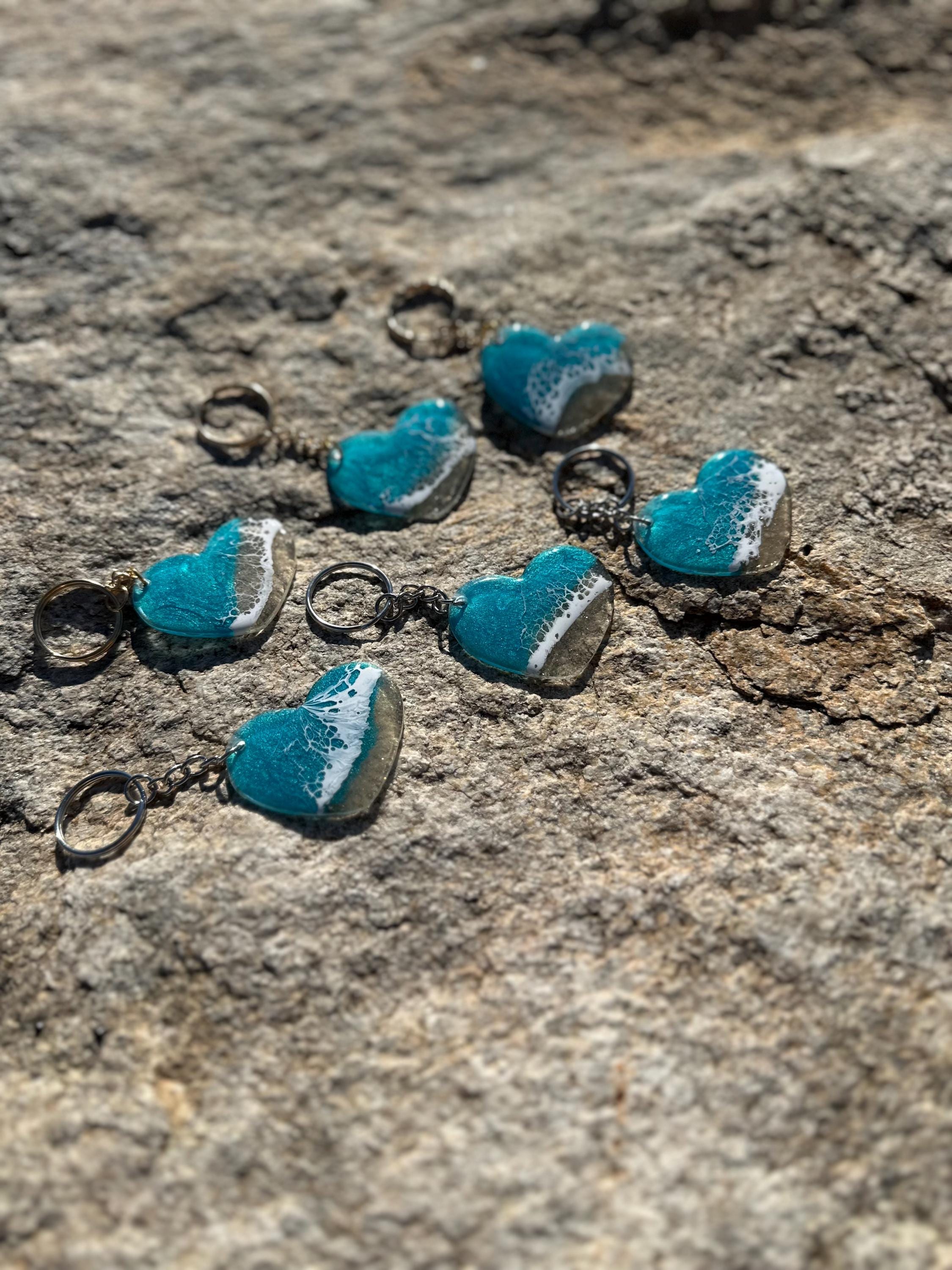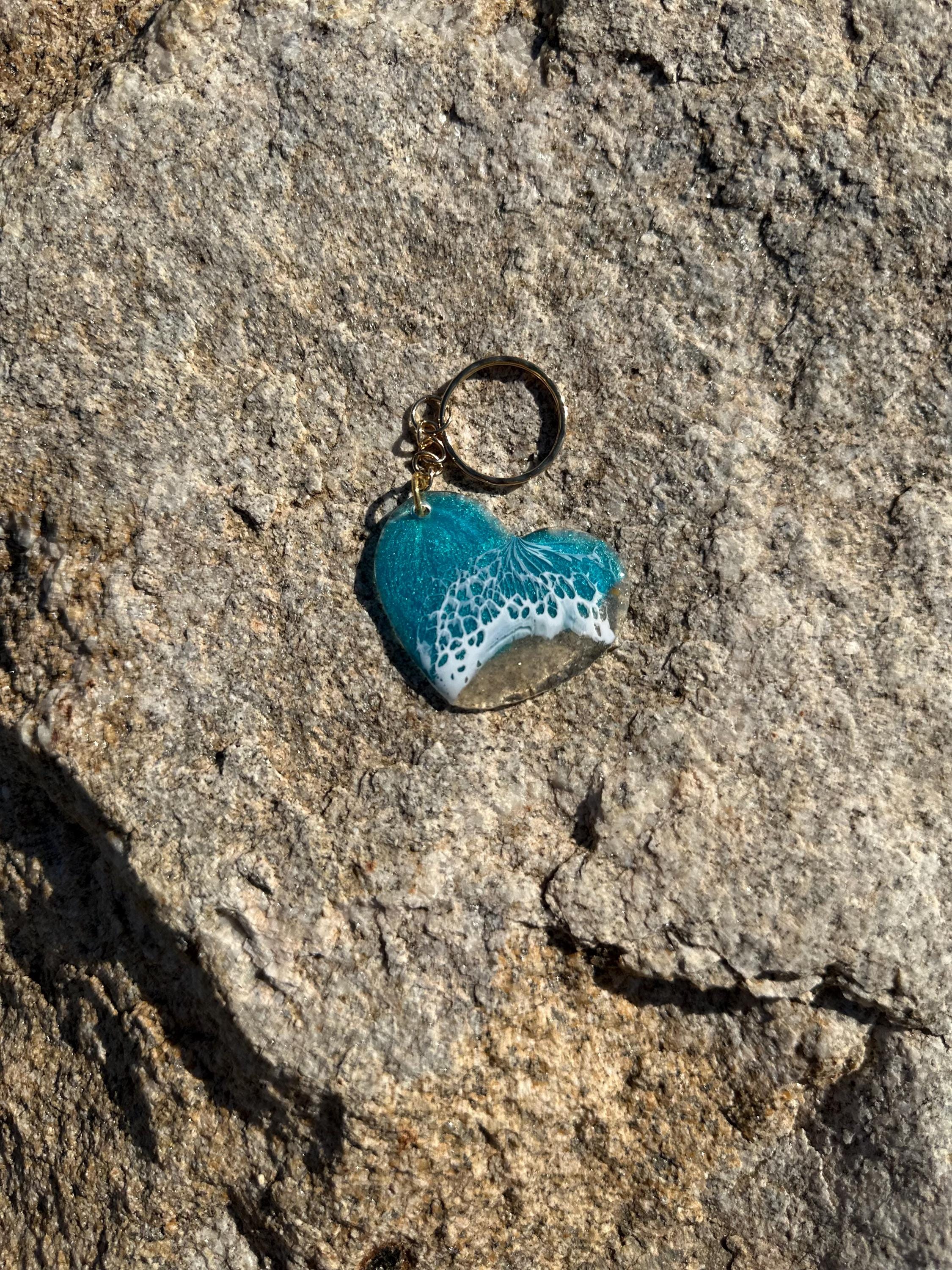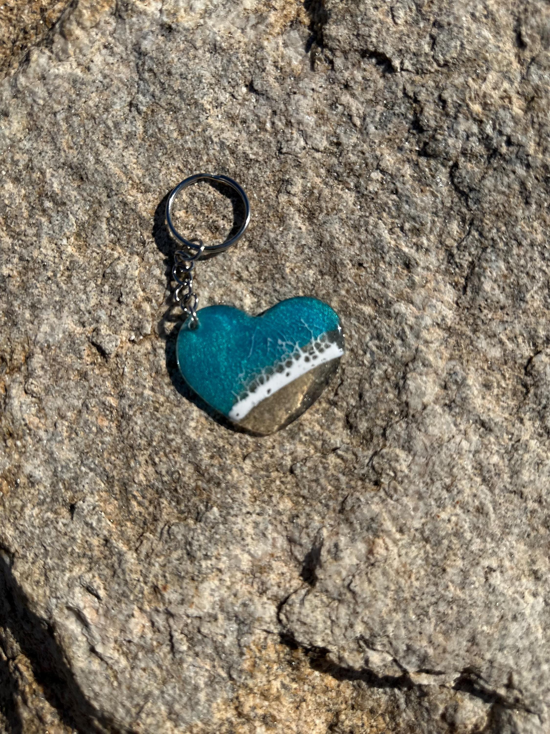 These little ocean keychains are resin poured on acrylic hearts. Each keychain is a 2 in heart with the attached keychain so you can add it to your keyring or purse for decoration. Carry a piece of the tranquility of the ocean with you at all times.