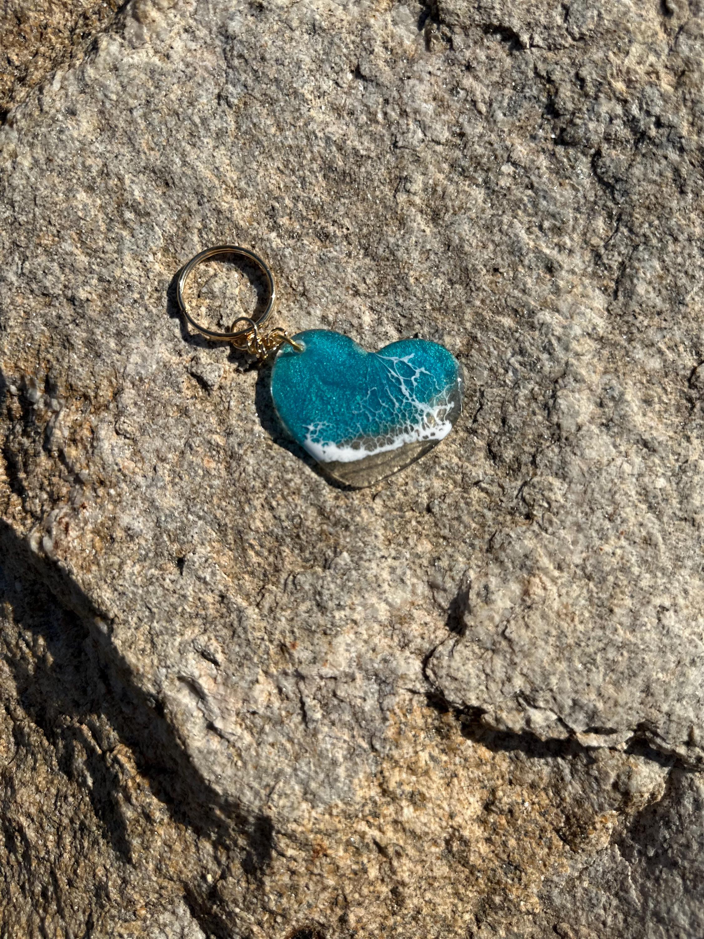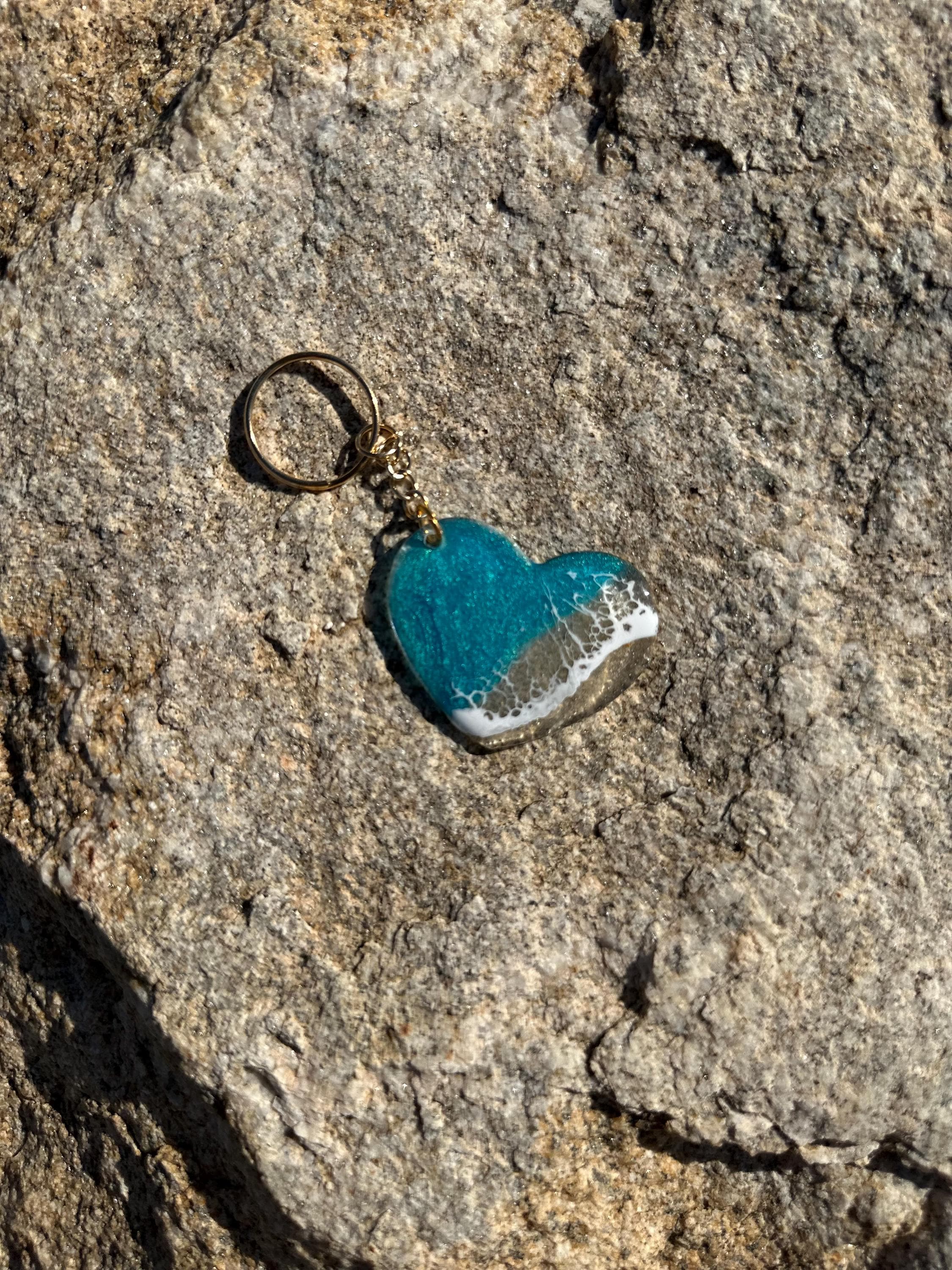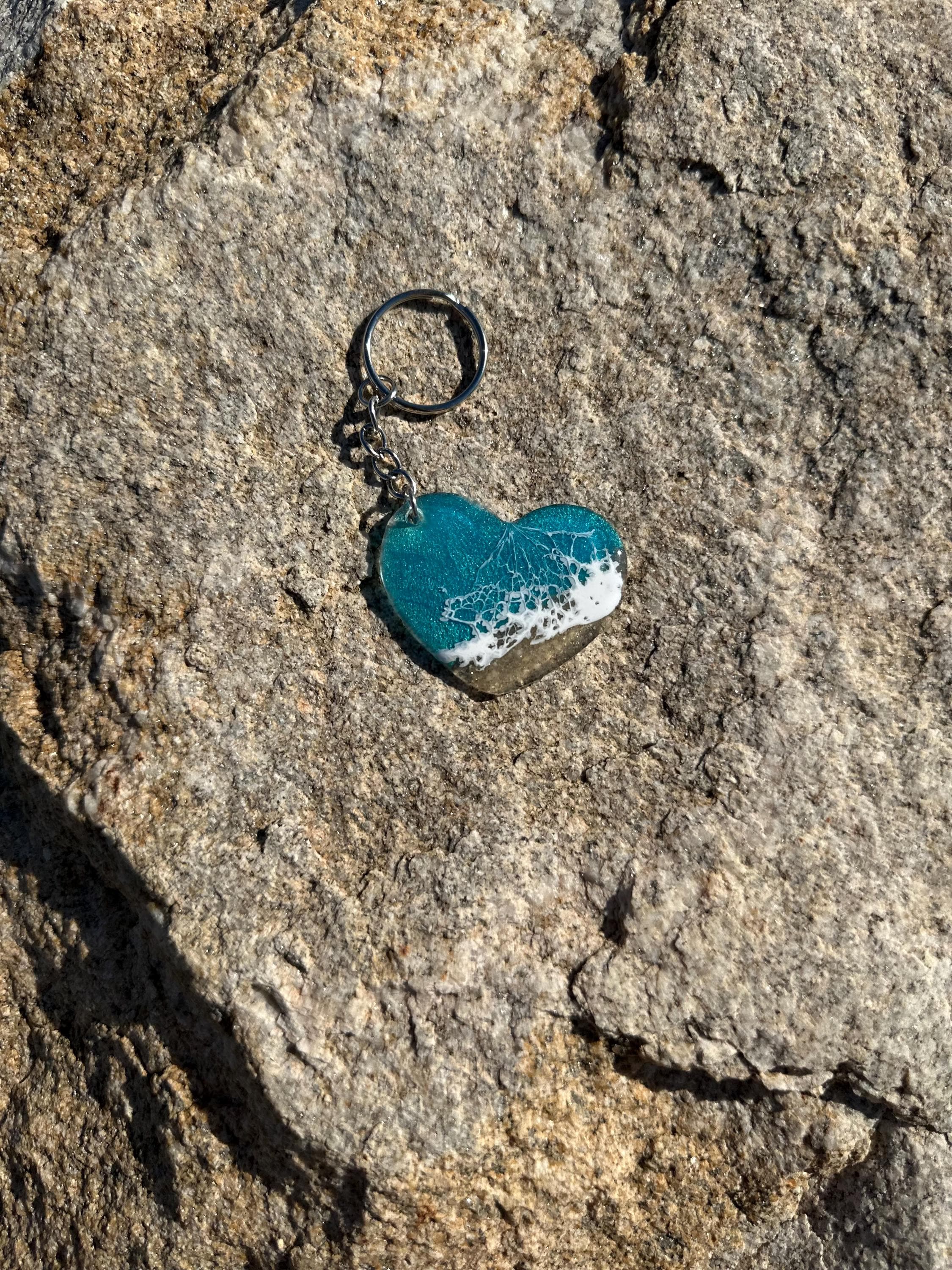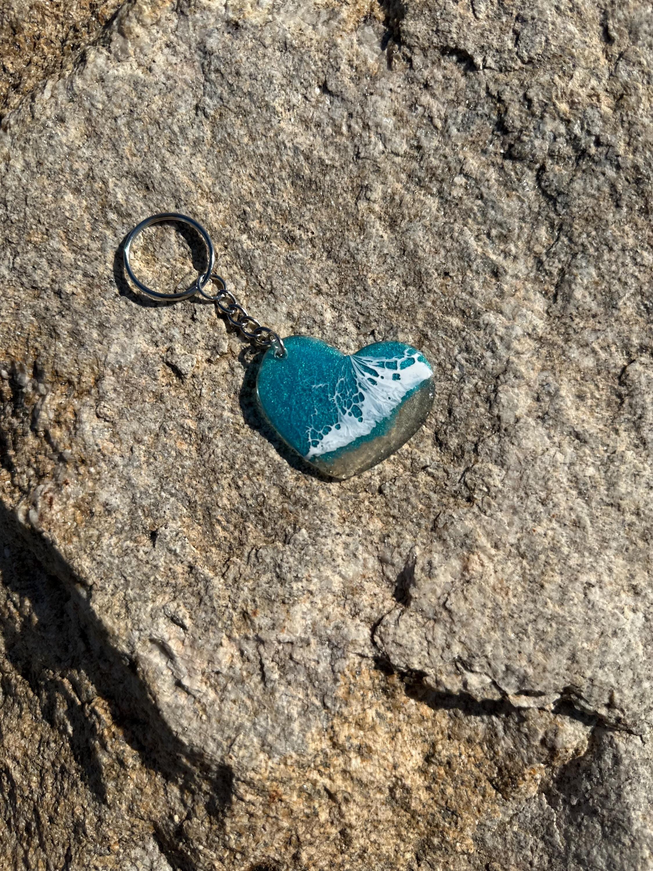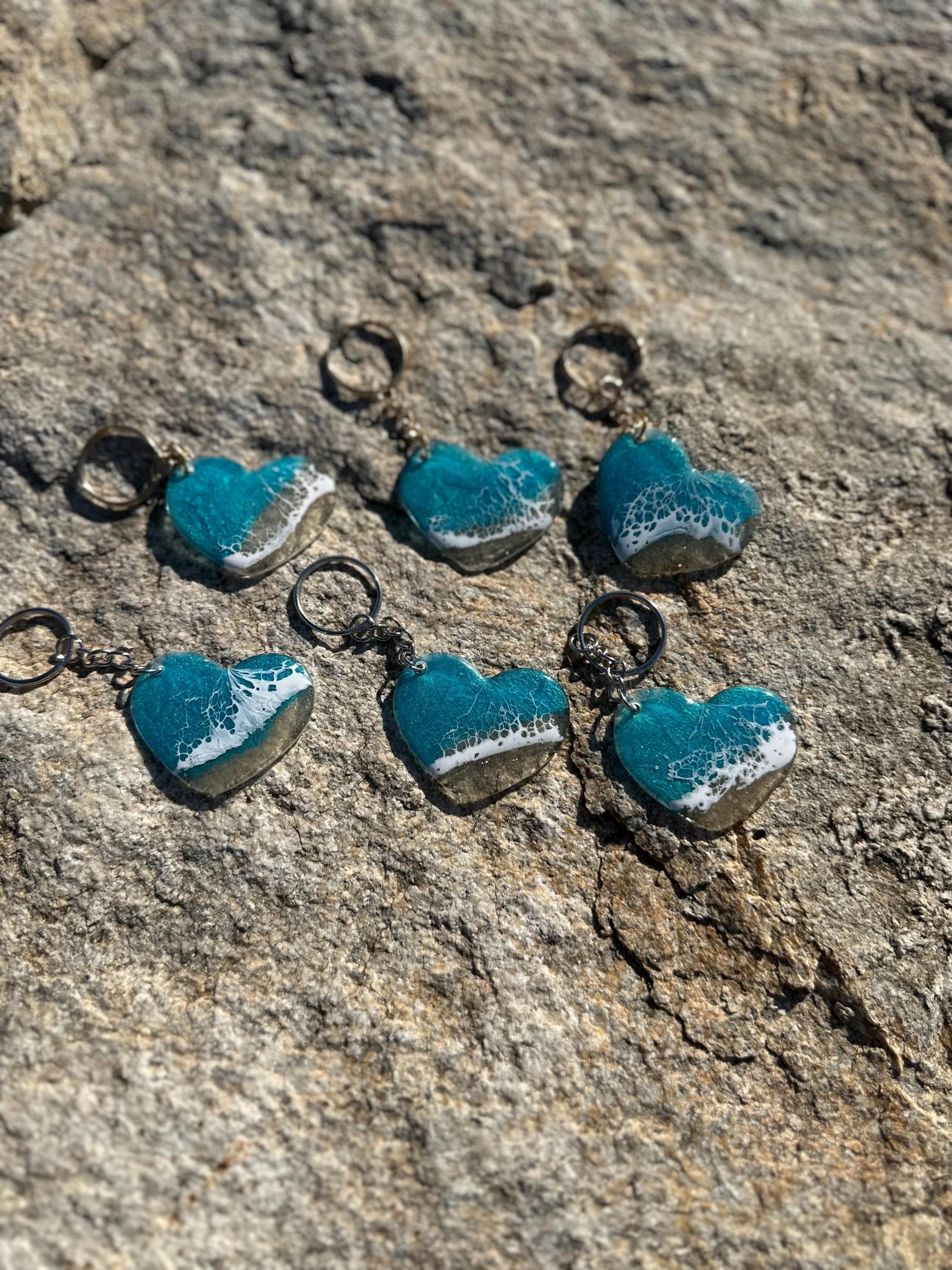 These little ocean keychains are resin poured on acrylic hearts. Each keychain is a 2 in heart with the attached keychain so you can add it to your keyring or purse for decoration. Carry a piece of the tranquility of the ocean with you at all times.