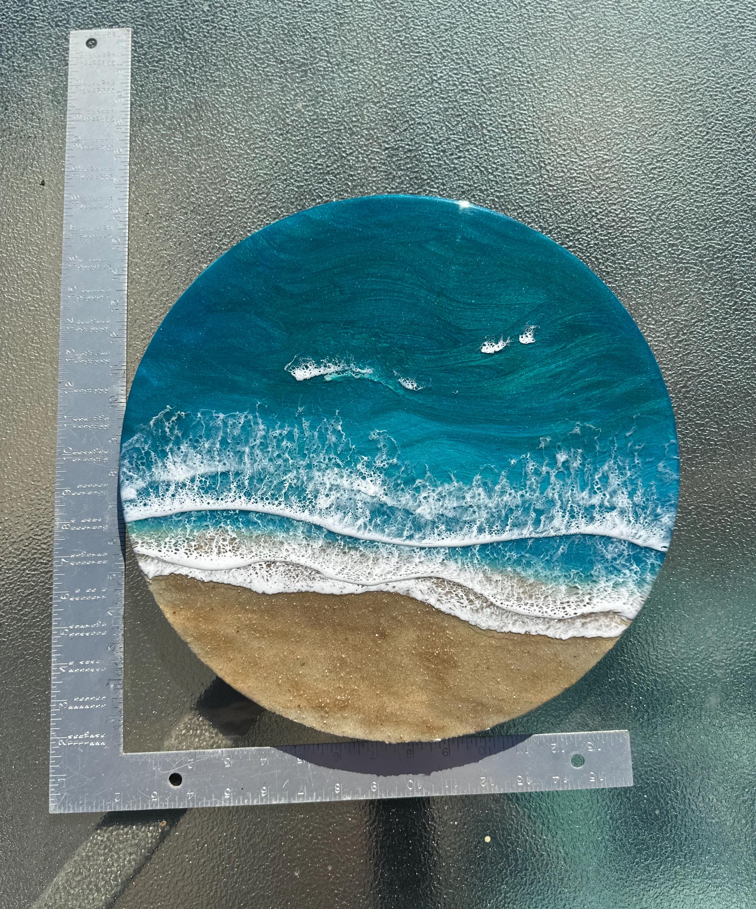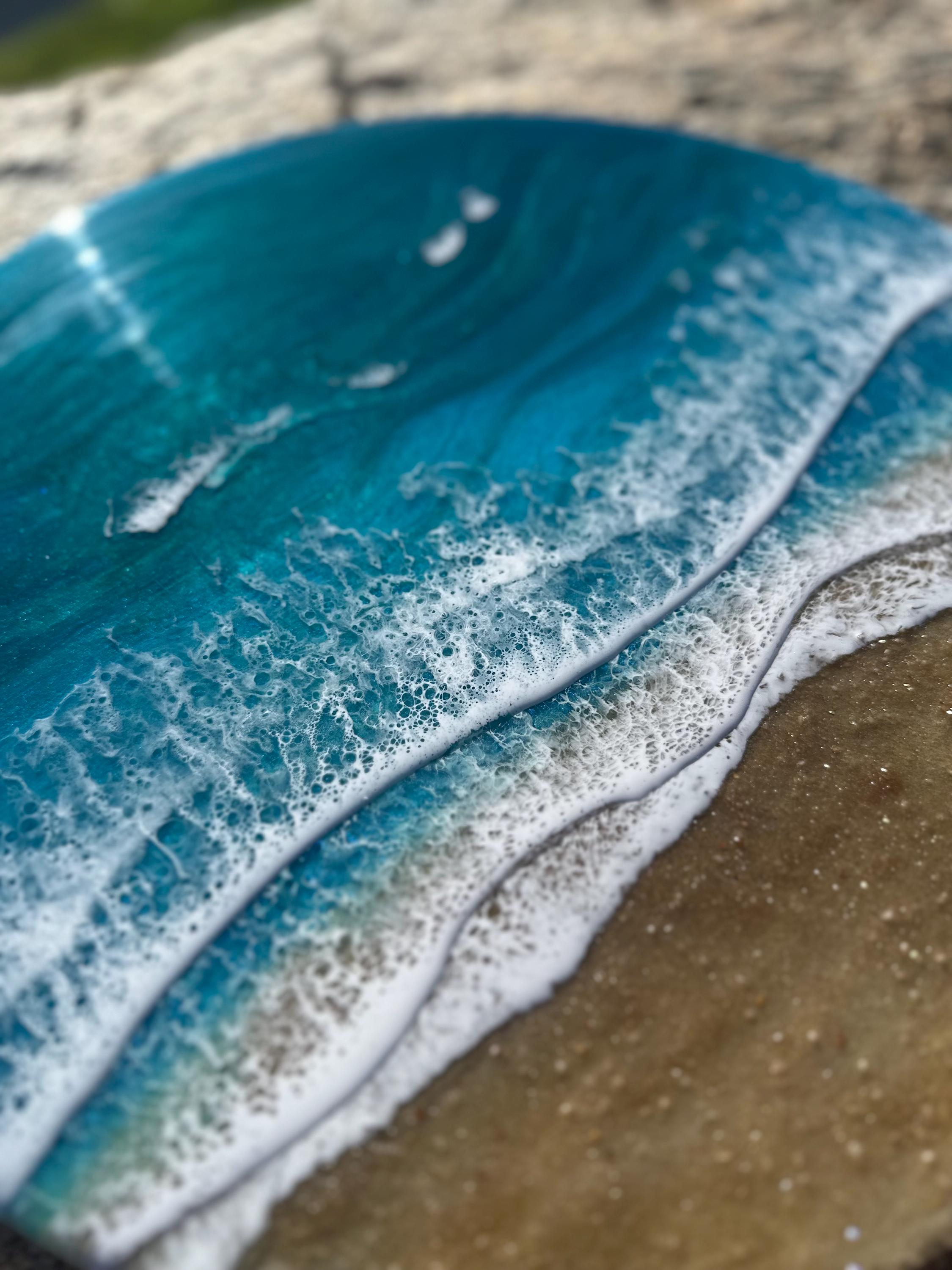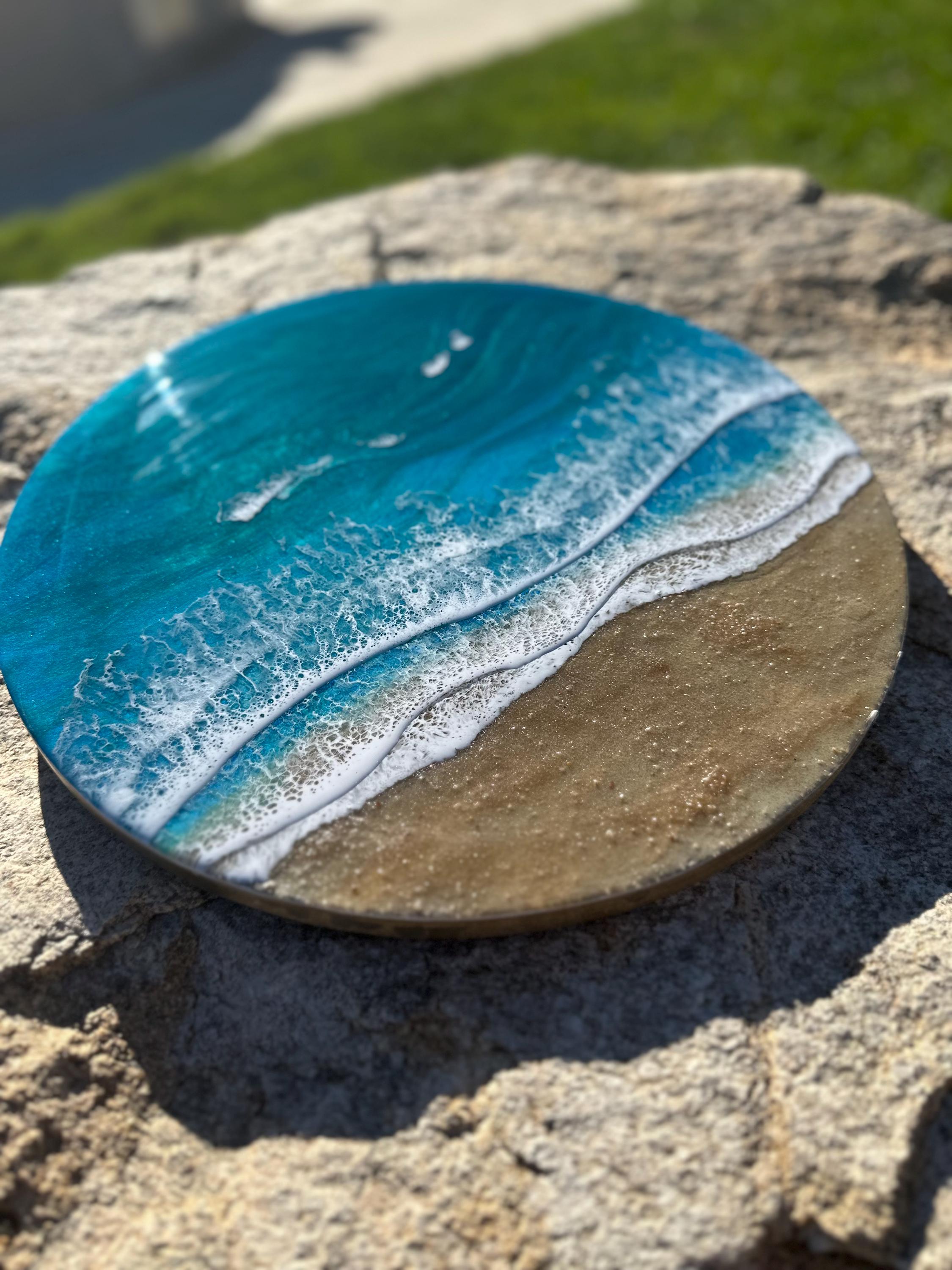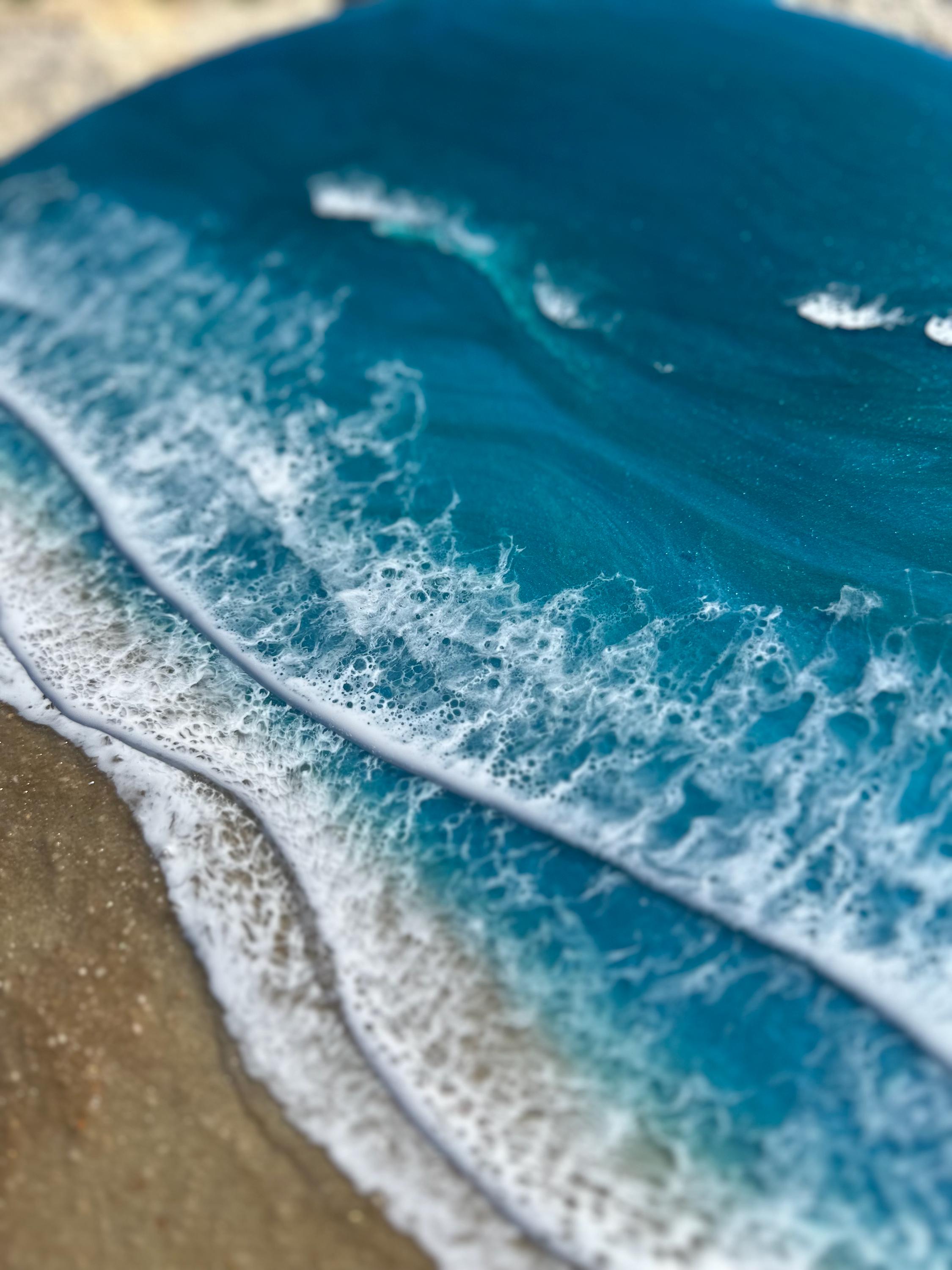 Beautiful ocean resin art on a 16-inch round cradle board. This piece is gorgeous with crisp waves throughout. It will step up your ocean decor in your home.