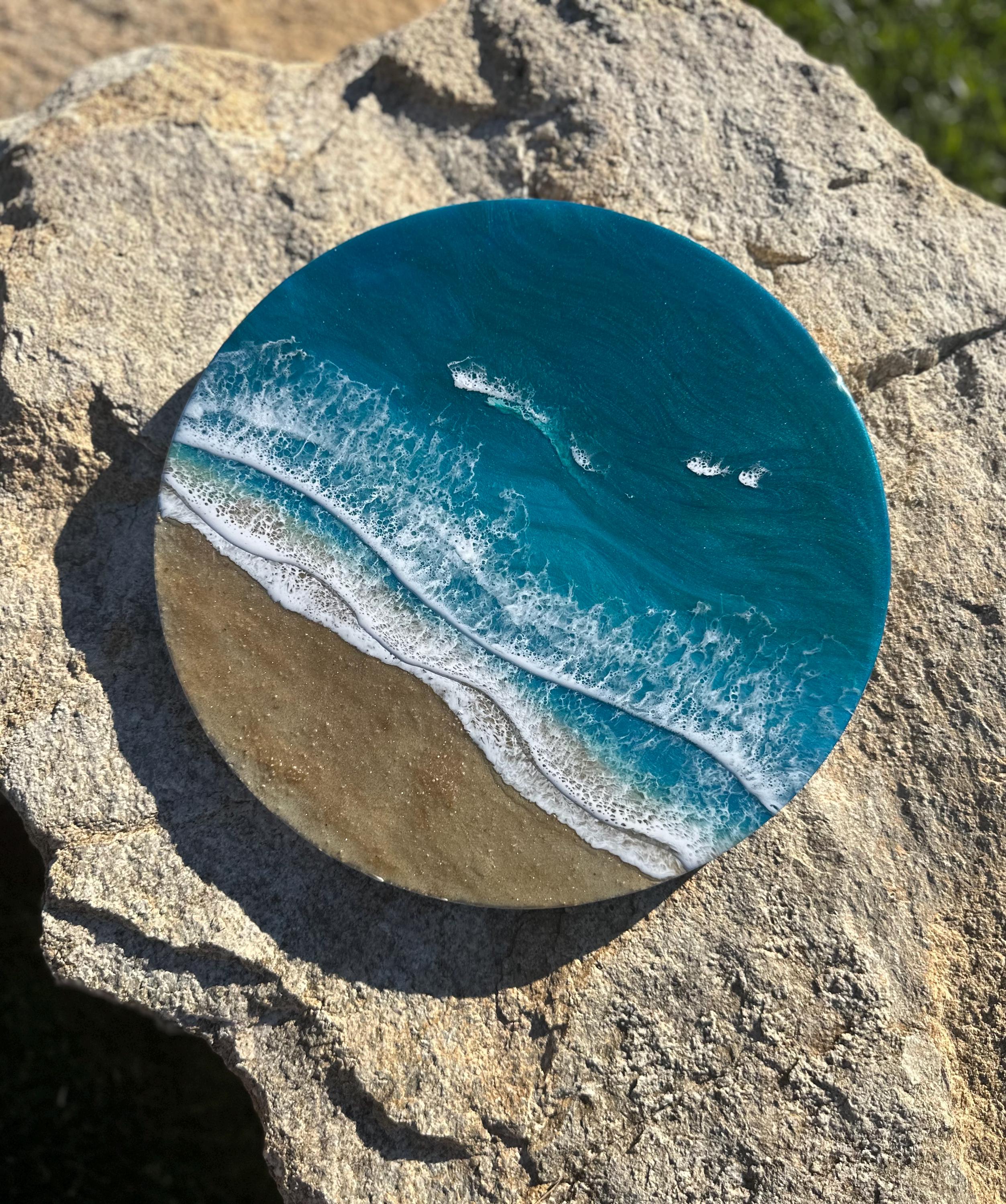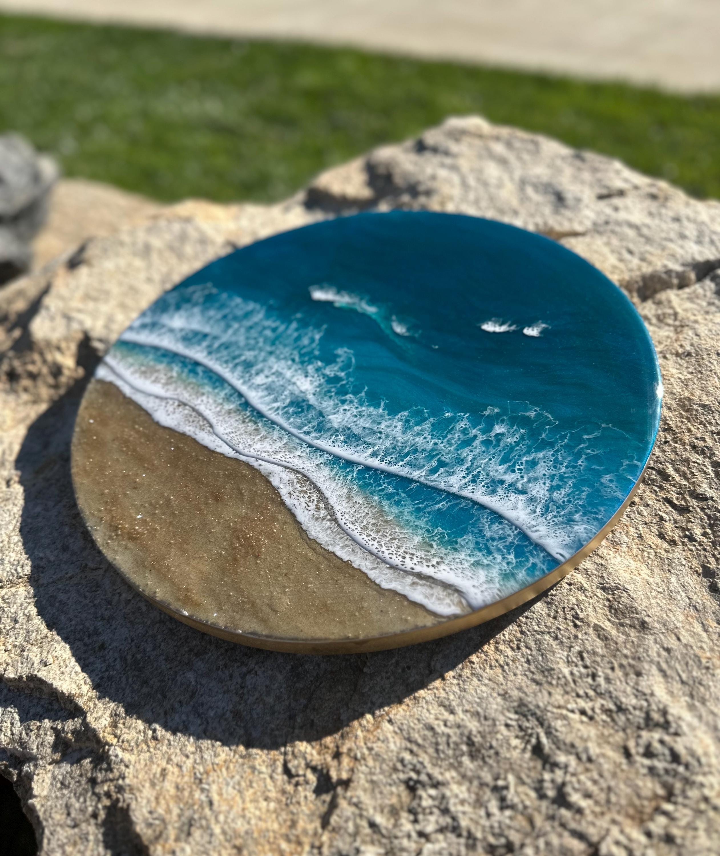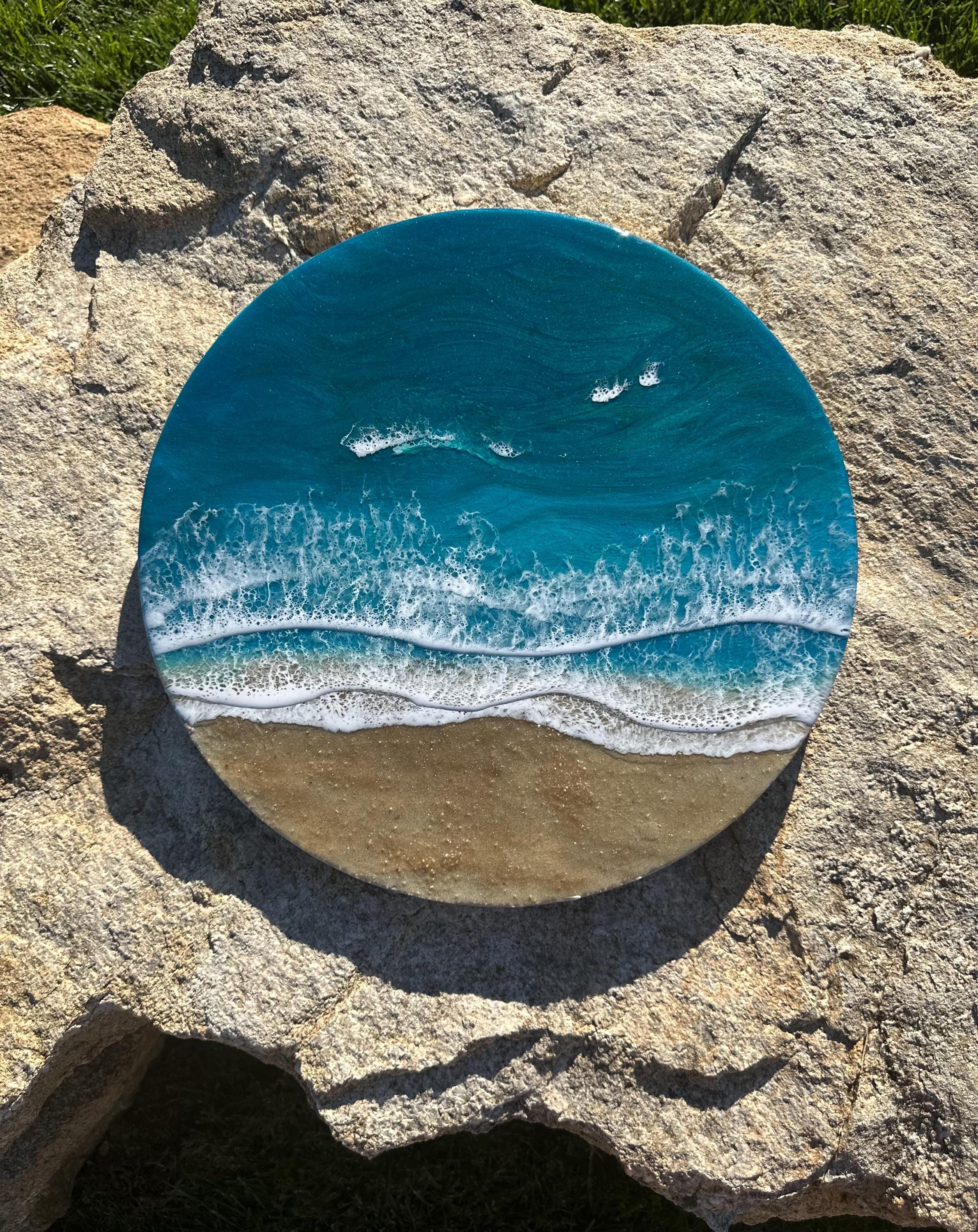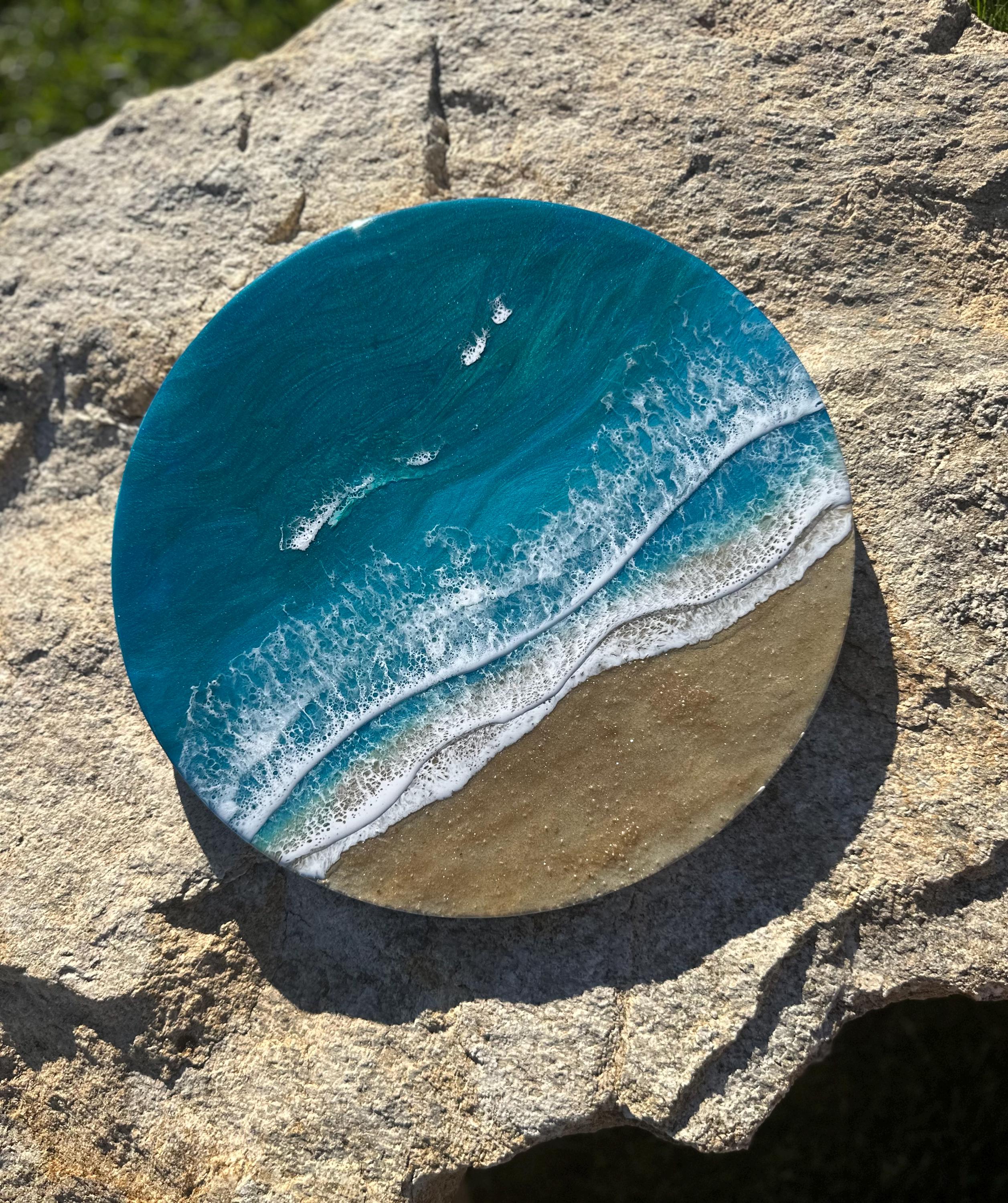 Beautiful ocean resin art on a 16-inch round cradle board. This piece is gorgeous with crisp waves throughout. It will step up your ocean decor in your home.