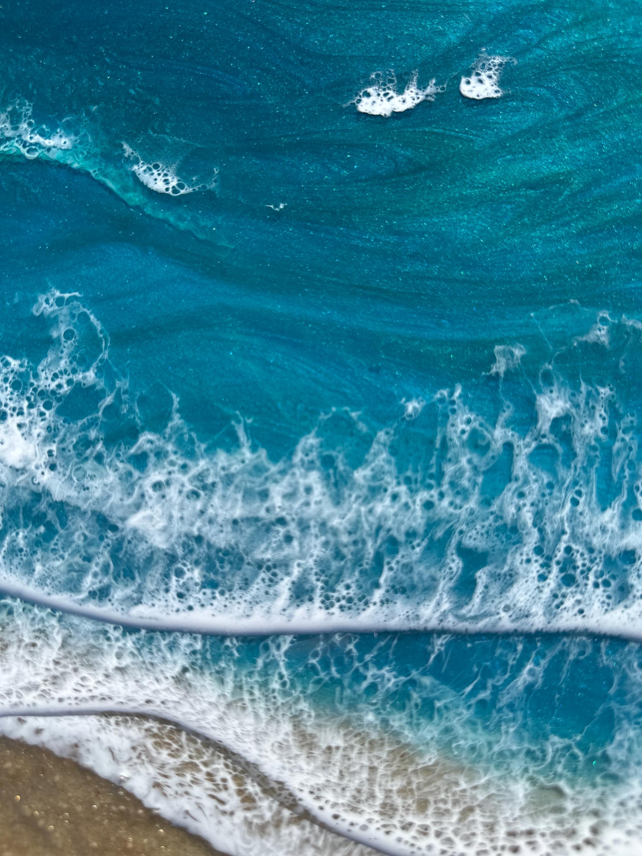 This particular ocean has various shades of emerald green, teal blue, and teal green throughout with white crisp waves crashing on the beach. The beach area is made from real tan sand mixed with a little glitter to add that sparkle and shine.