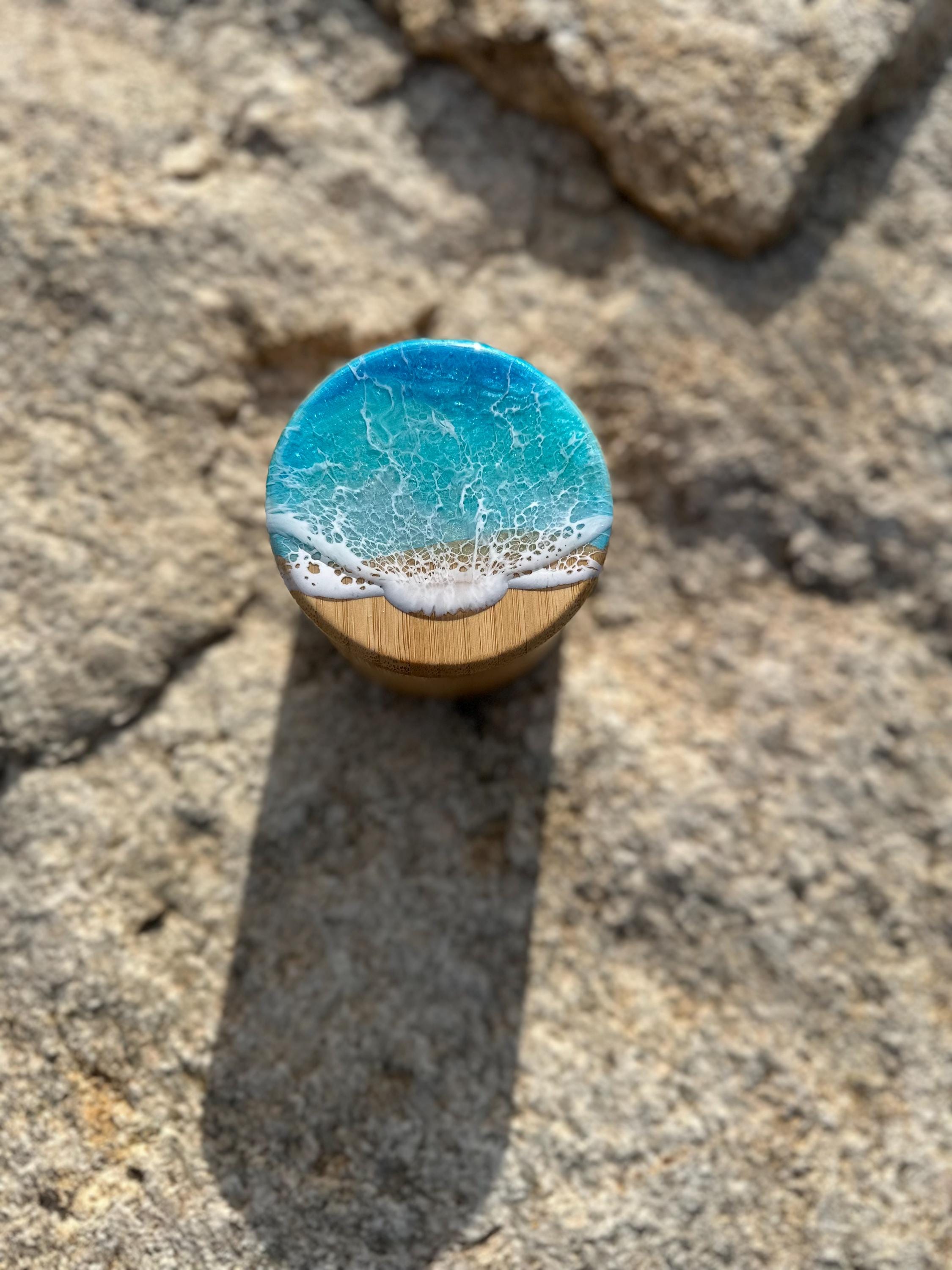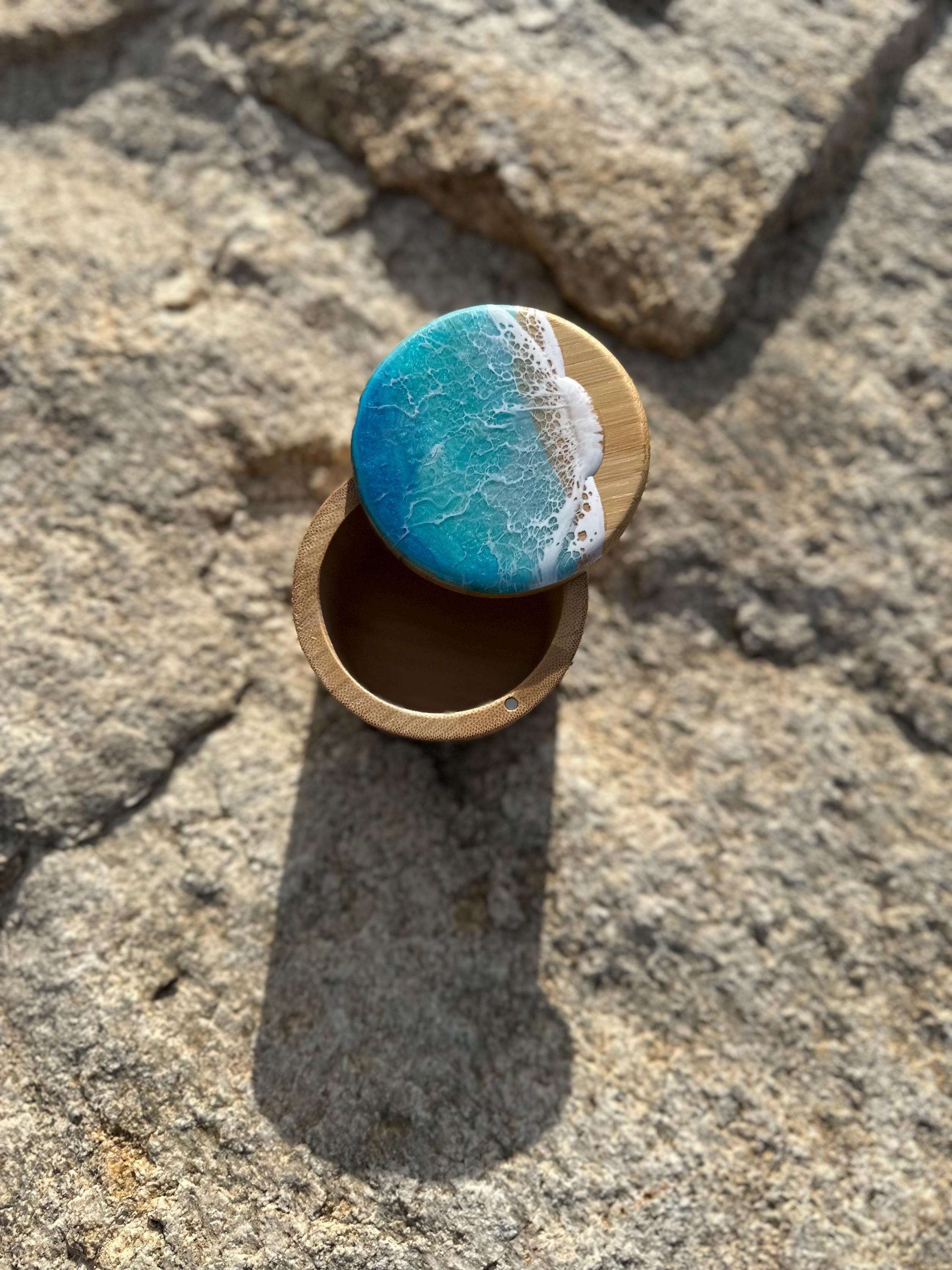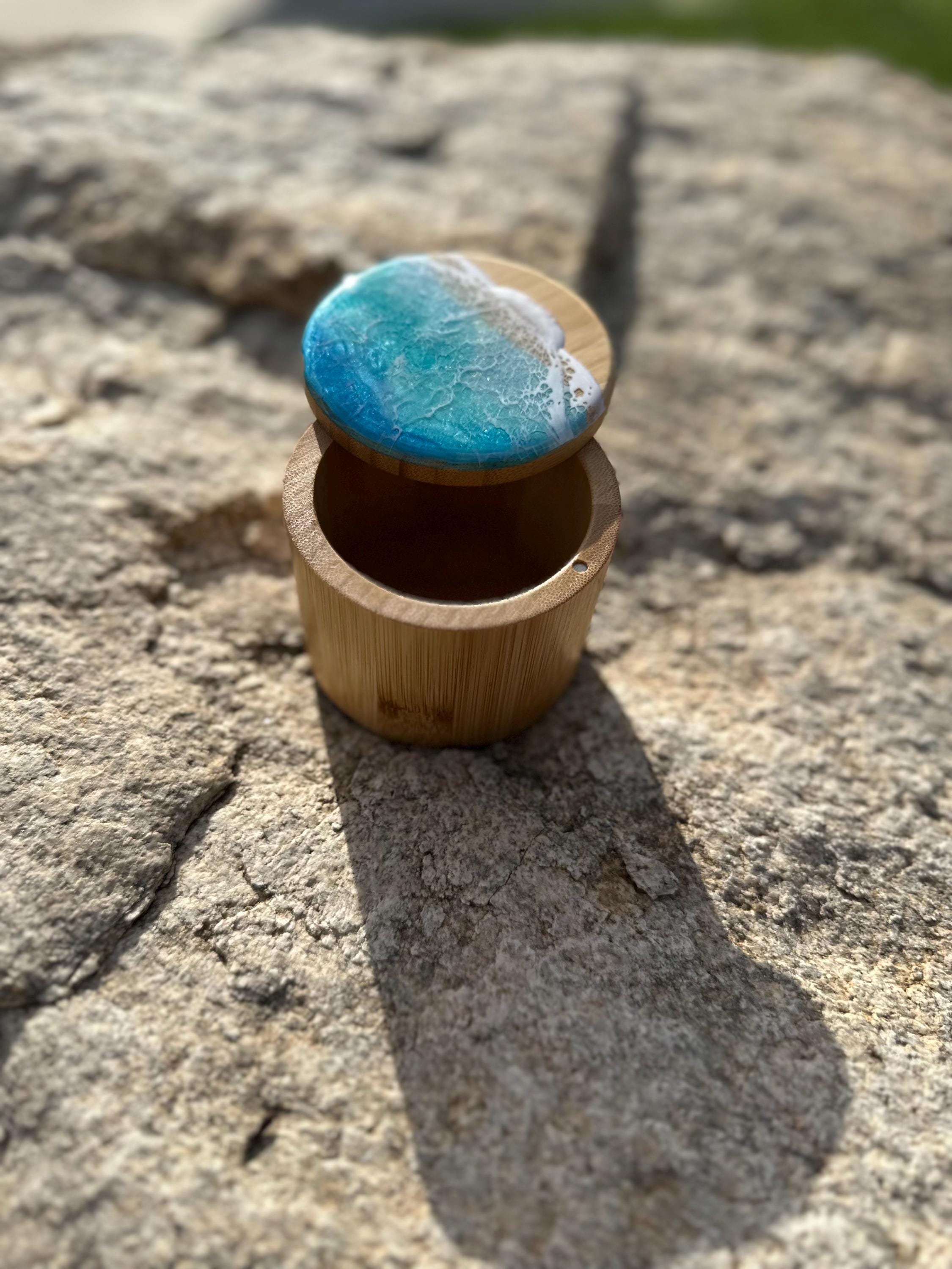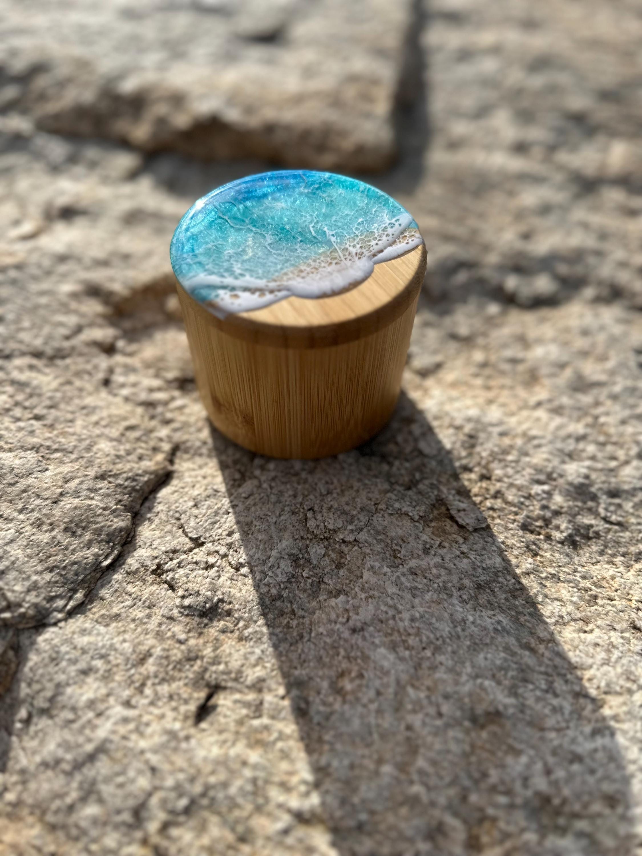 Bamboo wood canister/ box with ocean resin art poured on top.
