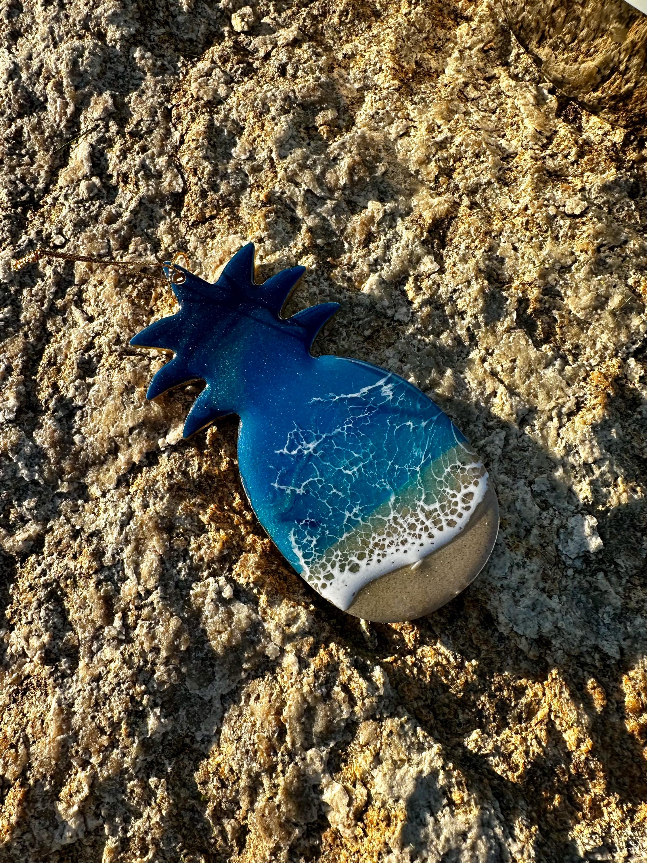 This is a wood cut out pineapple with layers of resin poured to create an ocean scene. This cut out is 5 by 2.5 in the shape of a pineapple. For the sand portion it is real sand. For the water it is different shades of blue from dark blue, mid blue, and teal blue throughout with white waves crashing on the sand.