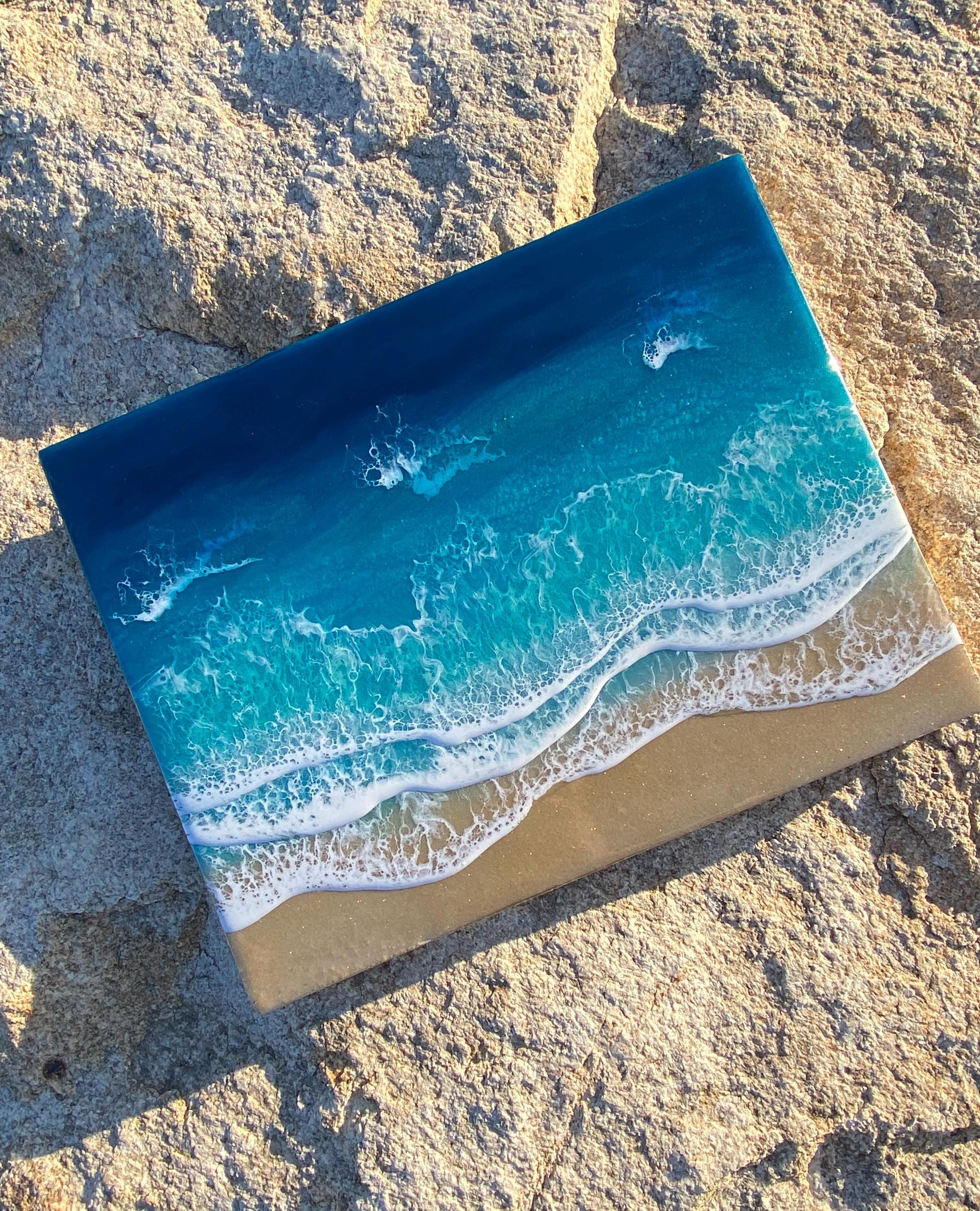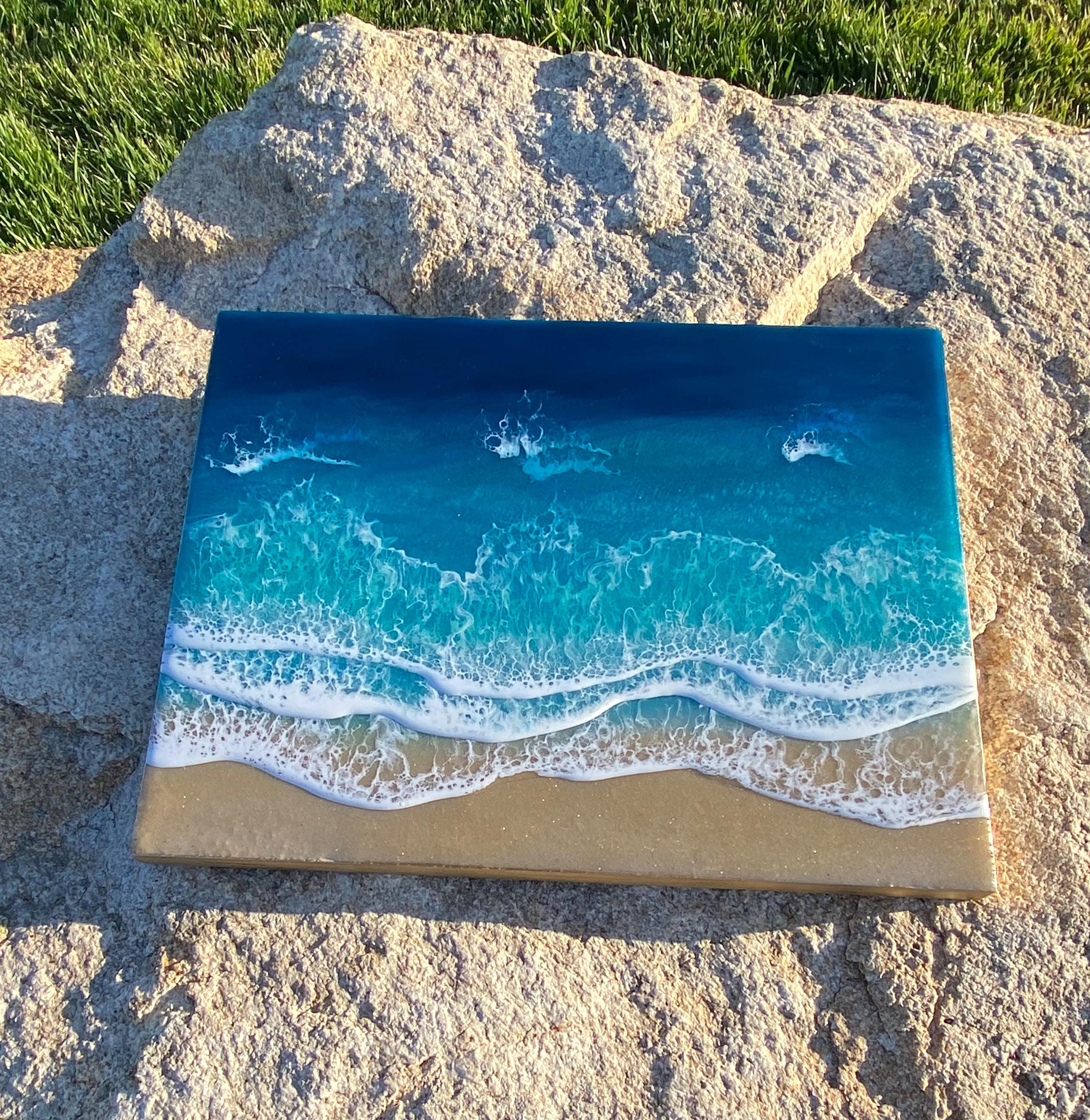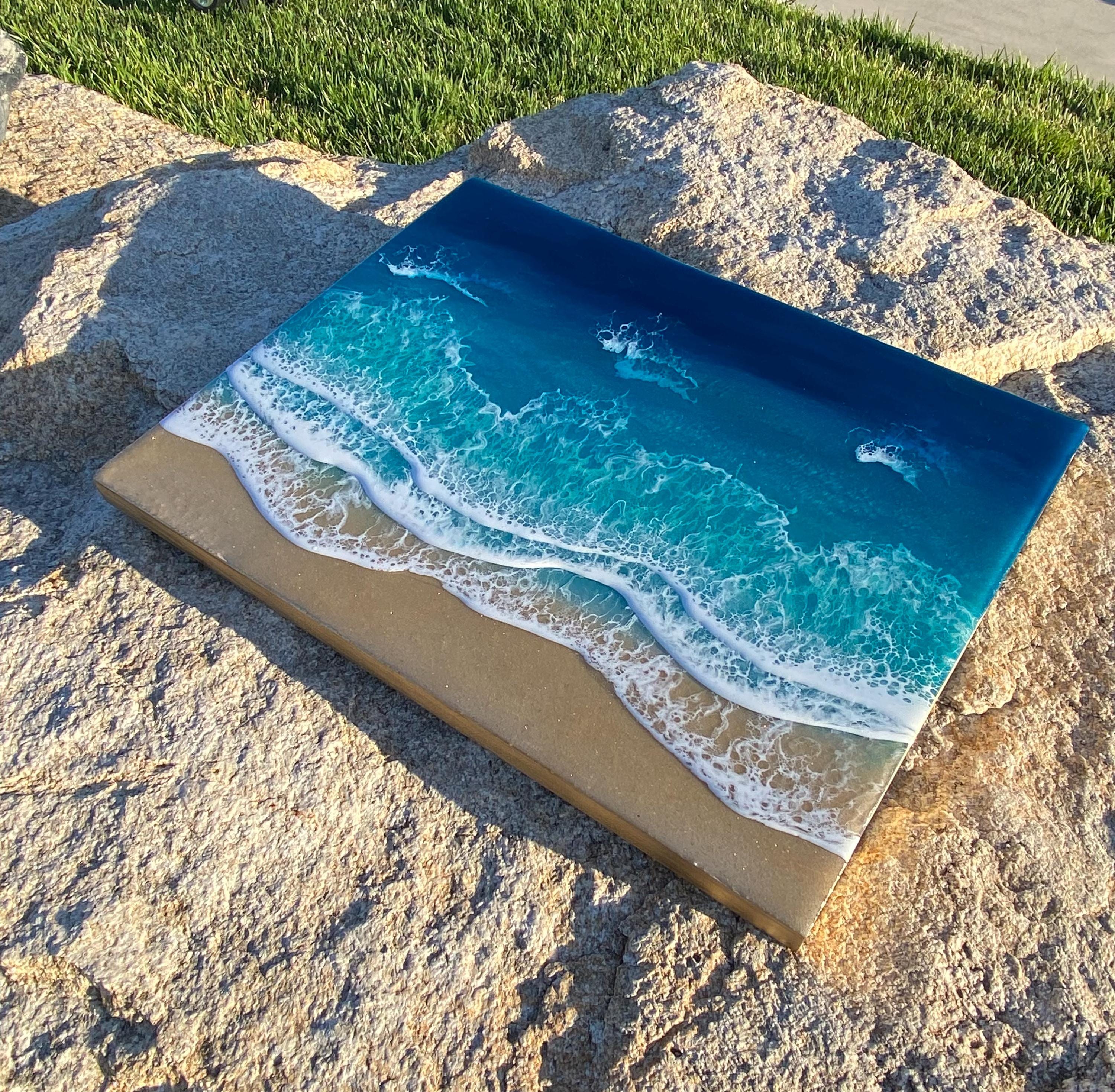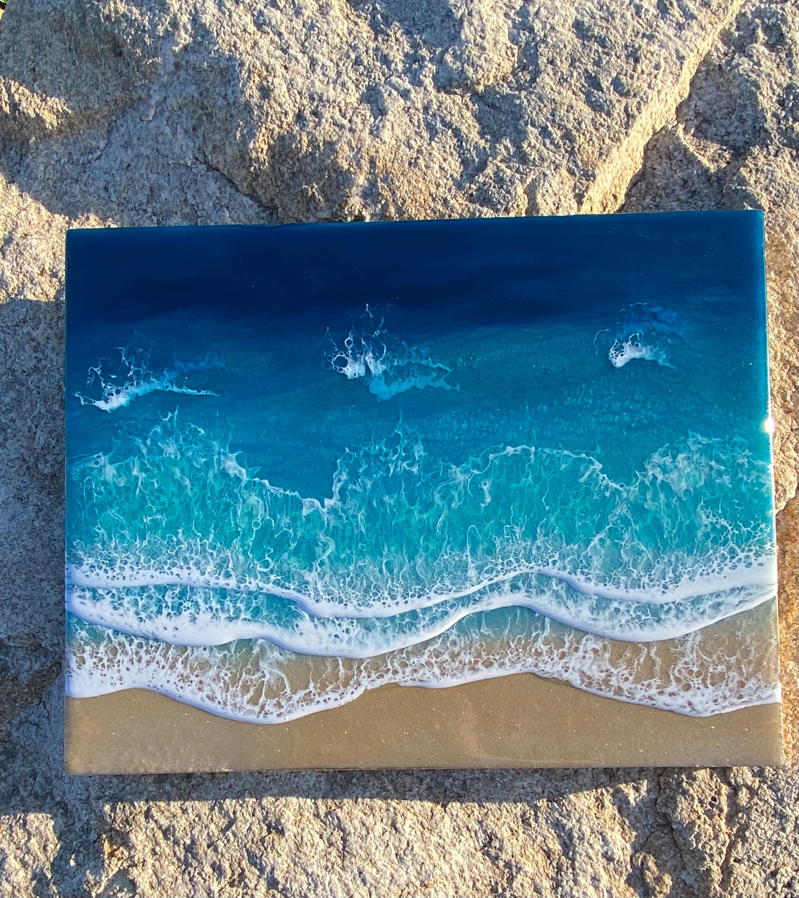 This is a wood cradleboard with a resin ocean scene on top. This is a 11x14 resin painting. The watercolor consists of deep turquoise blue, teal blues and greens You can see the sparkle and shine of the lifelike water. There are multiple waves crashing on the real tan sand beach. The depth on this piece and the layers of resin are so realistic and stunning. You can see the texture of the real sand beach in this piece.