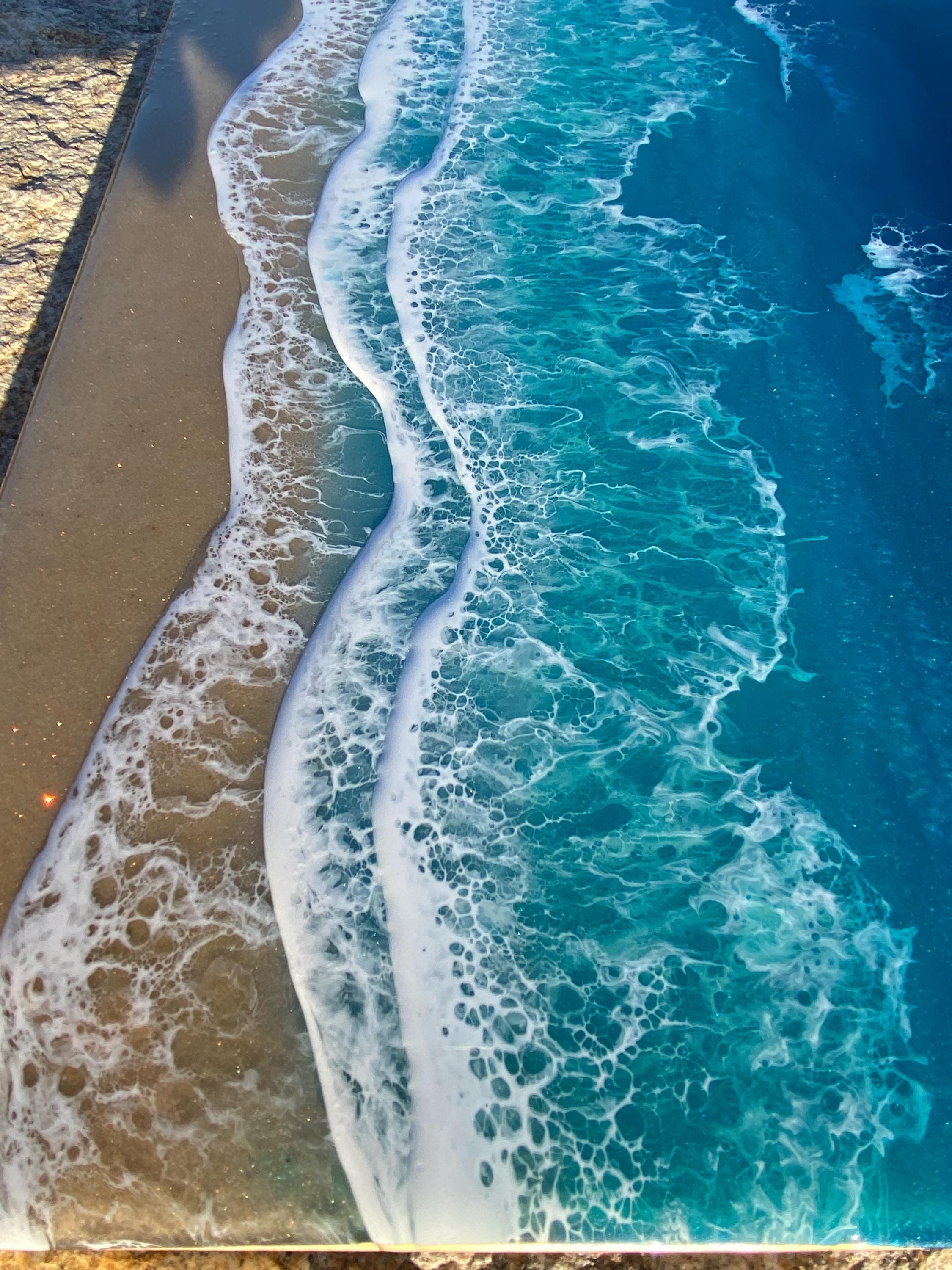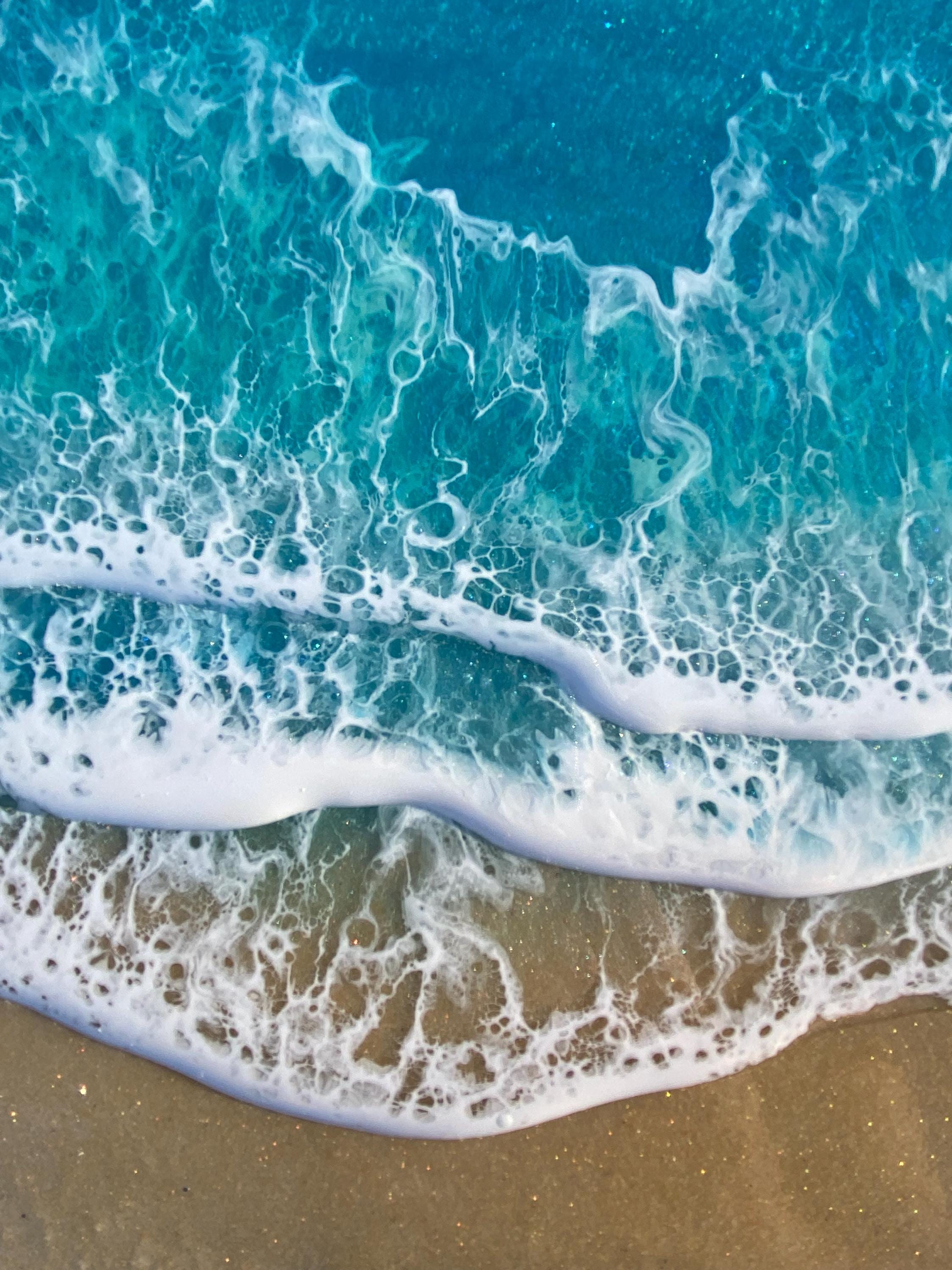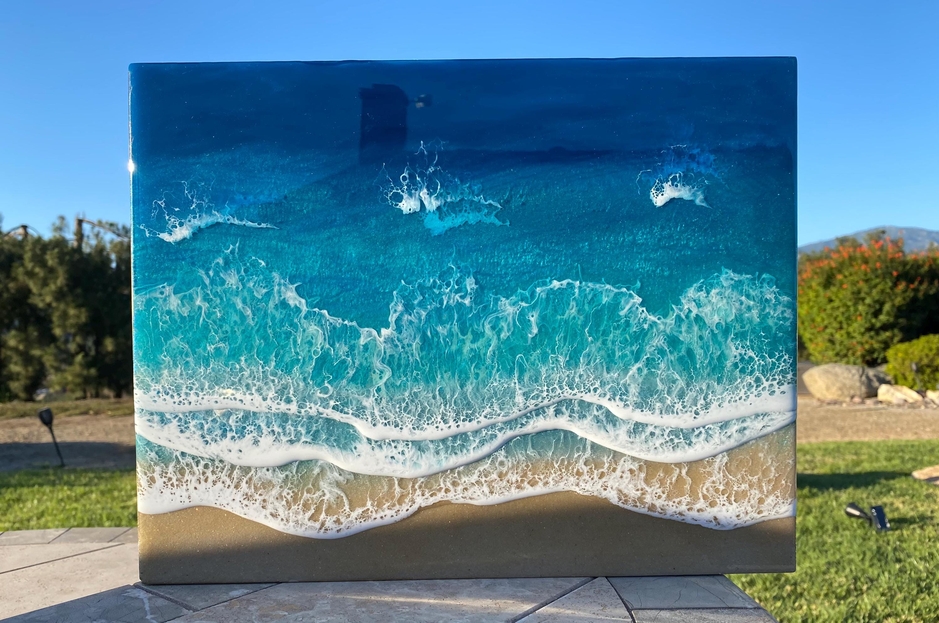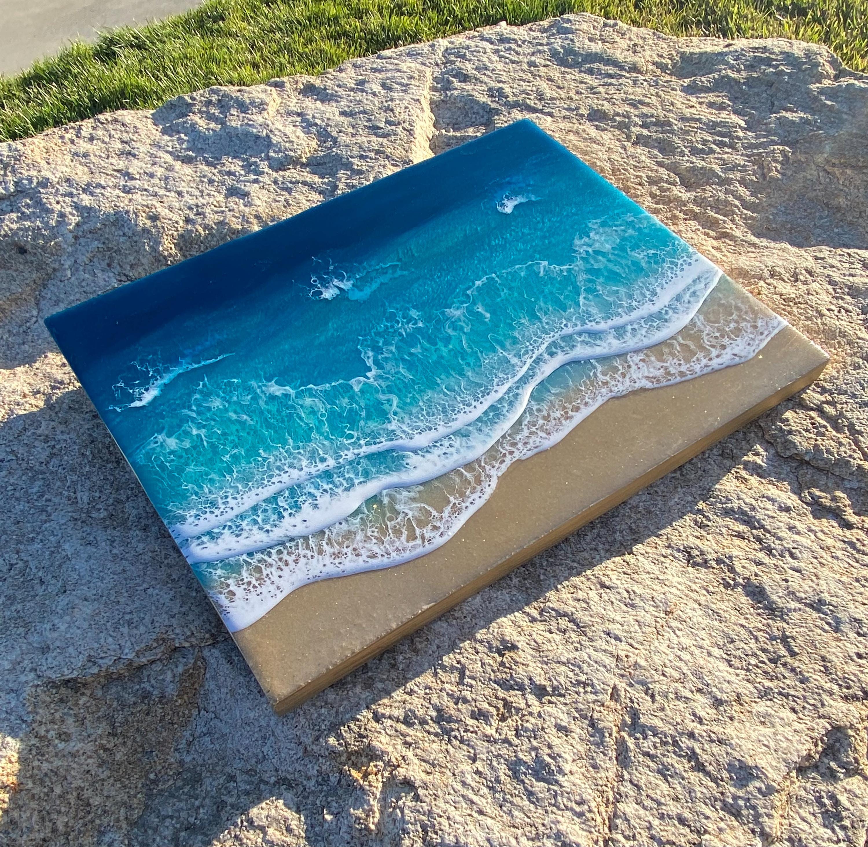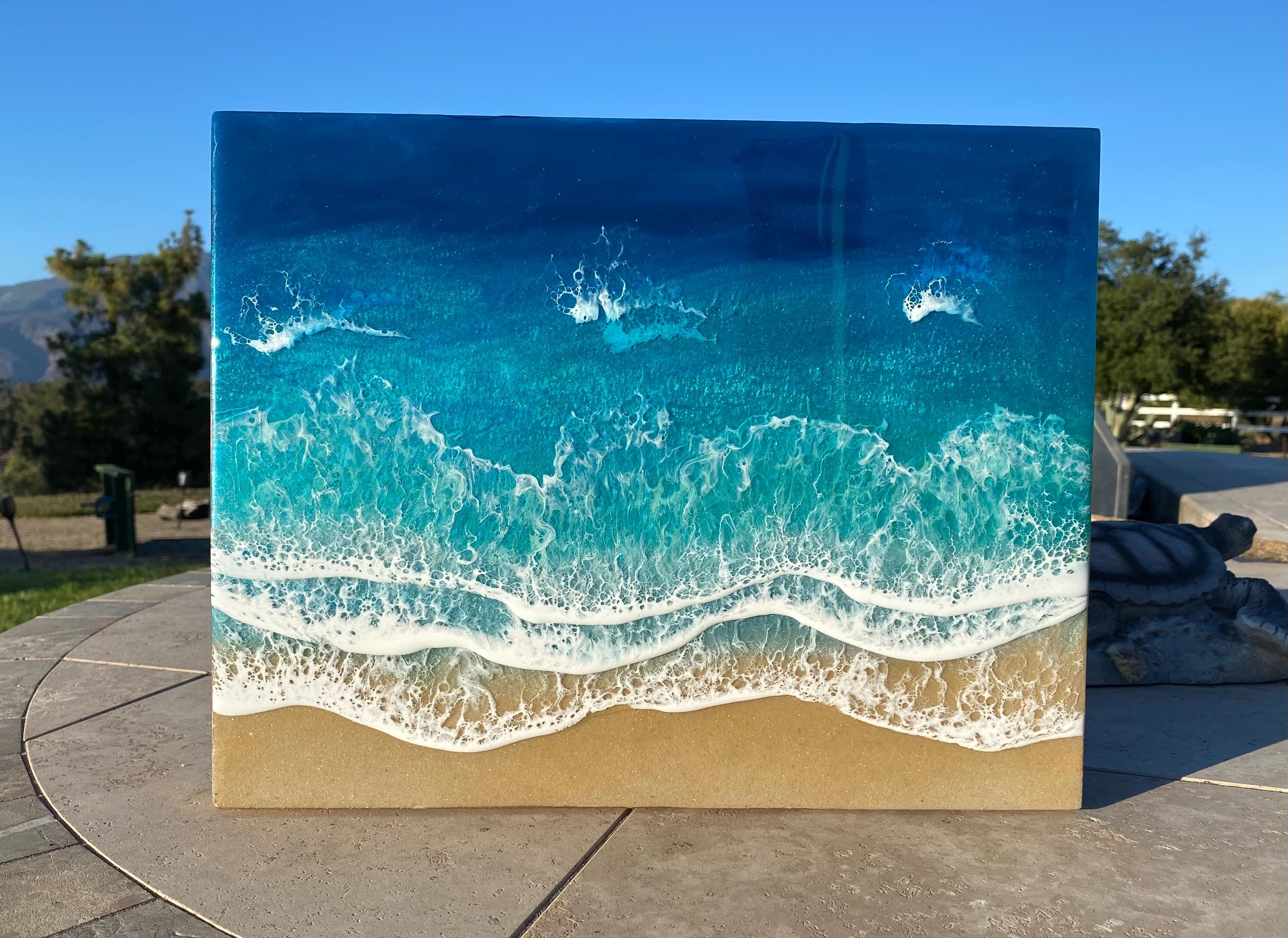 This is a wood cradleboard with a resin ocean scene on top. This is a 11x14 resin painting. The watercolor consists of deep turquoise blue, teal blues and greens You can see the sparkle and shine of the lifelike water. There are multiple waves crashing on the real tan sand beach. The depth on this piece and the layers of resin are so realistic and stunning. You can see the texture of the real sand beach in this piece.