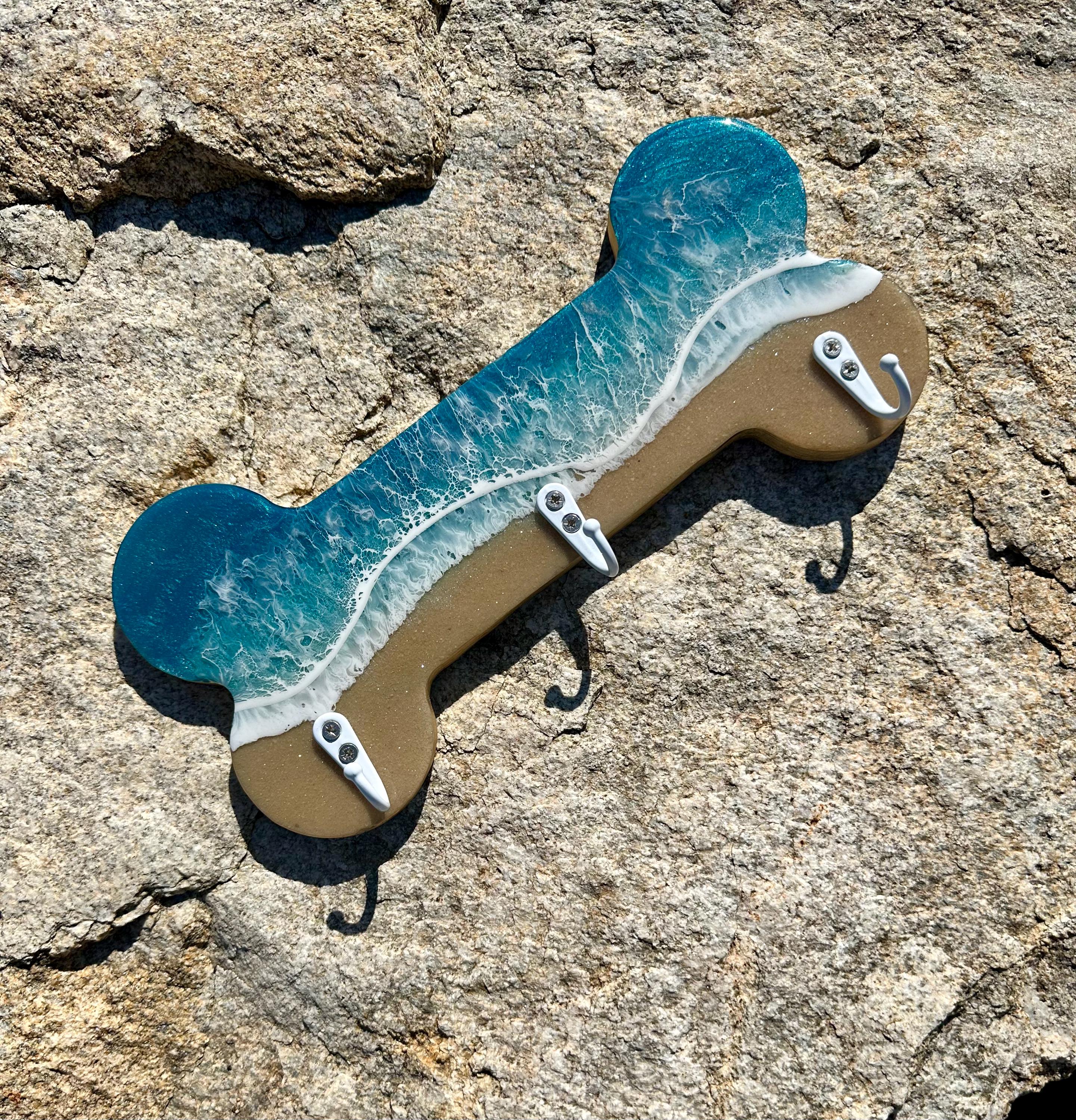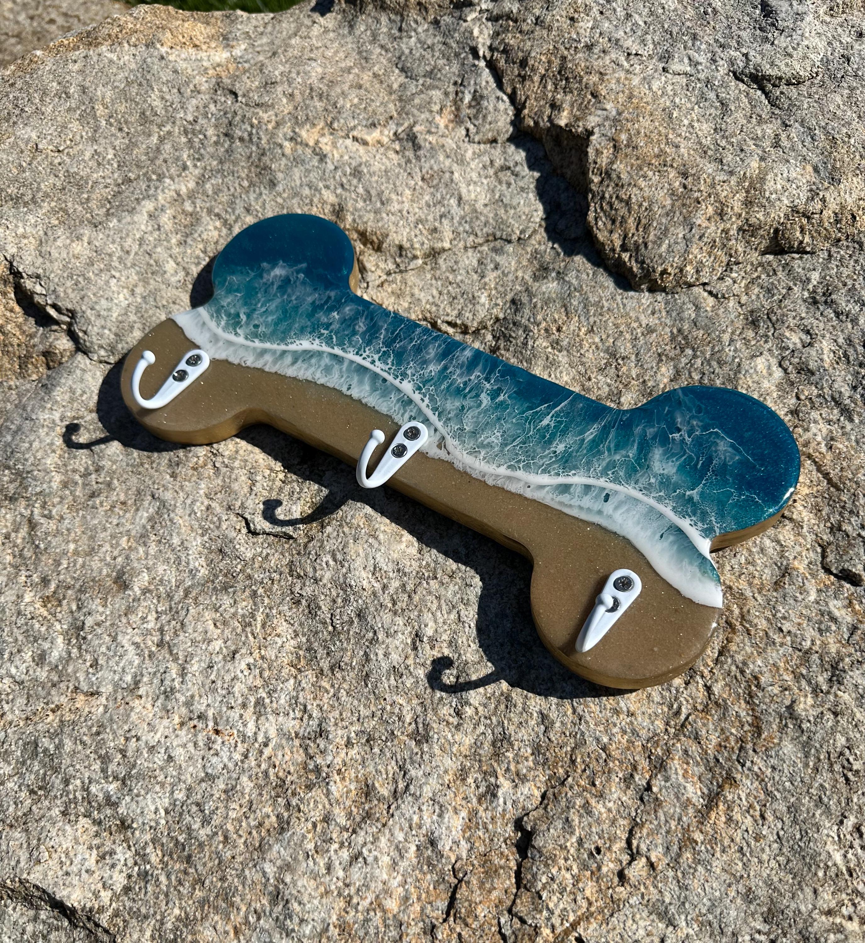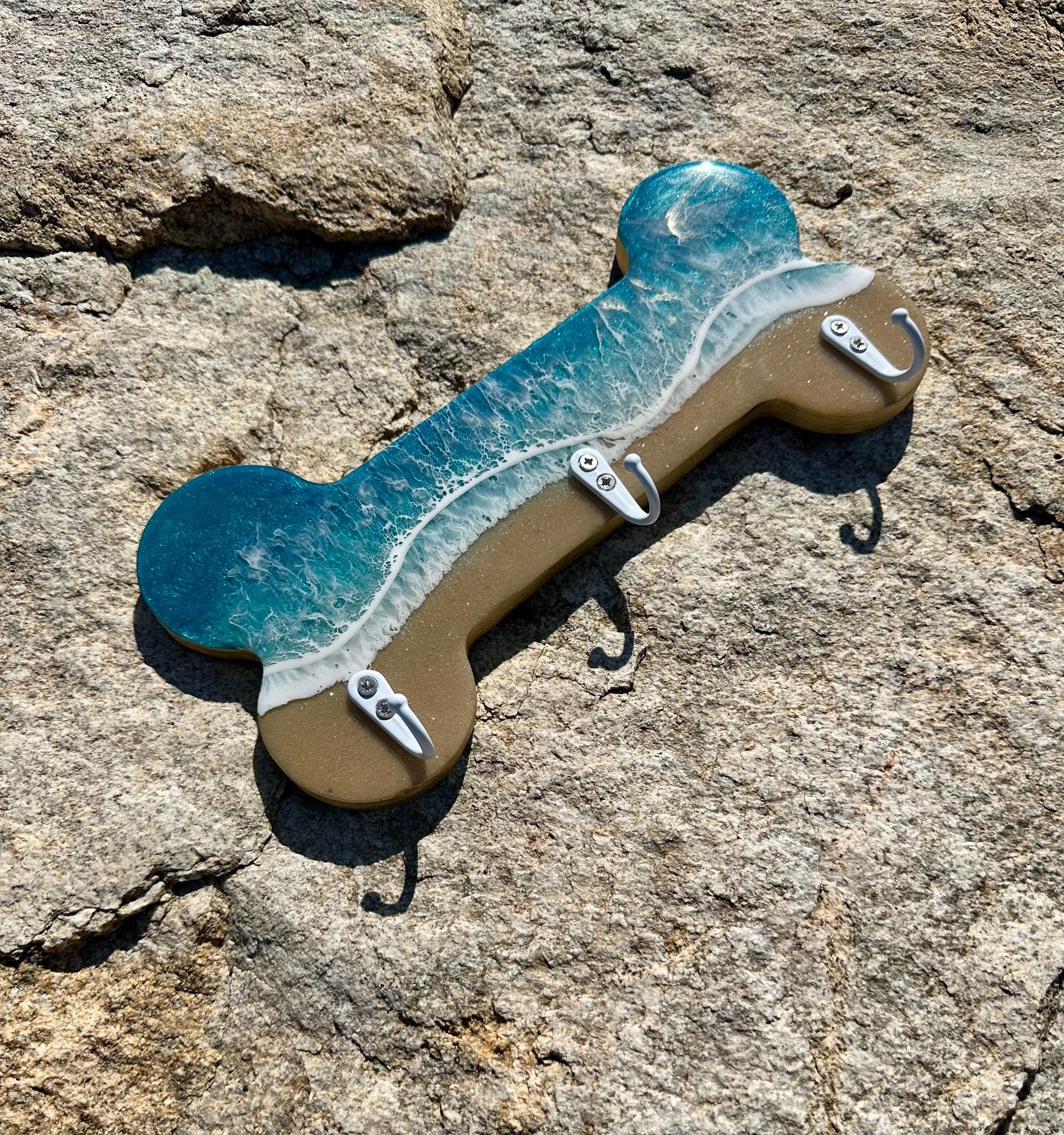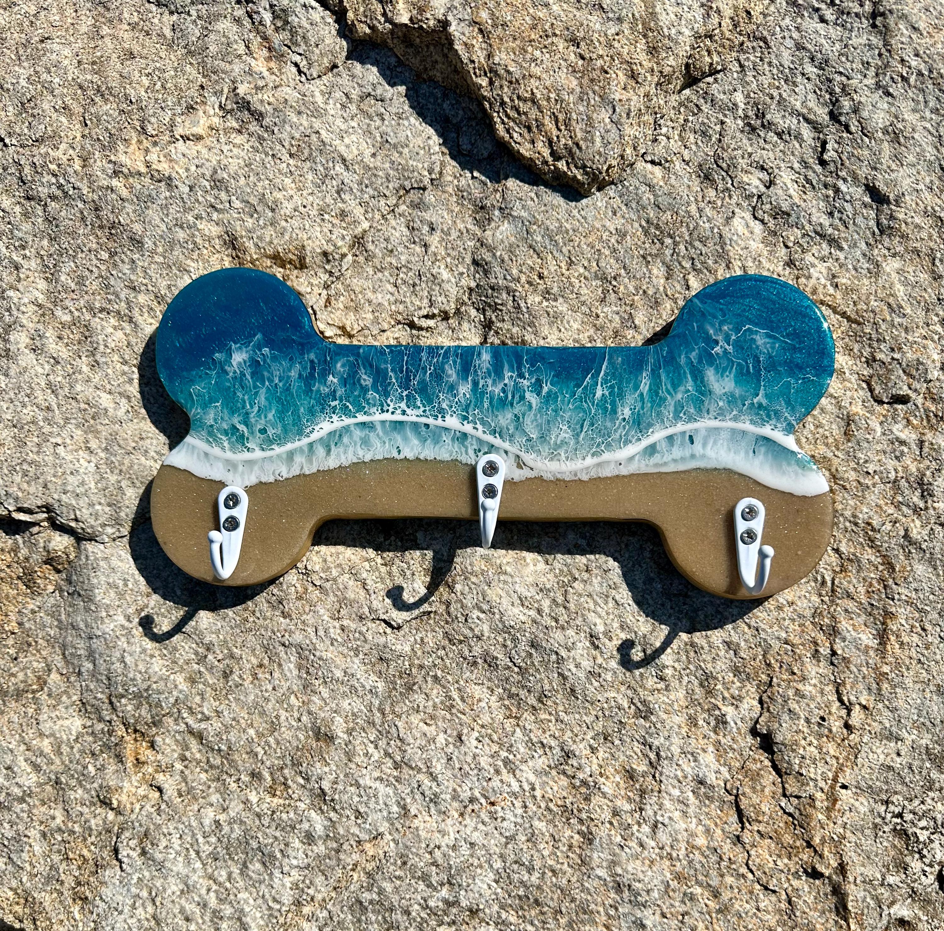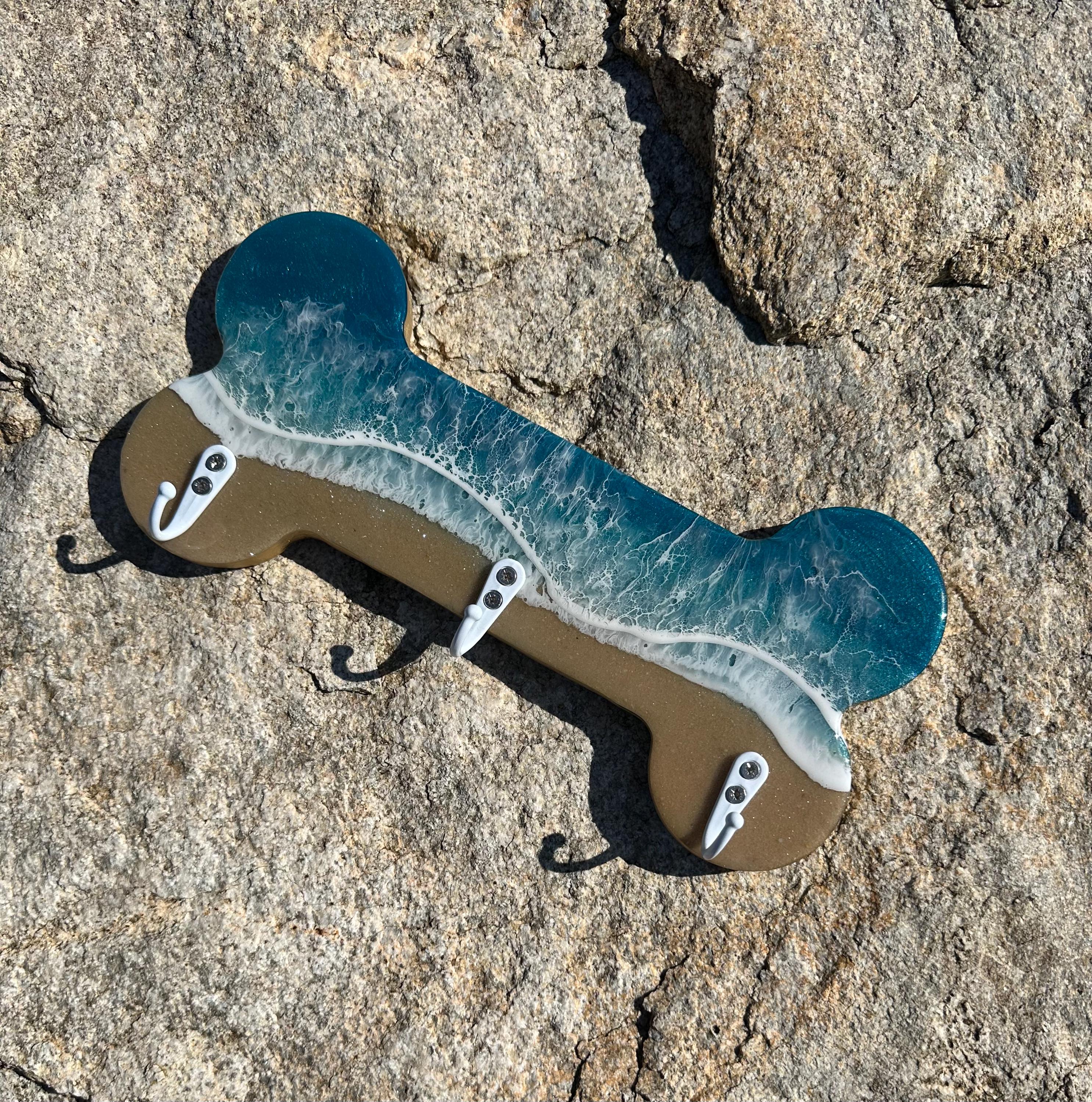 This is an ocean resin art piece shaped as a dog bone with hangers attached for you to hang your dog leashes from. You can use a dog leash holder or to simply hang your keys from.