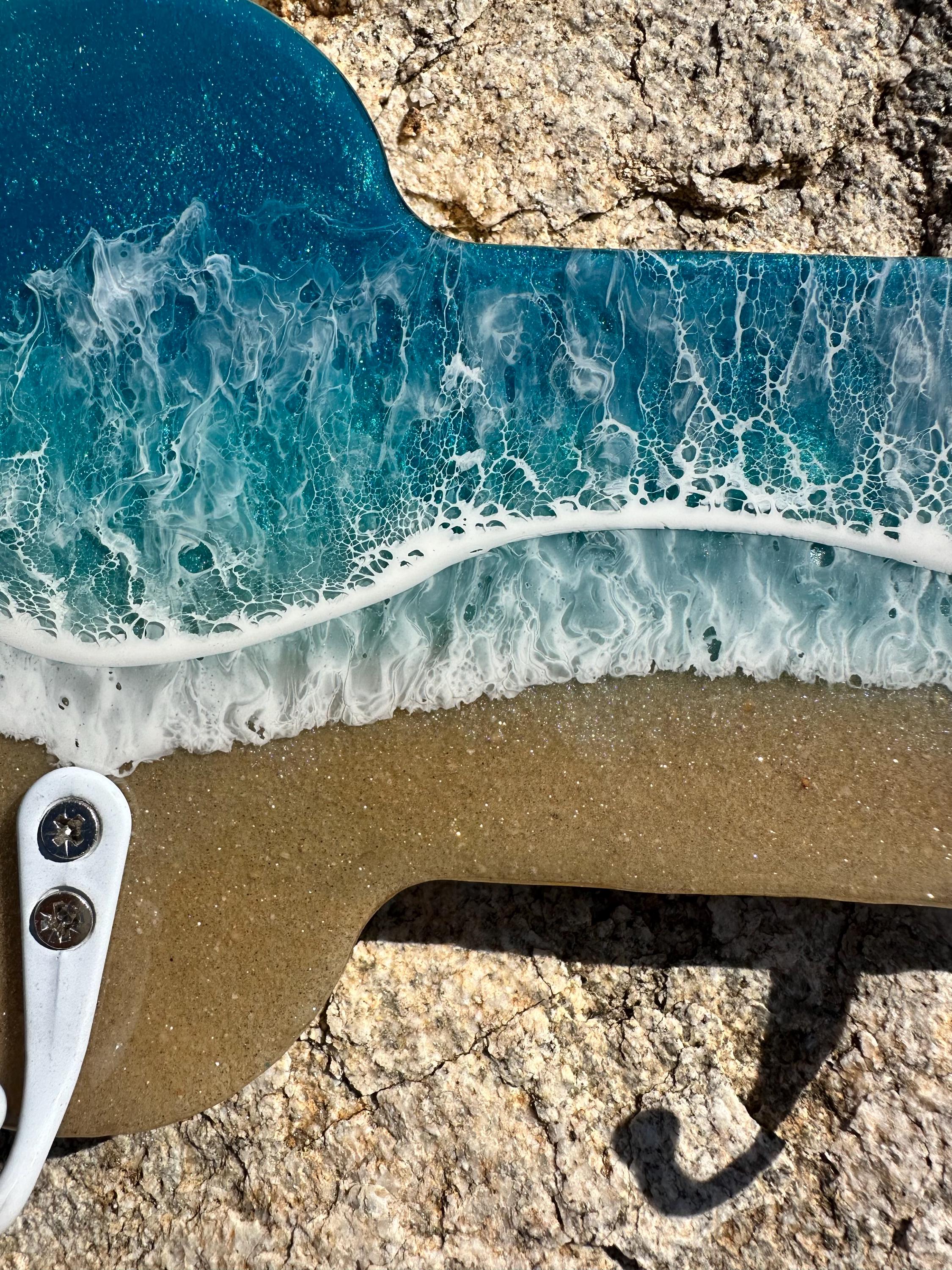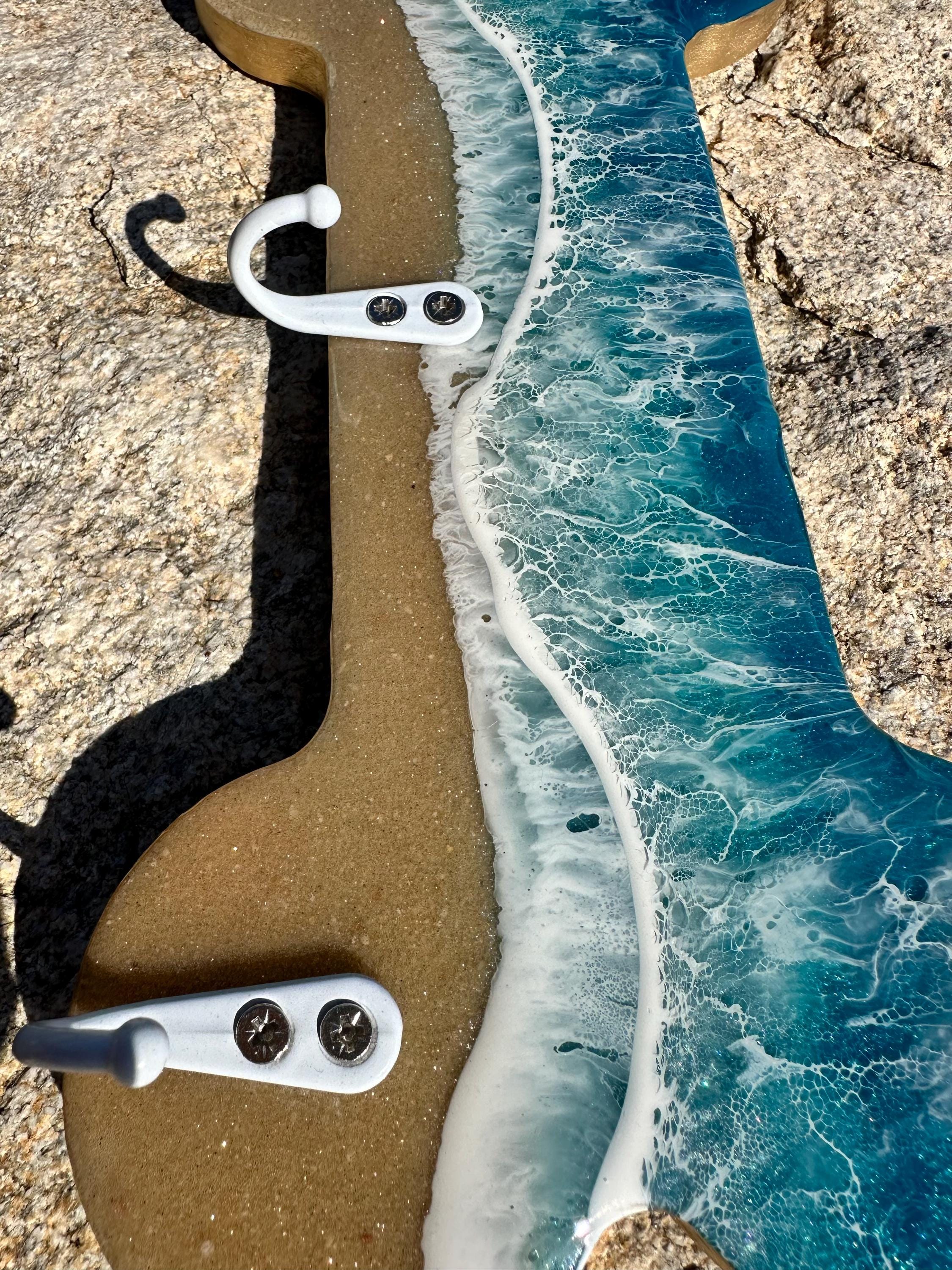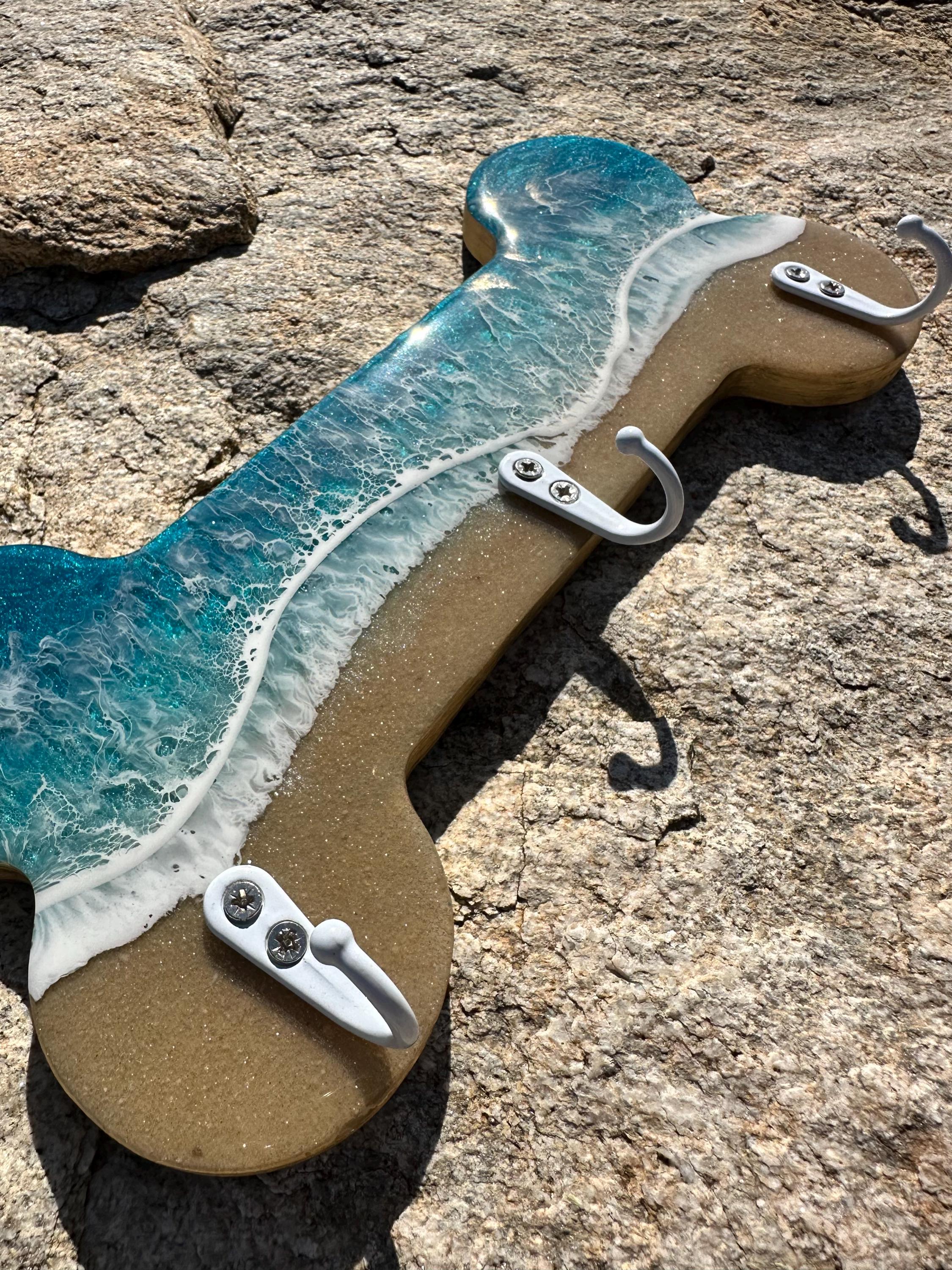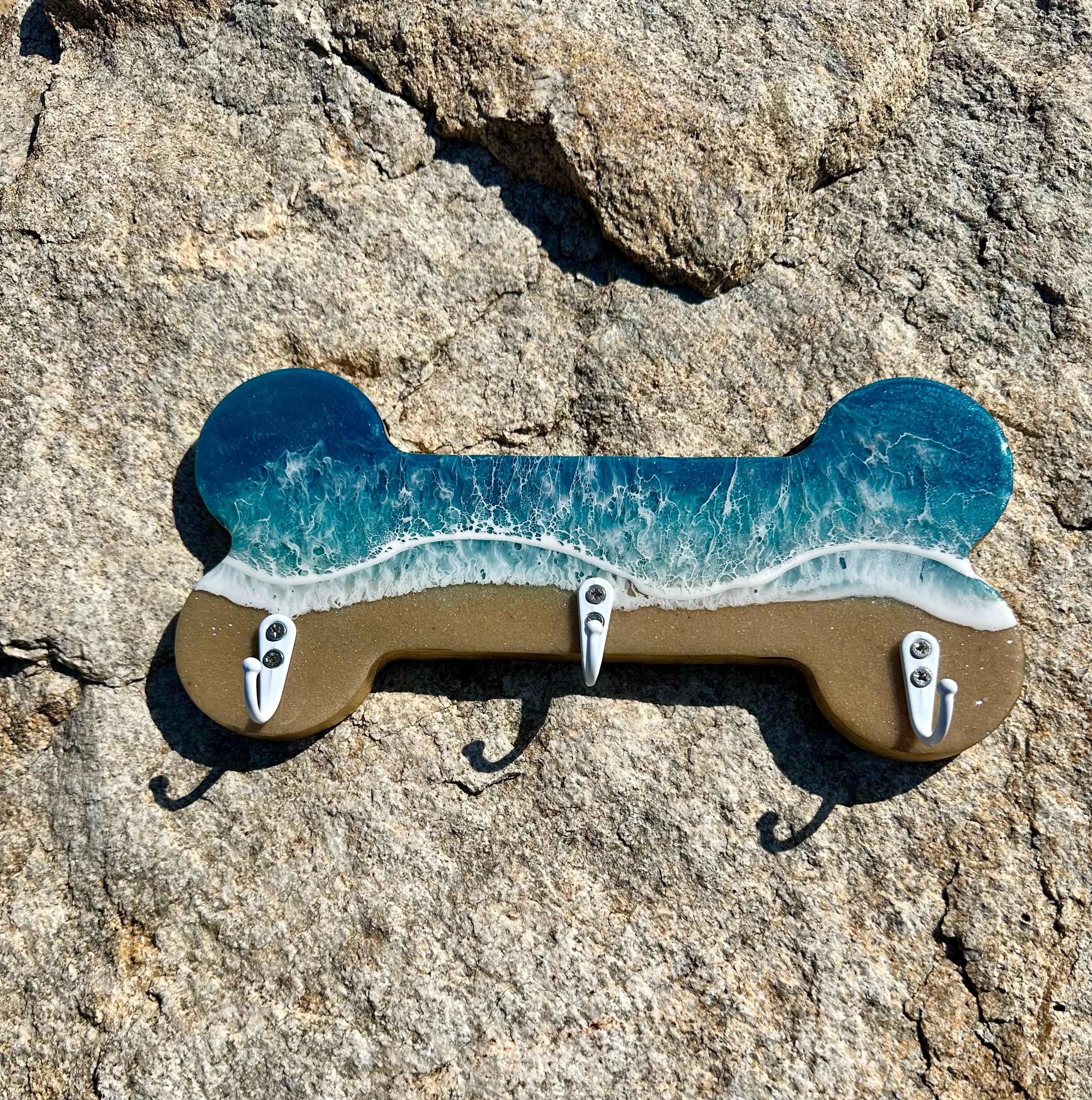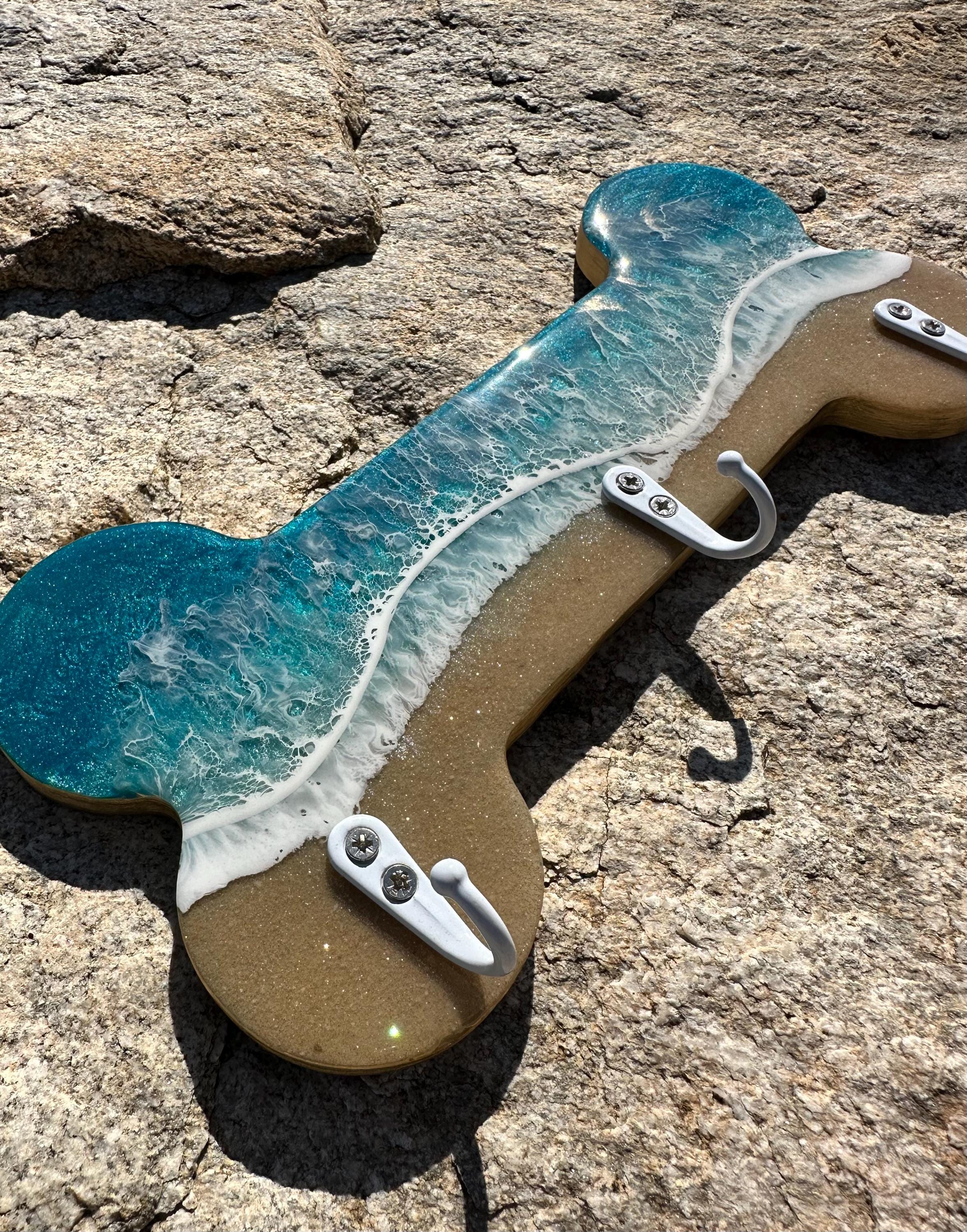 This is an ocean resin art piece shaped as a dog bone with hangers attached for you to hang your dog leashes from. You can use a dog leash holder or to simply hang your keys from.