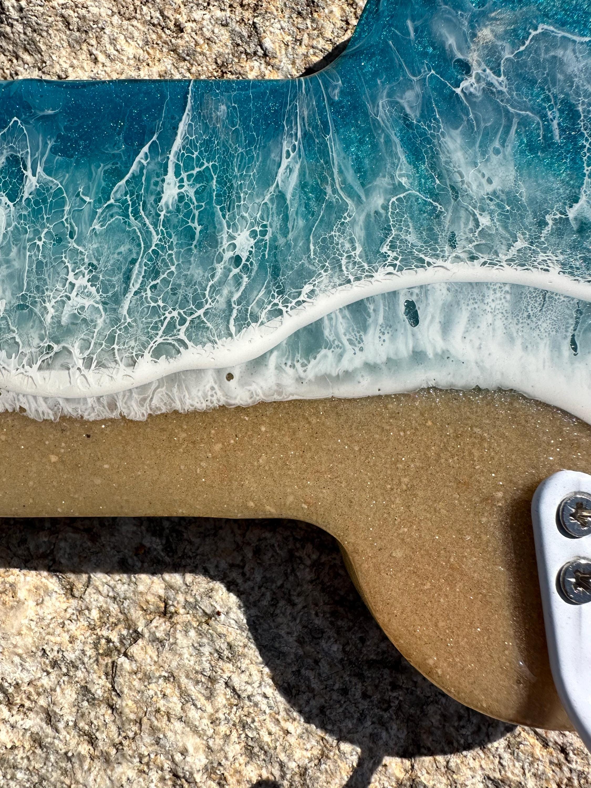 The colors of this ocean are teal blue and light blue with white crisp waves crashing on the real tan sand beach. The beach area has little hints of glitter to show that real sparkle in sand.