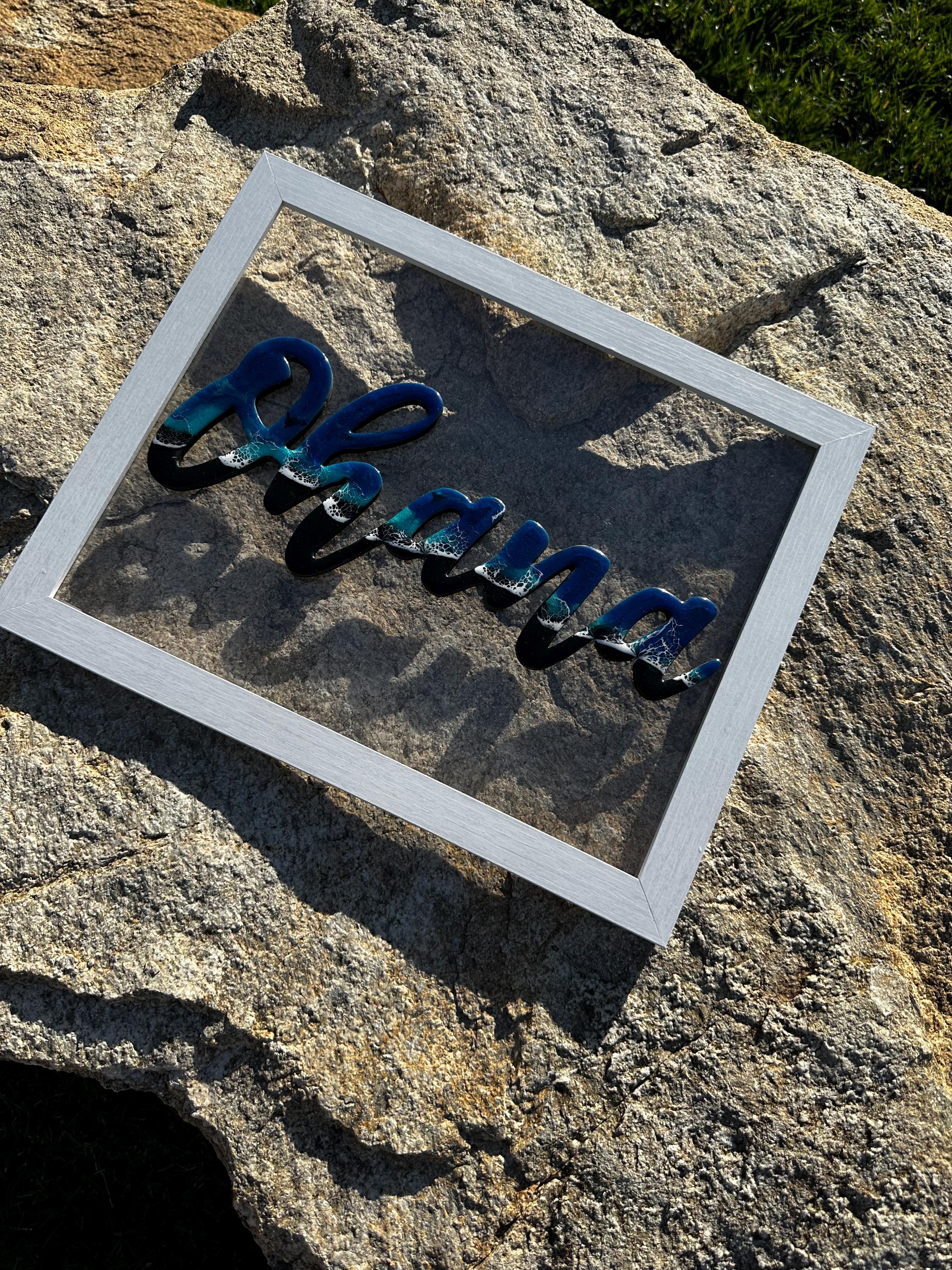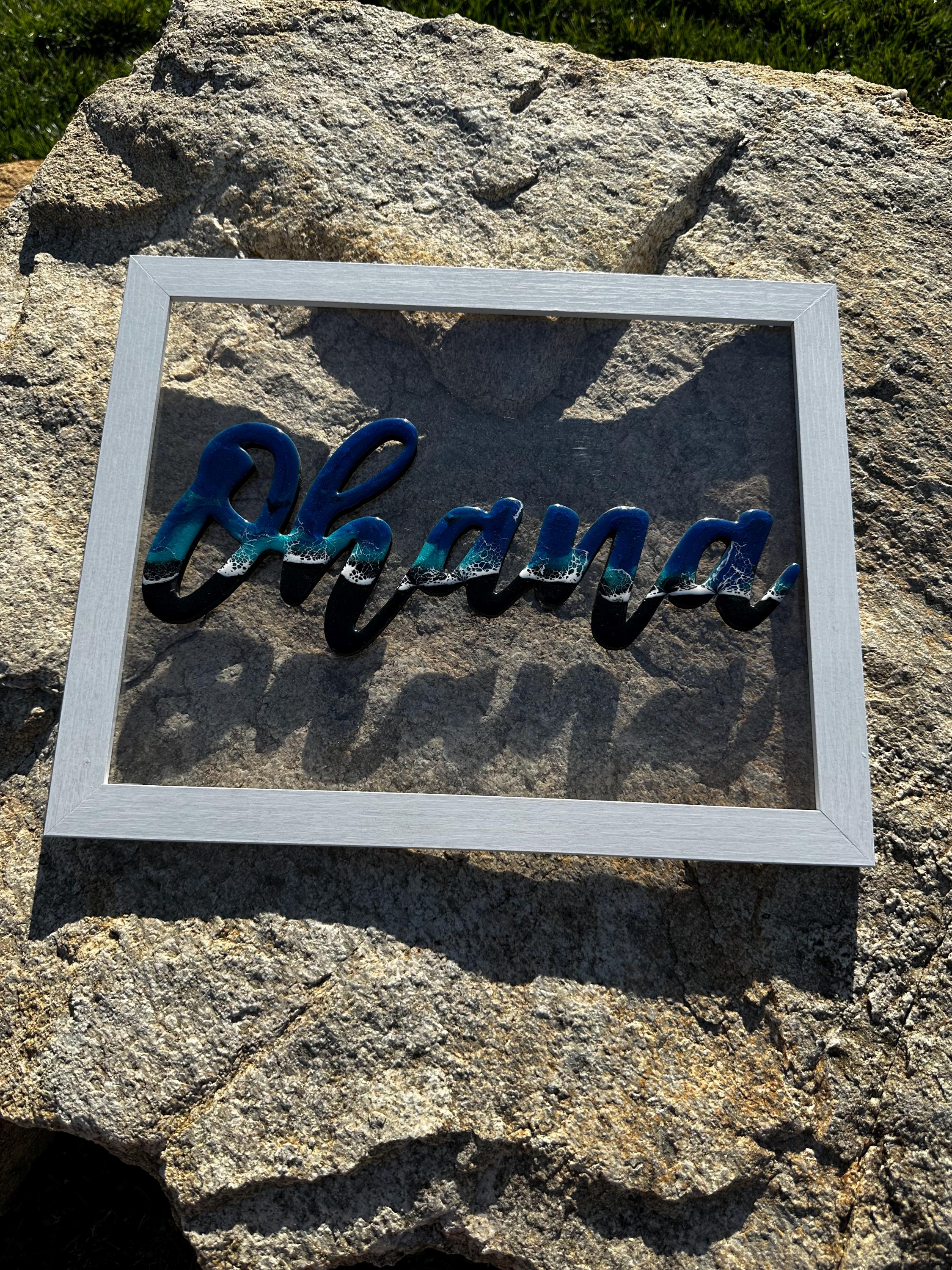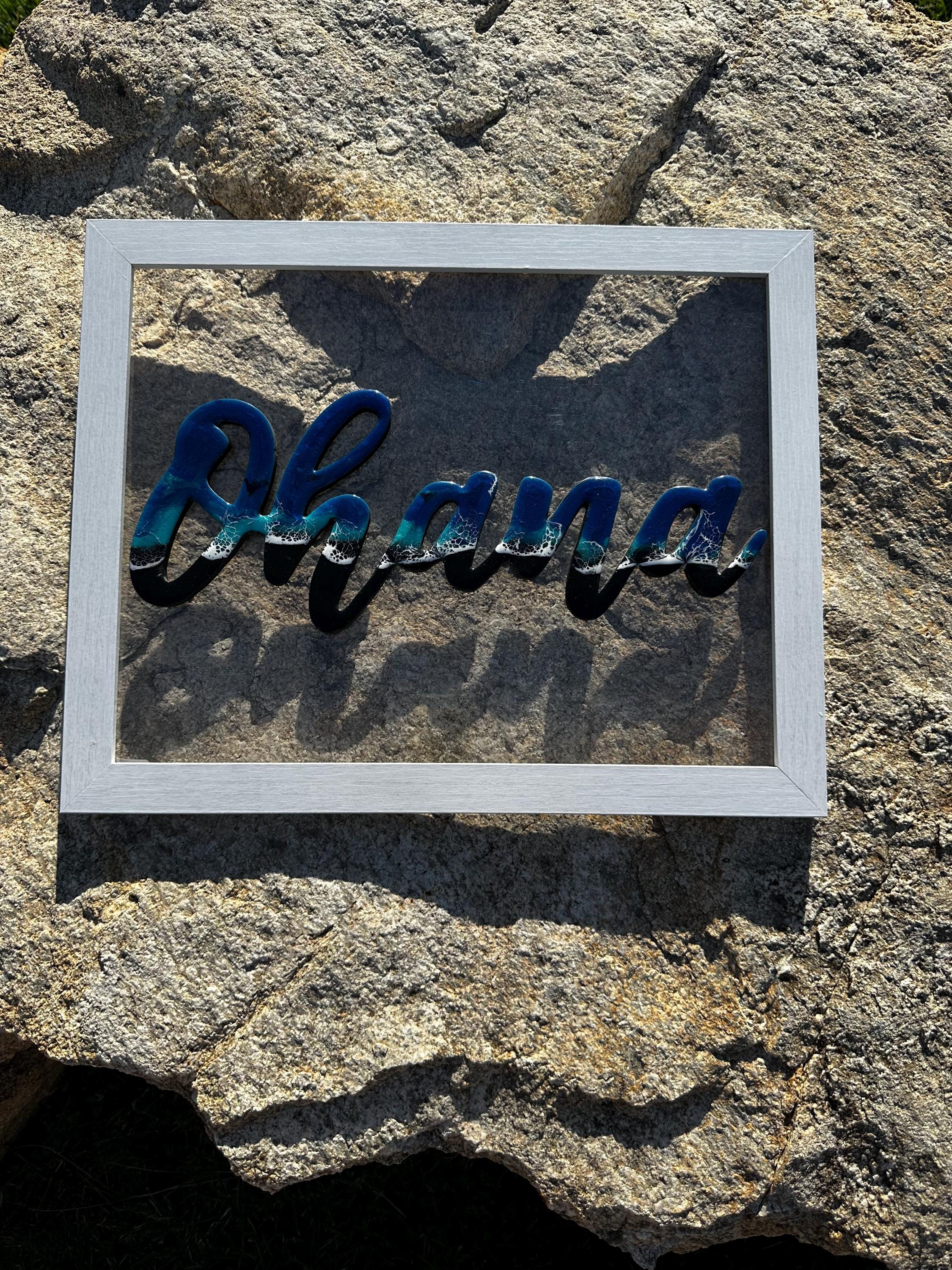 The meaning of Ohana is family. What could be more important. This is a beautiful reminder or our family while bringing a piece of the ocean into your heart. This is a wood cutout of the words Ohana which has been done as an ocean resin art piece mounted on a white 11×14 frame.