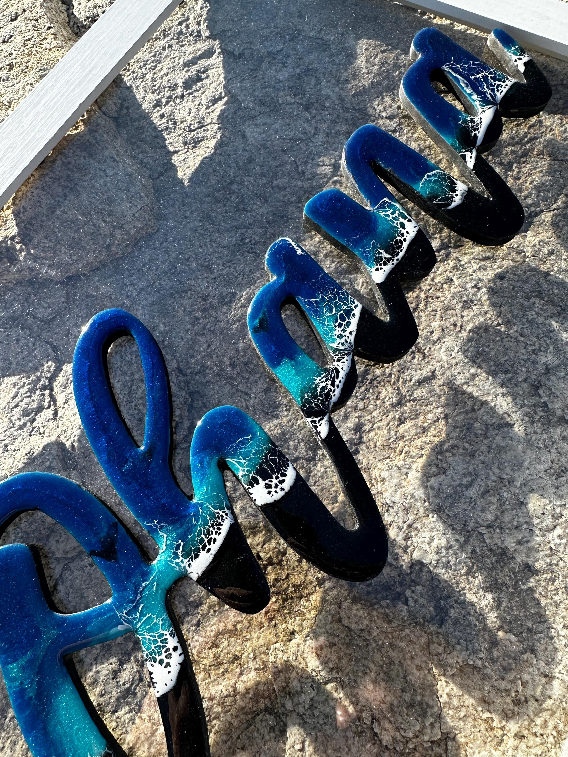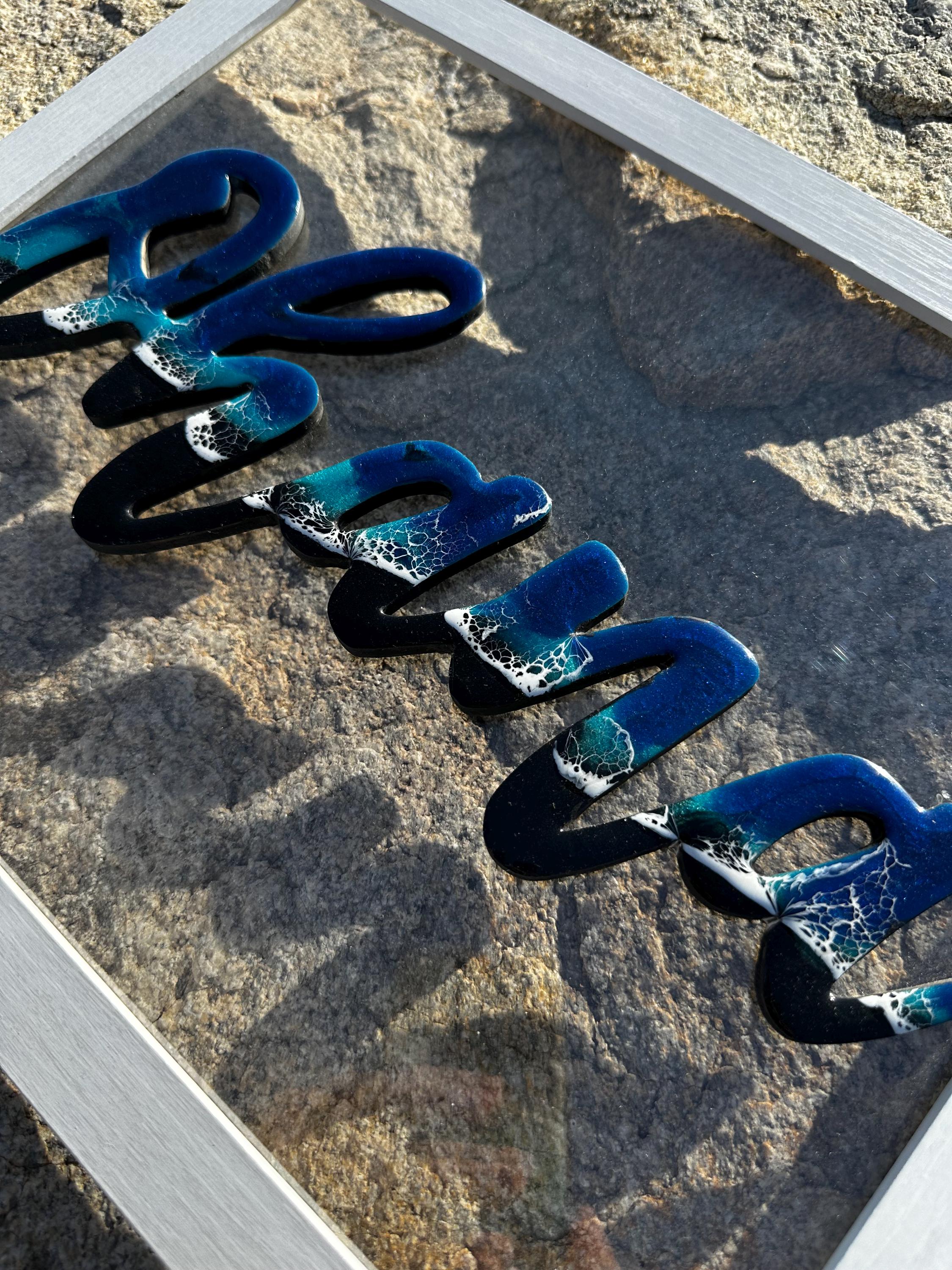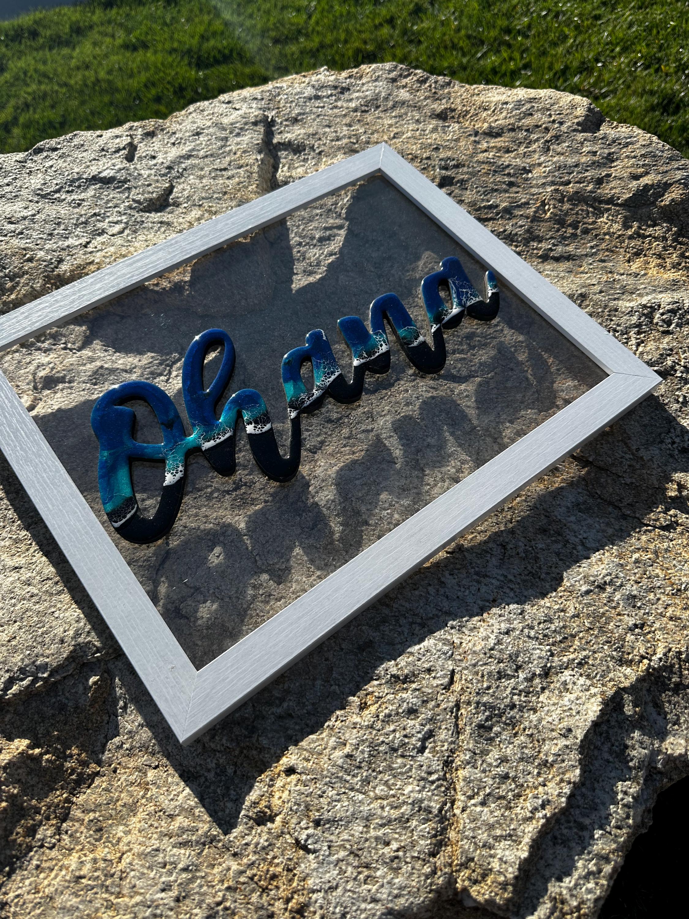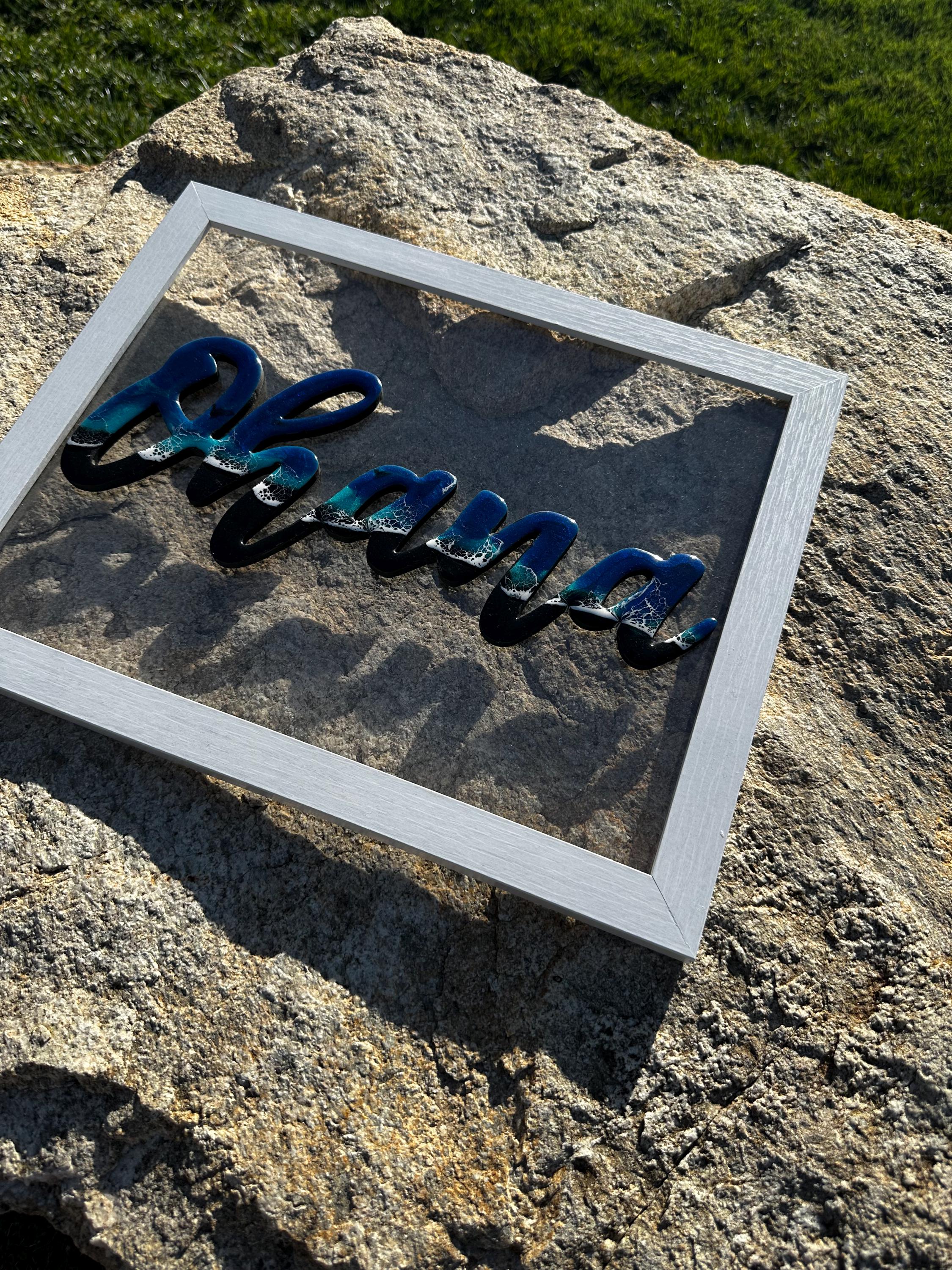 The meaning of Ohana is family. What could be more important. This is a beautiful reminder or our family while bringing a piece of the ocean into your heart. This is a wood cutout of the words Ohana which has been done as an ocean resin art piece mounted on a white 11×14 frame.