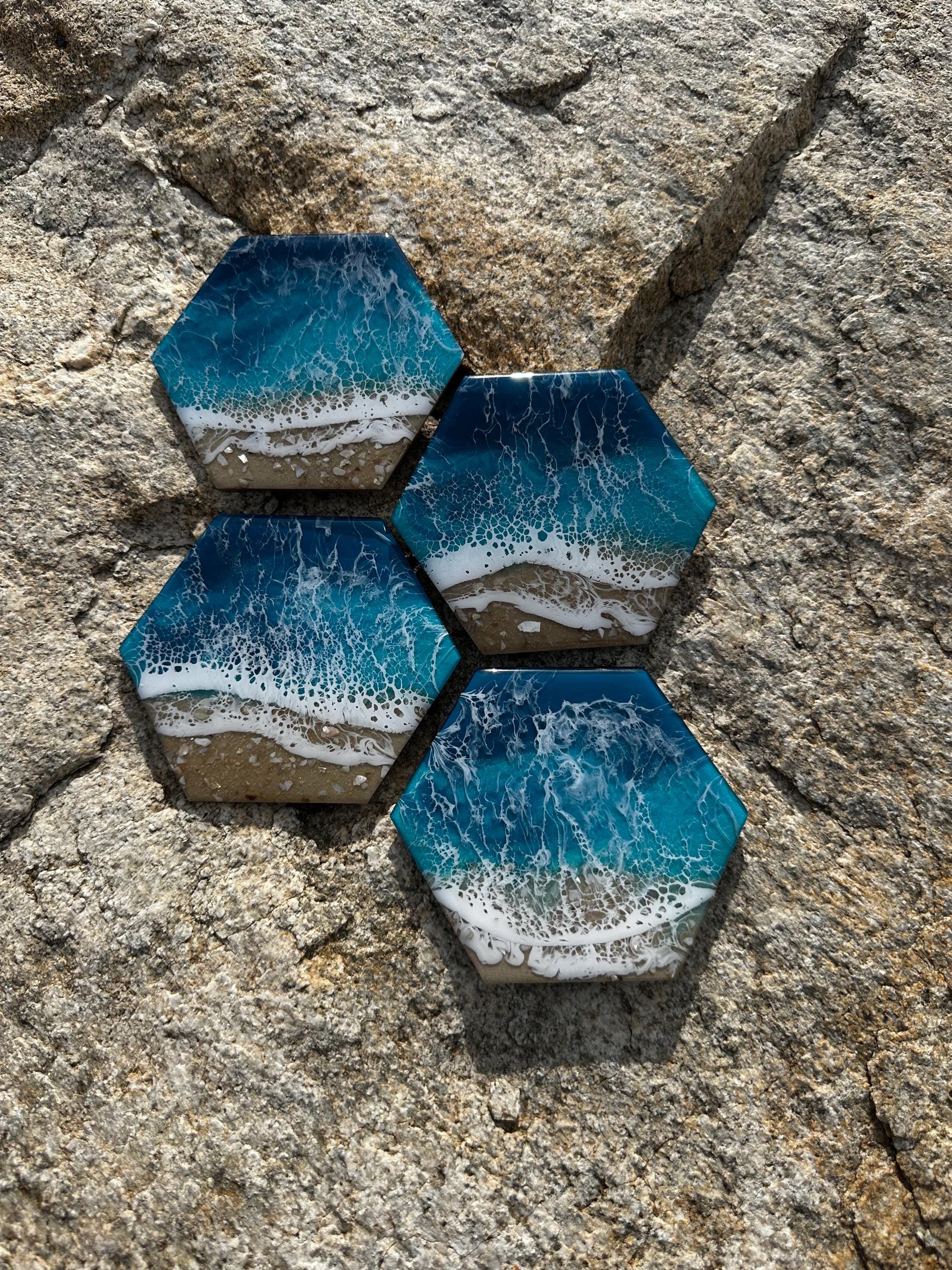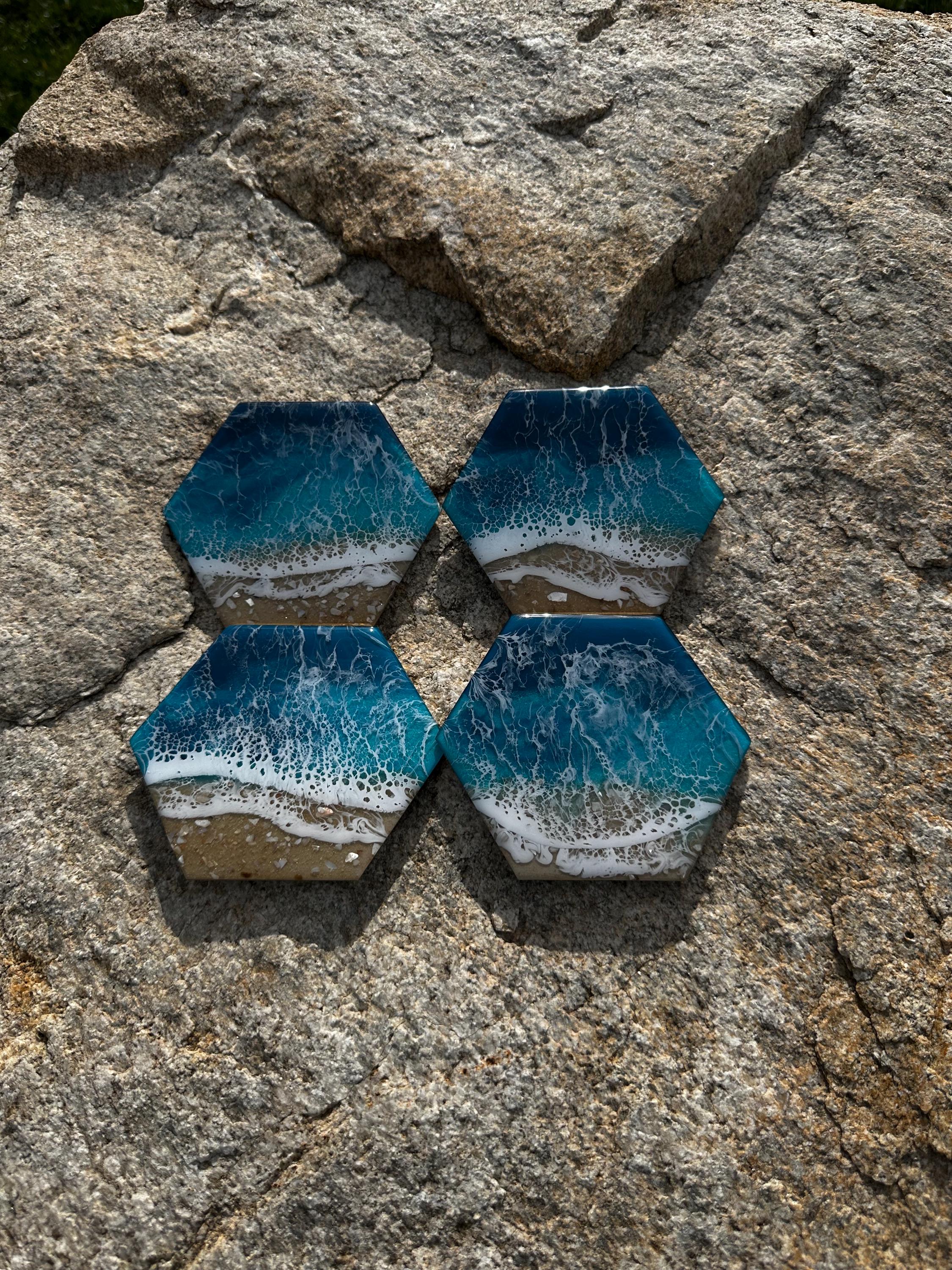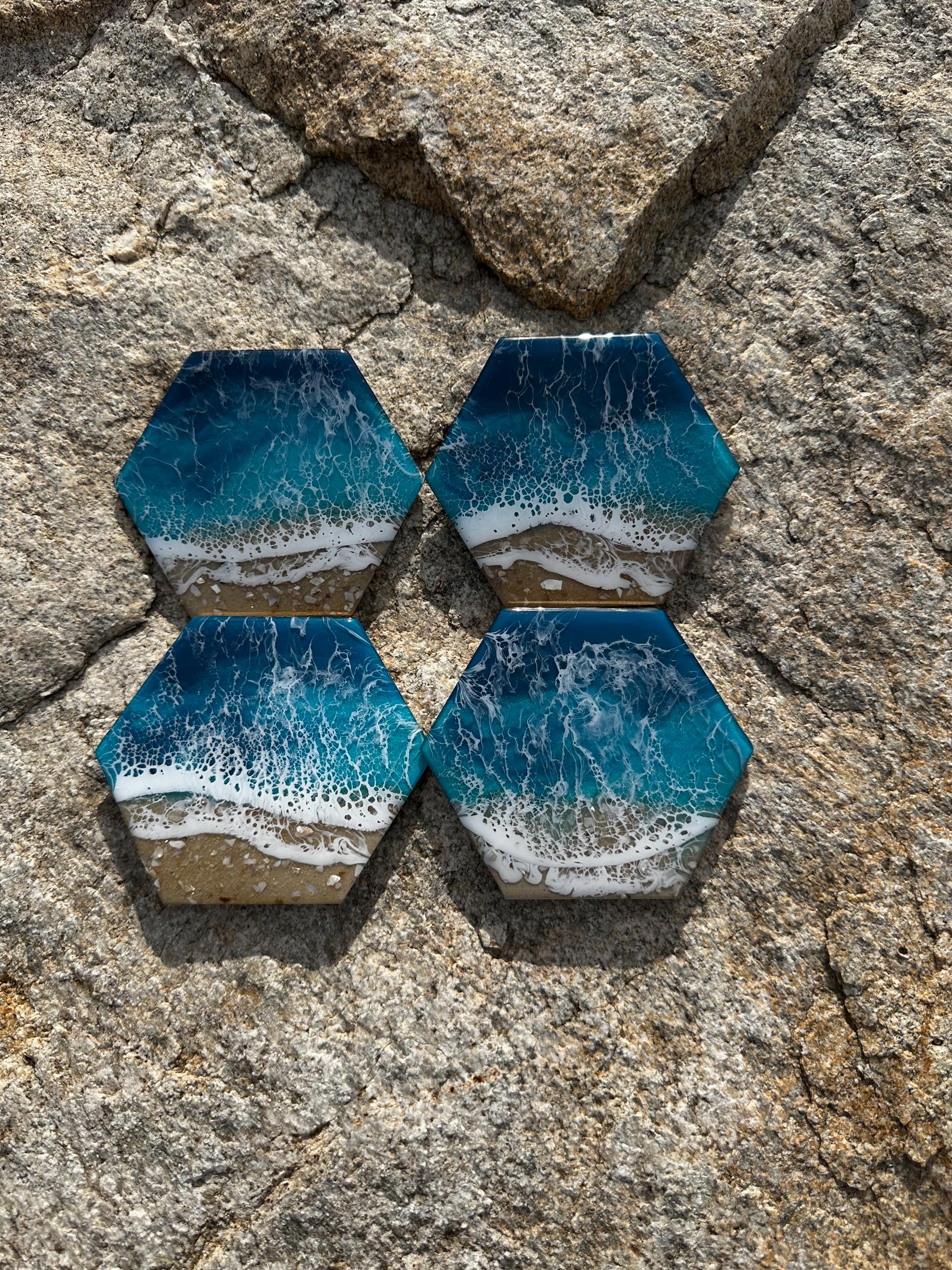 This coaster set depicts a beach setting with the waves crashing on the sand. The ocean consists of shades of dark blue, mermaid blue, and teal blue with a real tan sand mixed with shell flakes and white waves. Each is different and unique. The coasters are made from resin poured on wood. Each has a cork backing to help protect your furniture.