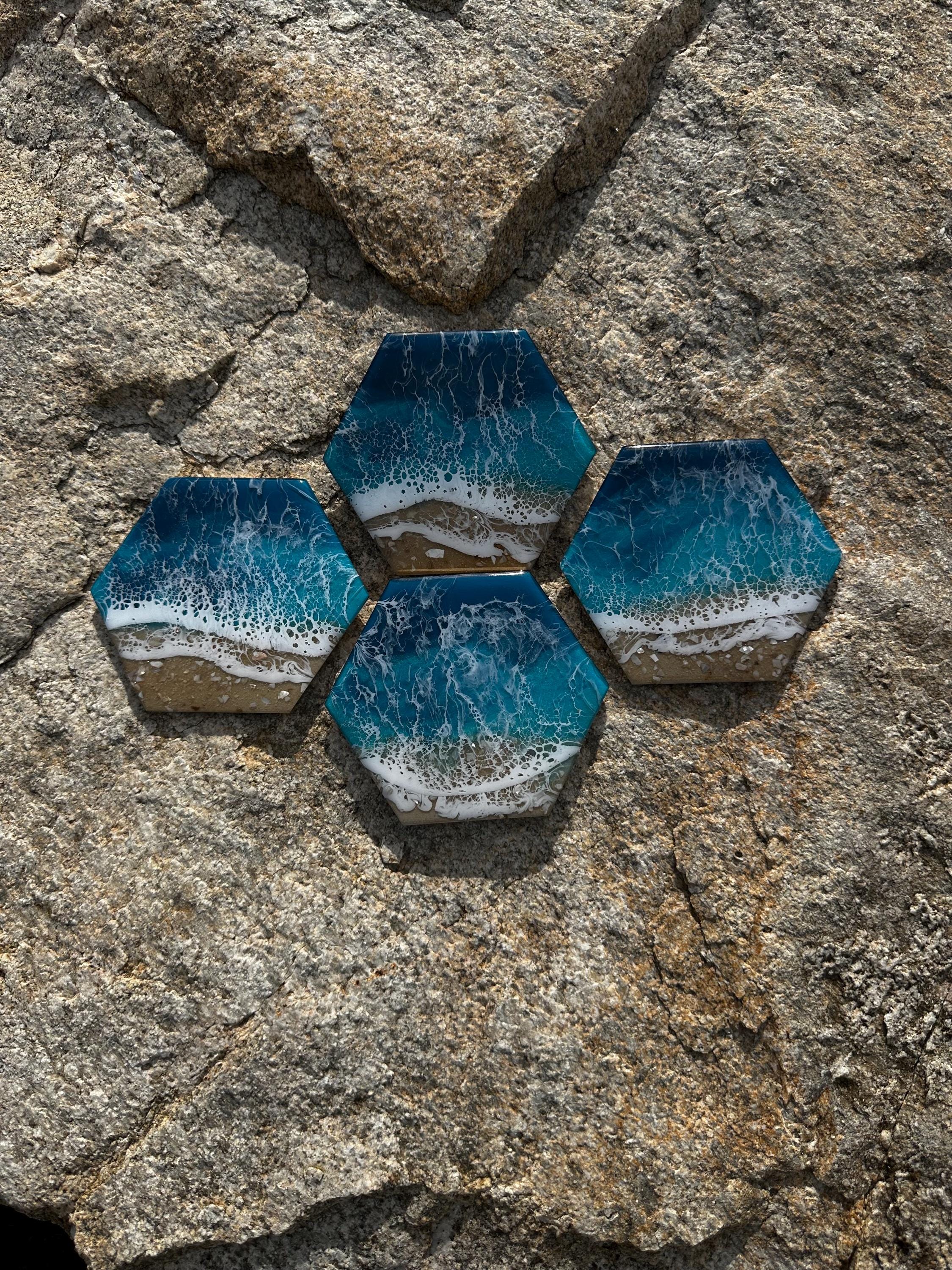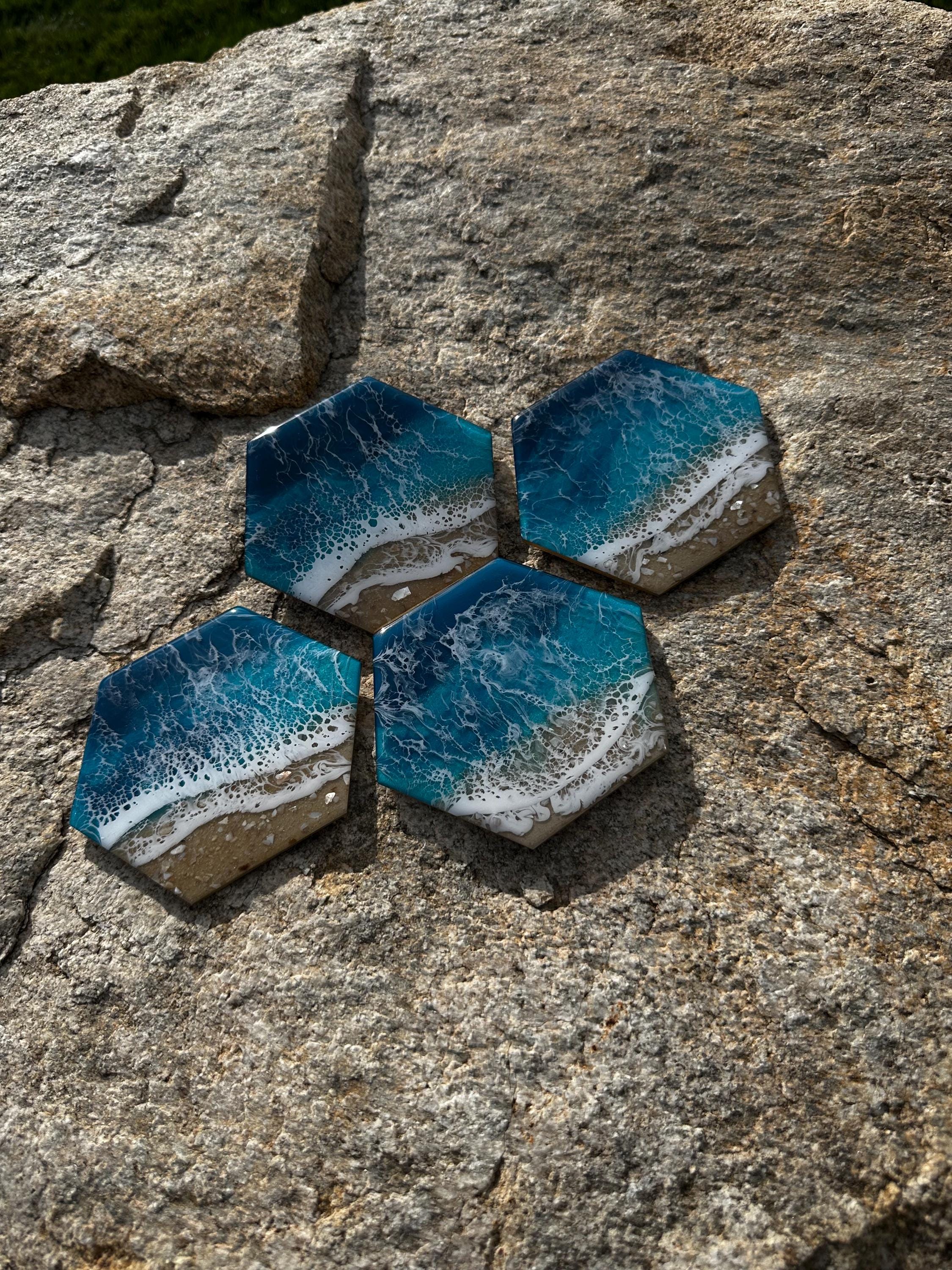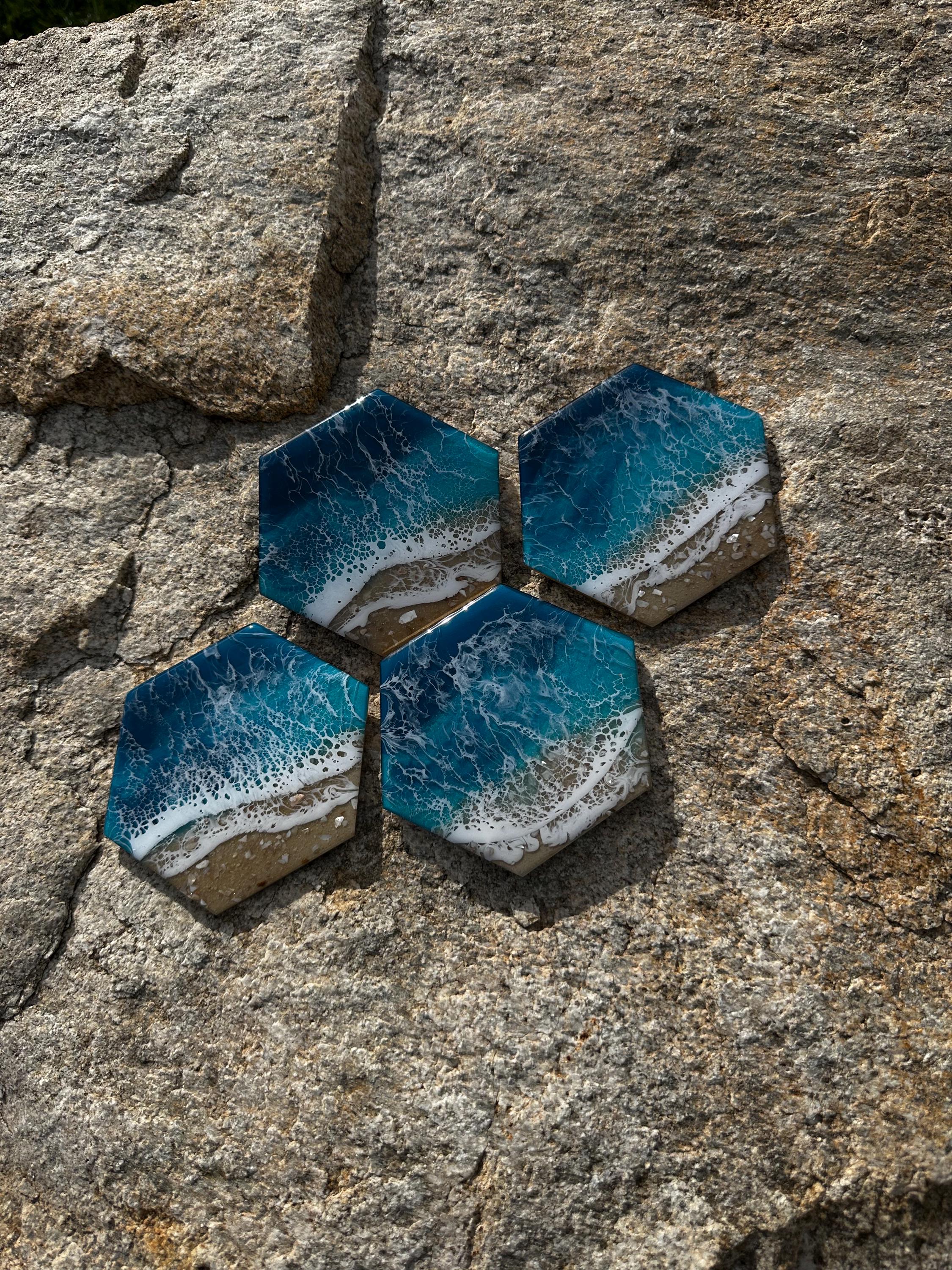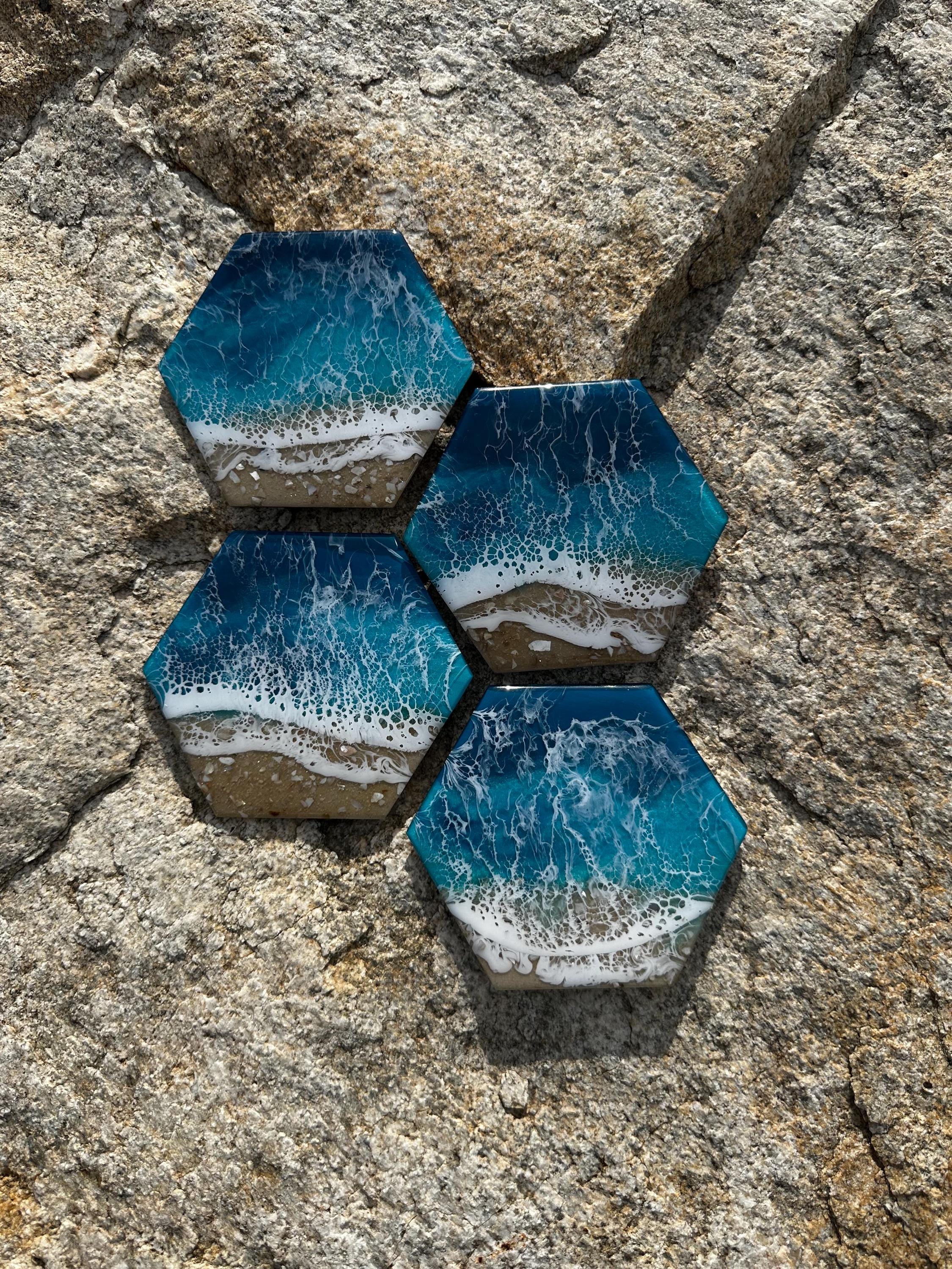 This coaster set depicts a beach setting with the waves crashing on the sand. The ocean consists of shades of dark blue, mermaid blue, and teal blue with a real tan sand mixed with shell flakes and white waves. Each is different and unique. The coasters are made from resin poured on wood. Each has a cork backing to help protect your furniture.