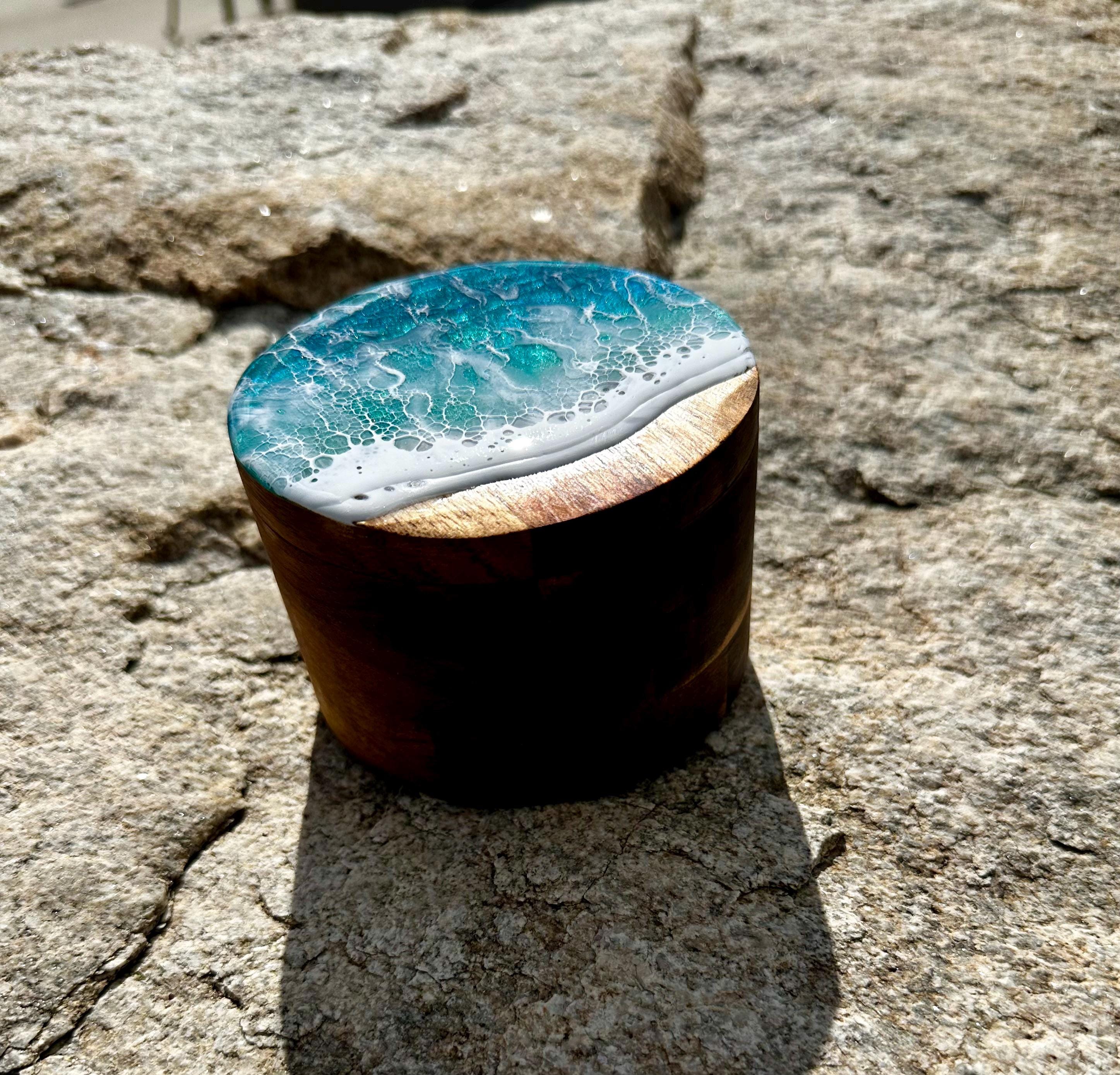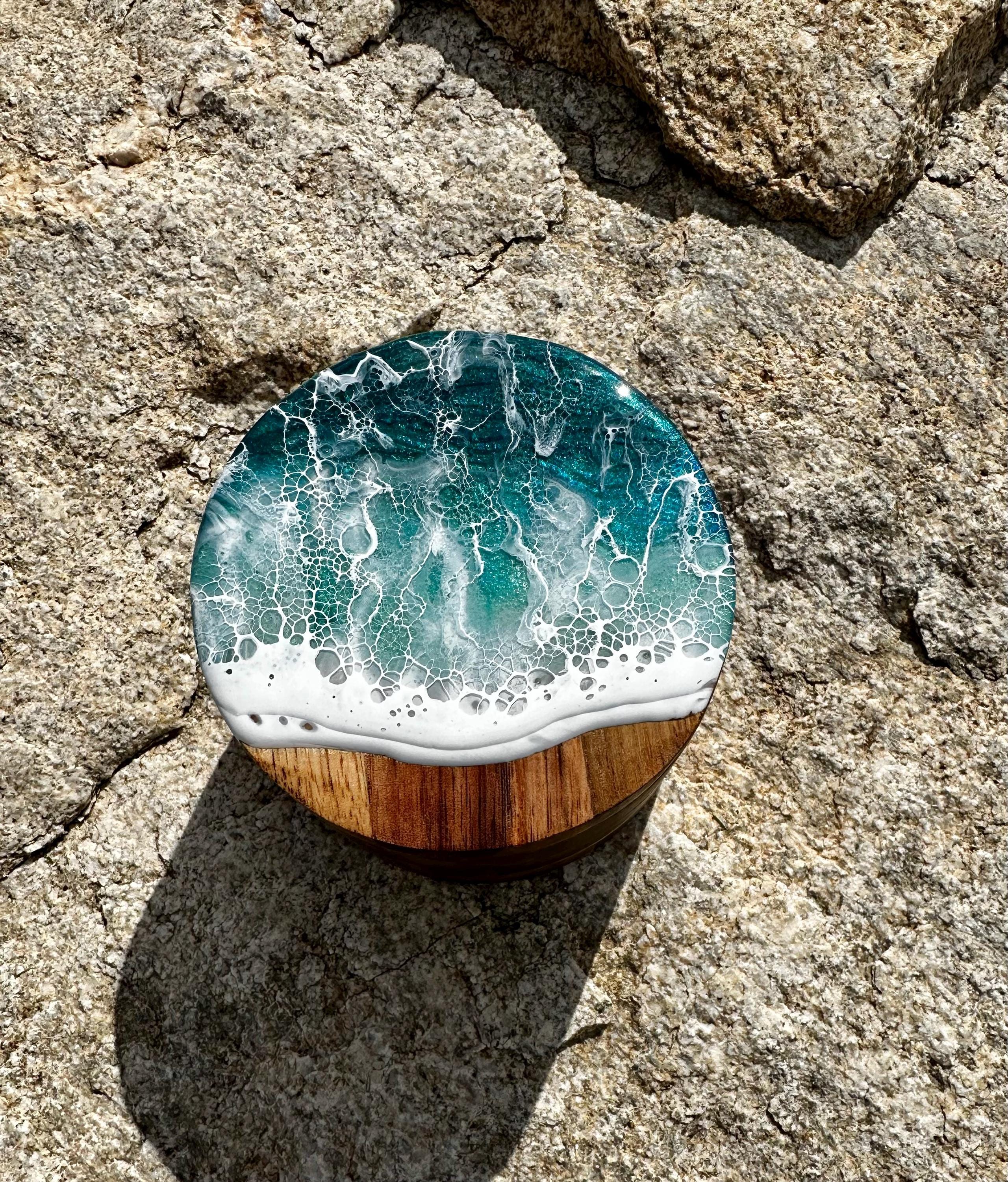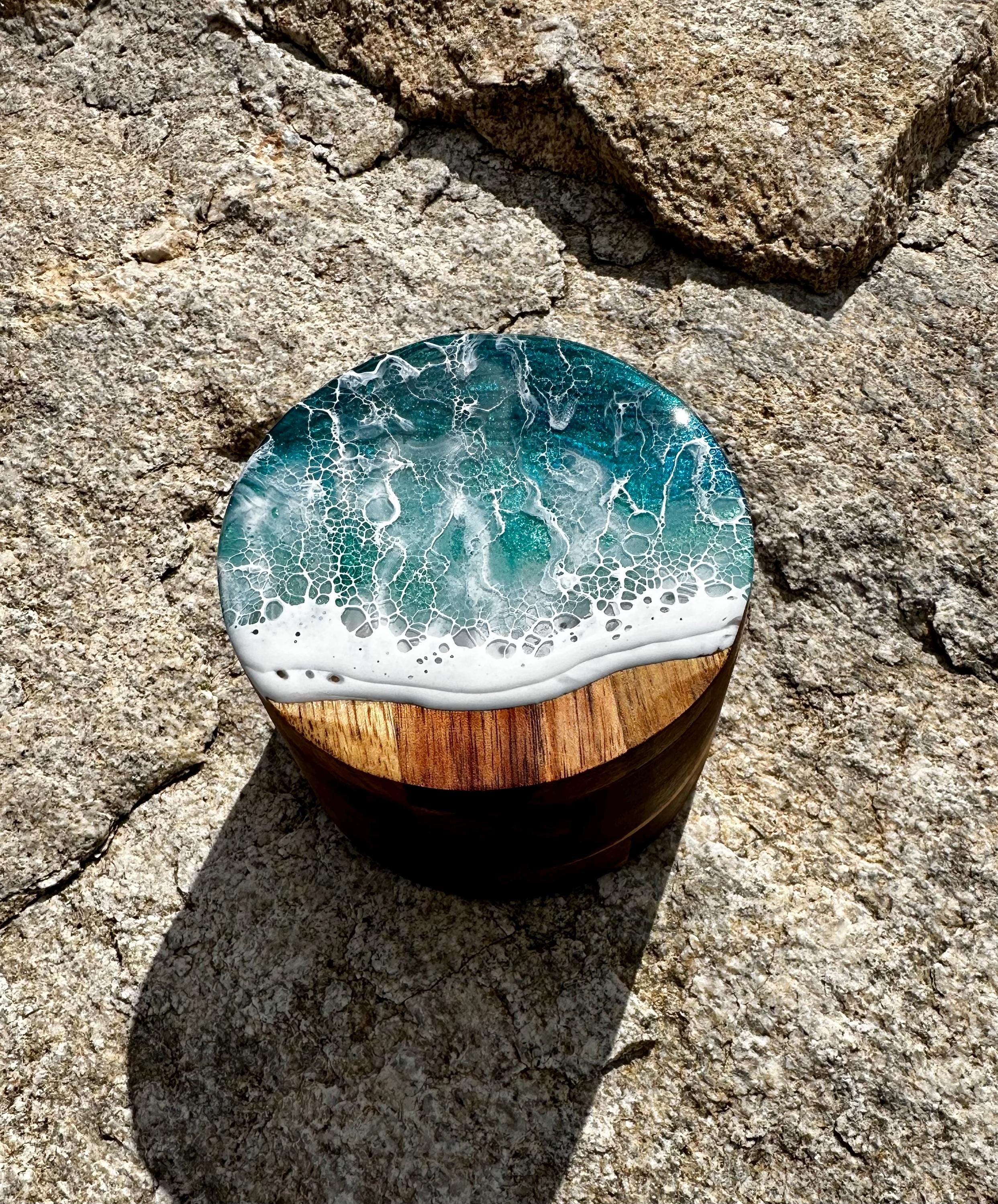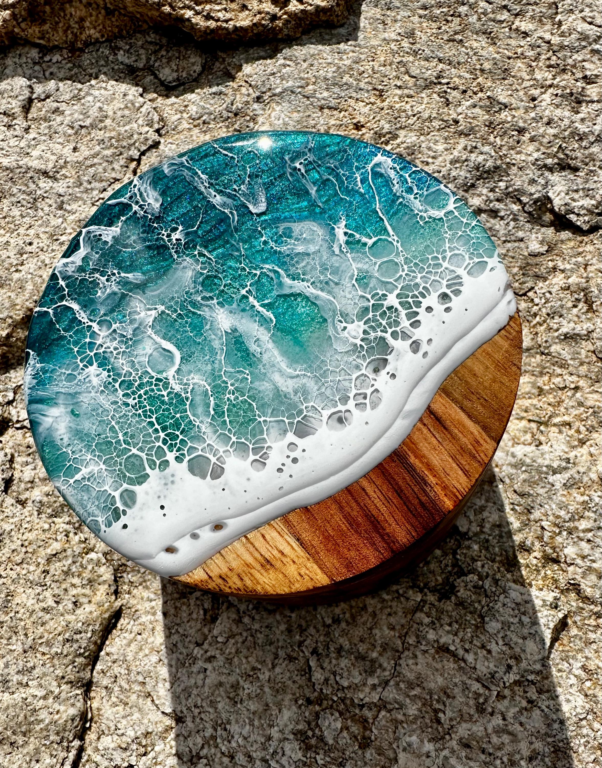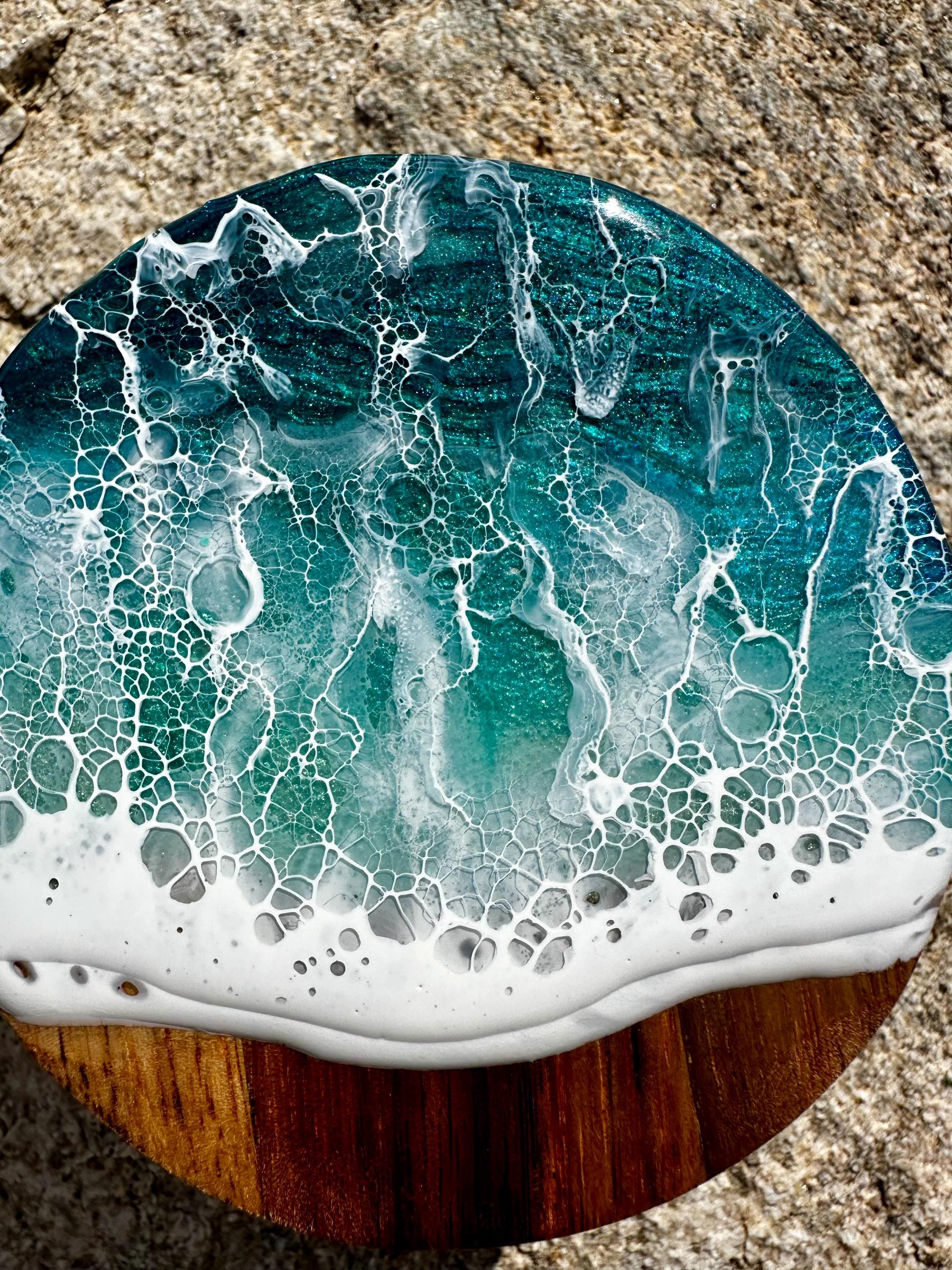 The ocean scene on top has colors of iridescent greens with a an emerald green, teal blue, and aqua with multiple layers of waves on top.