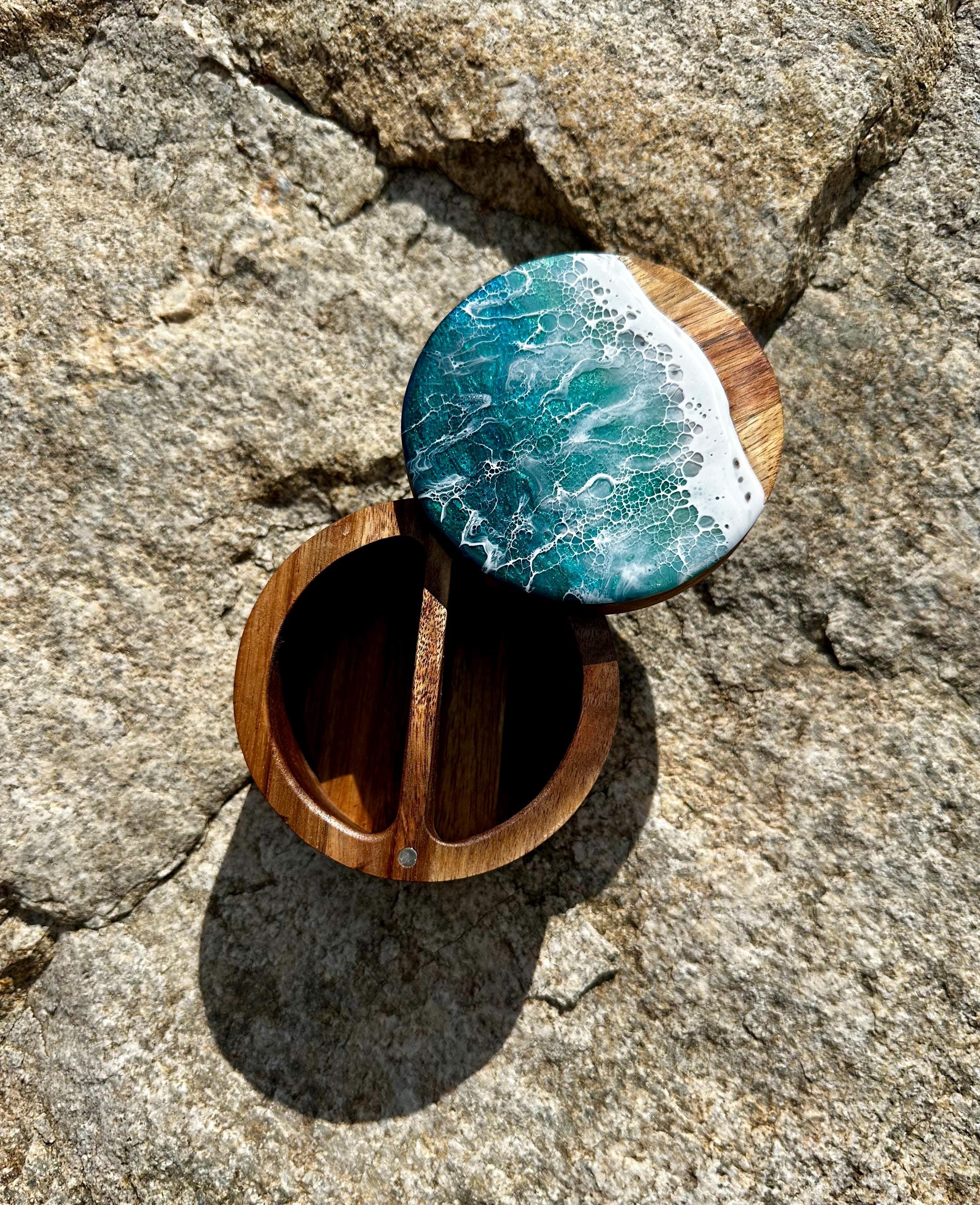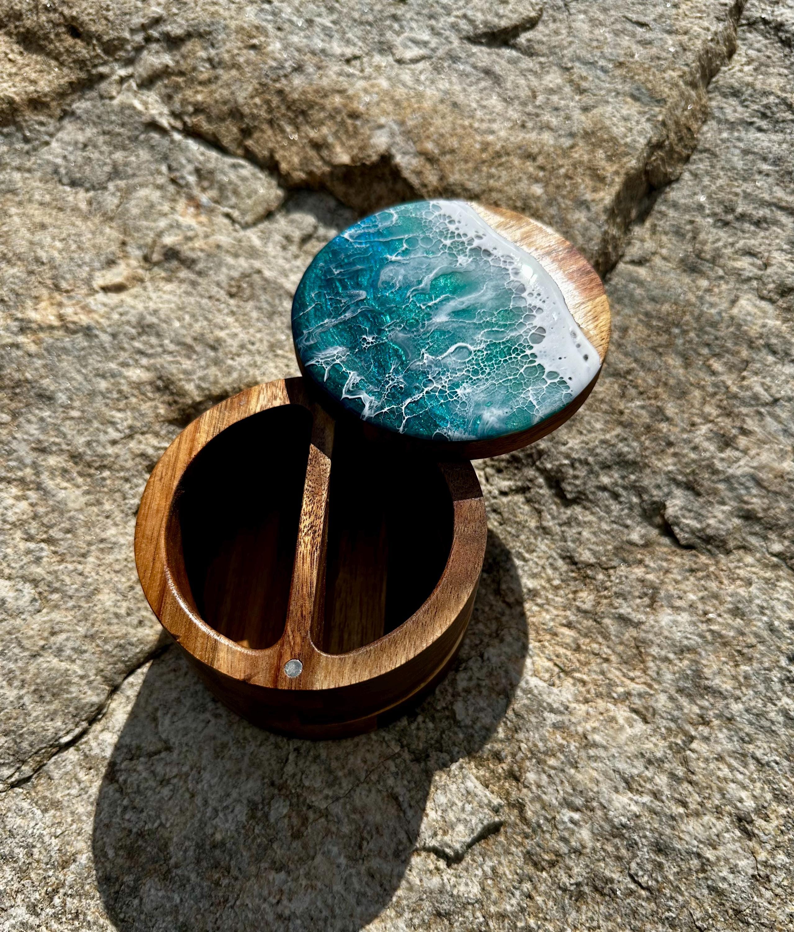 This large acacia box has a swivel lid with magnetic closure. This box can be used for holding salts, herbs, sugars in your kitchen. The box can also be used to store jewelry and would make a super cute engagement ring holder. This is a duet size box so there are two compartments so you can store two different types of spices, salts, jewelry etc.