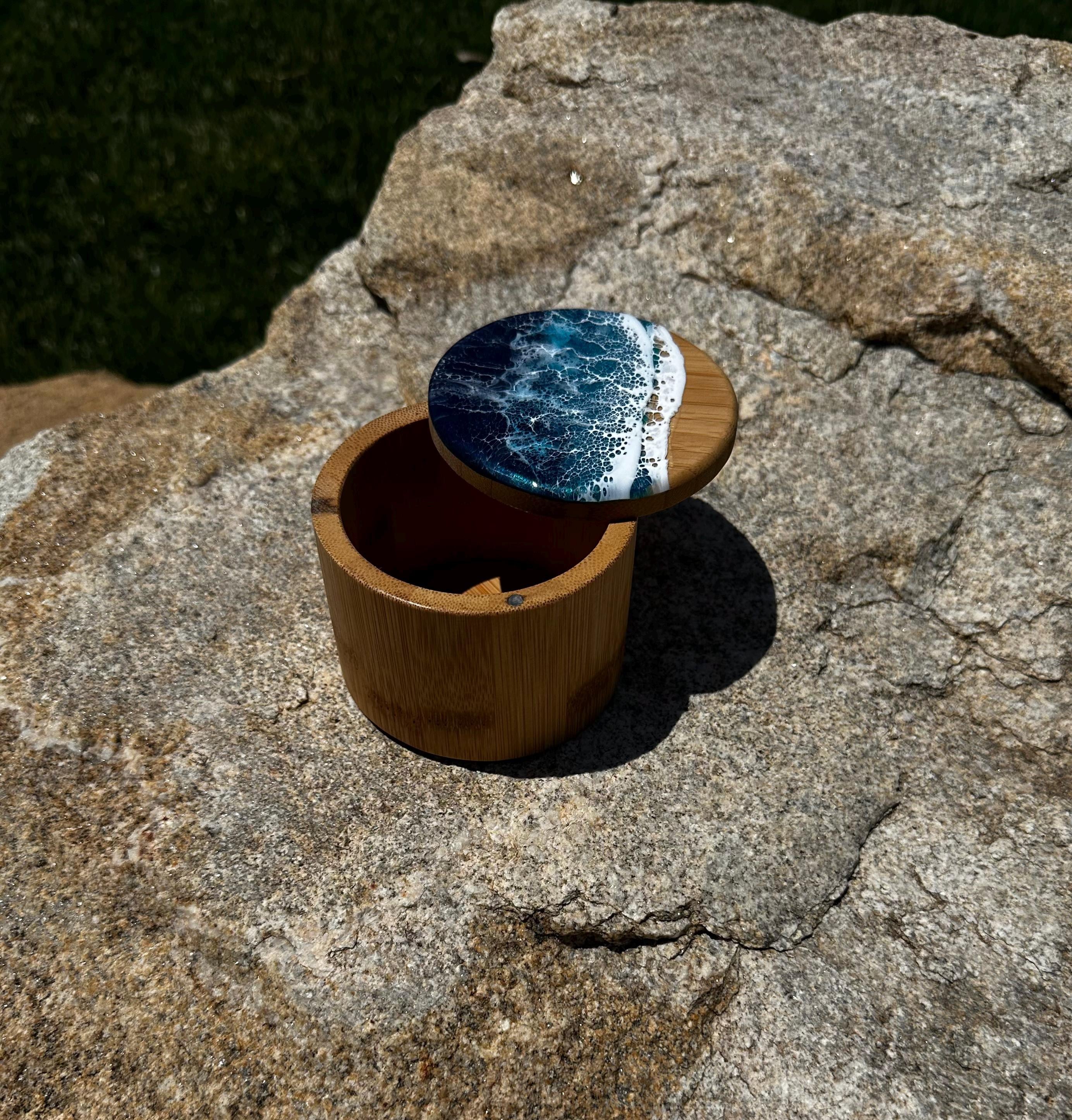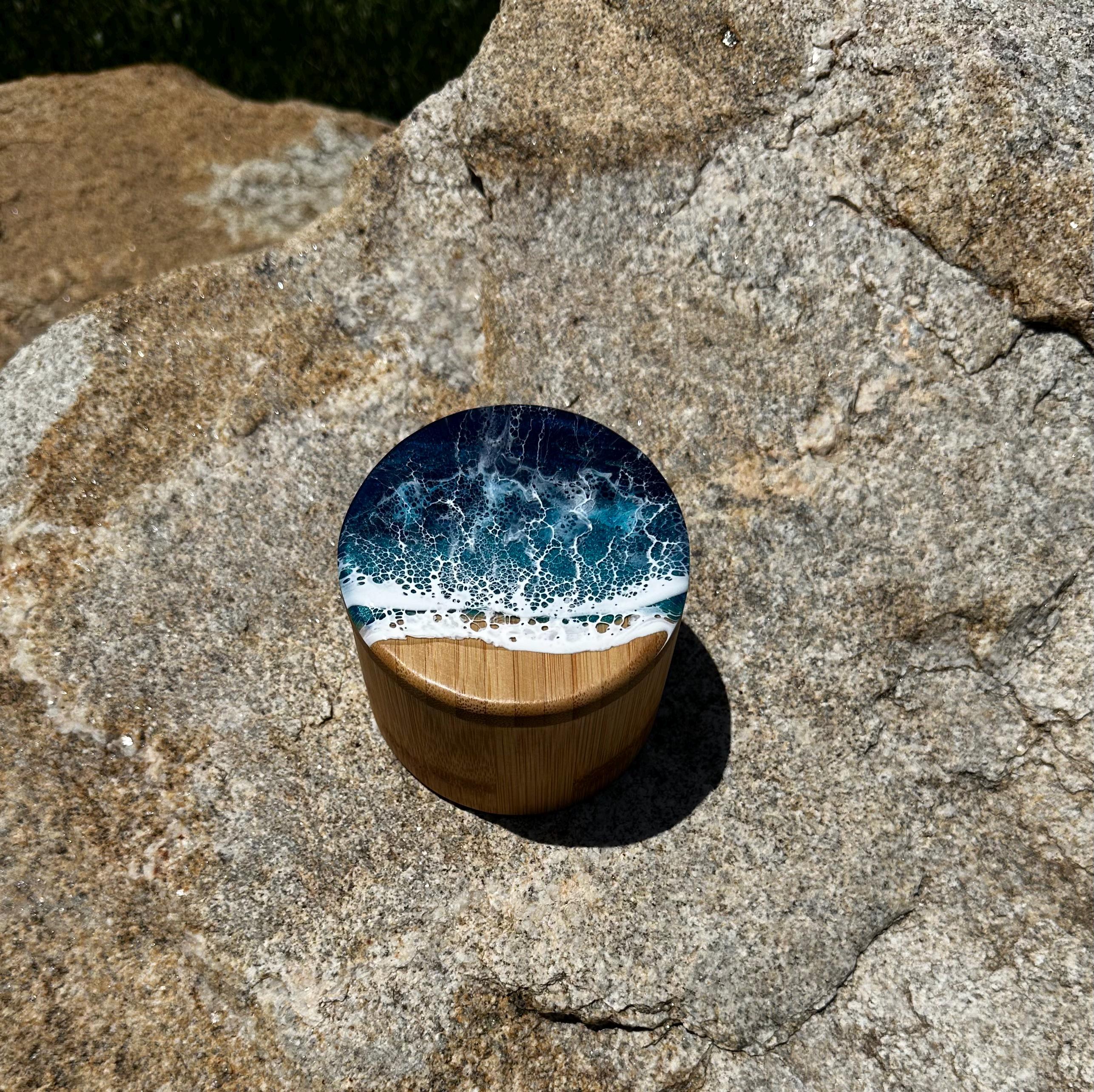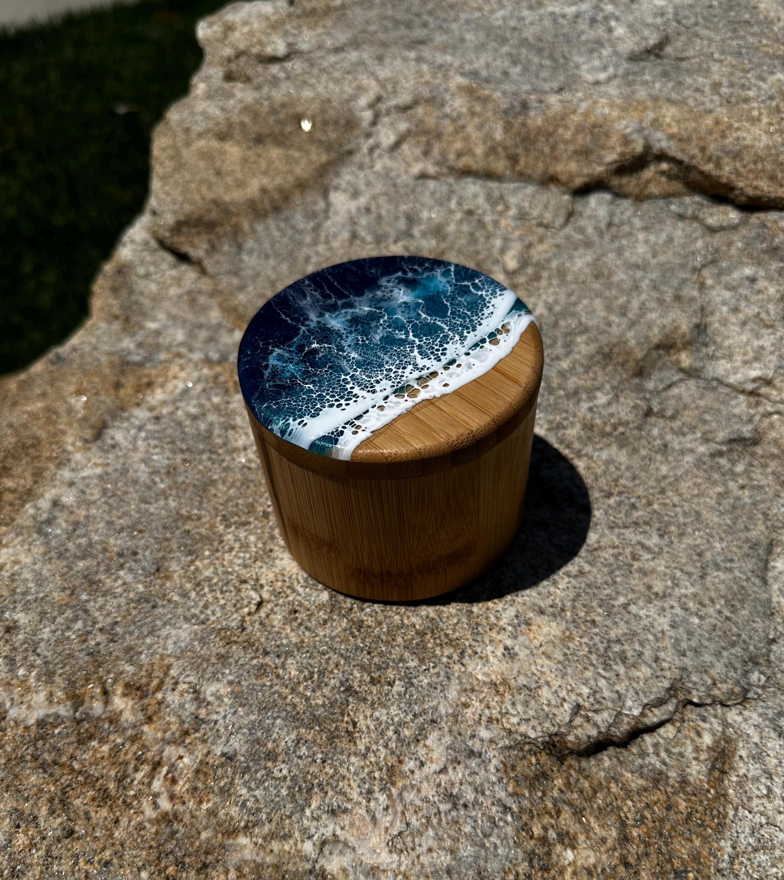 Bamboo wood canister/ box with ocean resin art poured on top.